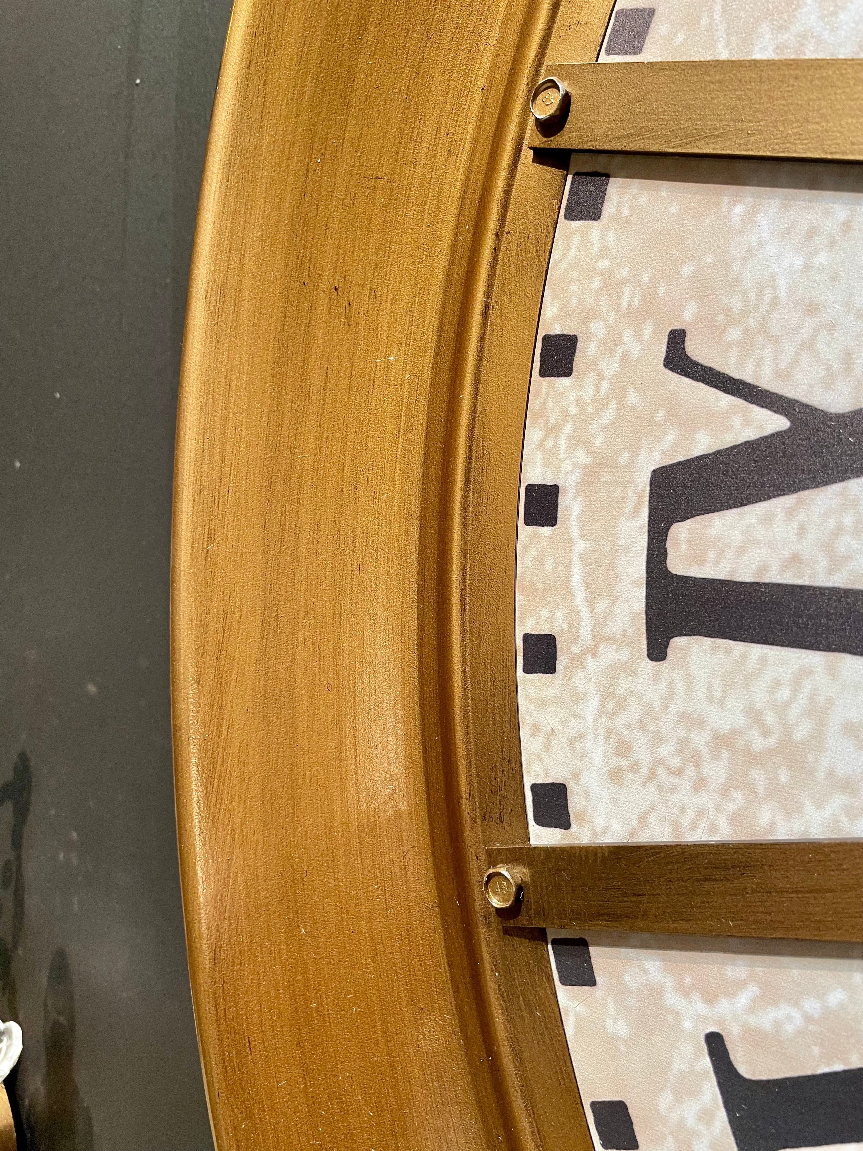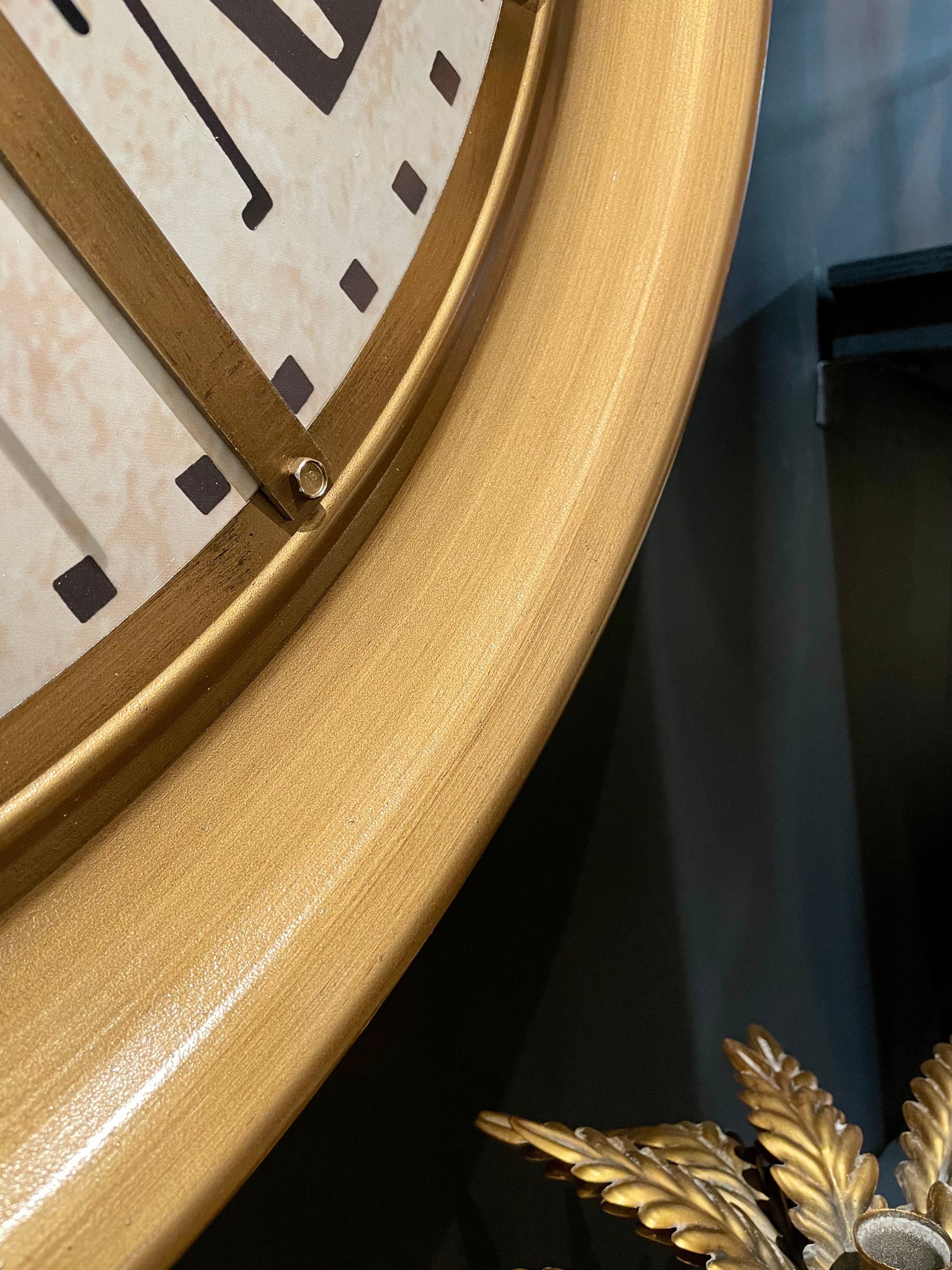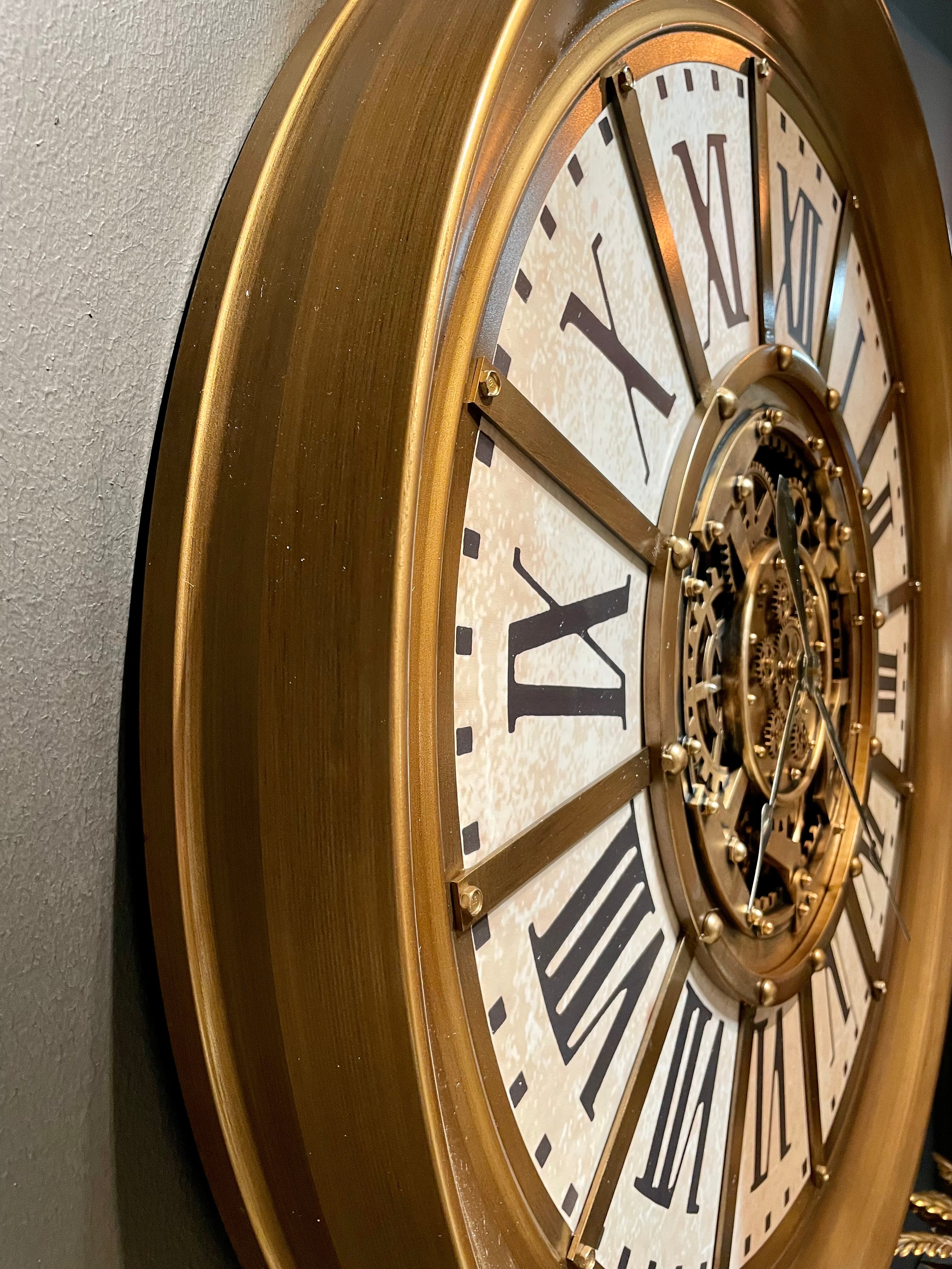 Diese einzigartig große Vintage Wanduhr in gold und weiß/beige hat sich drehende Zahnräder (siehe Video) und ist aus Metall.