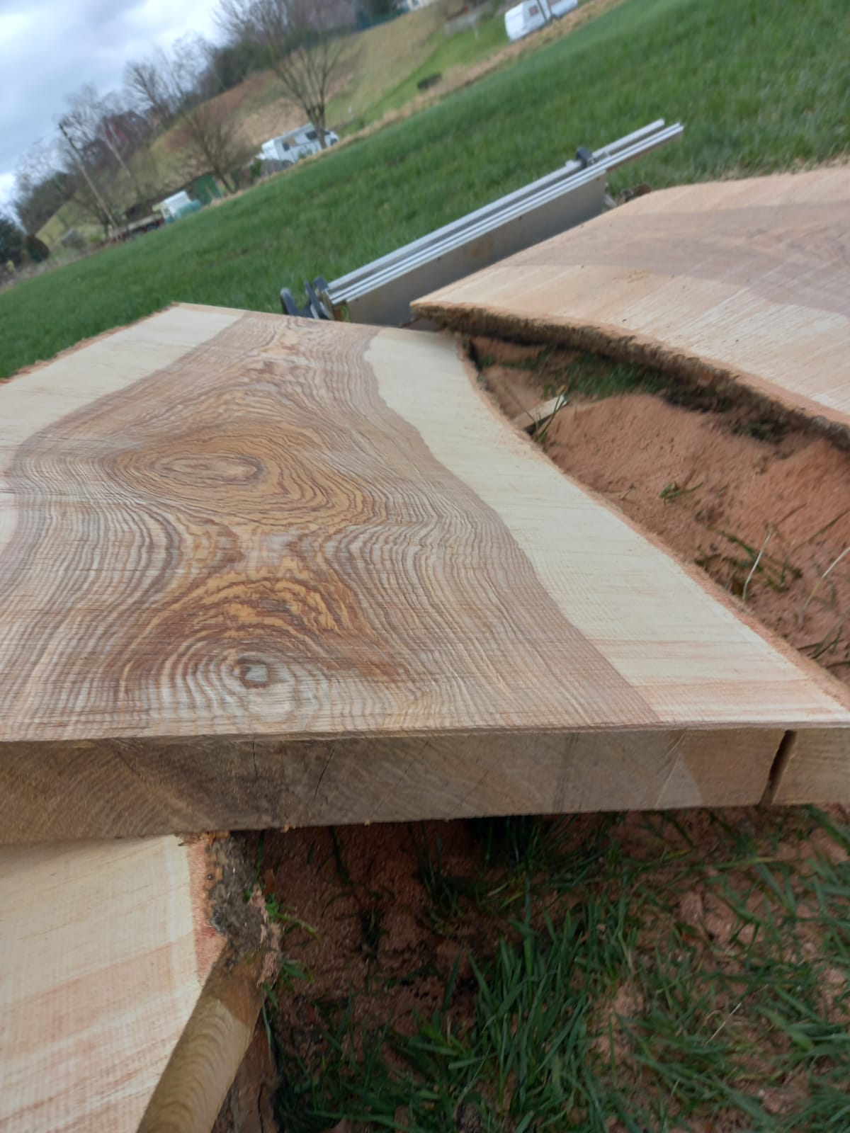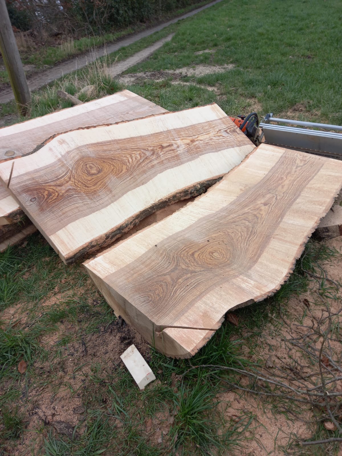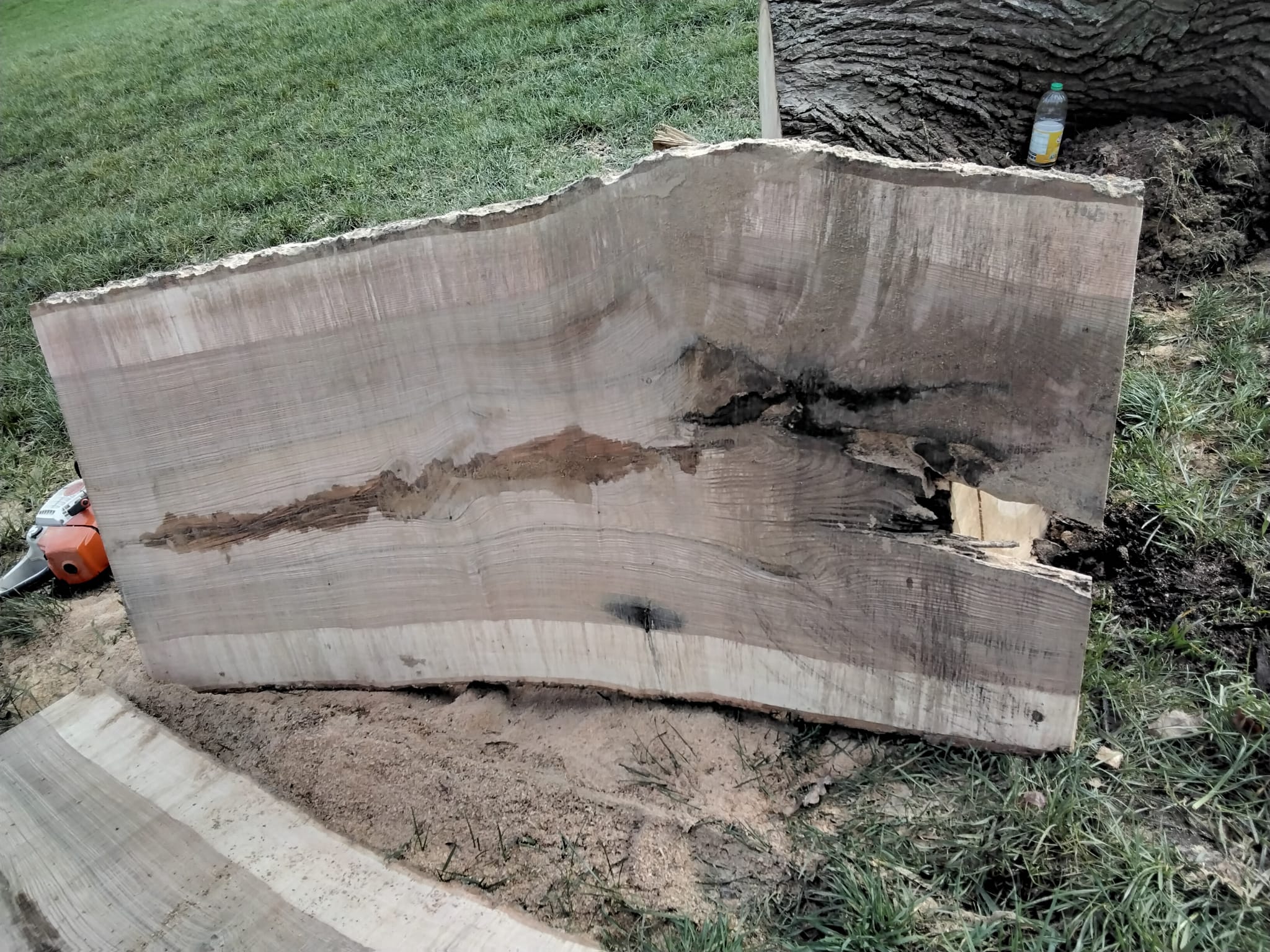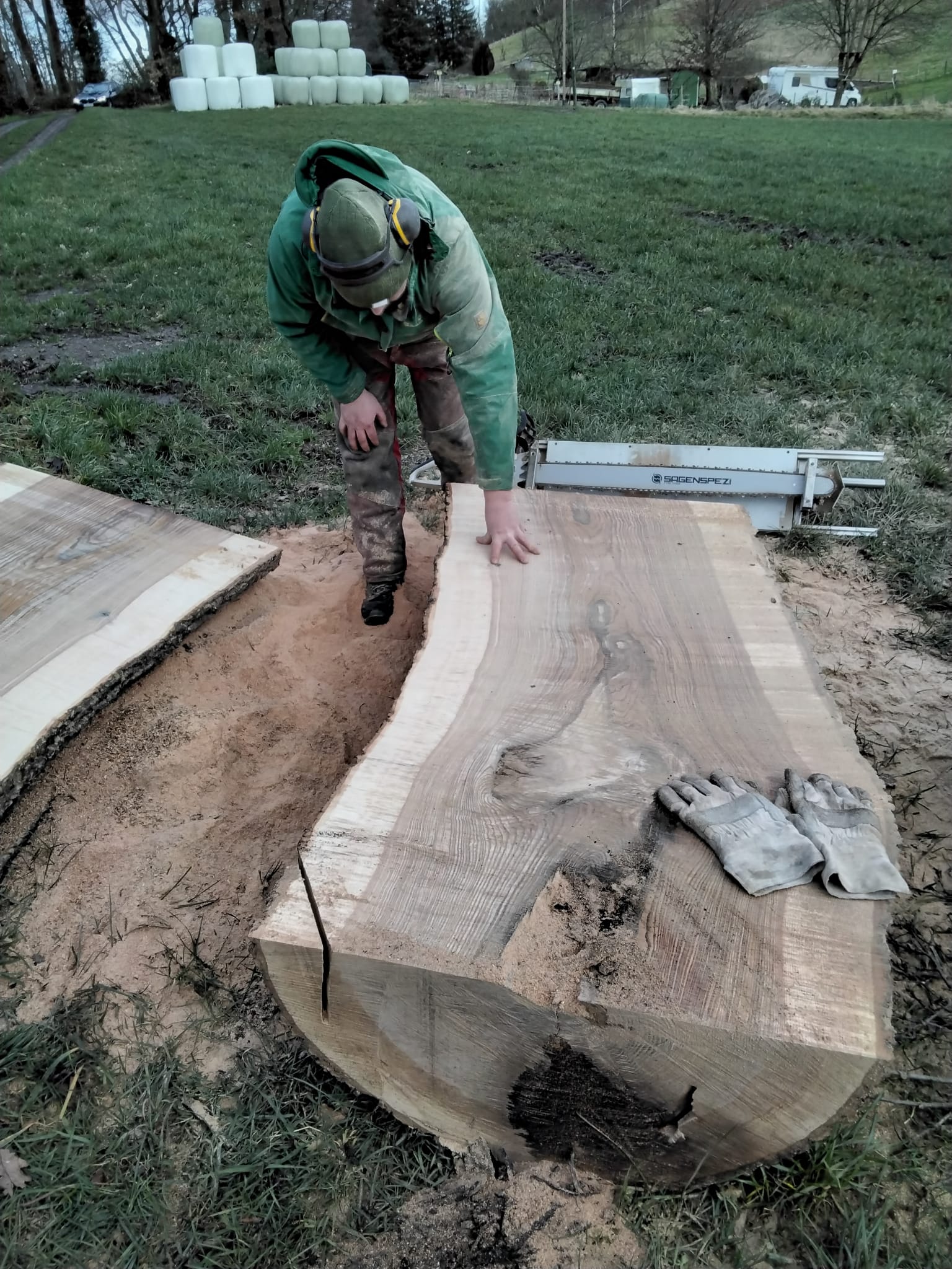Nachdem die Krone zu Schwer wurde, ist der Baum umgeknickt und wir haben Ihn dann in Scheiben geschnitten, einige Platten wurden zu Couchtischen und einige zu größeren Tischplatten.