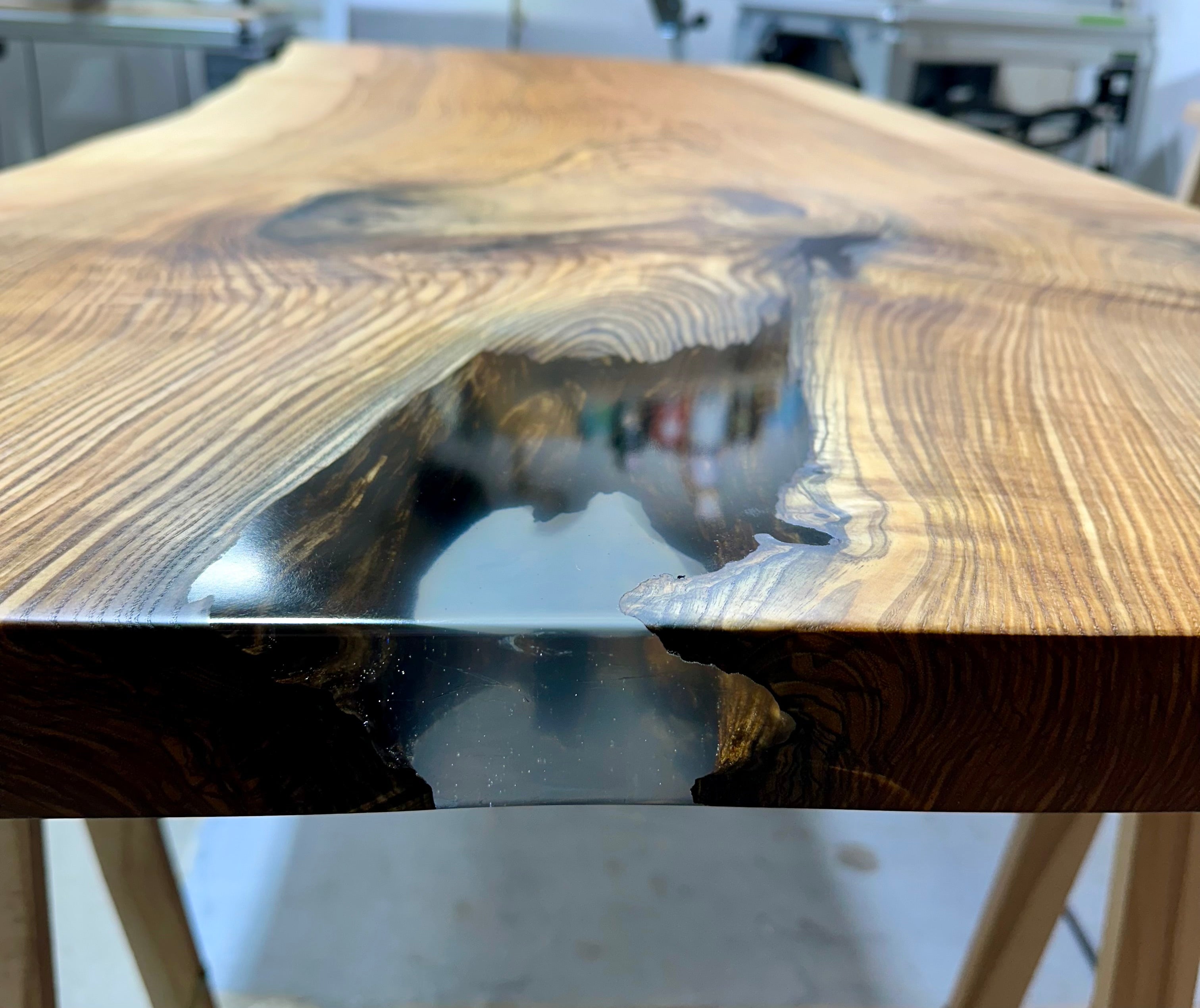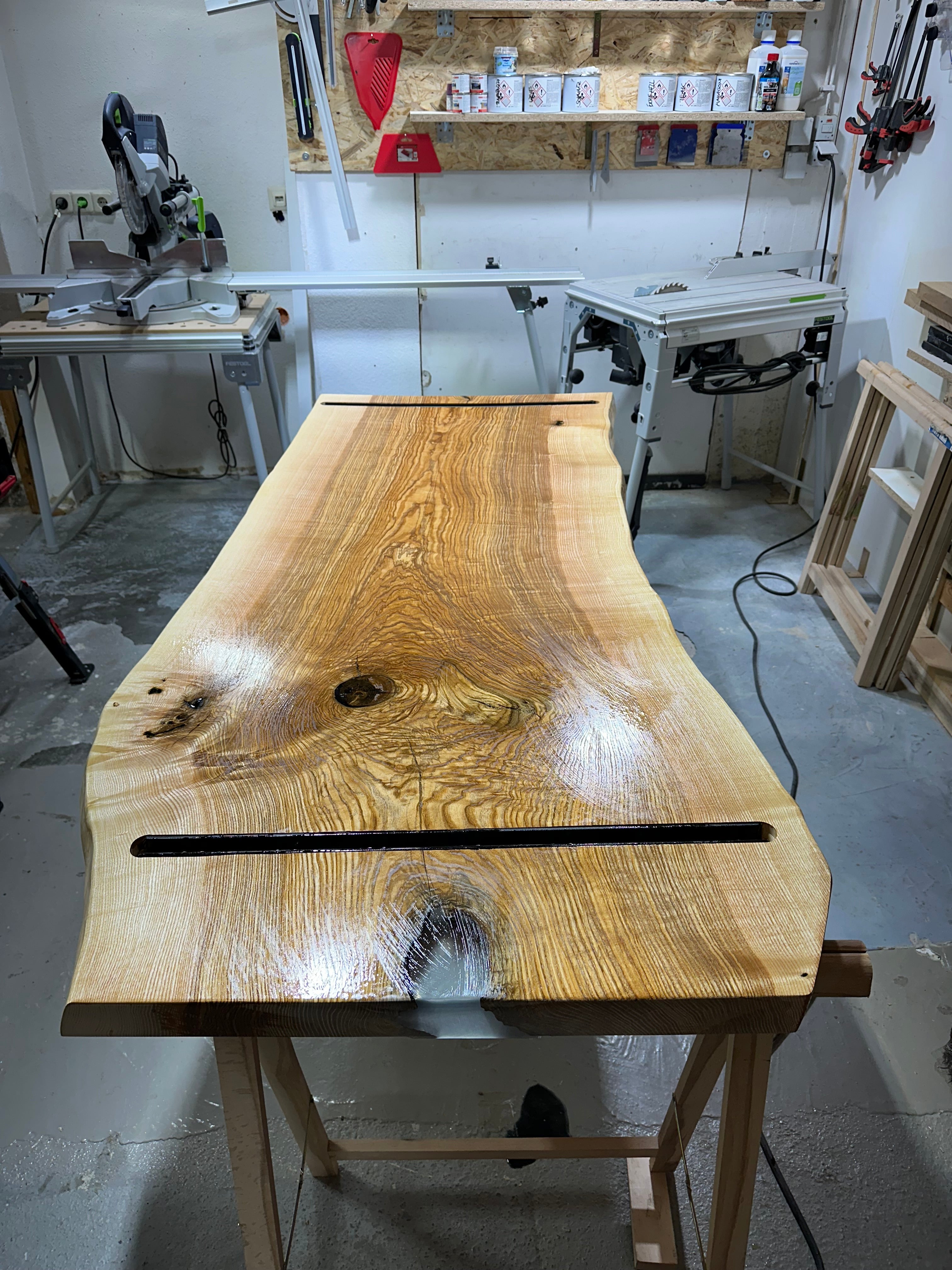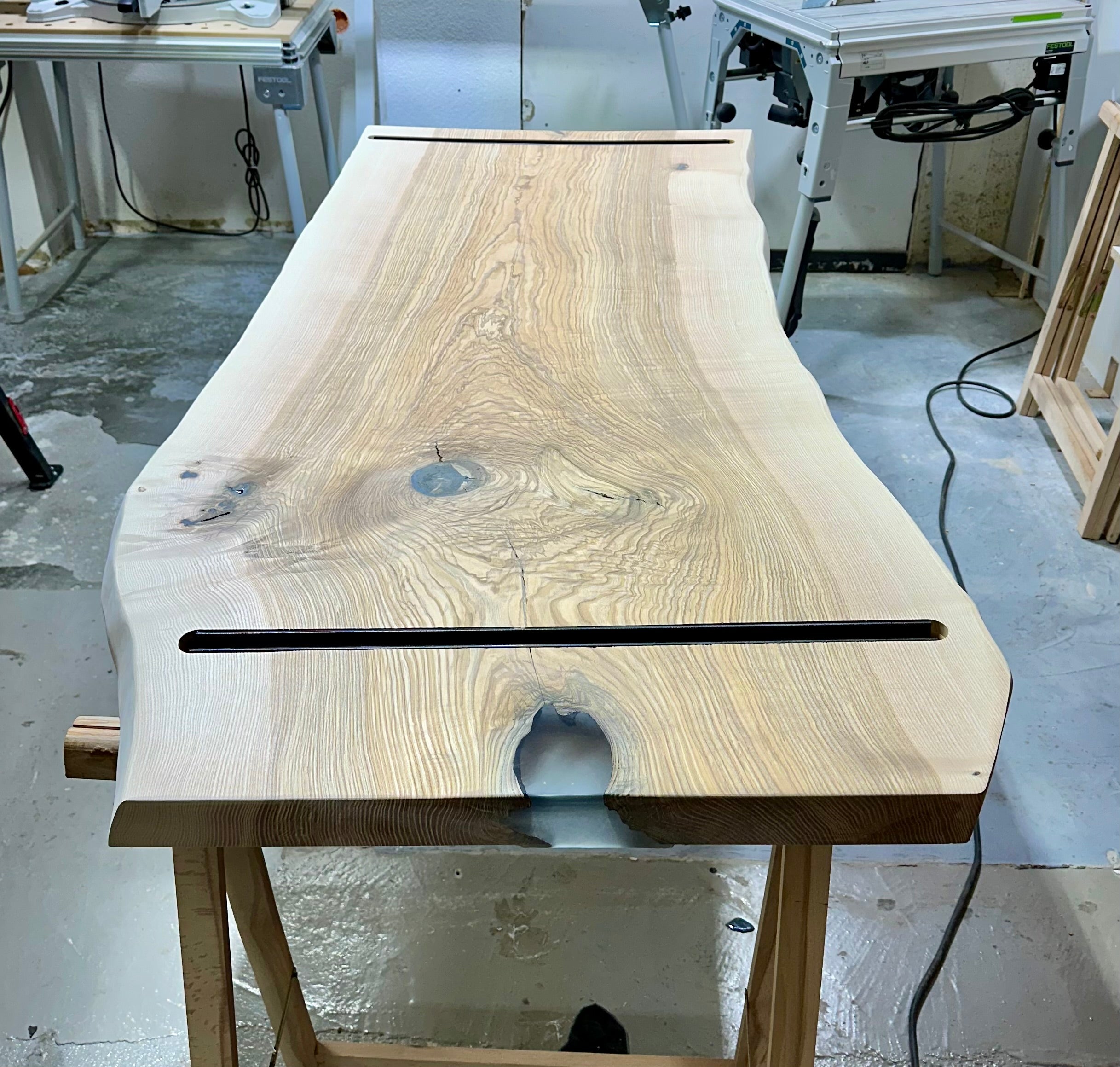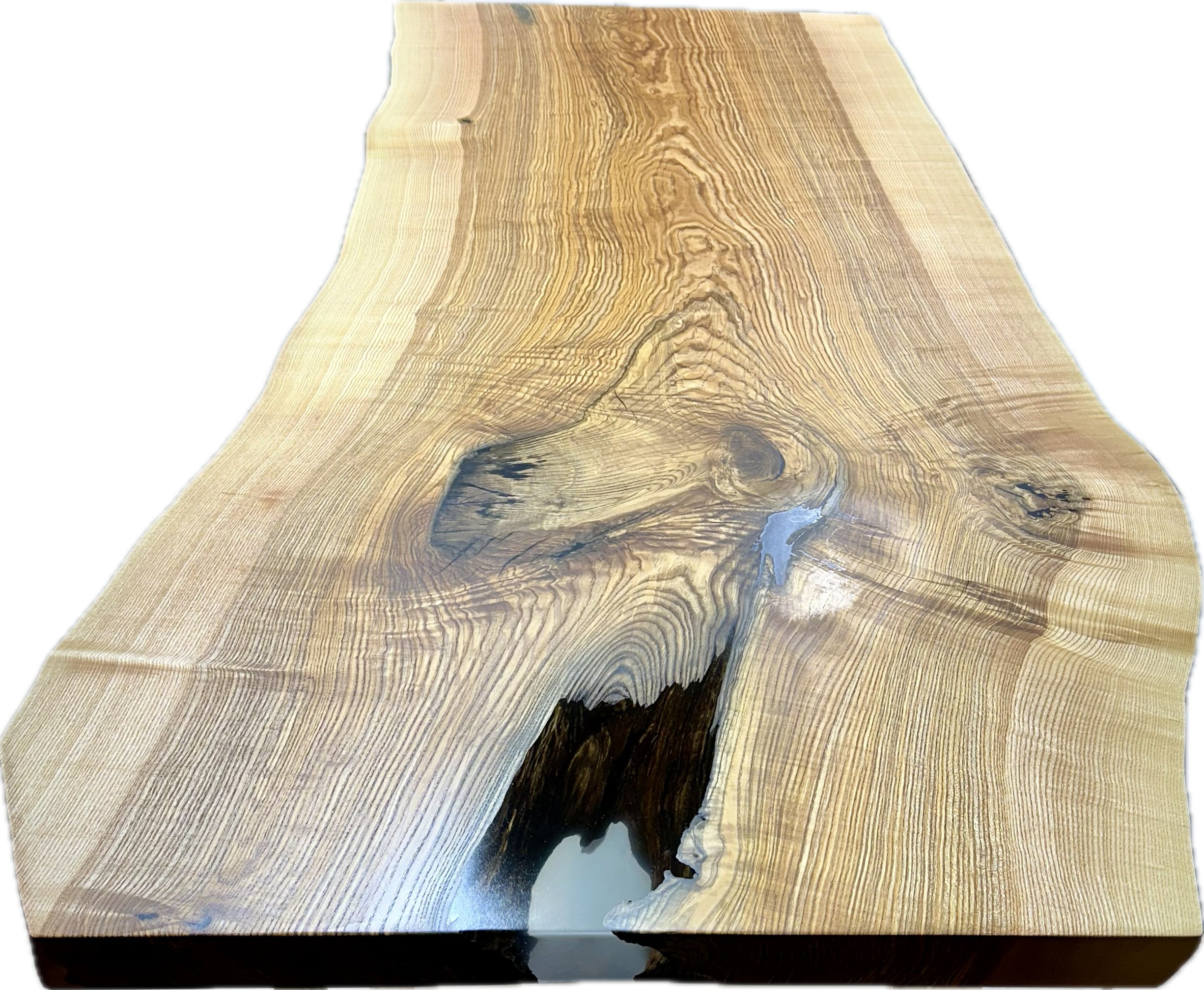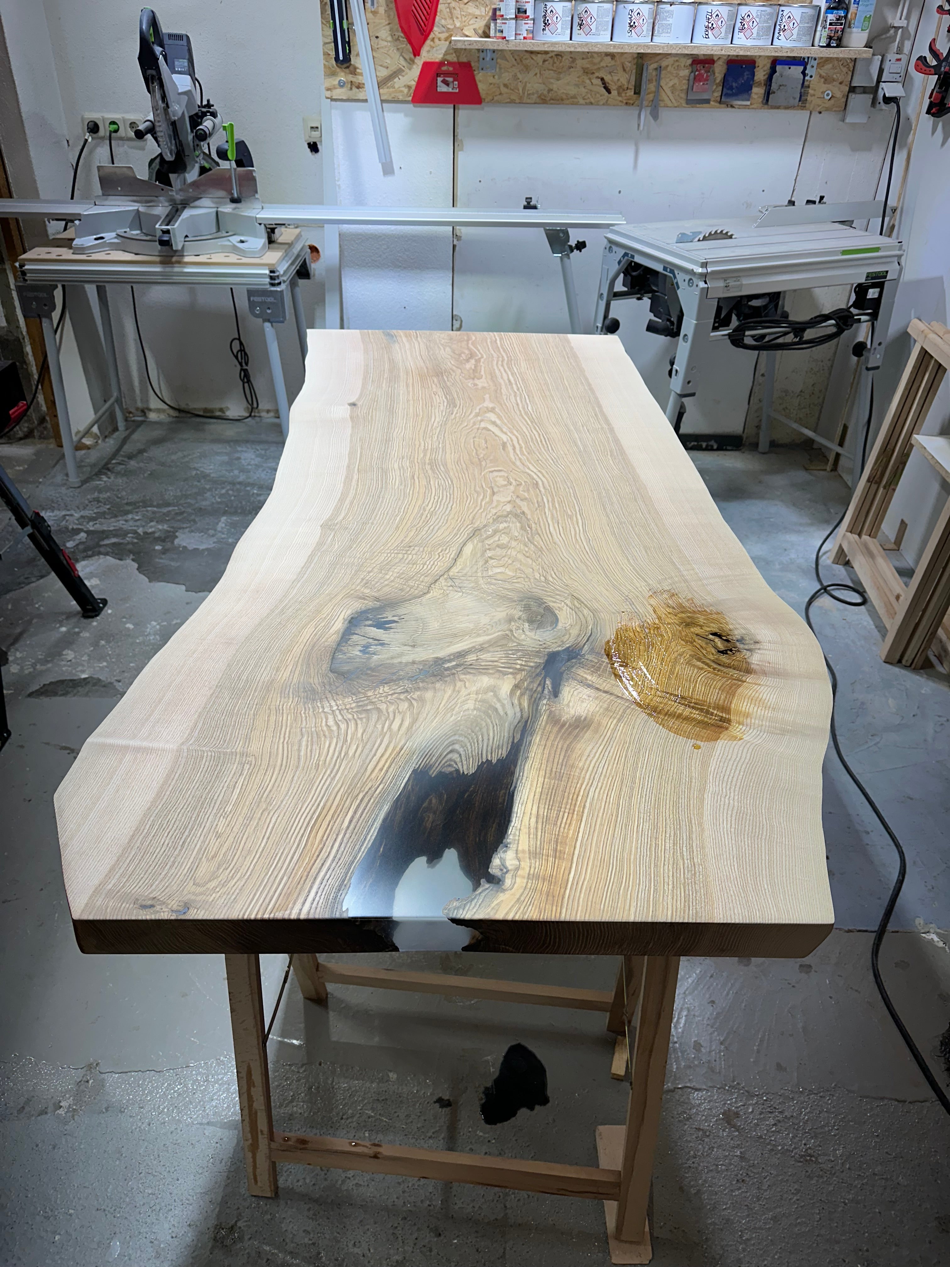 Eine mega geile Baumstammplatte aus massiven und 5 cm starken Edelesche Holz geölt und mit Epoxidharz gefügt (transparent).