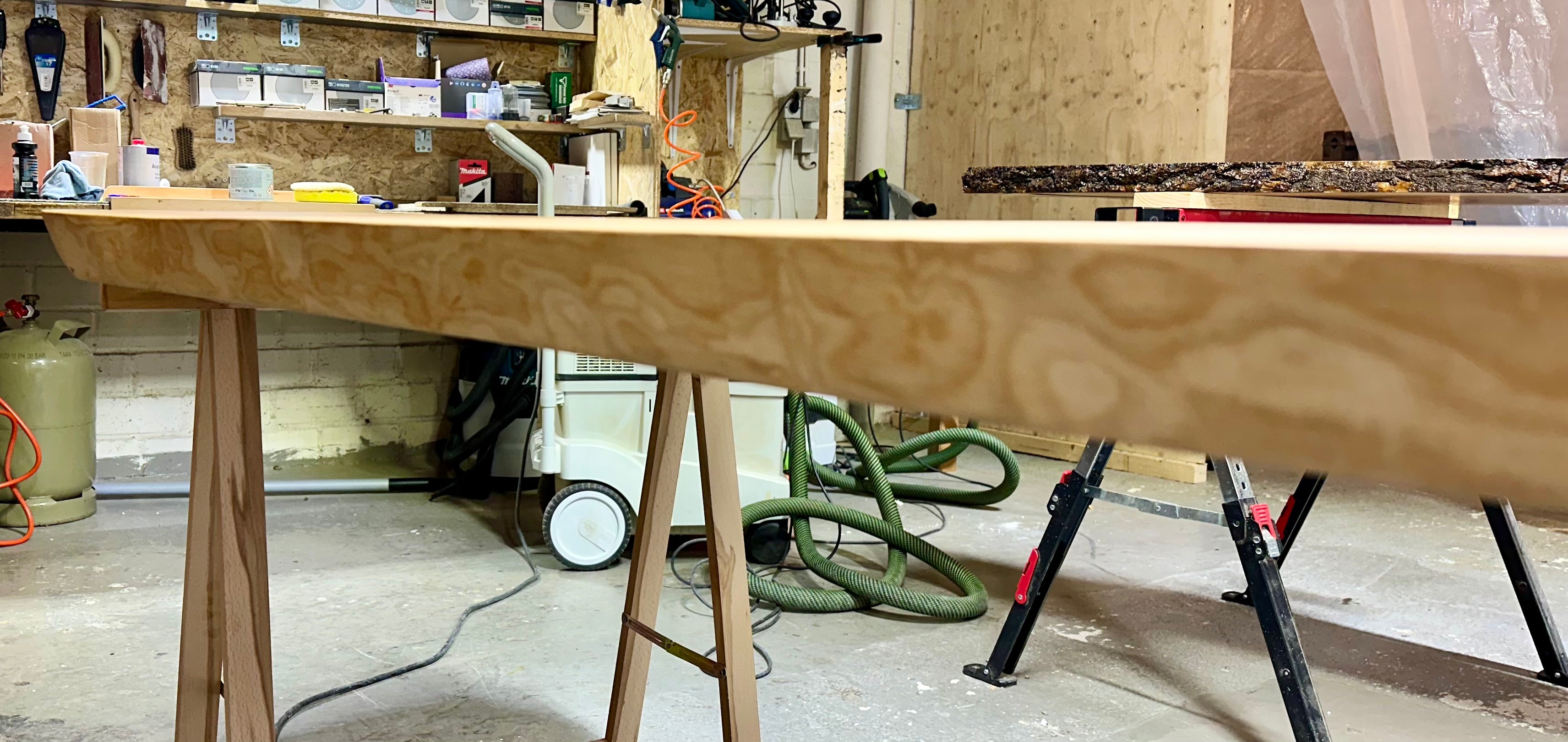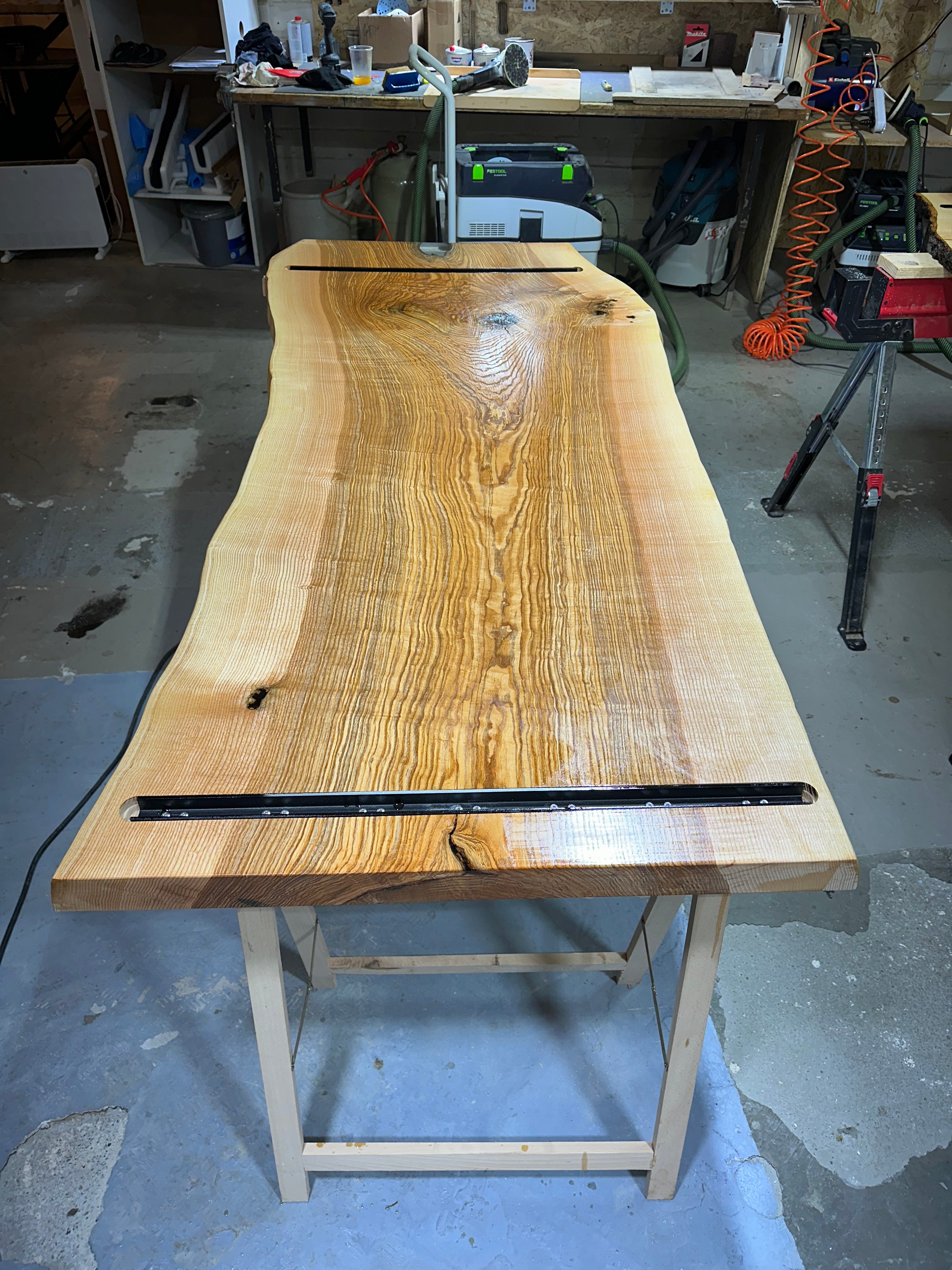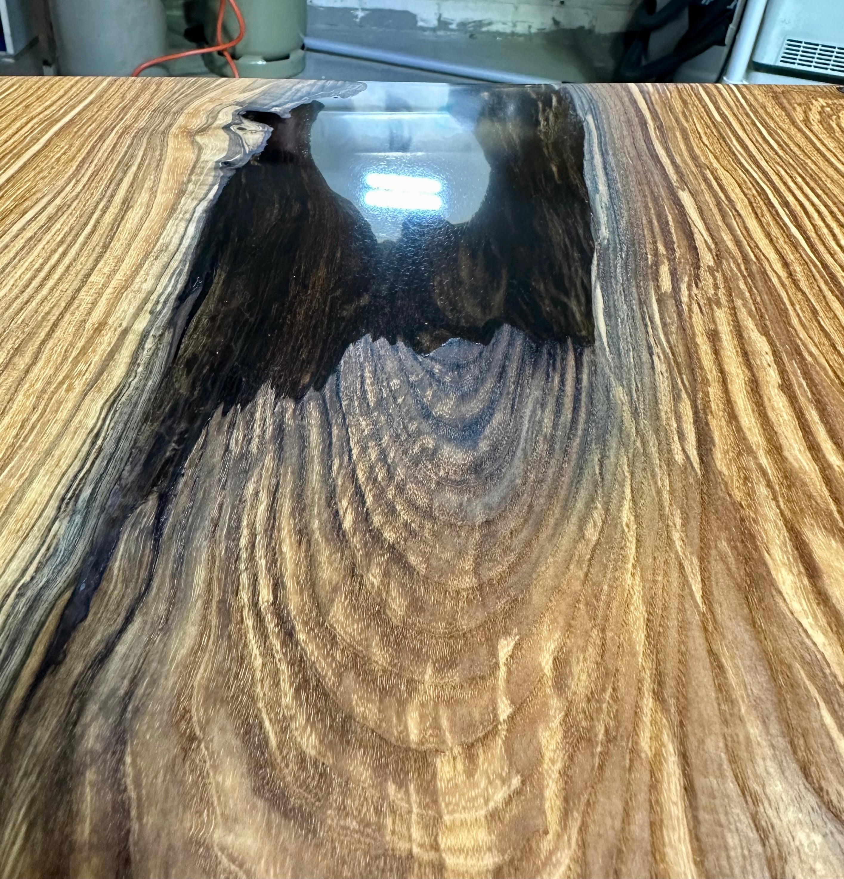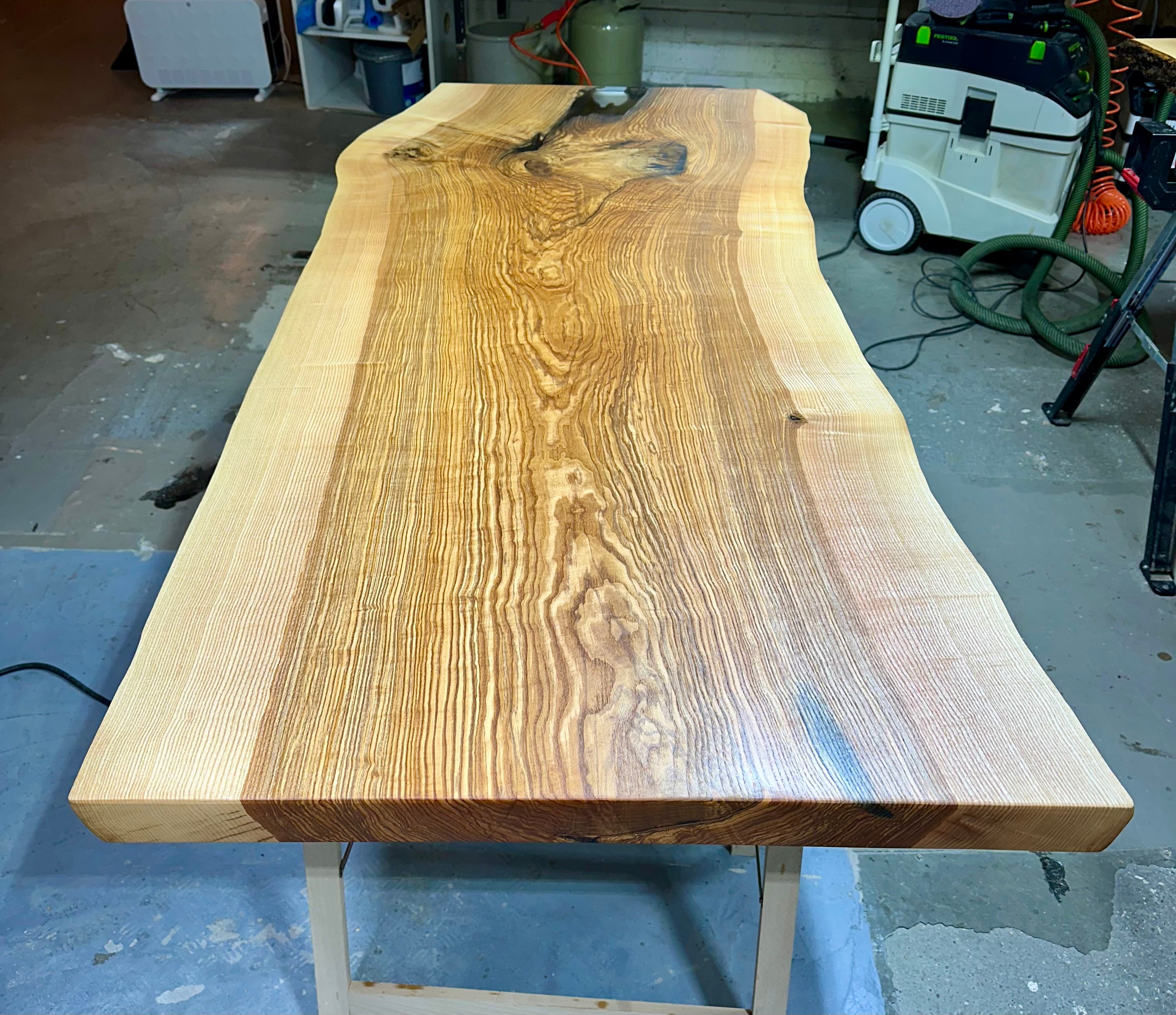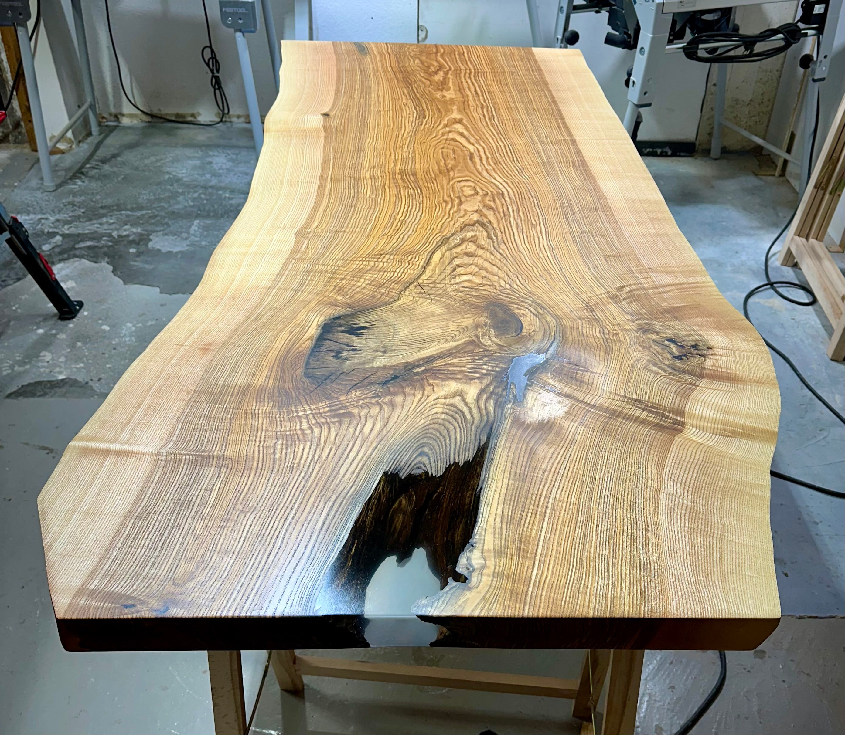 Eine mega geile Baumstammplatte aus massiven und 5 cm starken Edelesche Holz geölt und mit Epoxidharz gefügt (transparent).