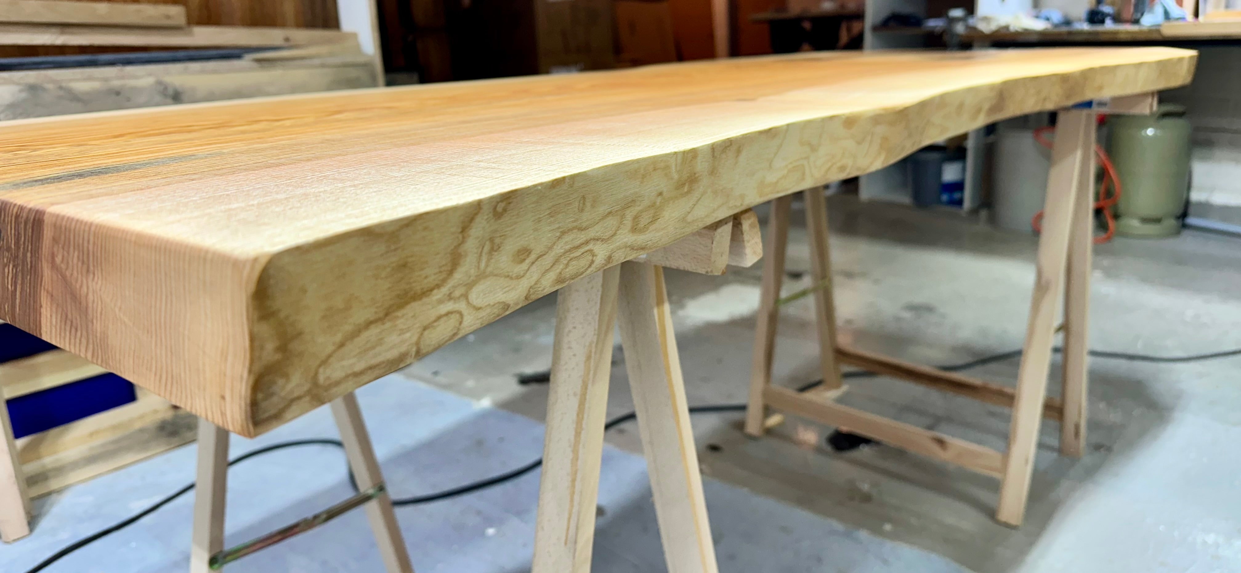 Die tolle Massivholzplatte aus einem Baumstamm kann als Esstisch- oder Schreibtischplatte genutzt werden.