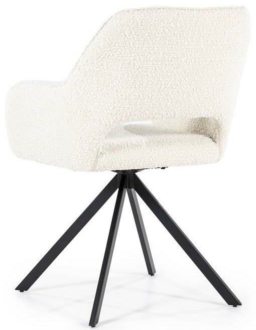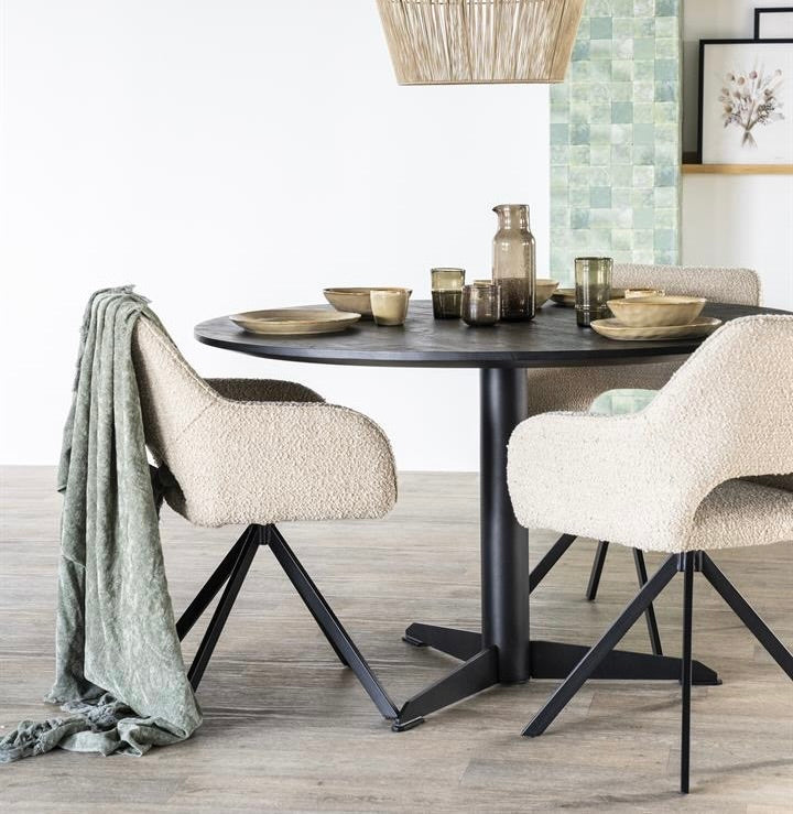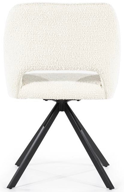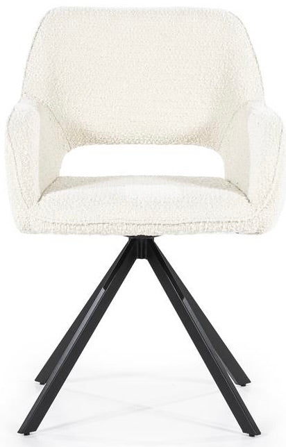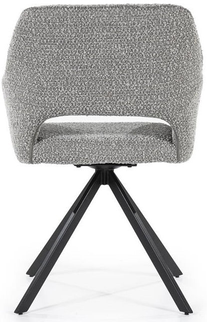 Der Drehstuhl hat ein schwarzes Metallgestell, dass drehbar ist und immer wieder in die ursprüngliche Sitzposition zurückkehrt.