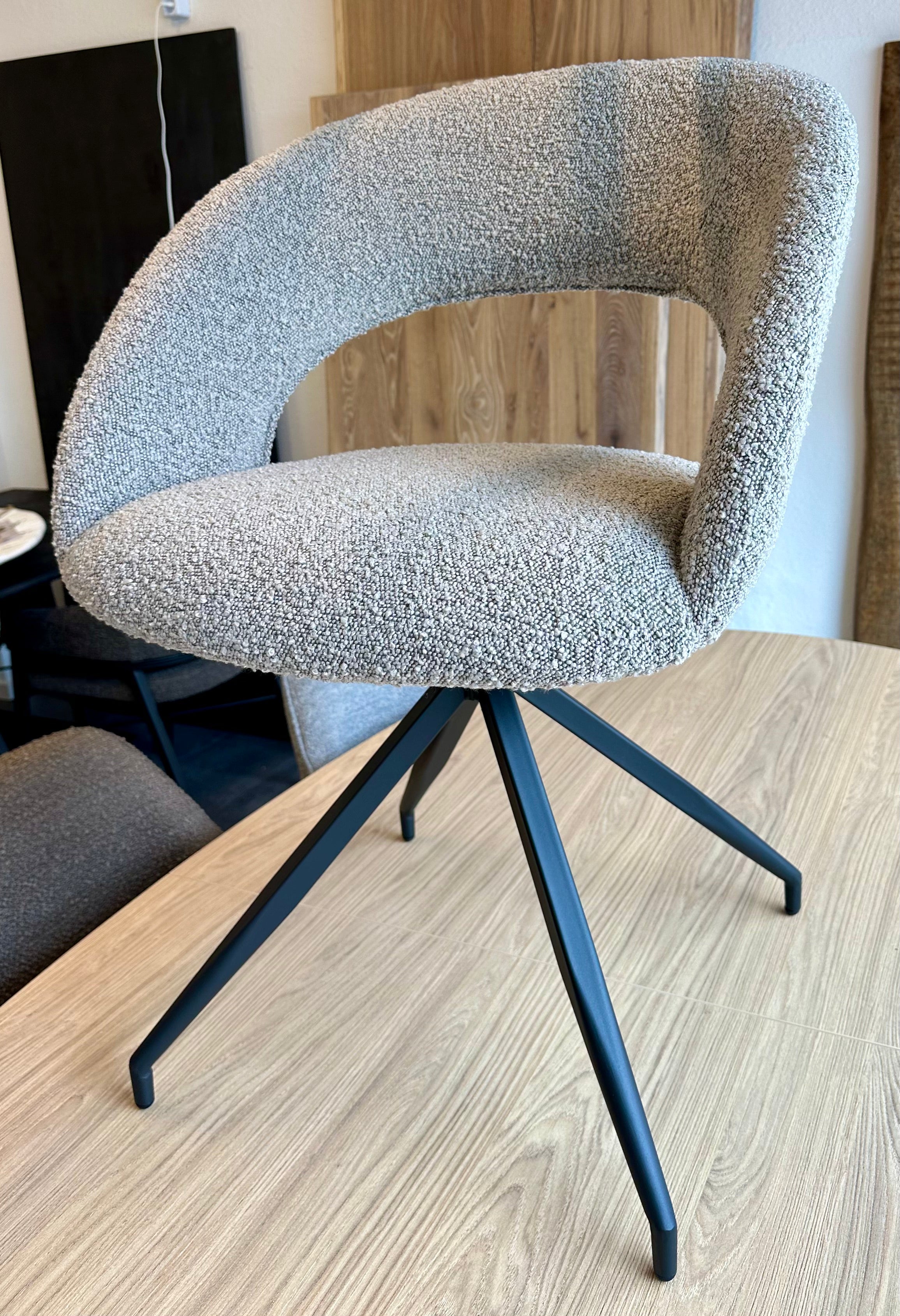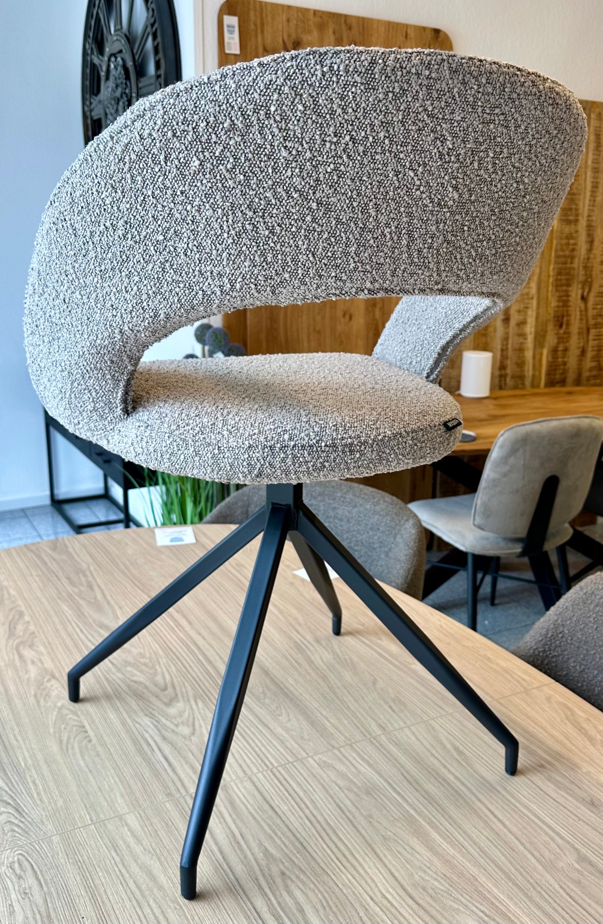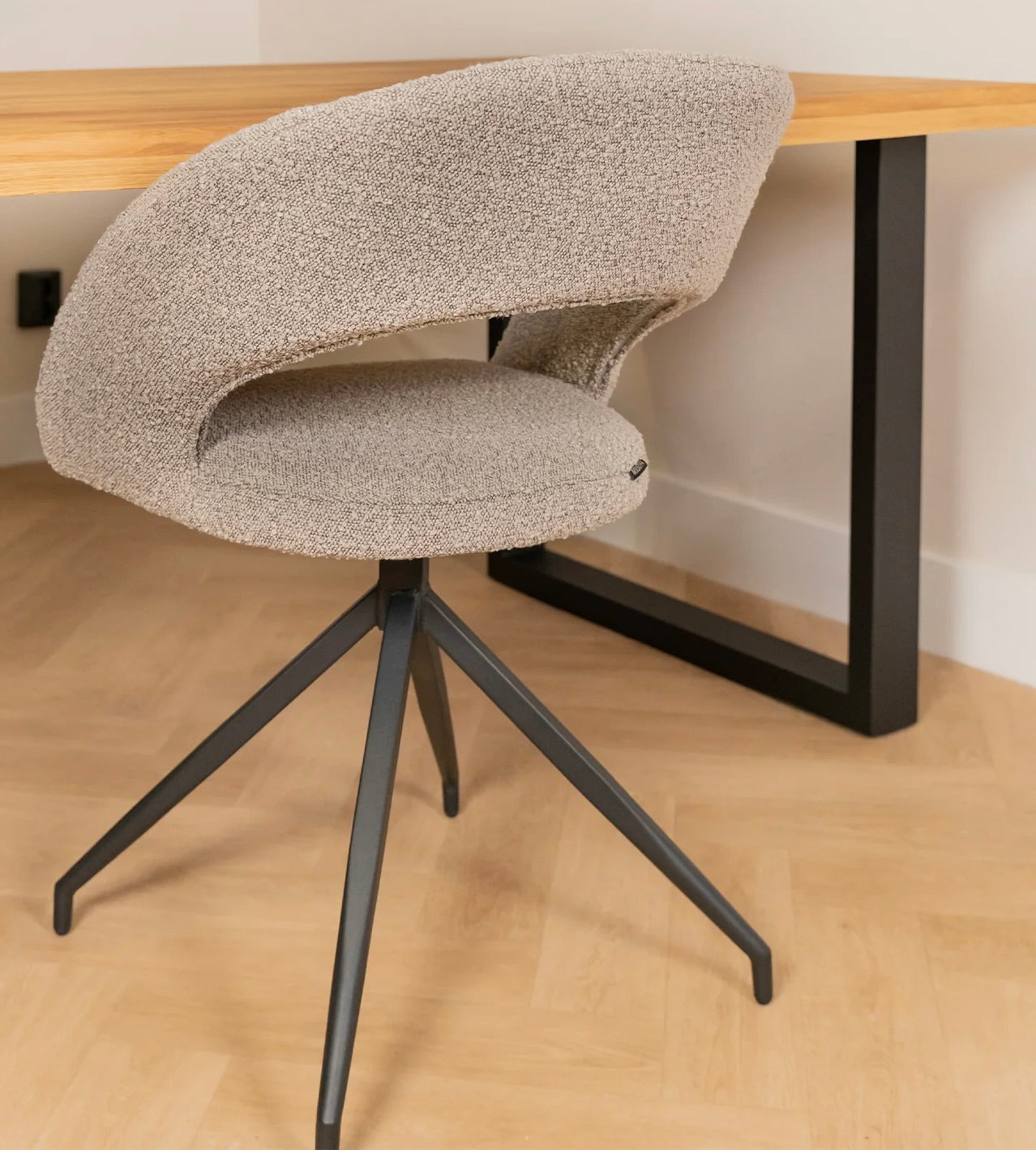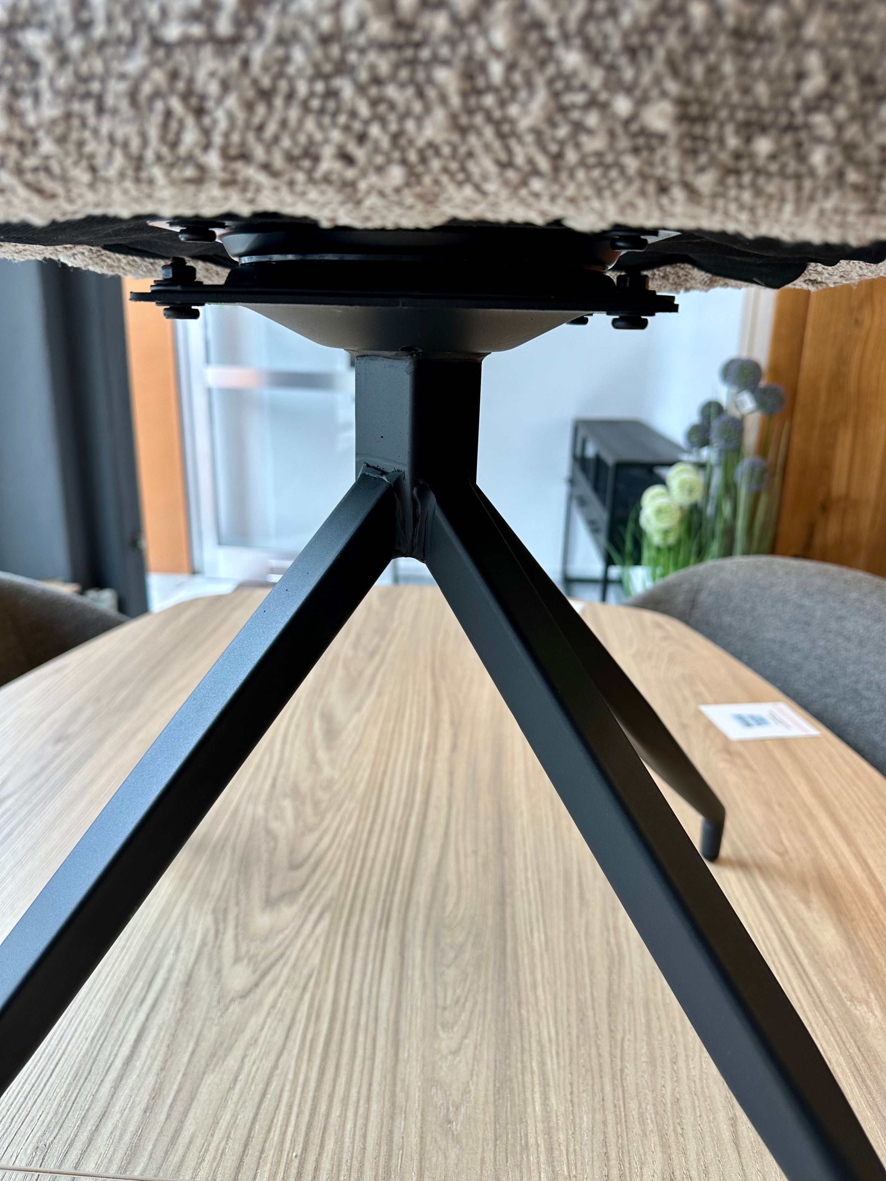 Der Drehstuhl hat ein schwarzes Metallgestell, dass drehbar ist und immer wieder in die ursprüngliche Sitzposition zurückkehrt.