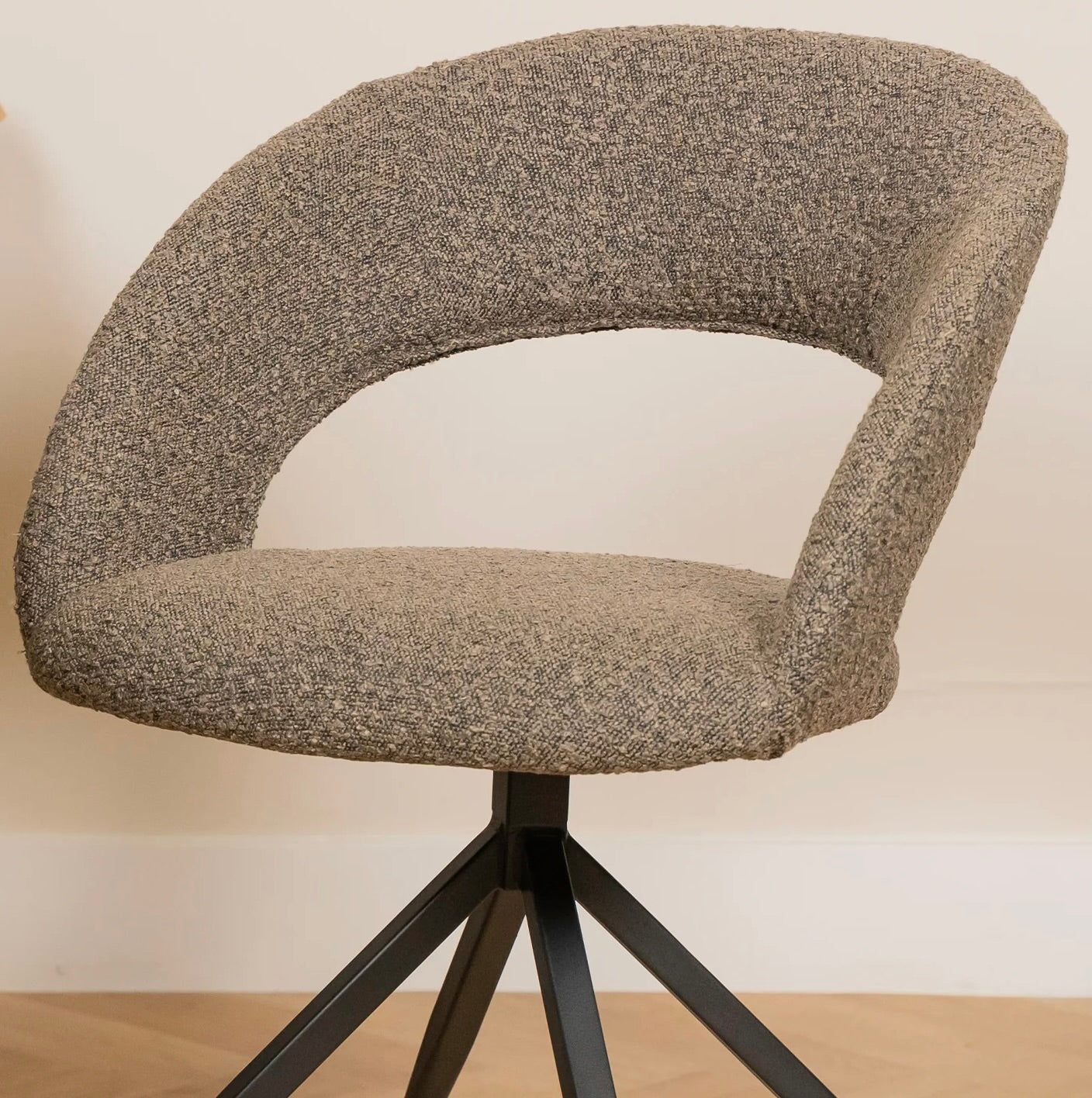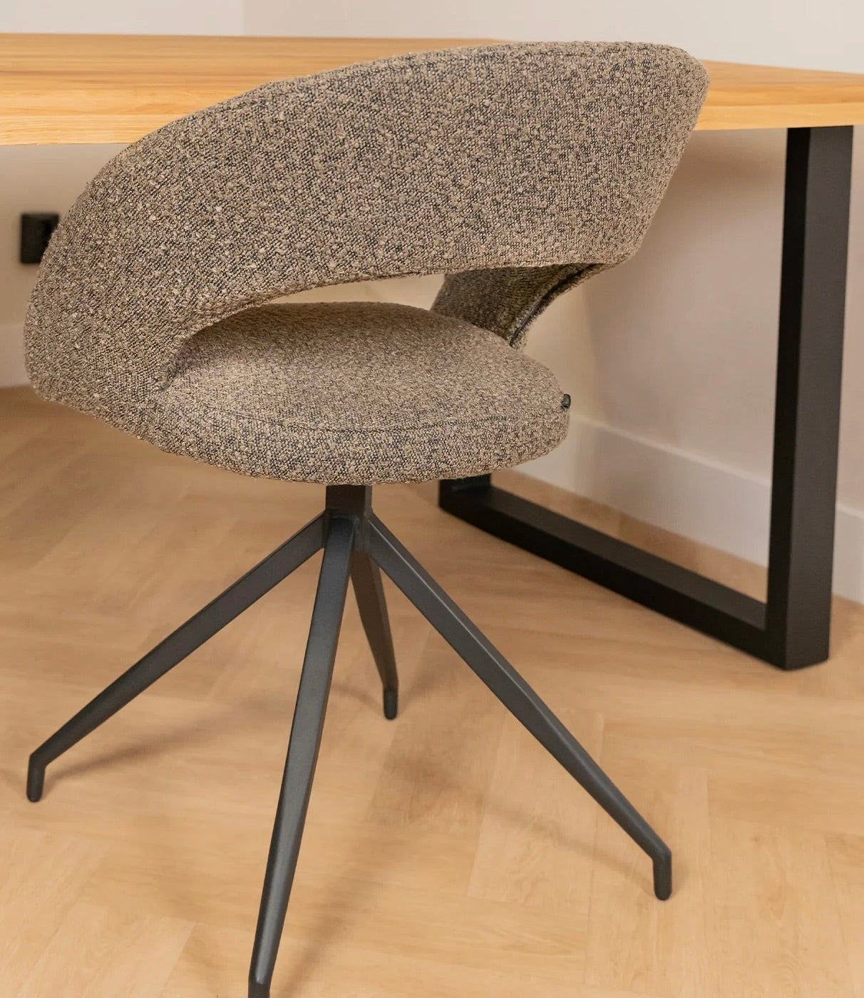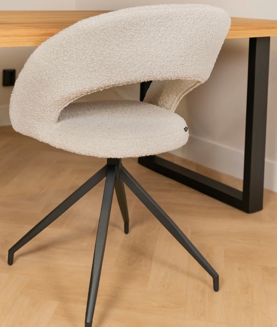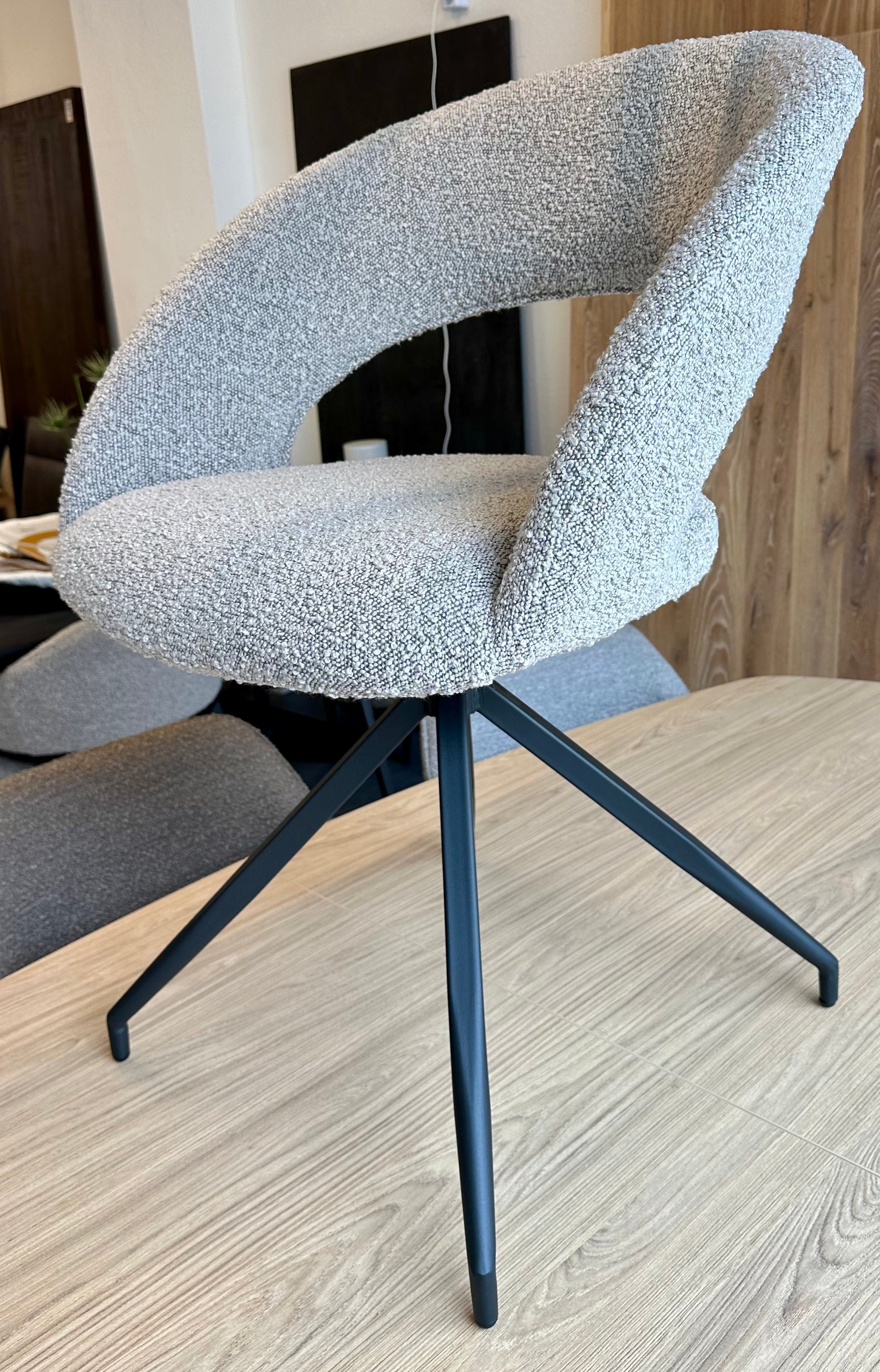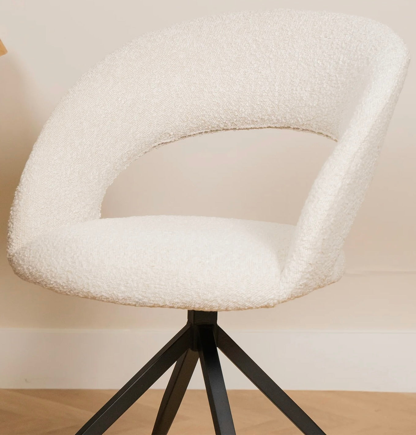 Der Drehstuhl hat ein schwarzes Metallgestell, dass drehbar ist und immer wieder in die ursprüngliche Sitzposition zurückkehrt.