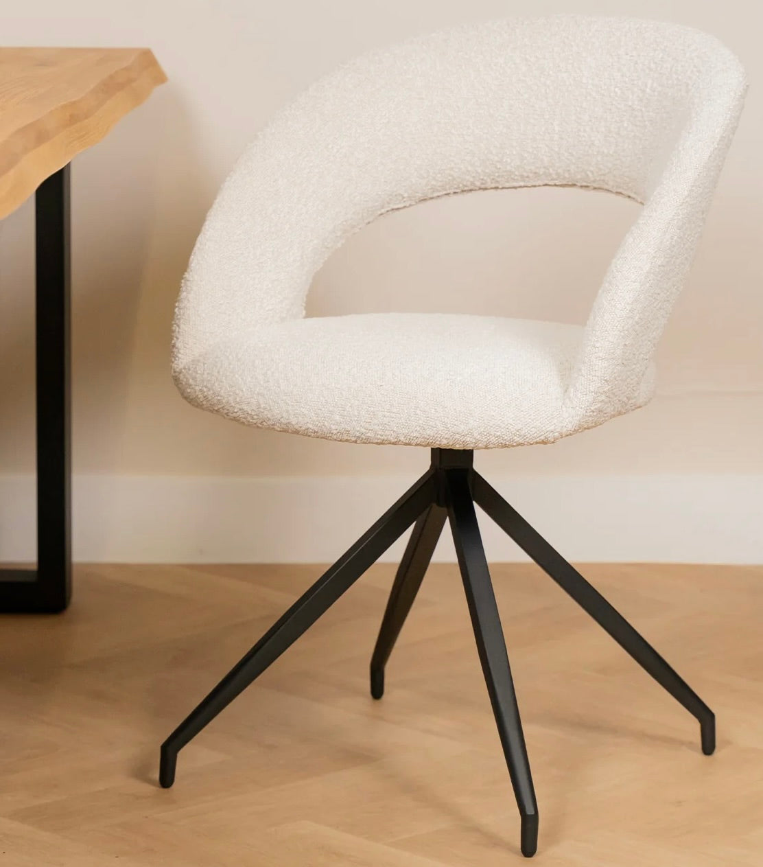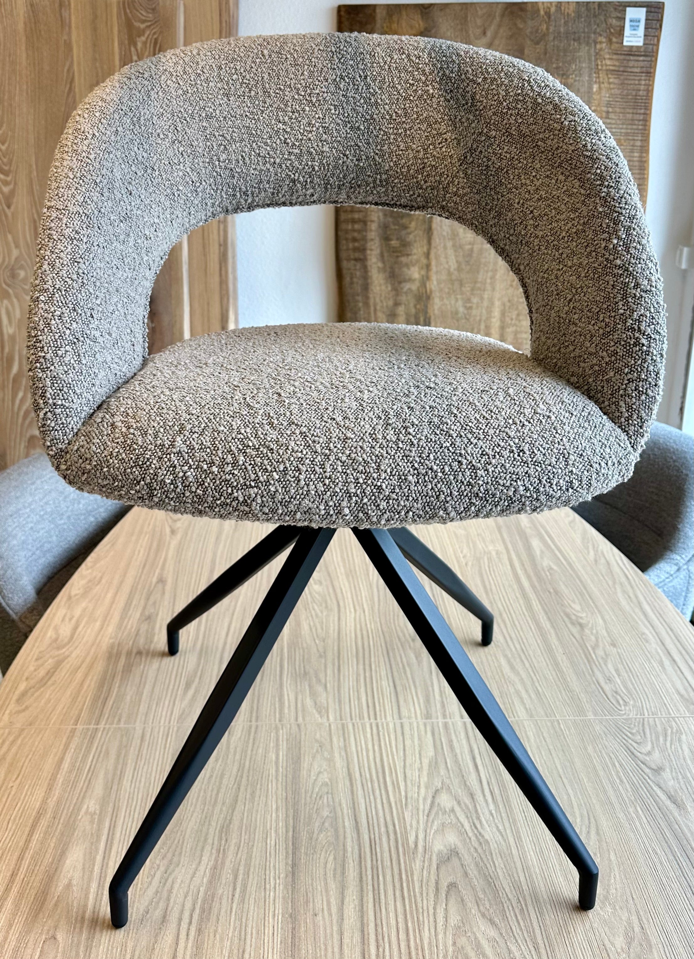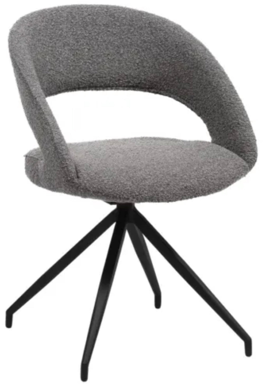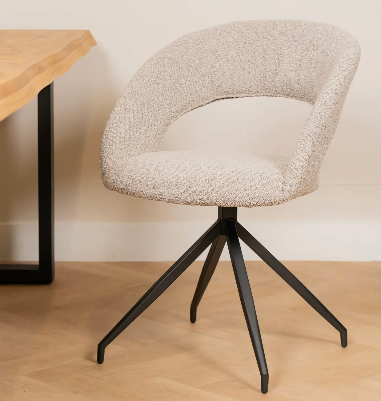 Der Drehstuhl hat ein schwarzes Metallgestell, dass drehbar ist und immer wieder in die ursprüngliche Sitzposition zurückkehrt.