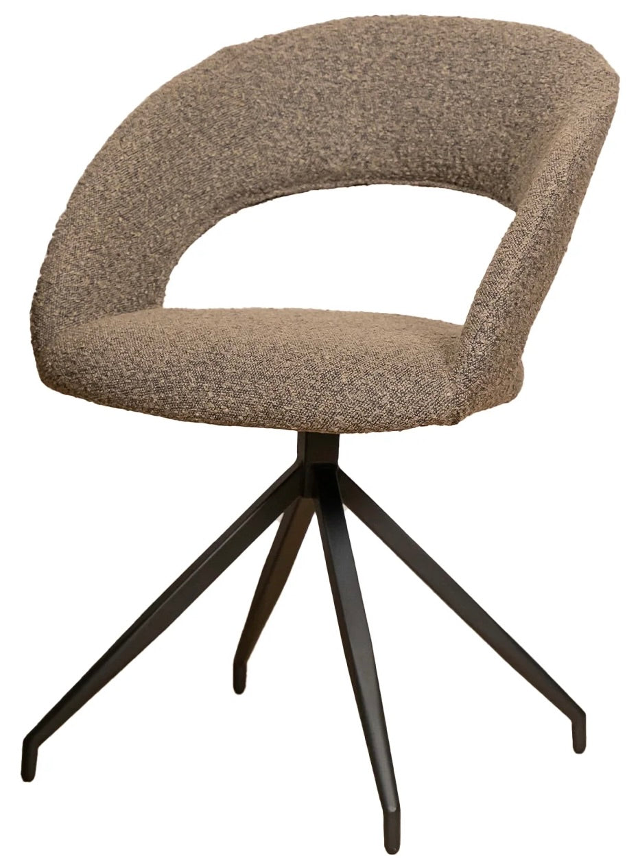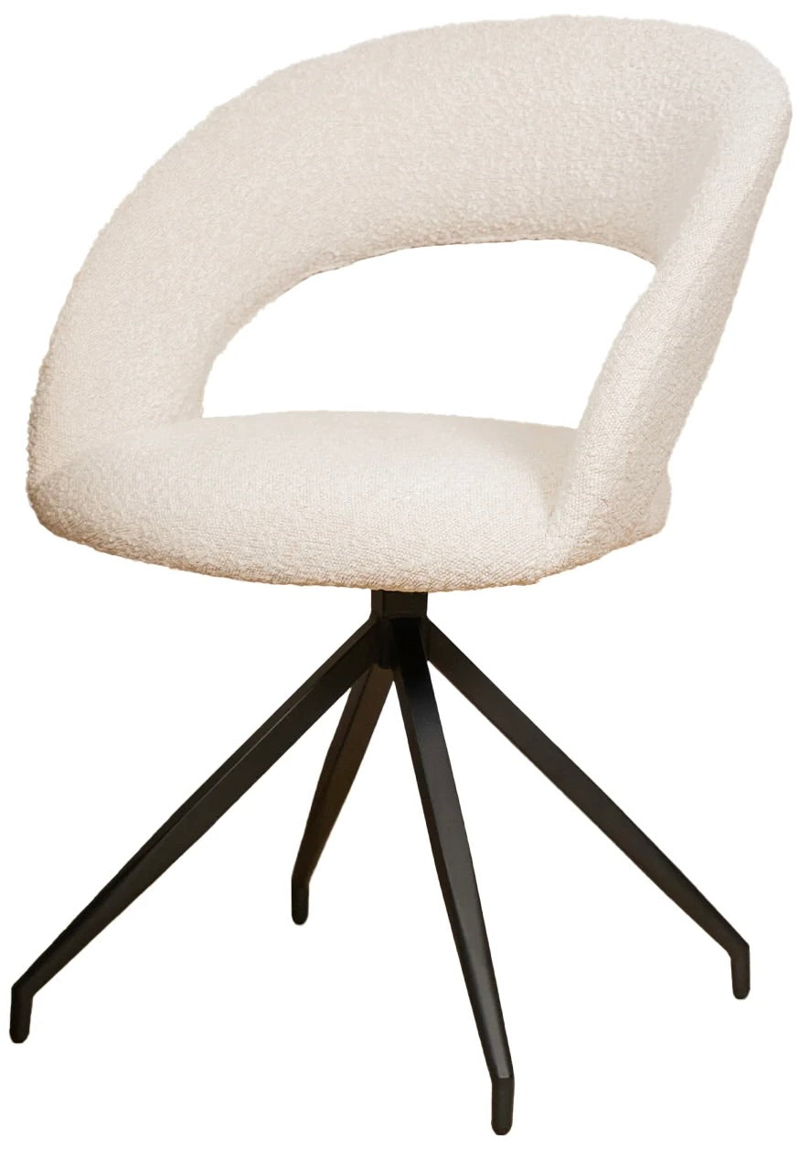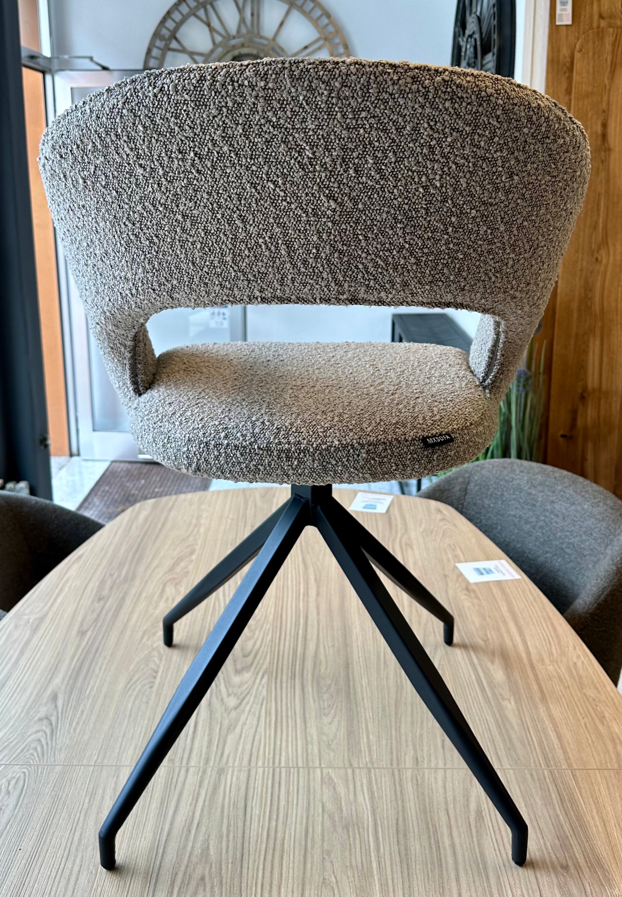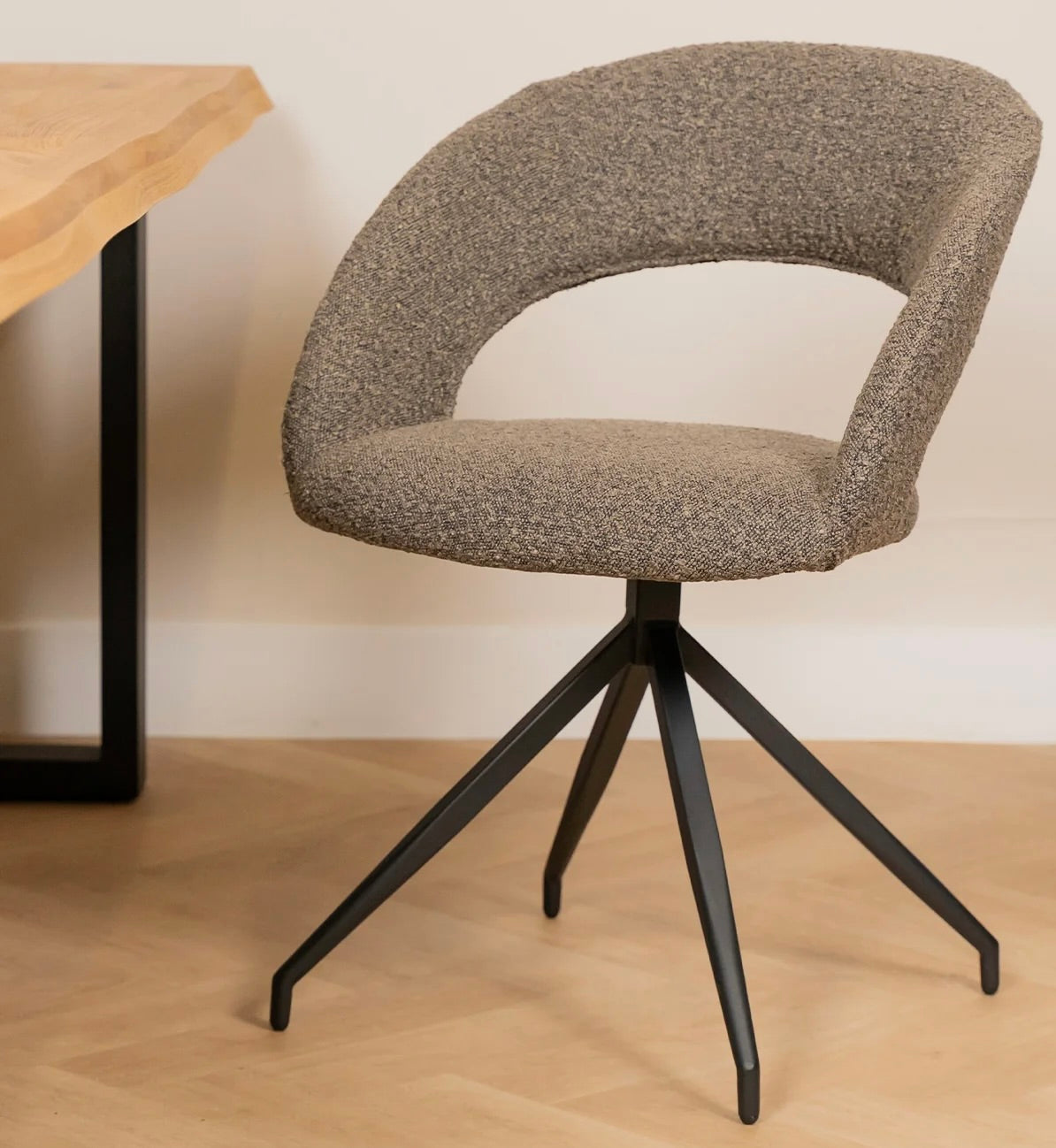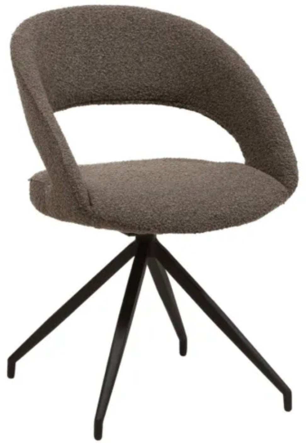 Der Drehstuhl hat ein schwarzes Metallgestell, dass drehbar ist und immer wieder in die ursprüngliche Sitzposition zurückkehrt.
