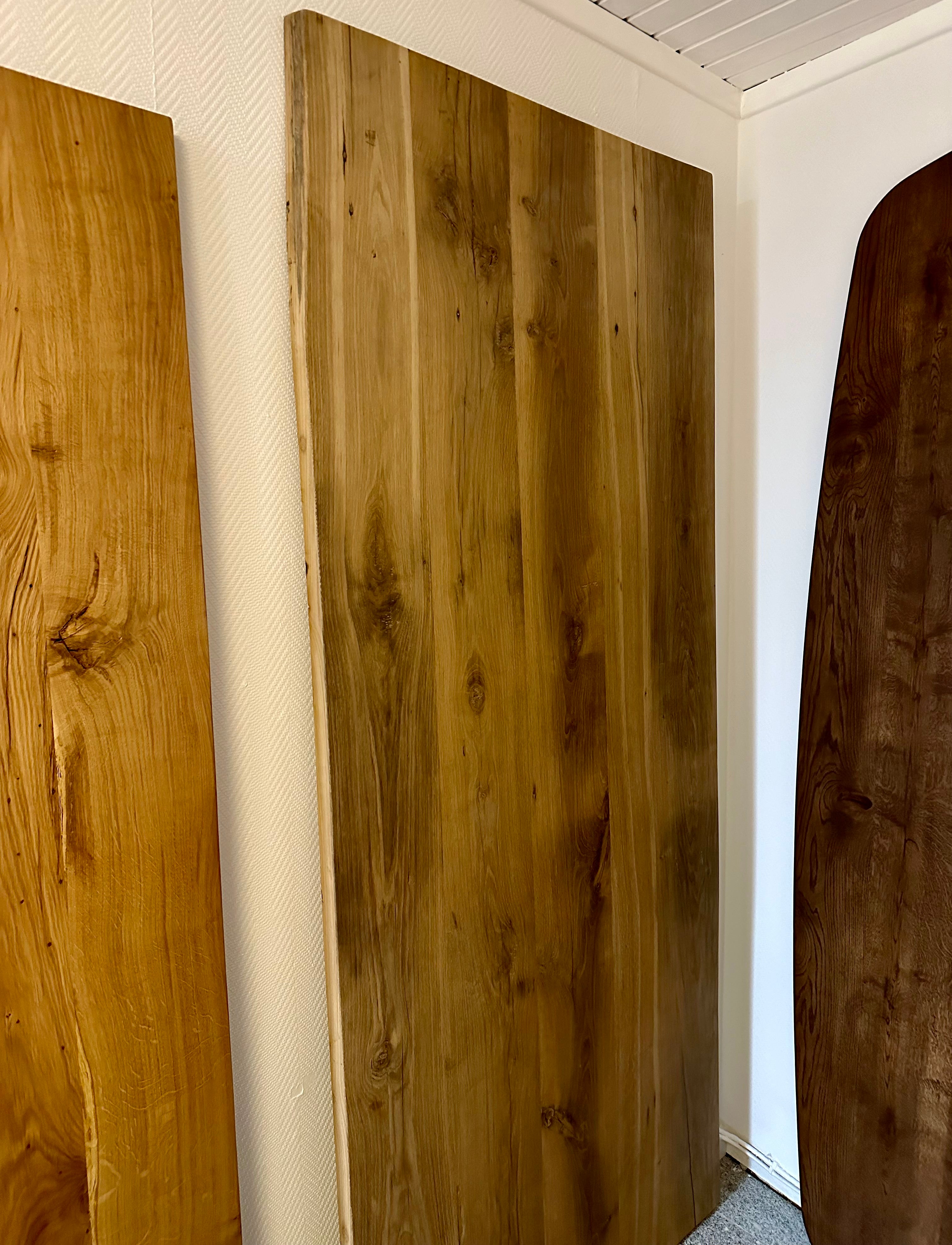 In unserer Werkstatt bauen wir auch Baumstammplatten aus einem Stamm, Tischplatten mit allen Kanten Formen und aus vielen Holzarten.