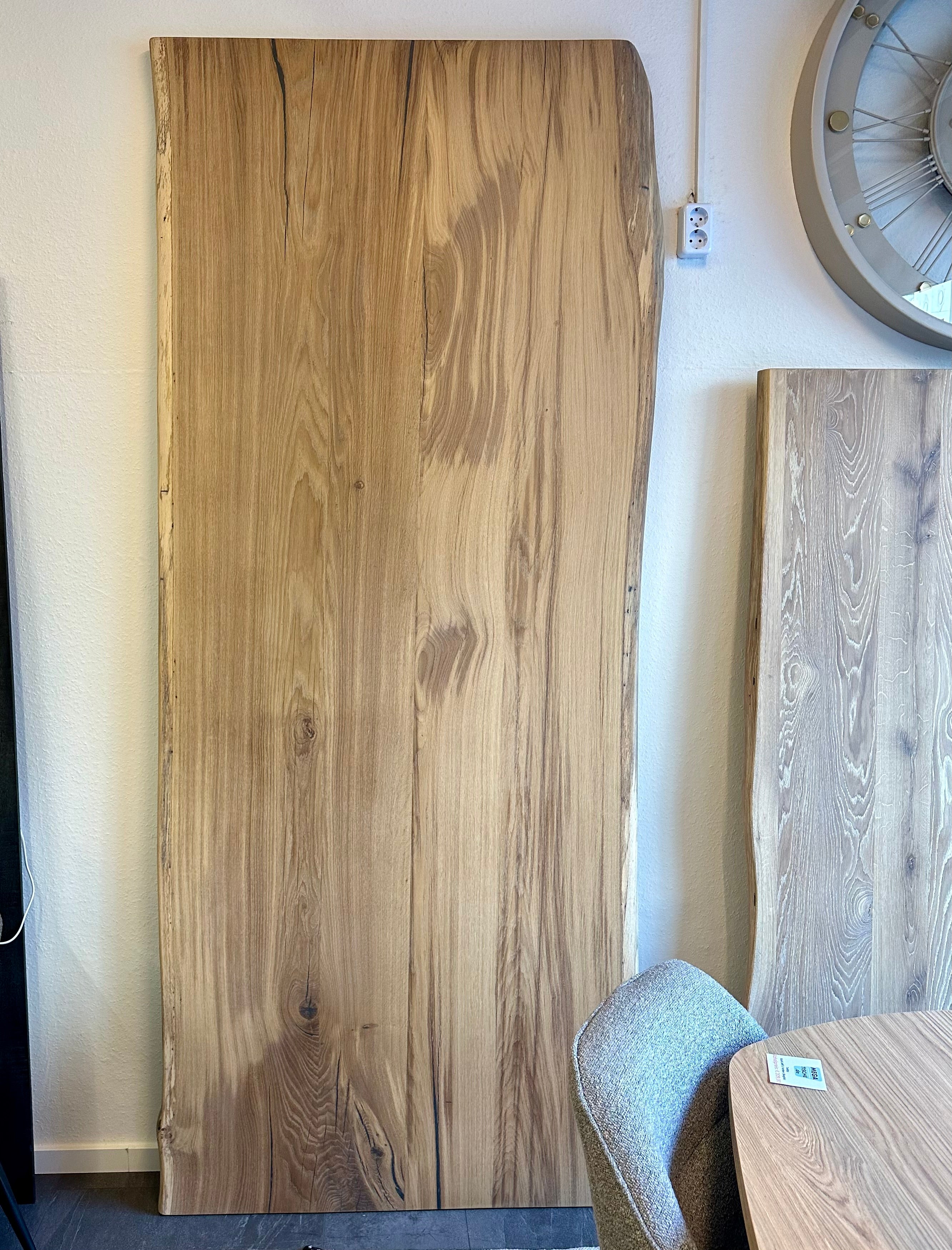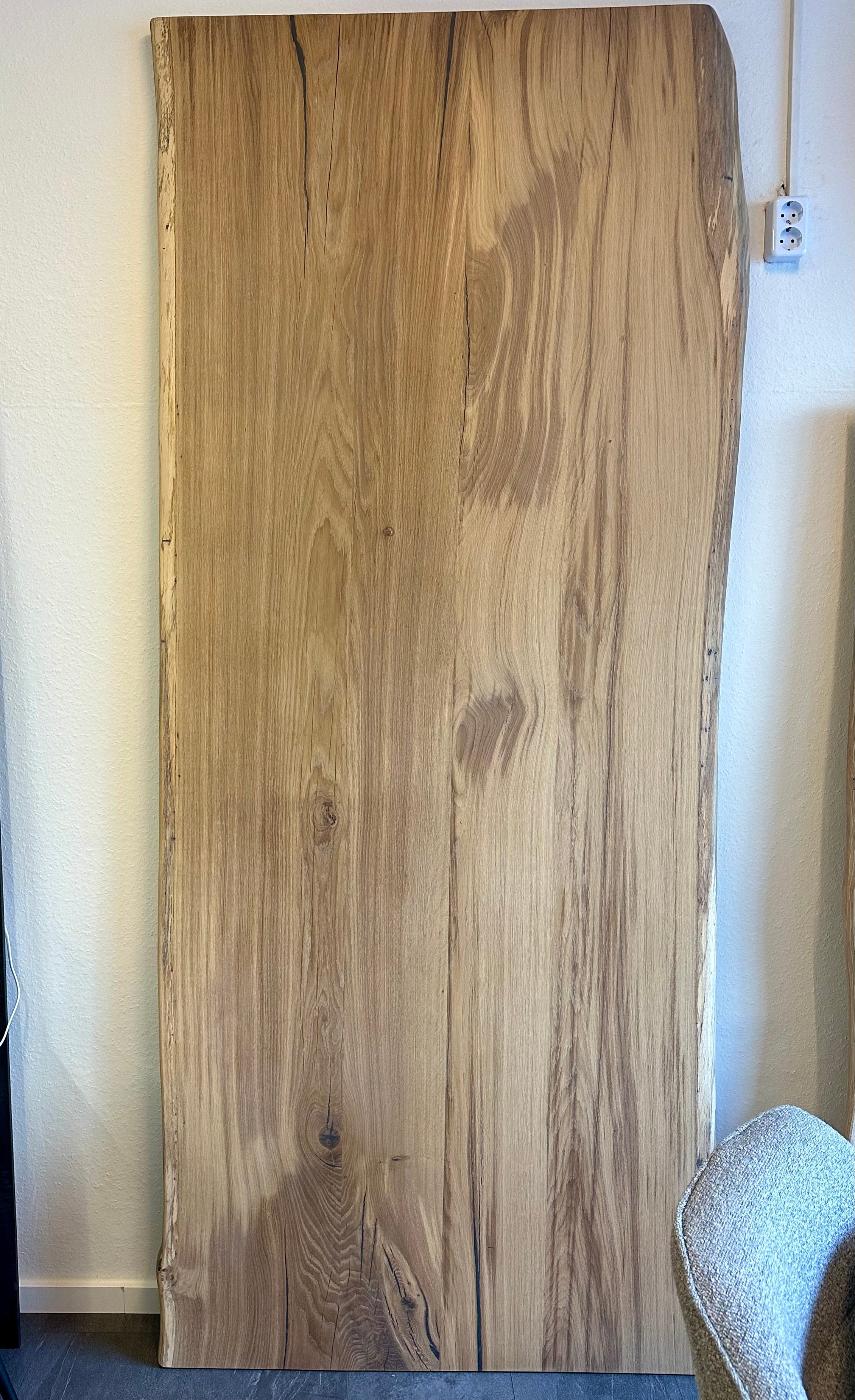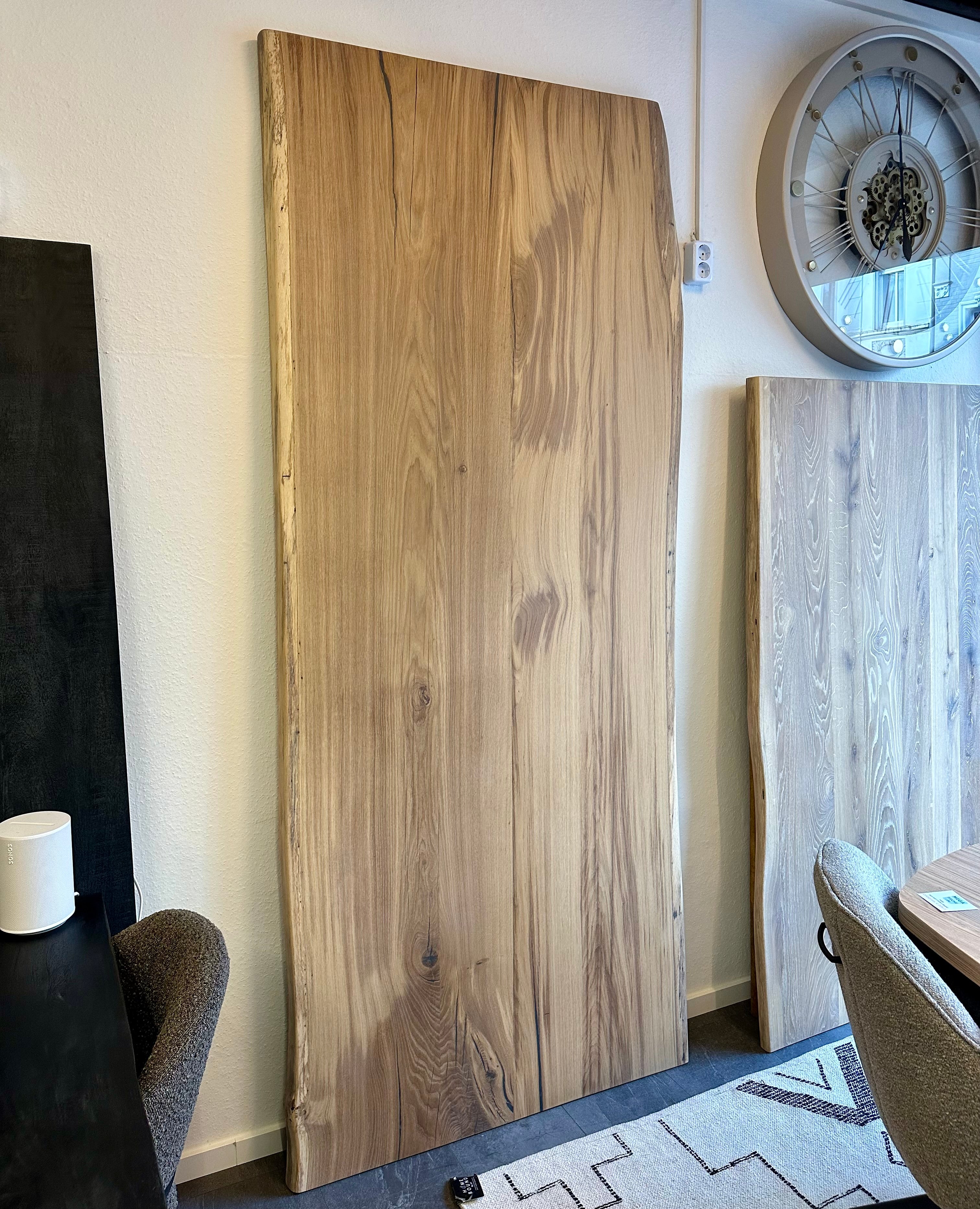 Eine mega schöne Tischplatte aus Wildeiche naturel beige geölt mit Baumkante 5,5 cm dick und vollmassiv.