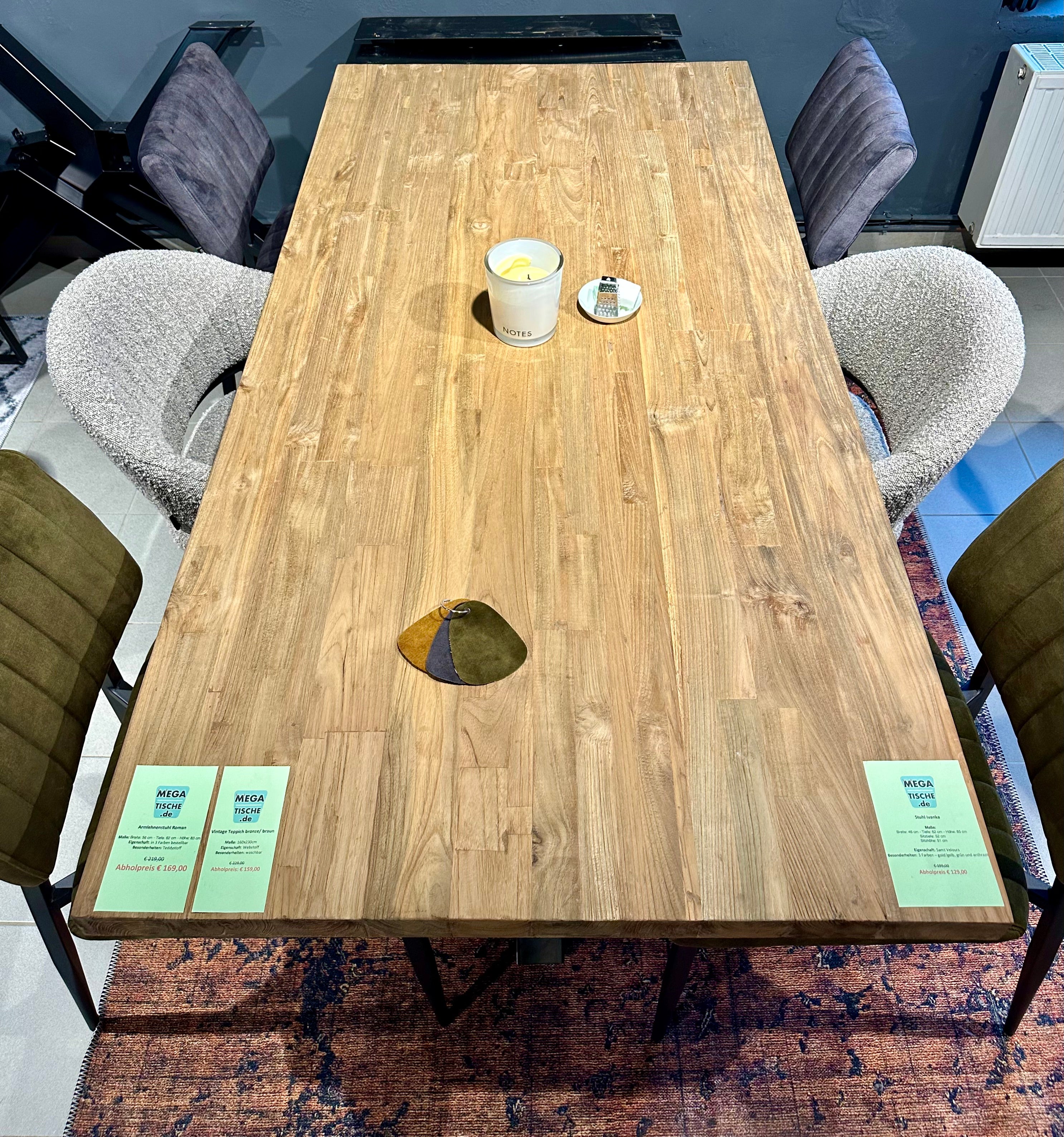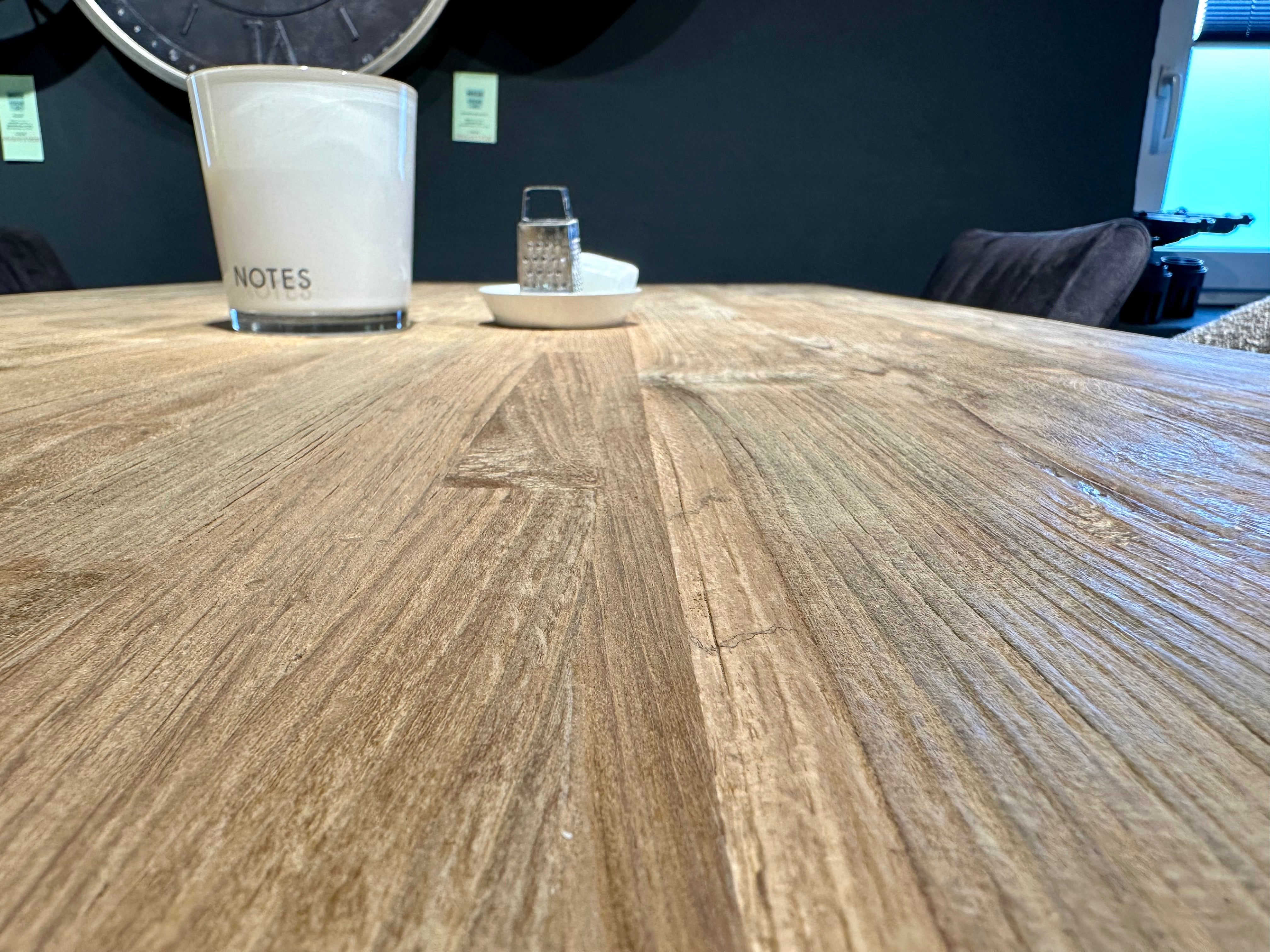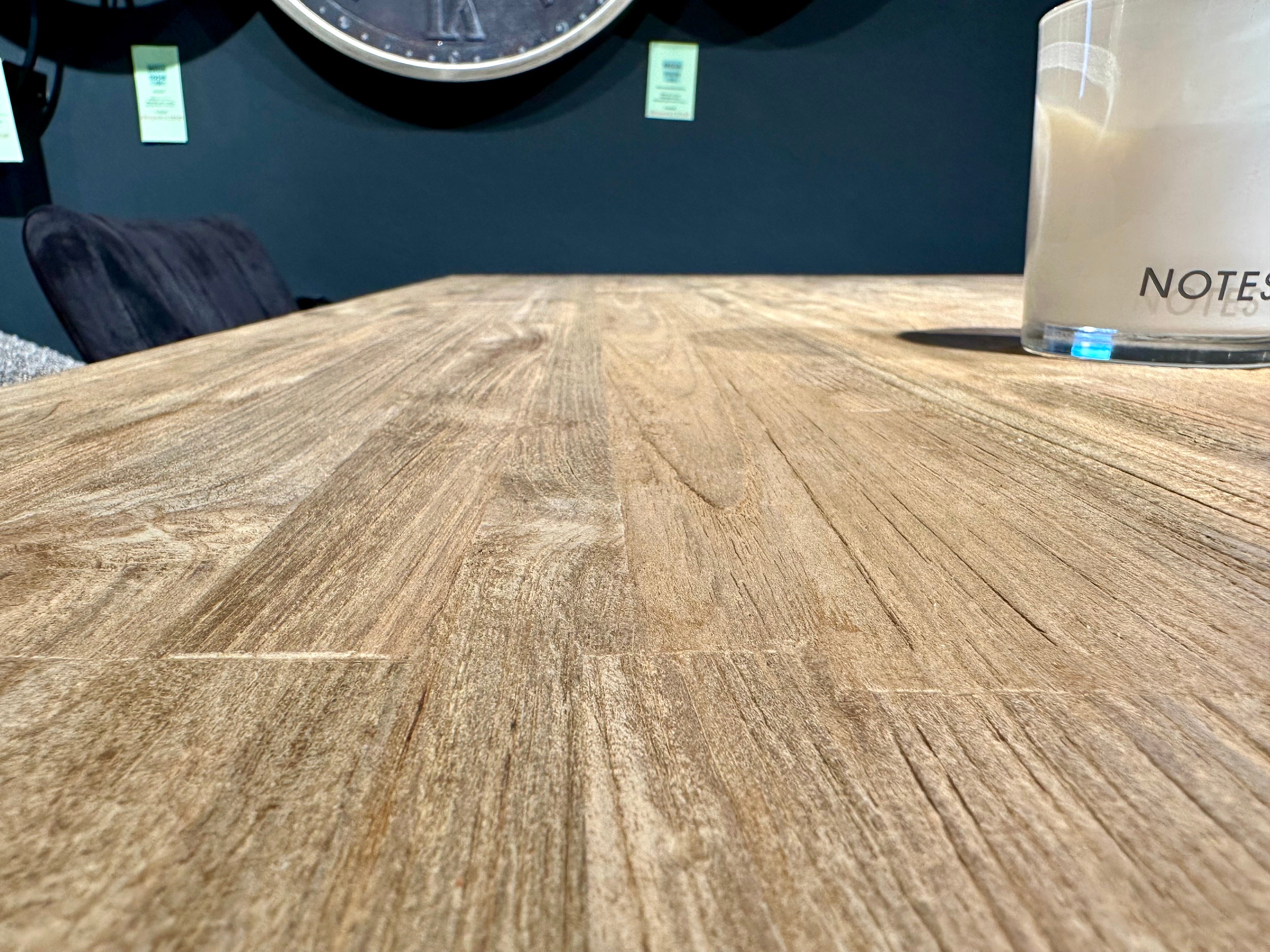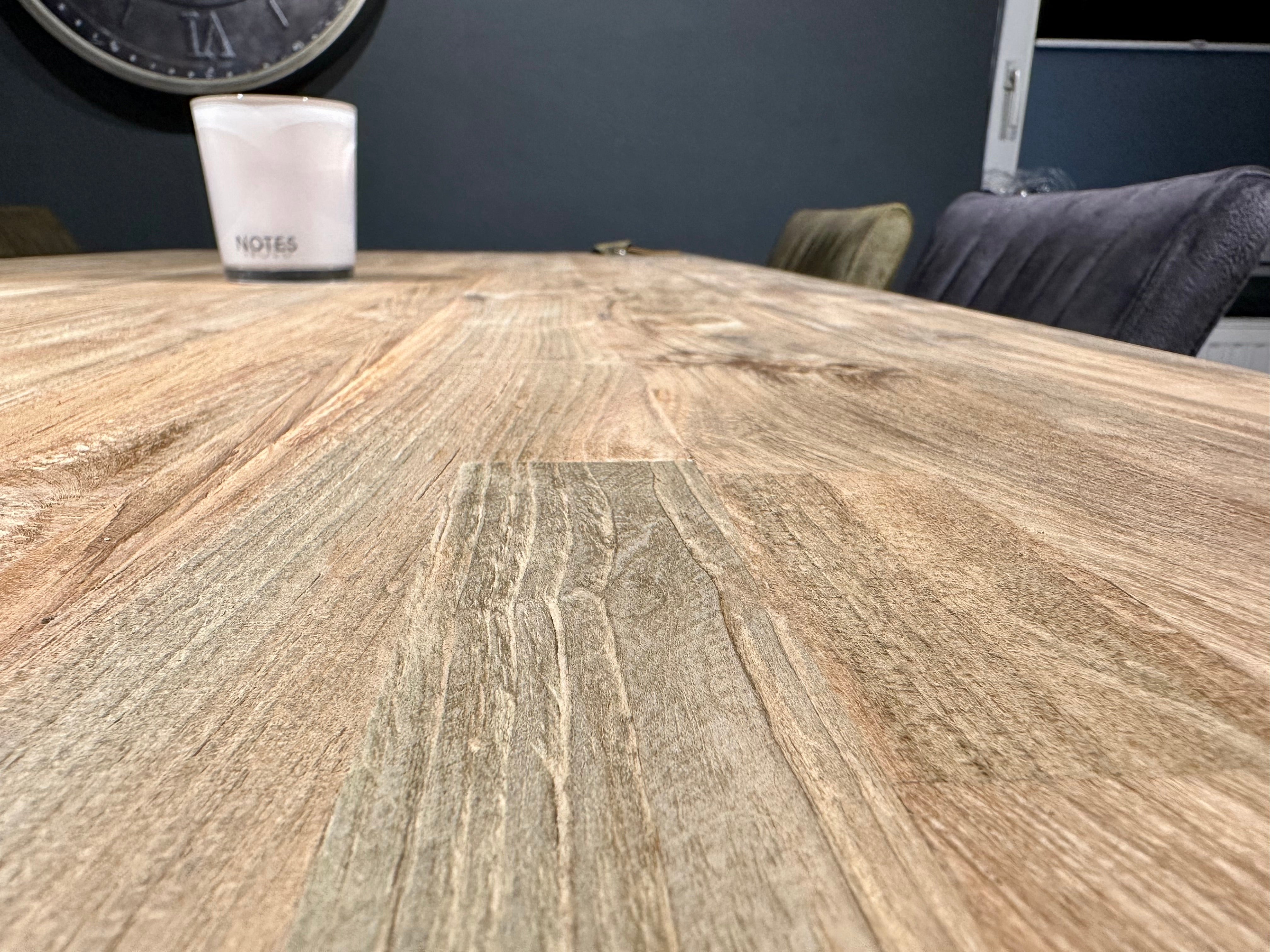 Die Holzplatte ist 5 cm vollmassiv (durchgehend) dick. Der Tisch ist aus natürlichem Echtholz und hat einen tollen und natürlichen Charakter.