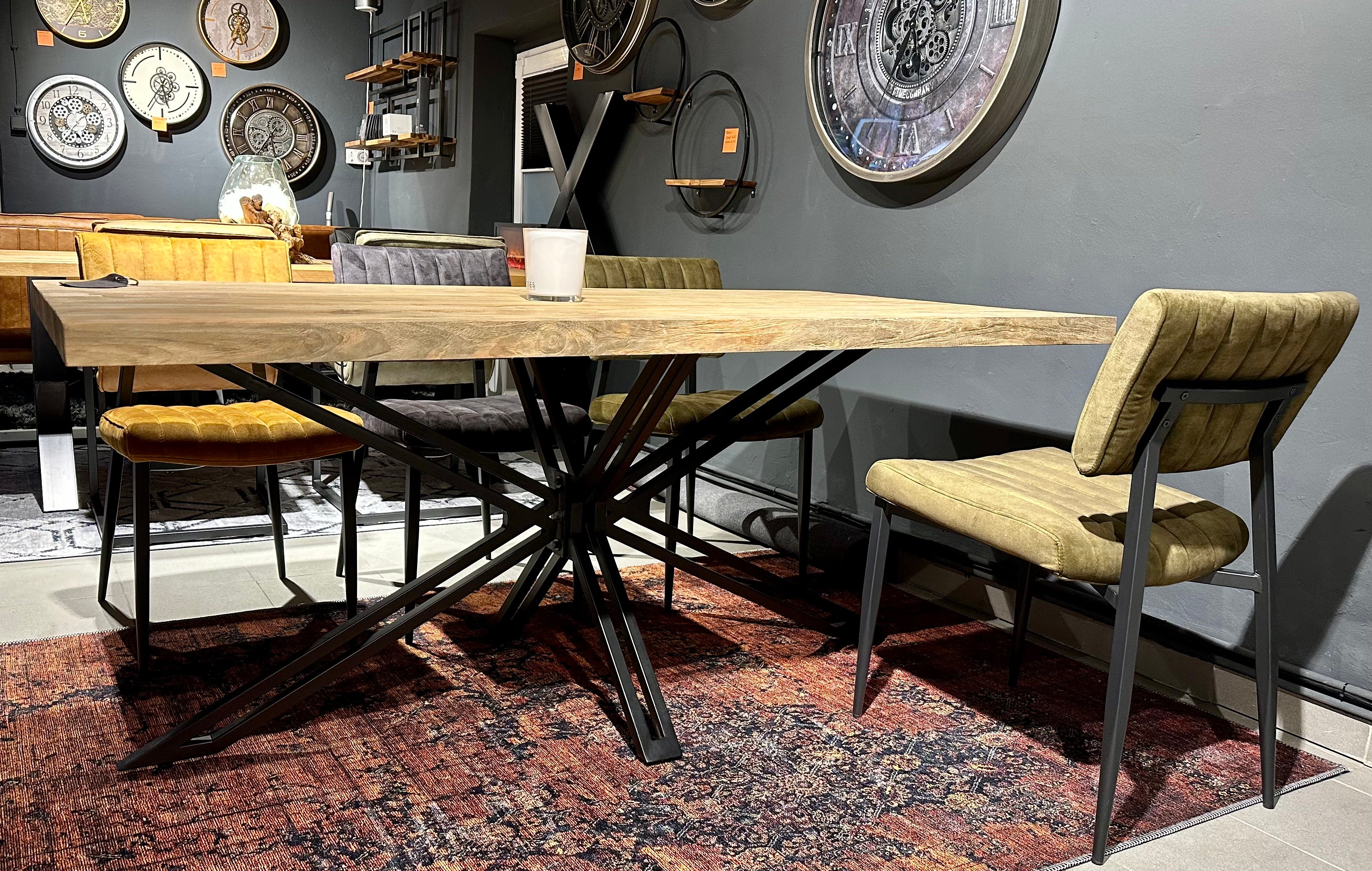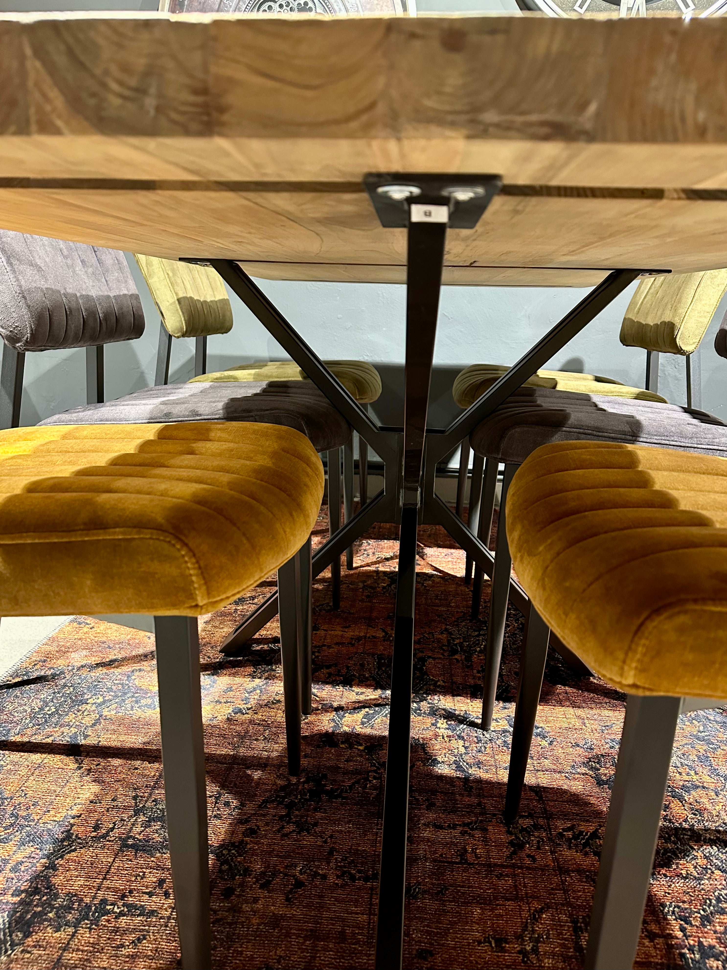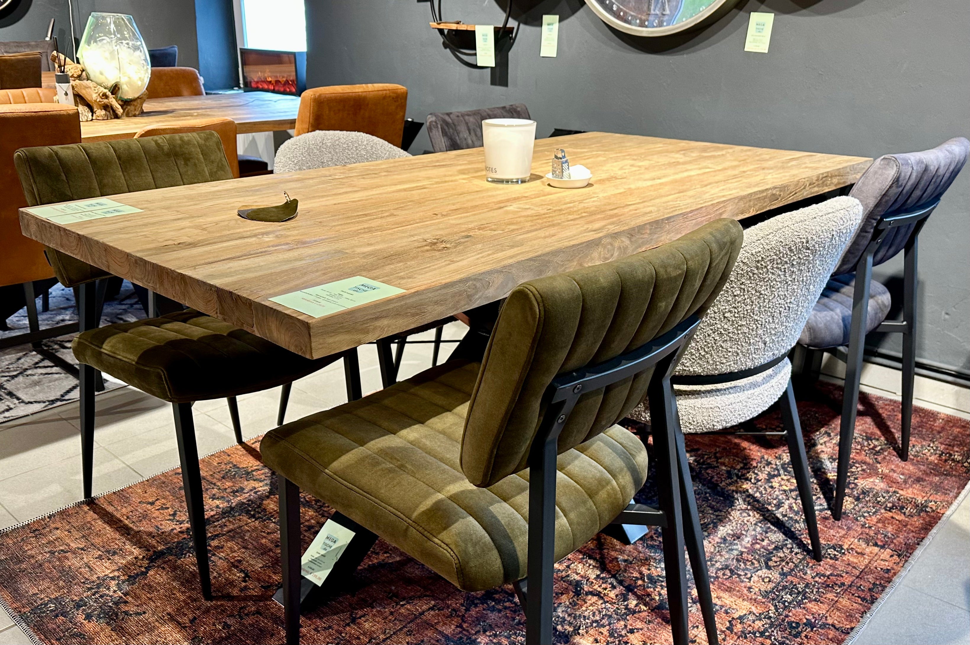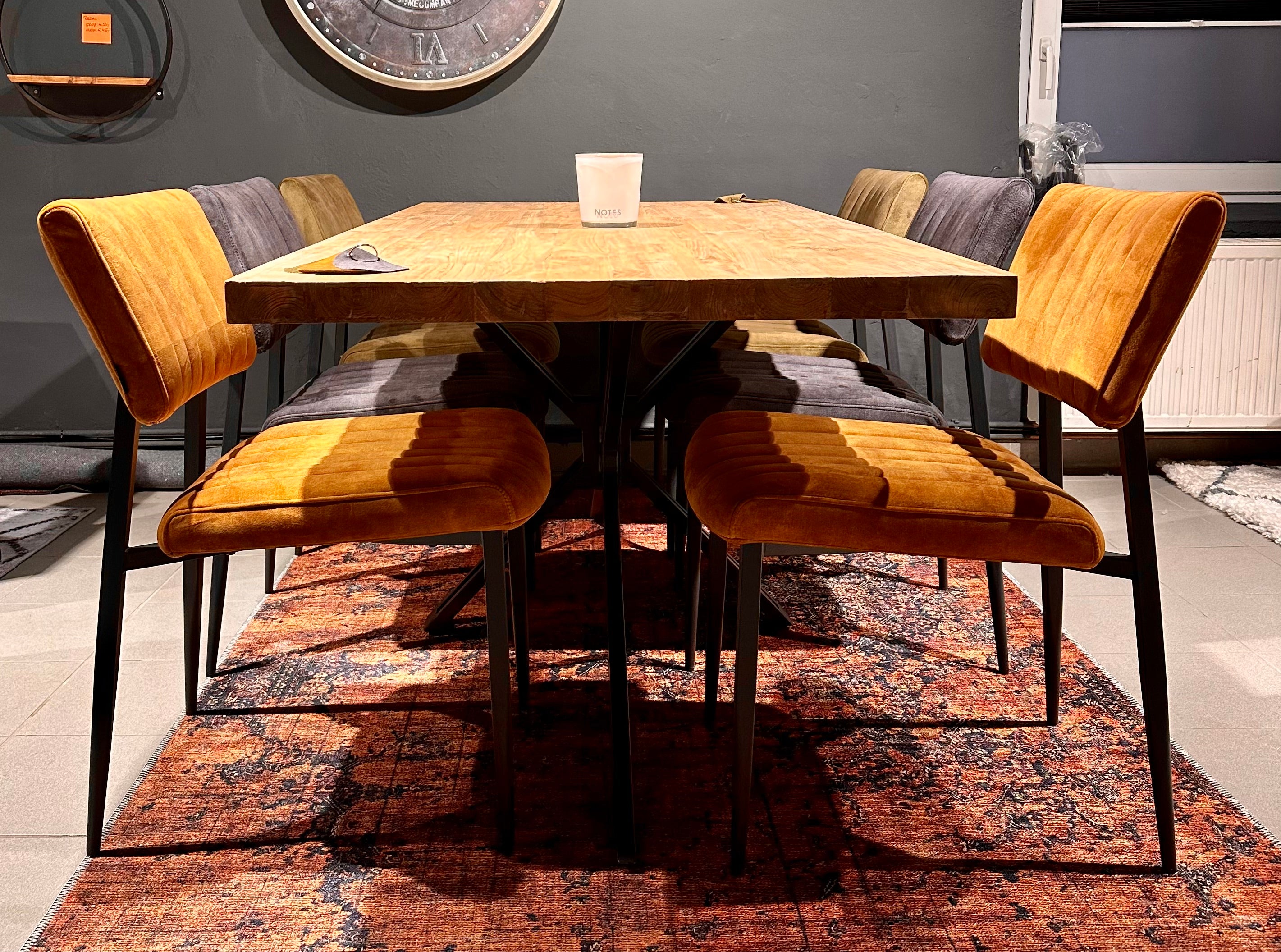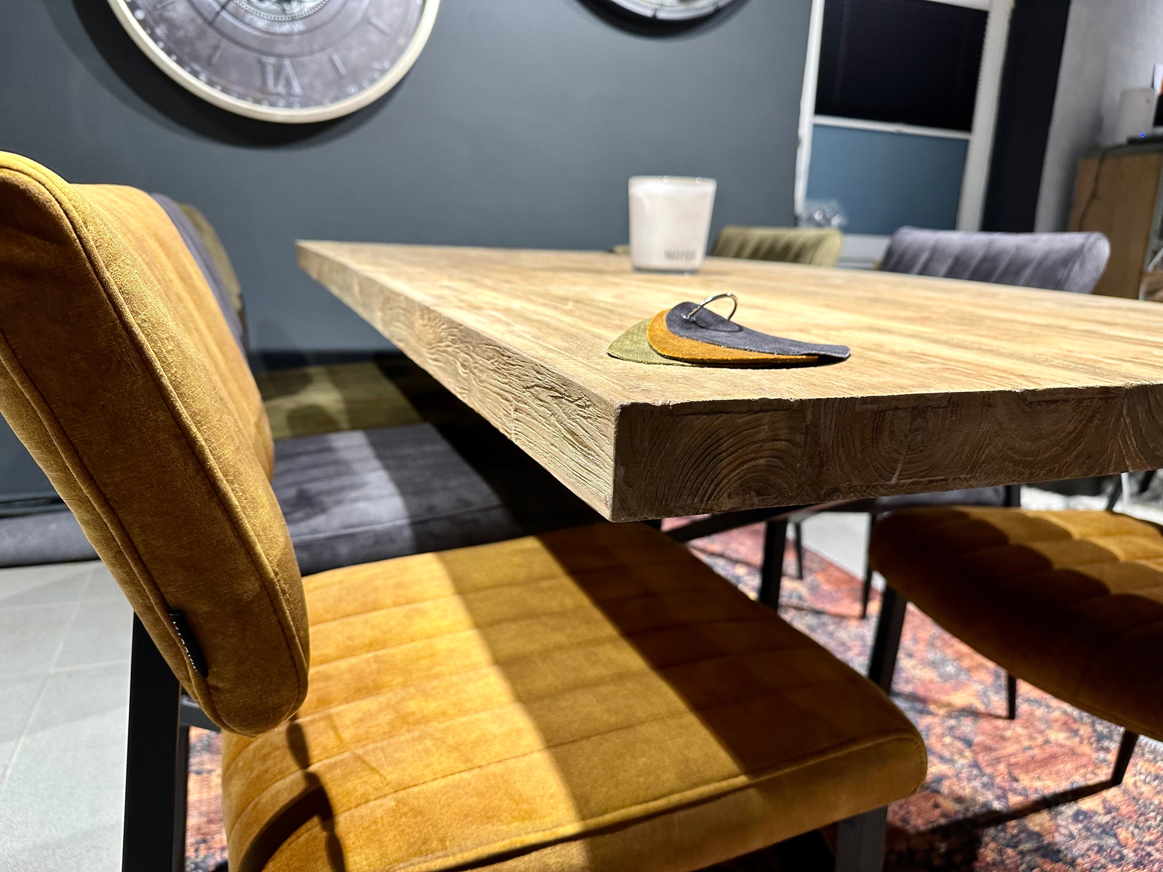 Die Holzplatte ist 5 cm vollmassiv (durchgehend) dick. Der Tisch ist aus natürlichem Echtholz und hat einen tollen und natürlichen Charakter.
