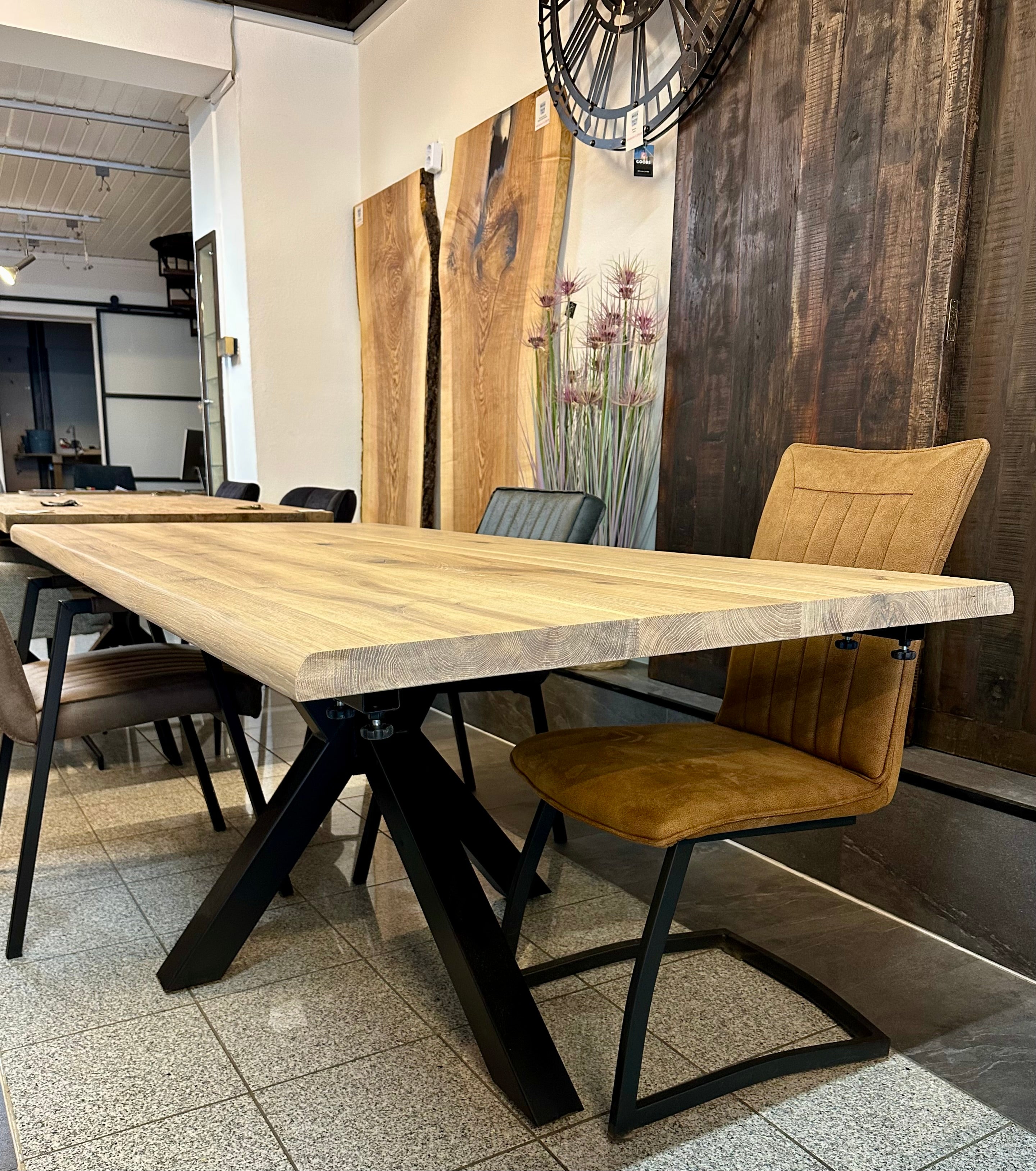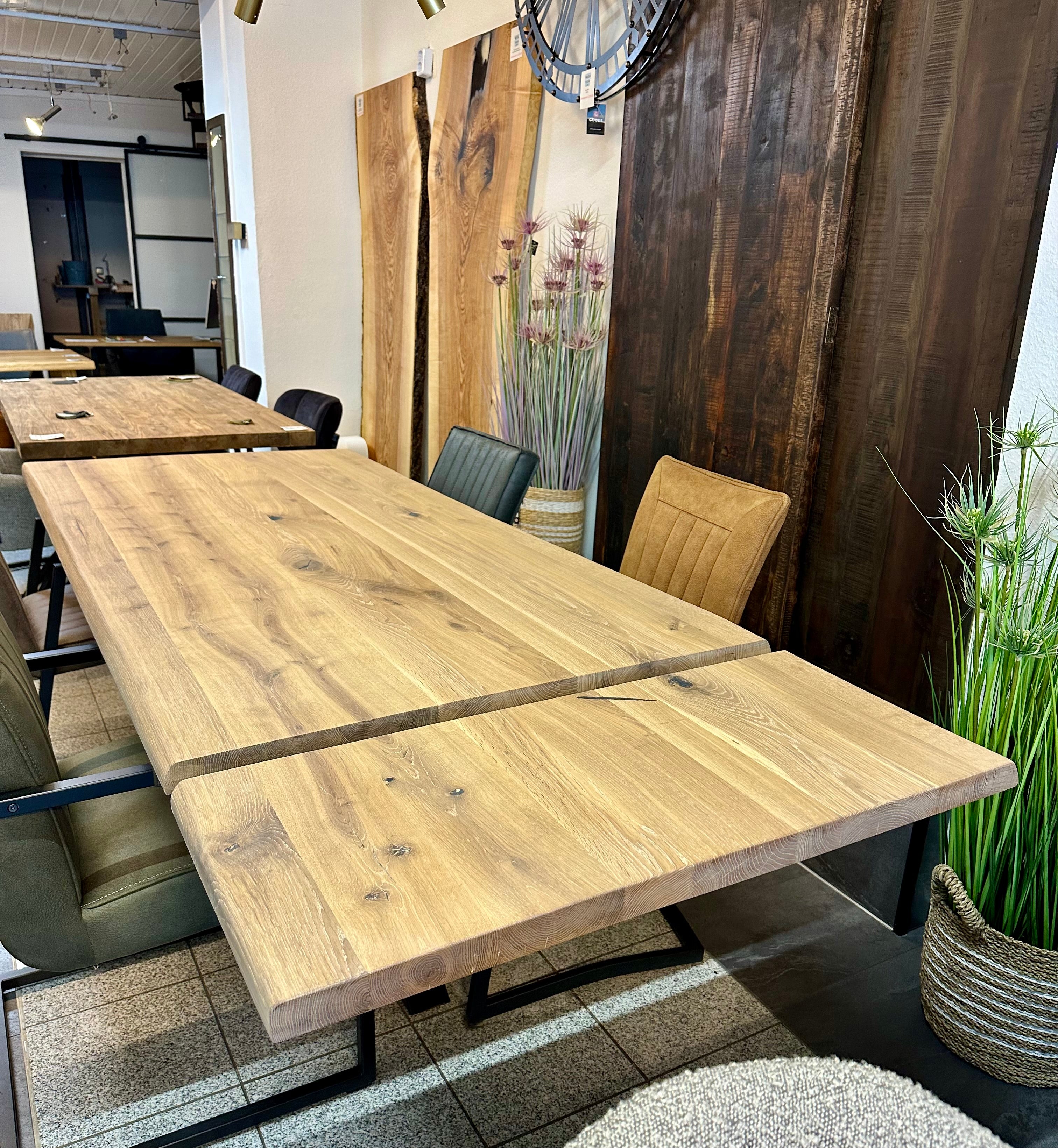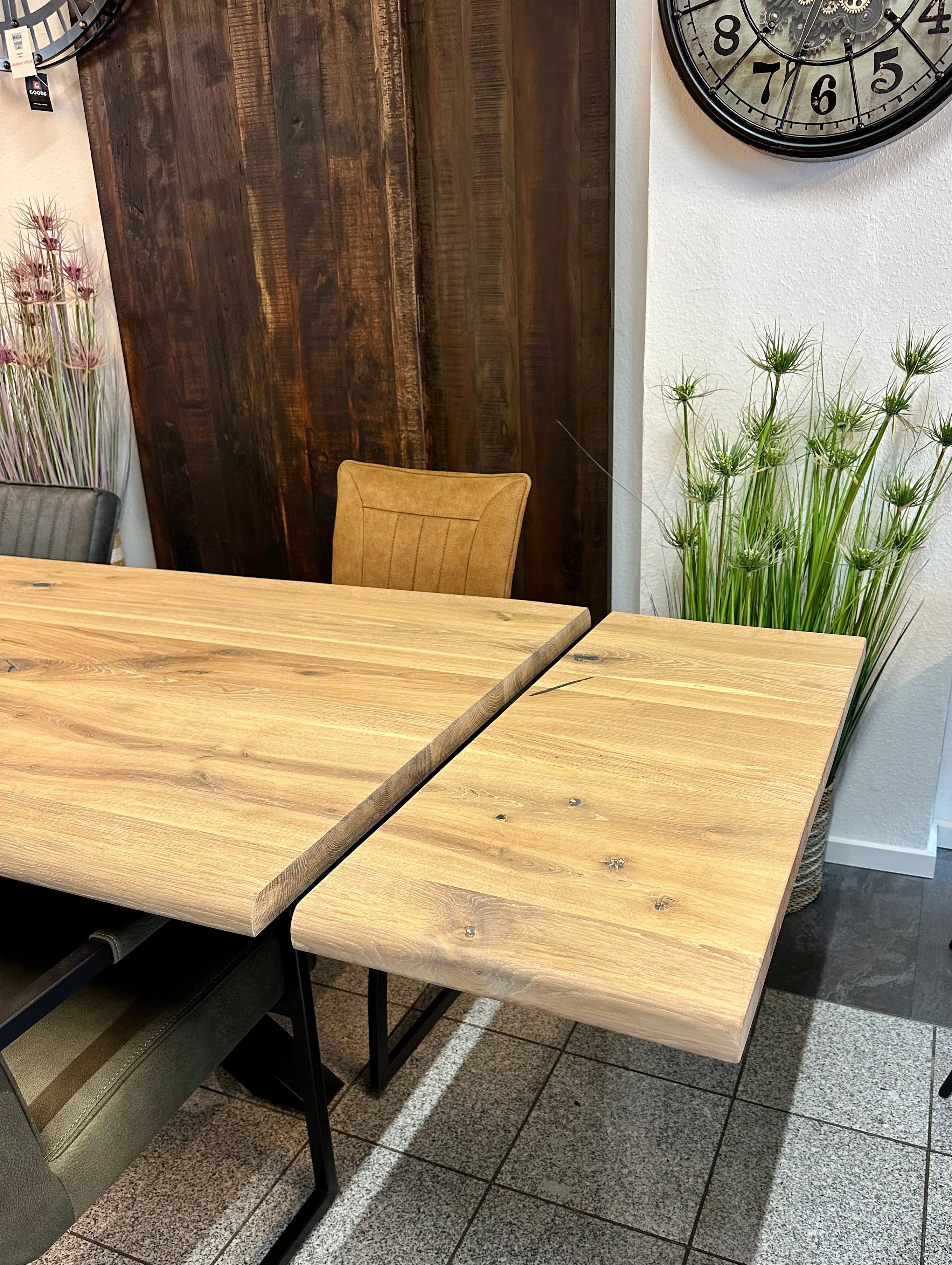 Baumkante Esstisch Einzelstück Eiche natural geölt 200 auf 240 cm mit Ansteckplatte und Spider Gestell