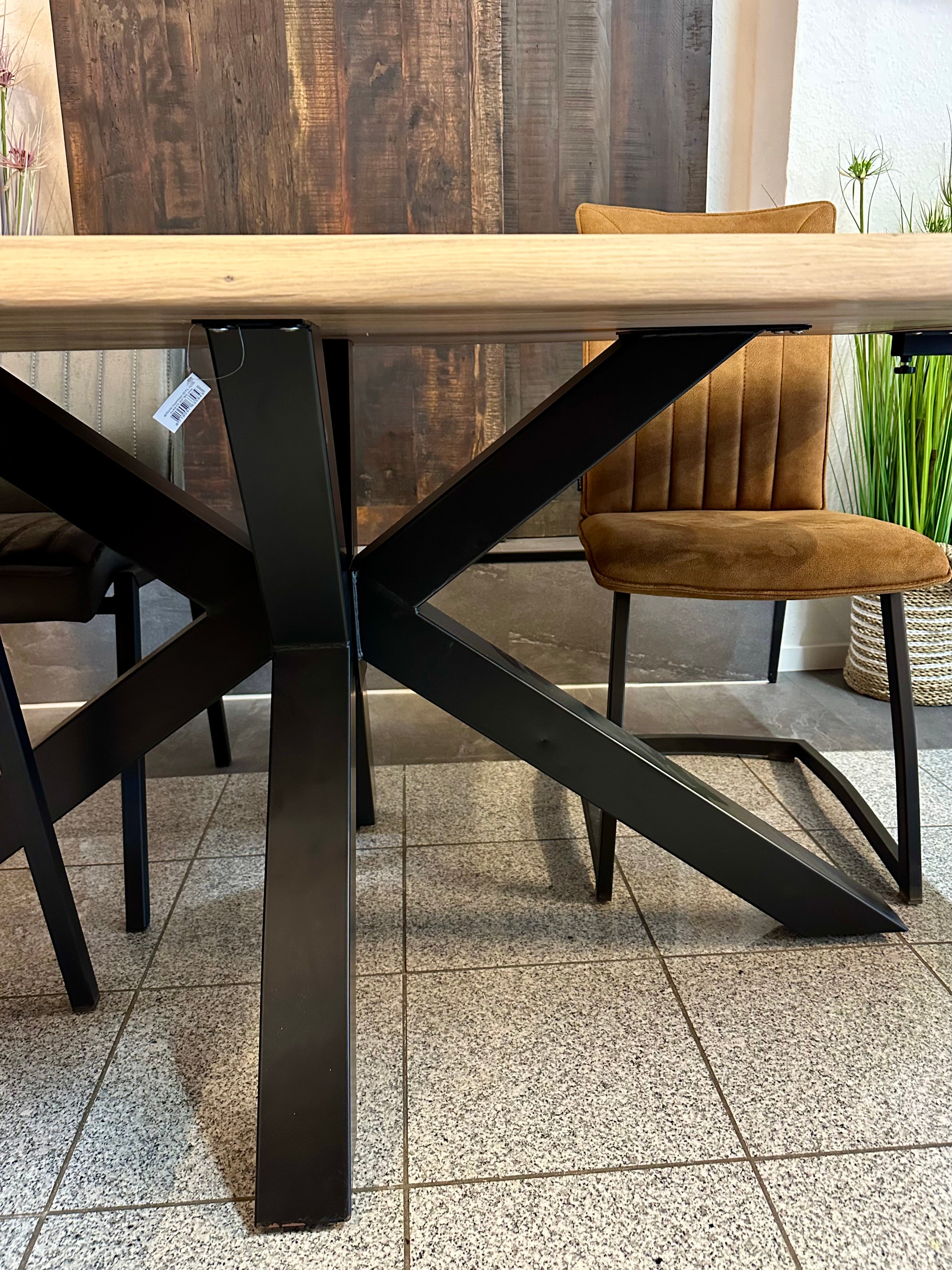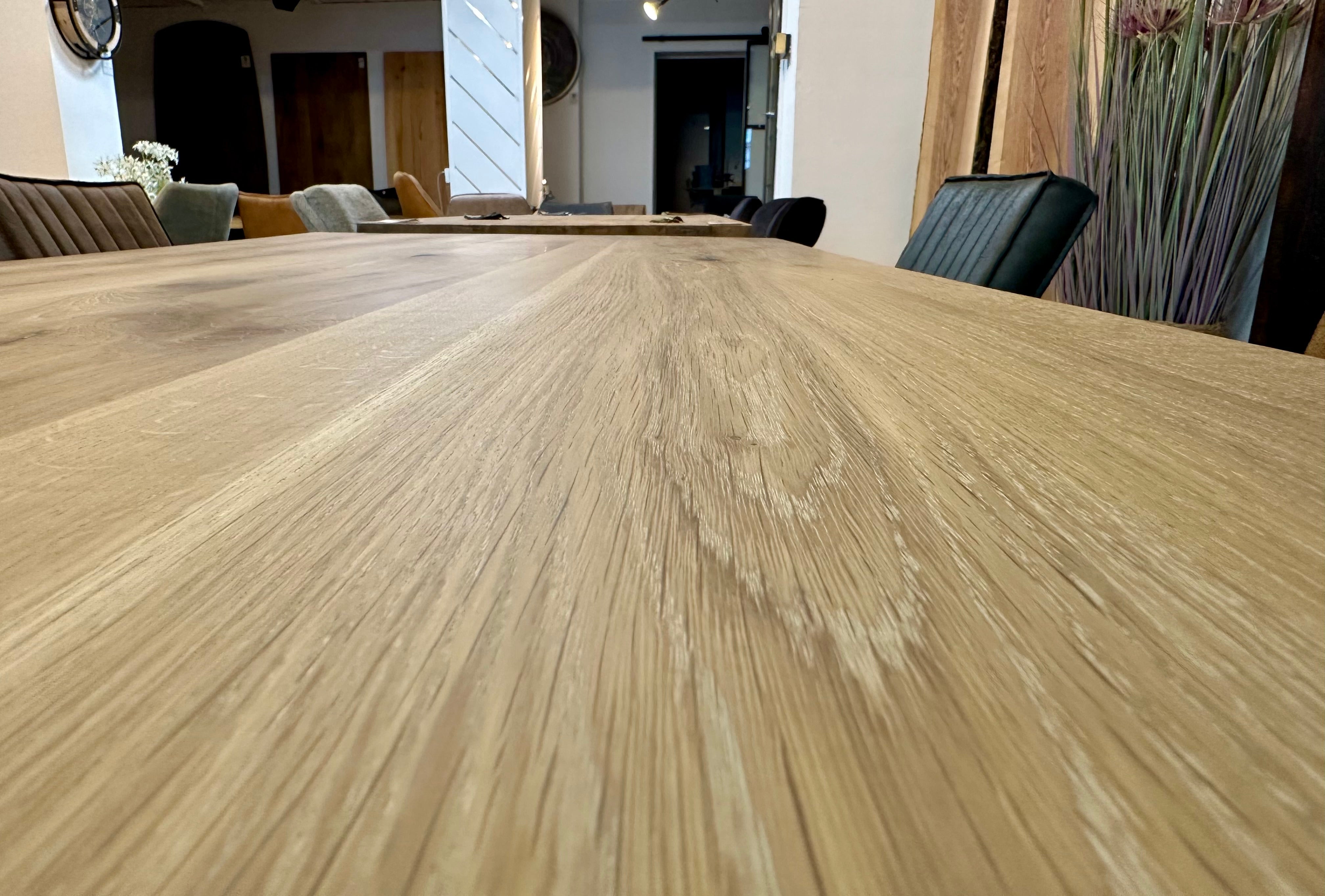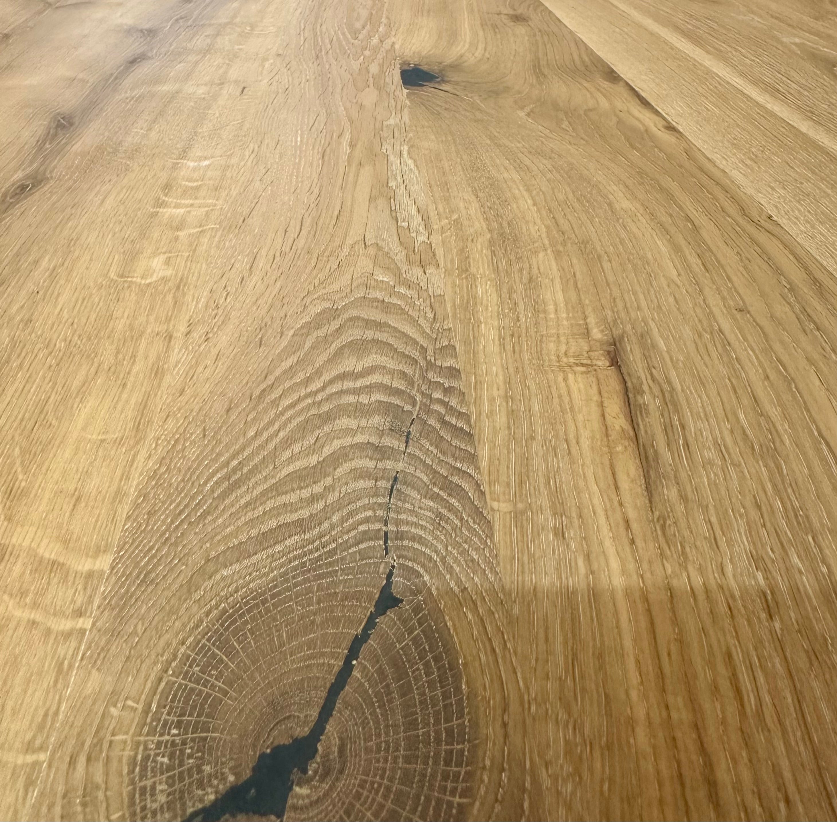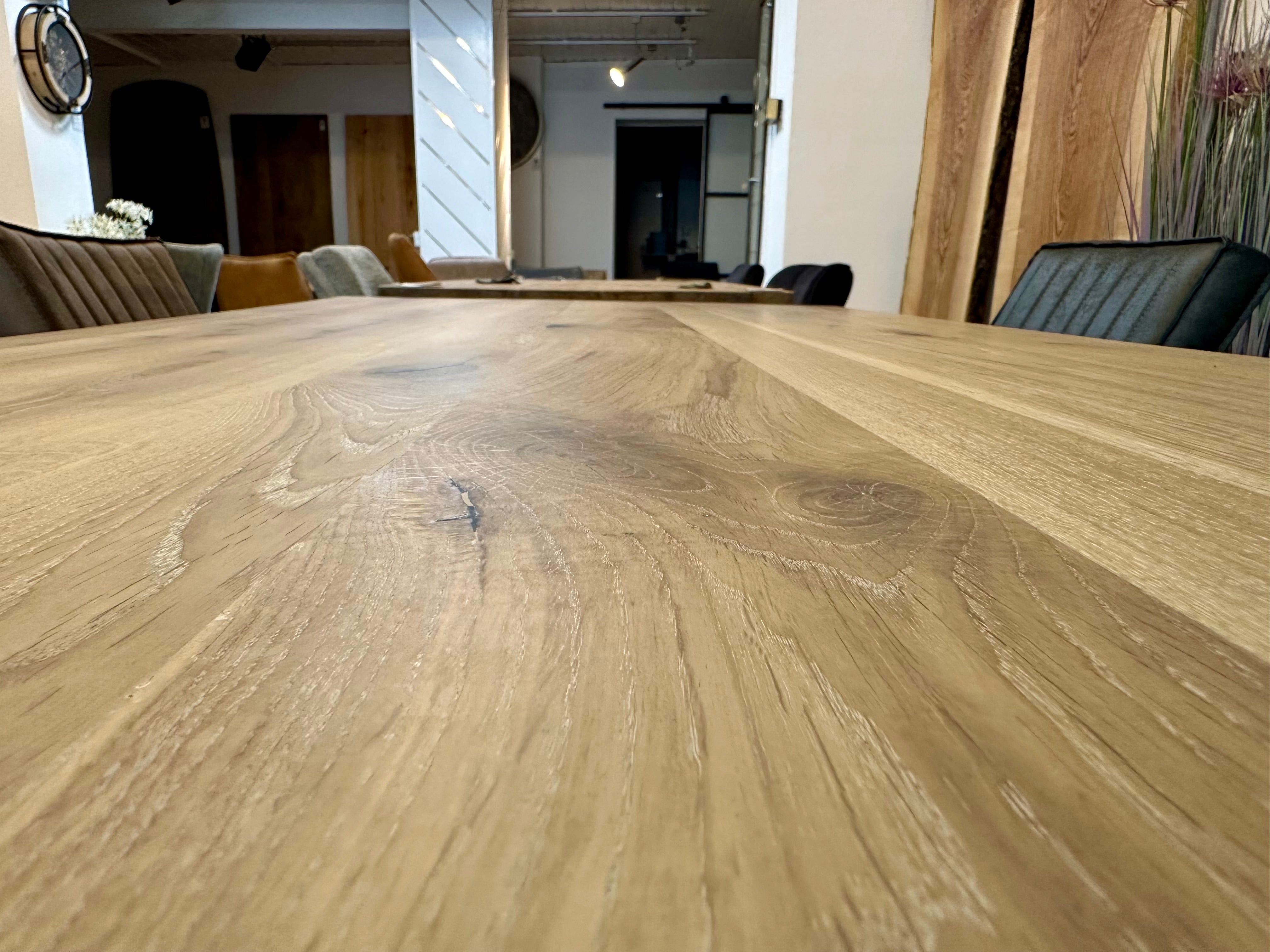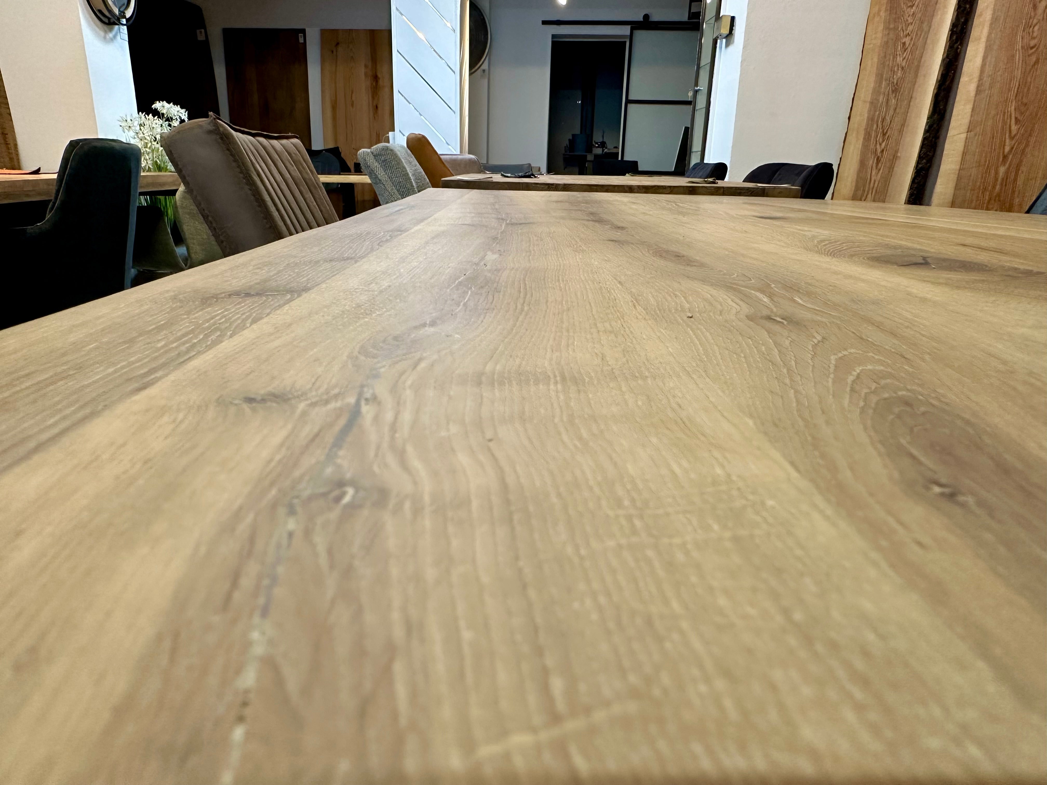 Dieser Eicheholztisch - ist aus massiven Eiche Echtholz gefertigt. Der Holztisch ist inklusive einem schwarz lackierten Spidergestell (austauschbar). Die Tischoberfläche ist mit Rubio Monocoat natural geölt. Die Holztischplatte ist 4 cm stark aus Vollholz und hat eine Baumkante.