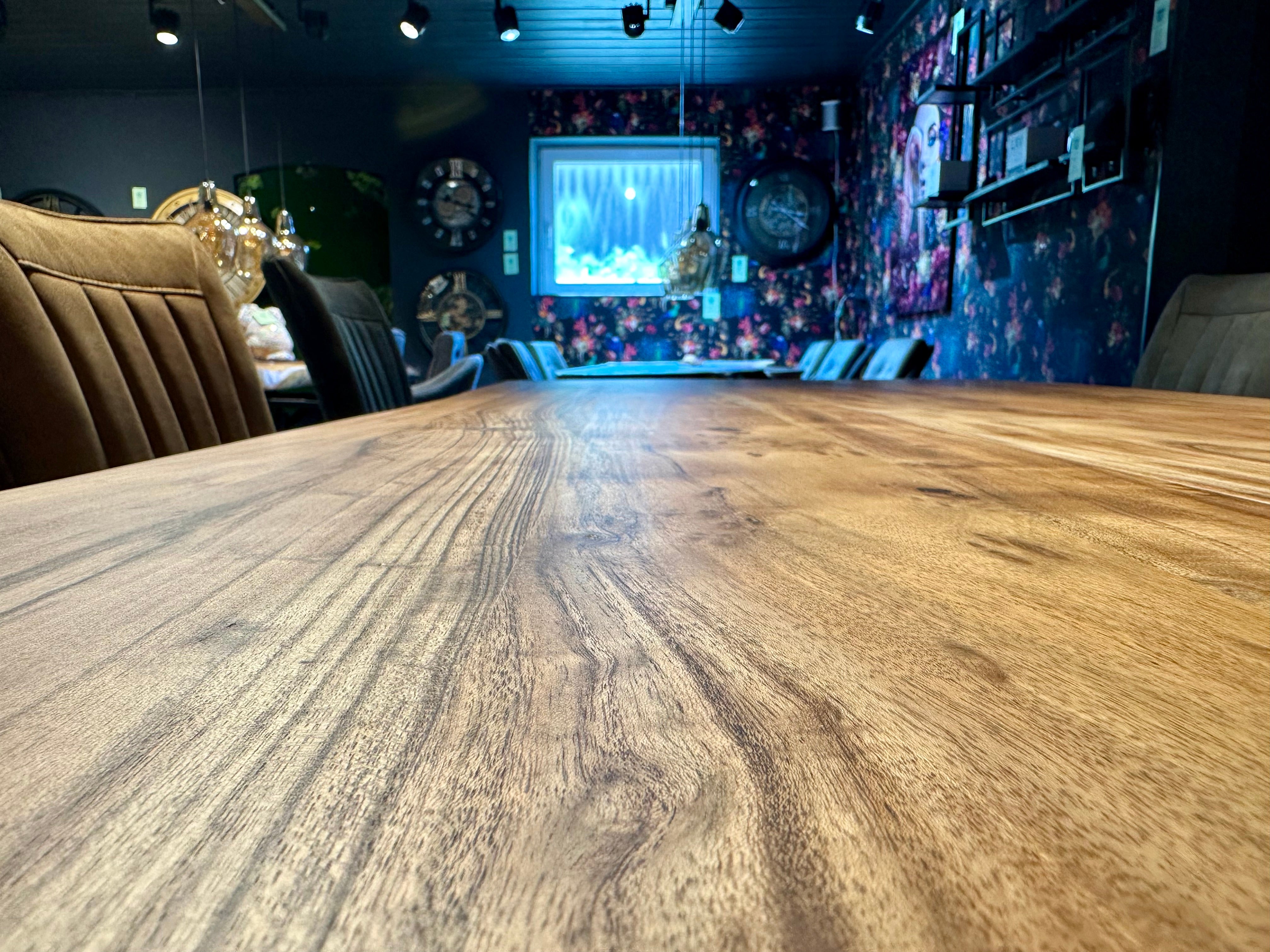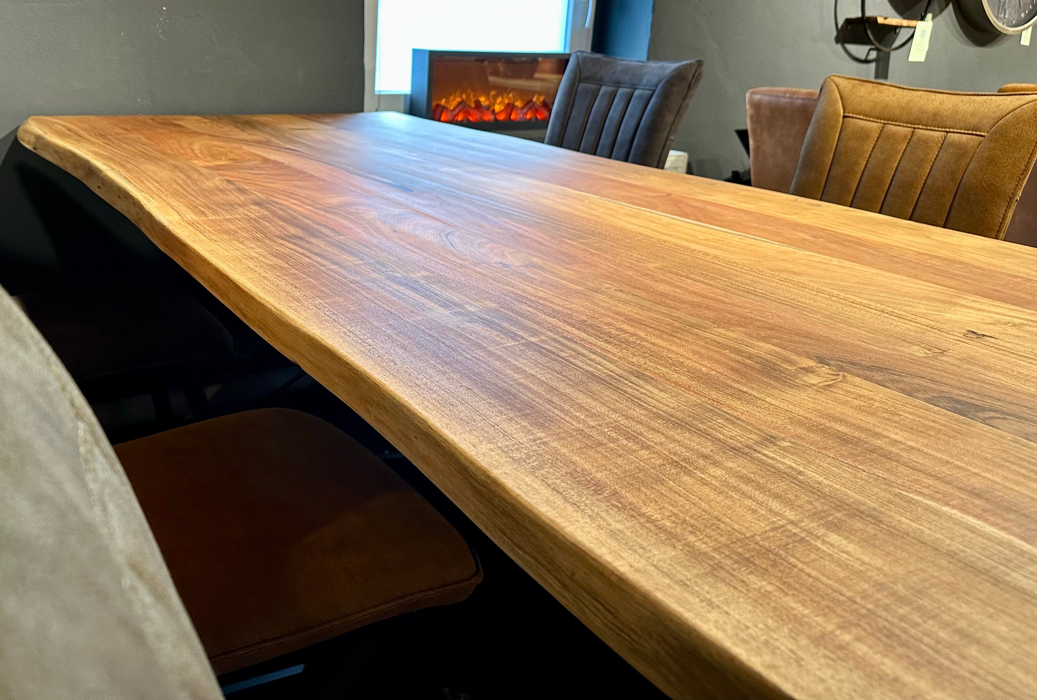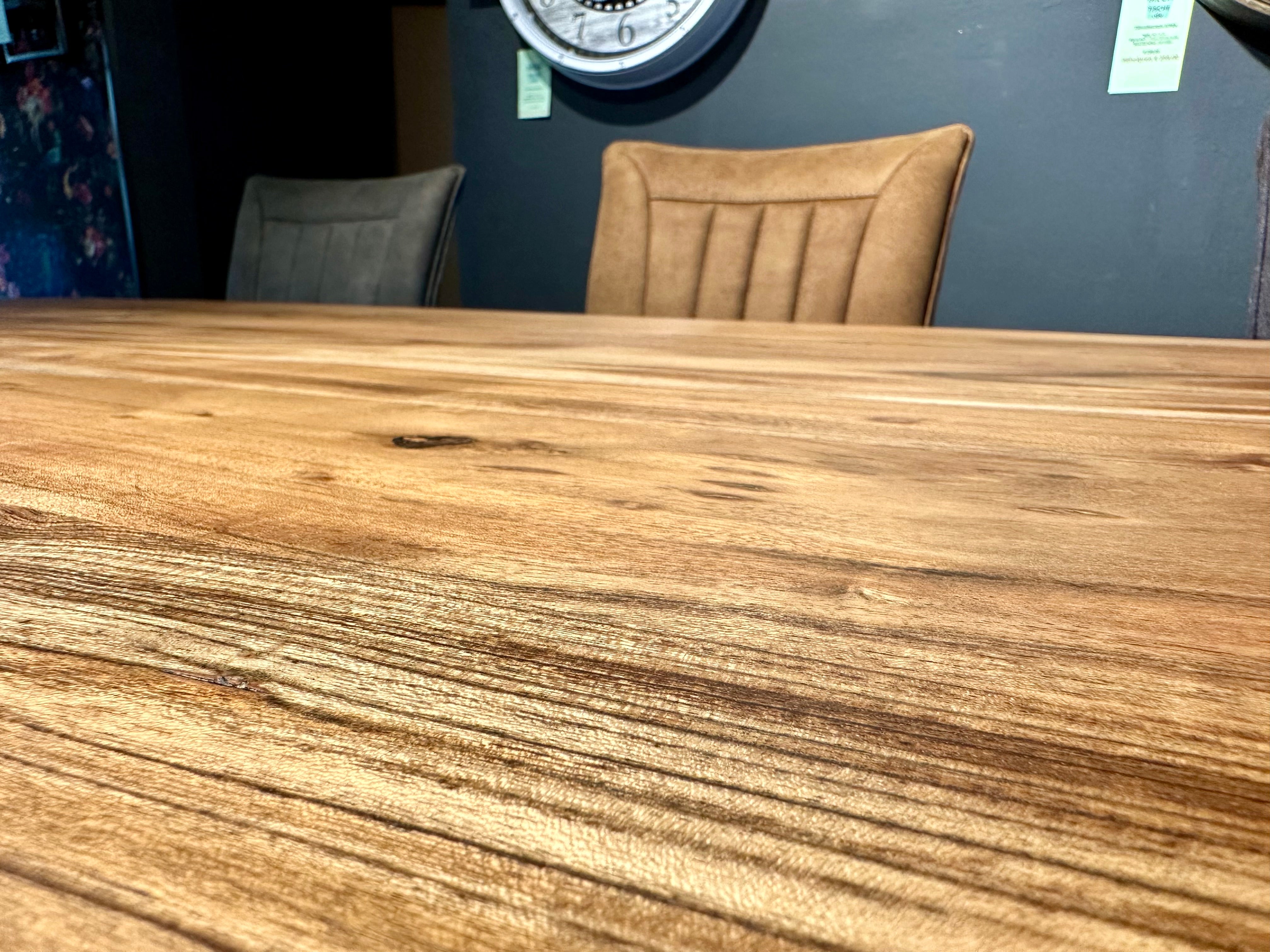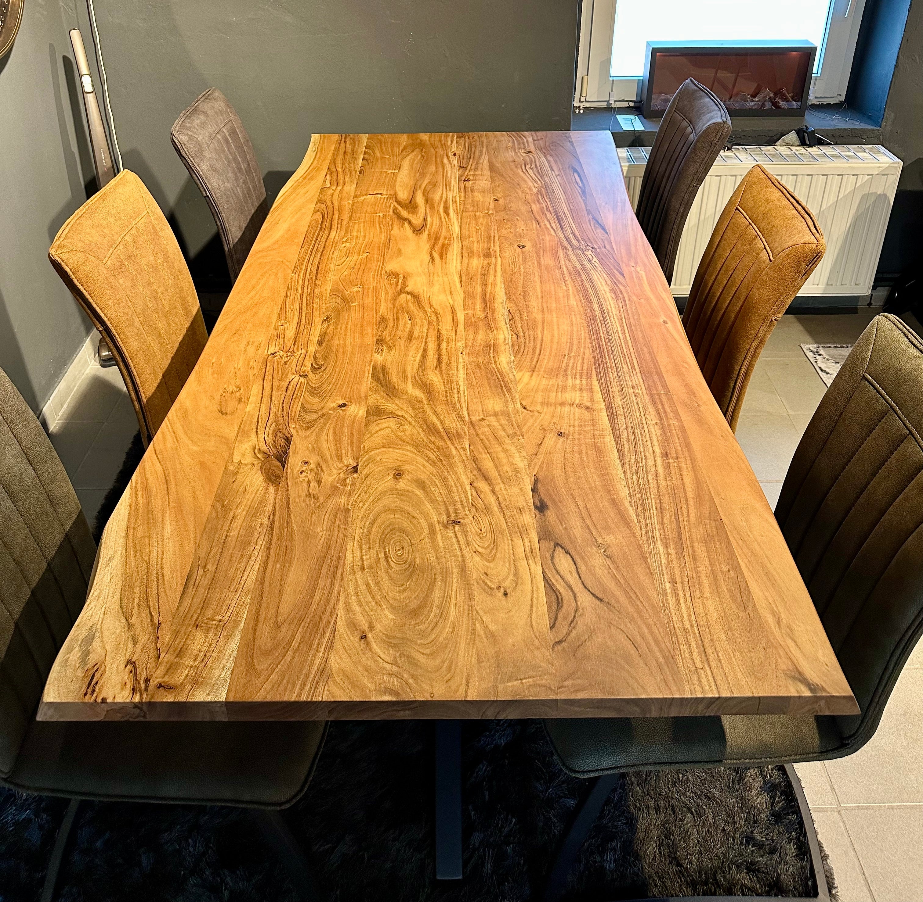 Der Akazientisch ist aus mehreren Bohlen hergestellt und hat eine sehr glatte Oberfläche.