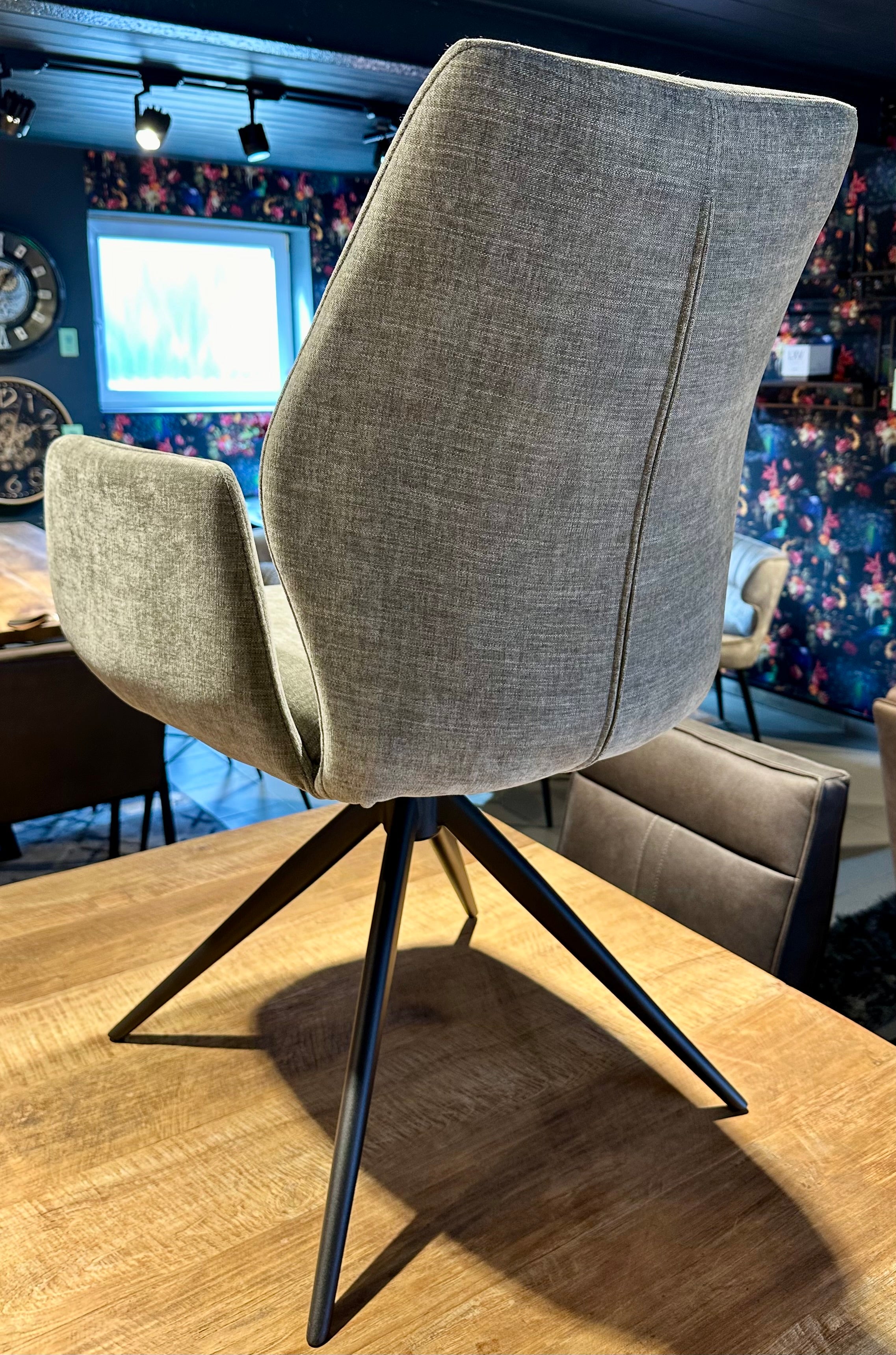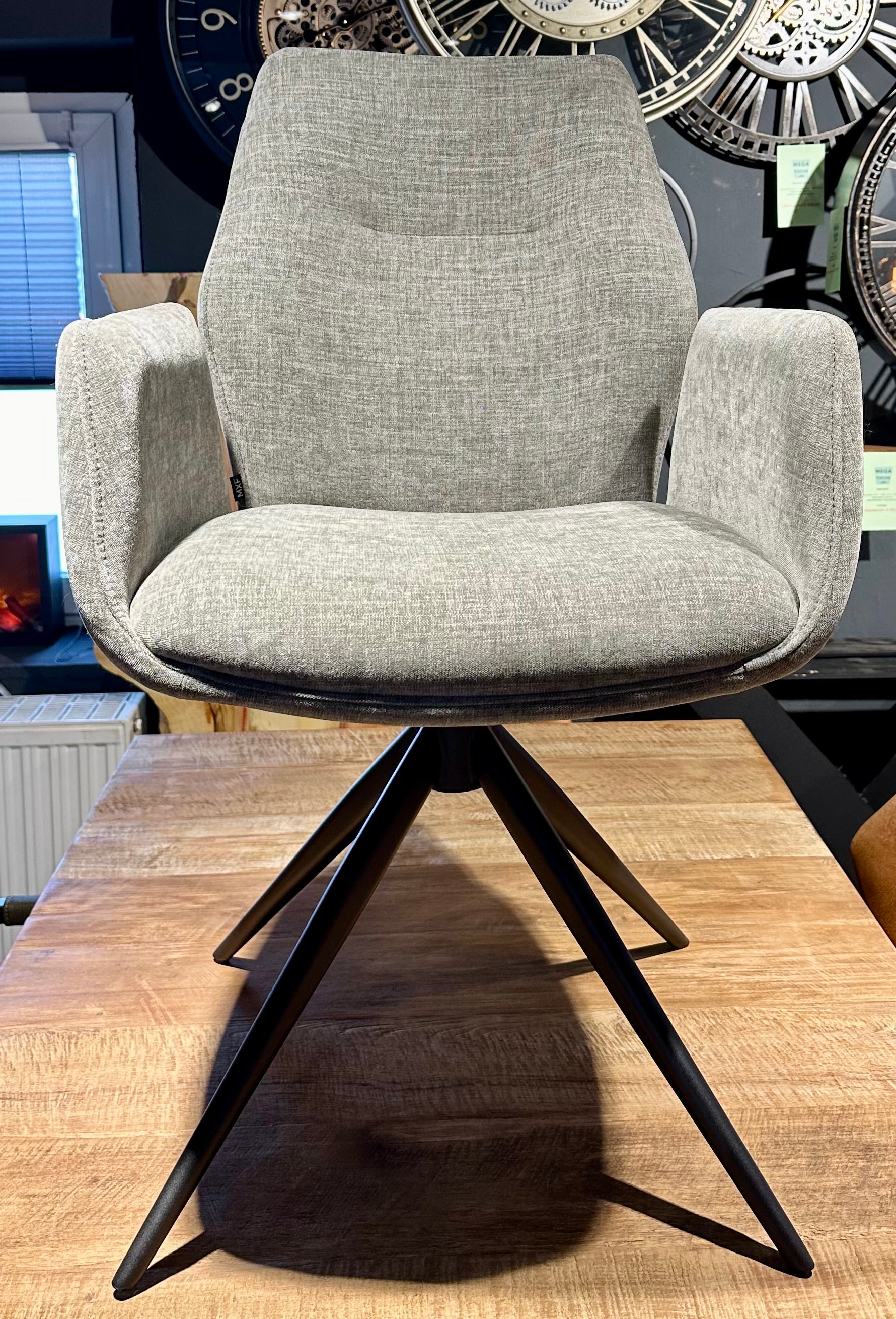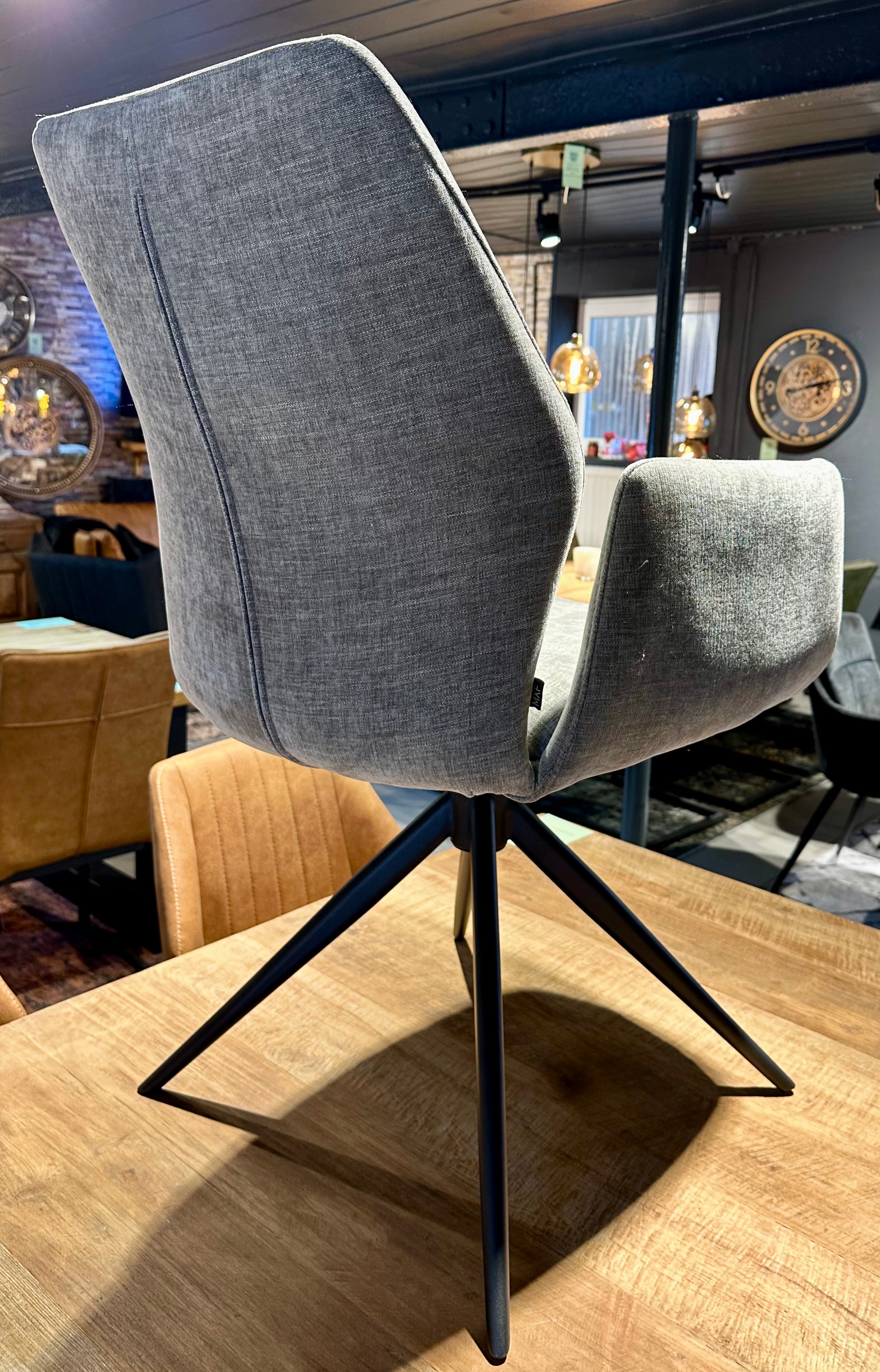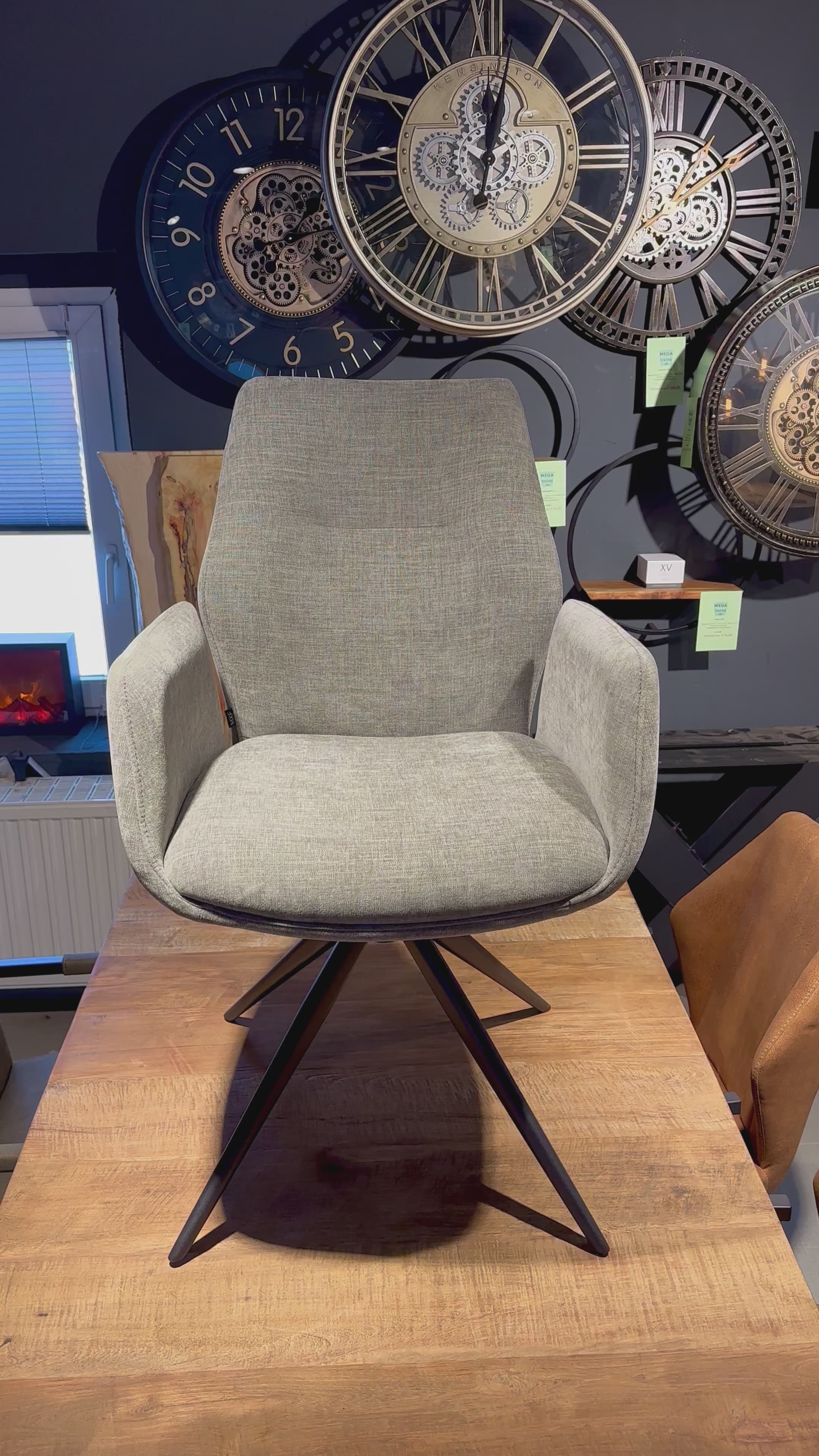 Er hat Metallfüße in schwarz pulverbeschichtet und lässt sich um 360 Grad drehen.