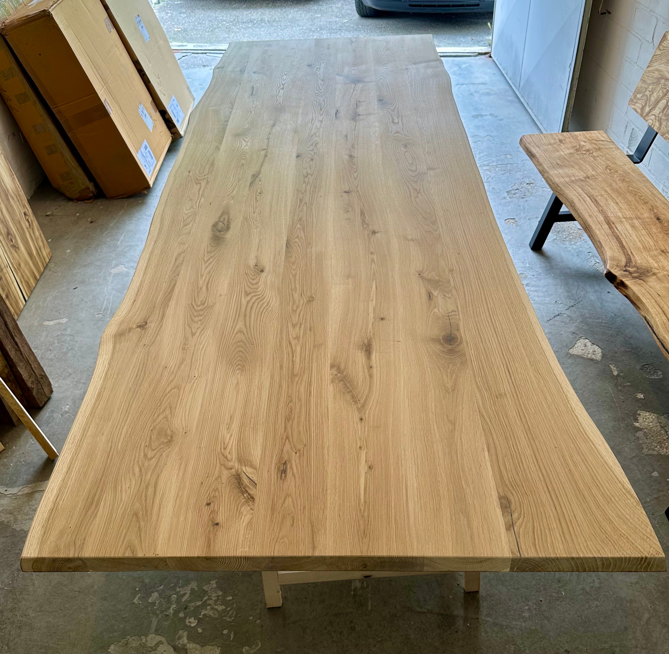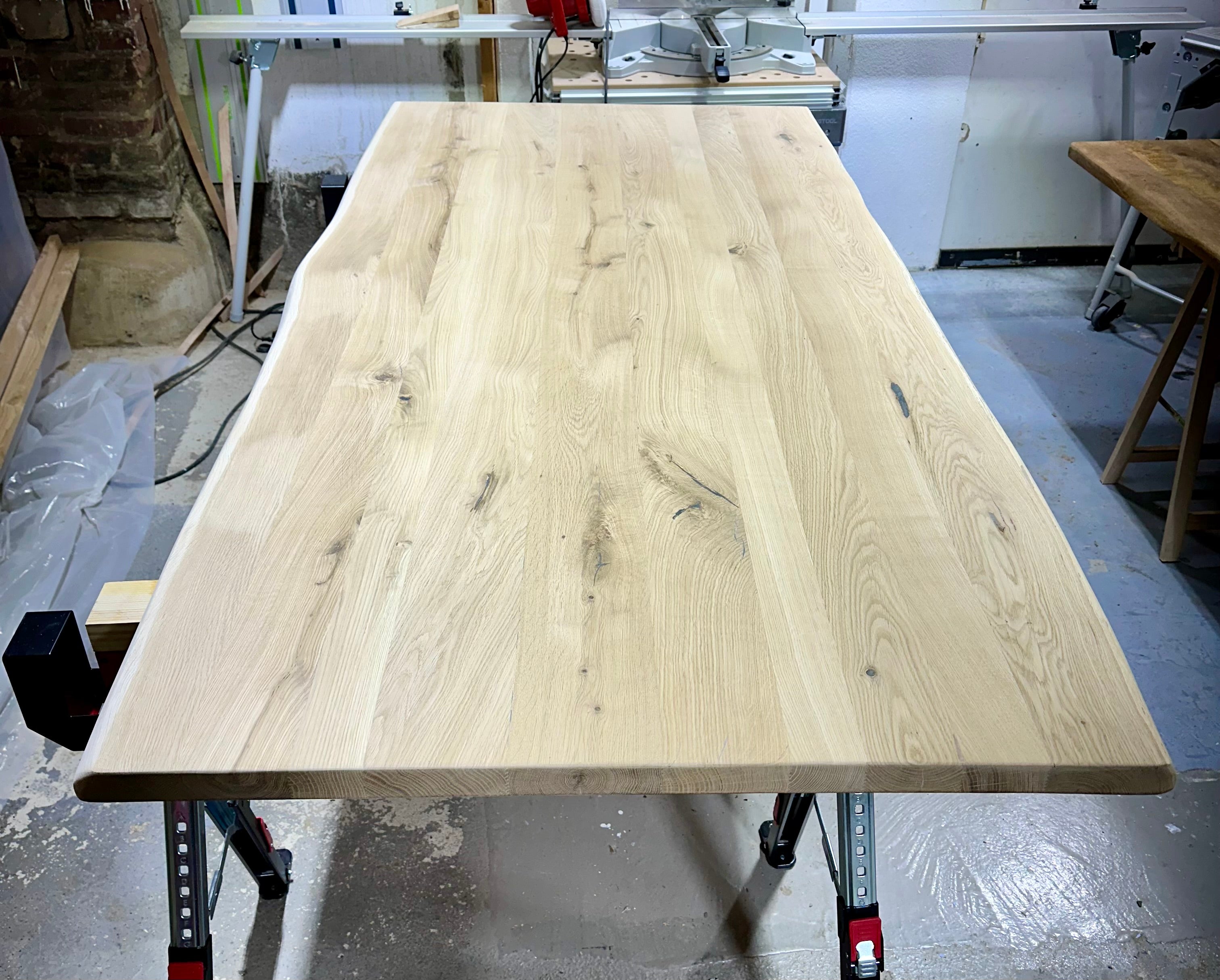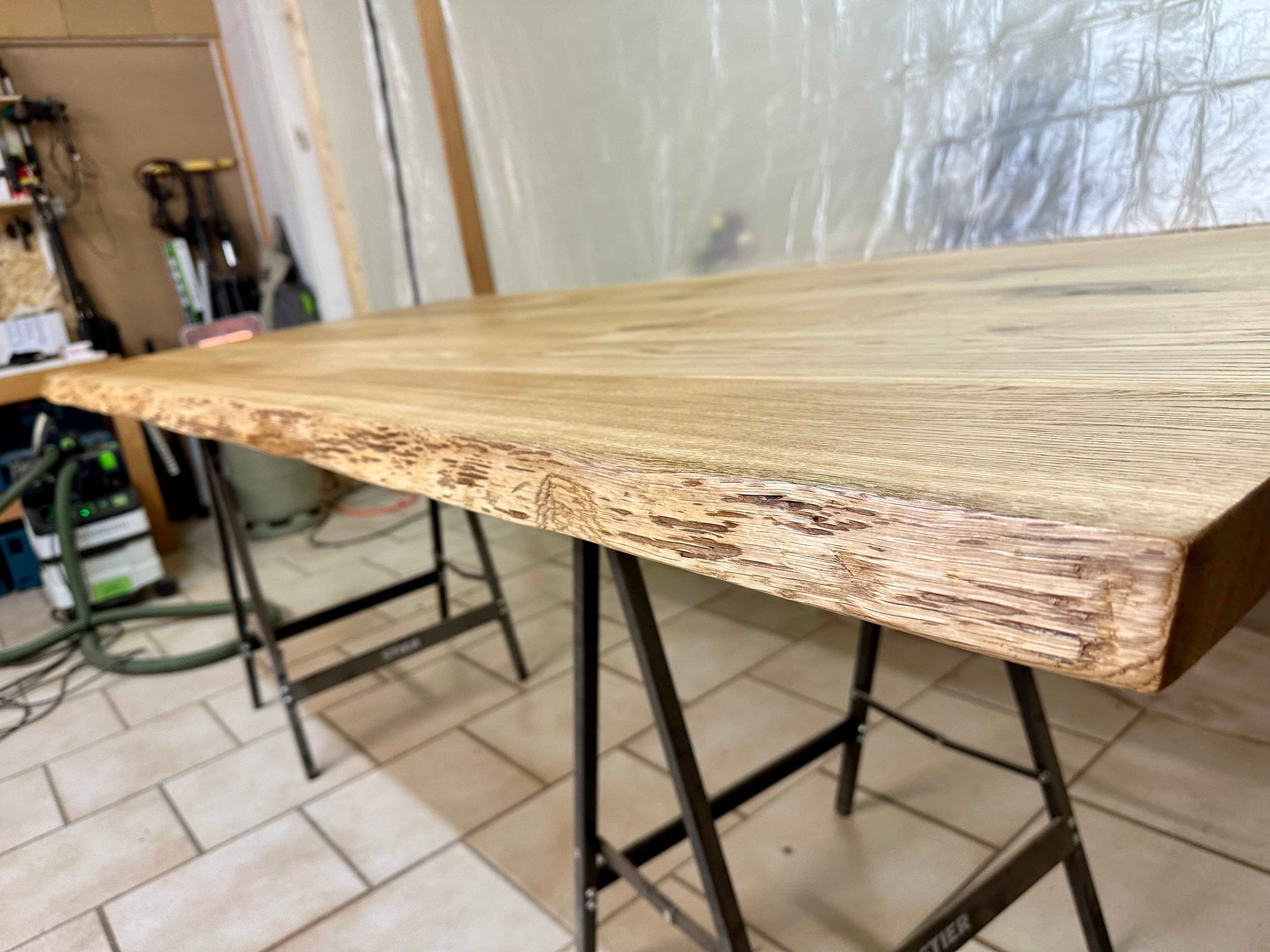 Eine Eiche Massivholz Tischplatte in 4 cm Dicke mit einer schönen Baumkante versehen.