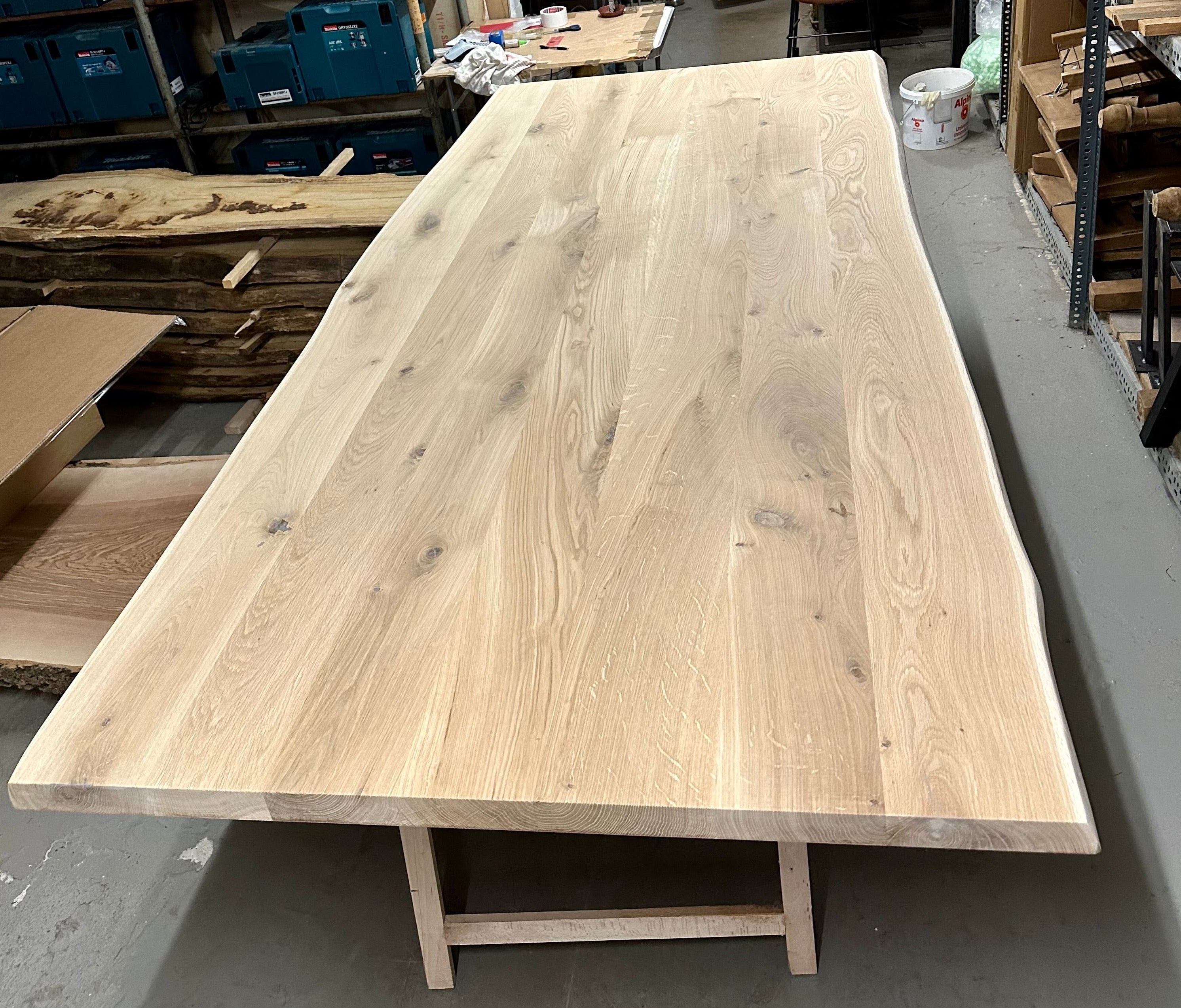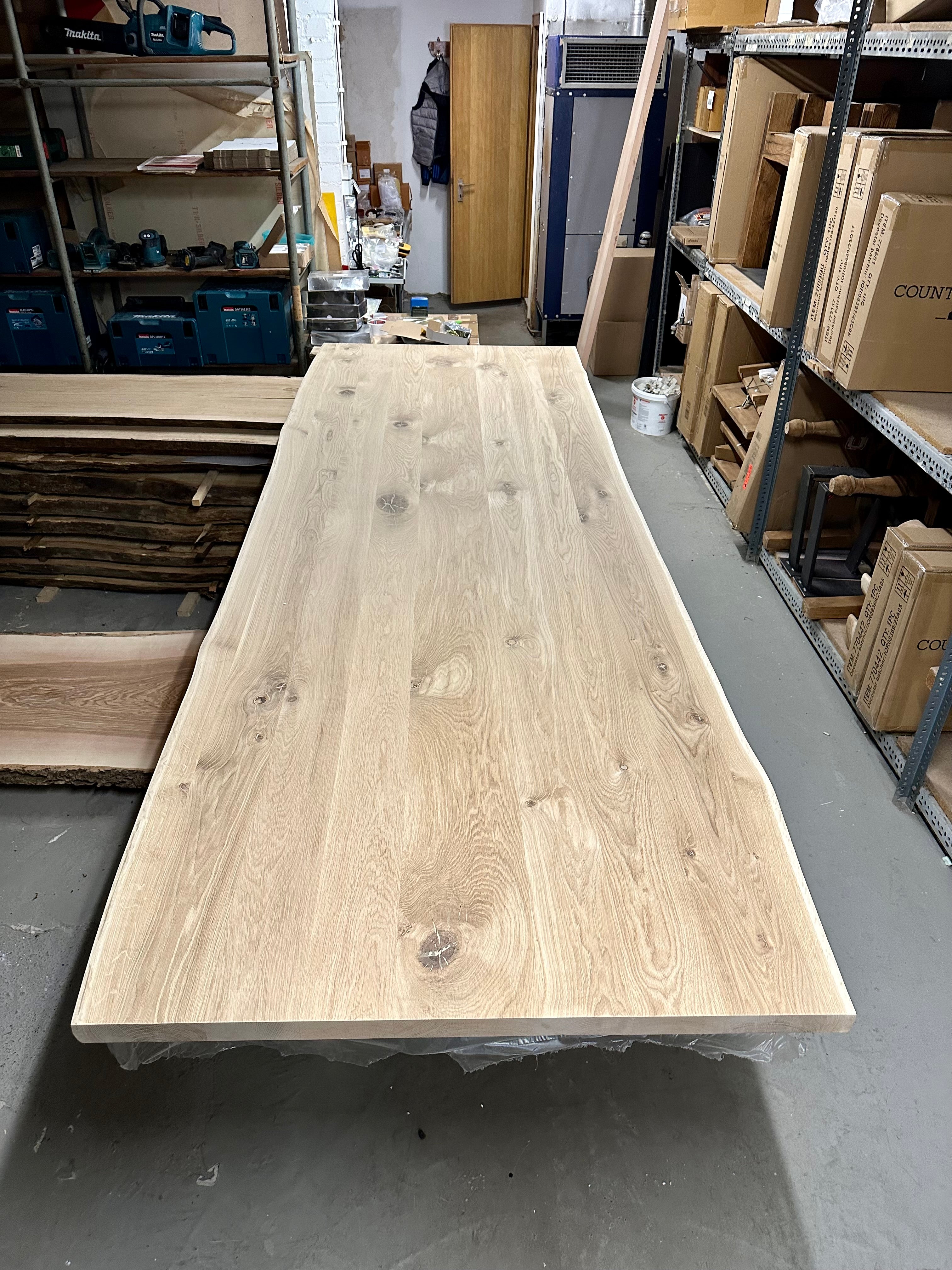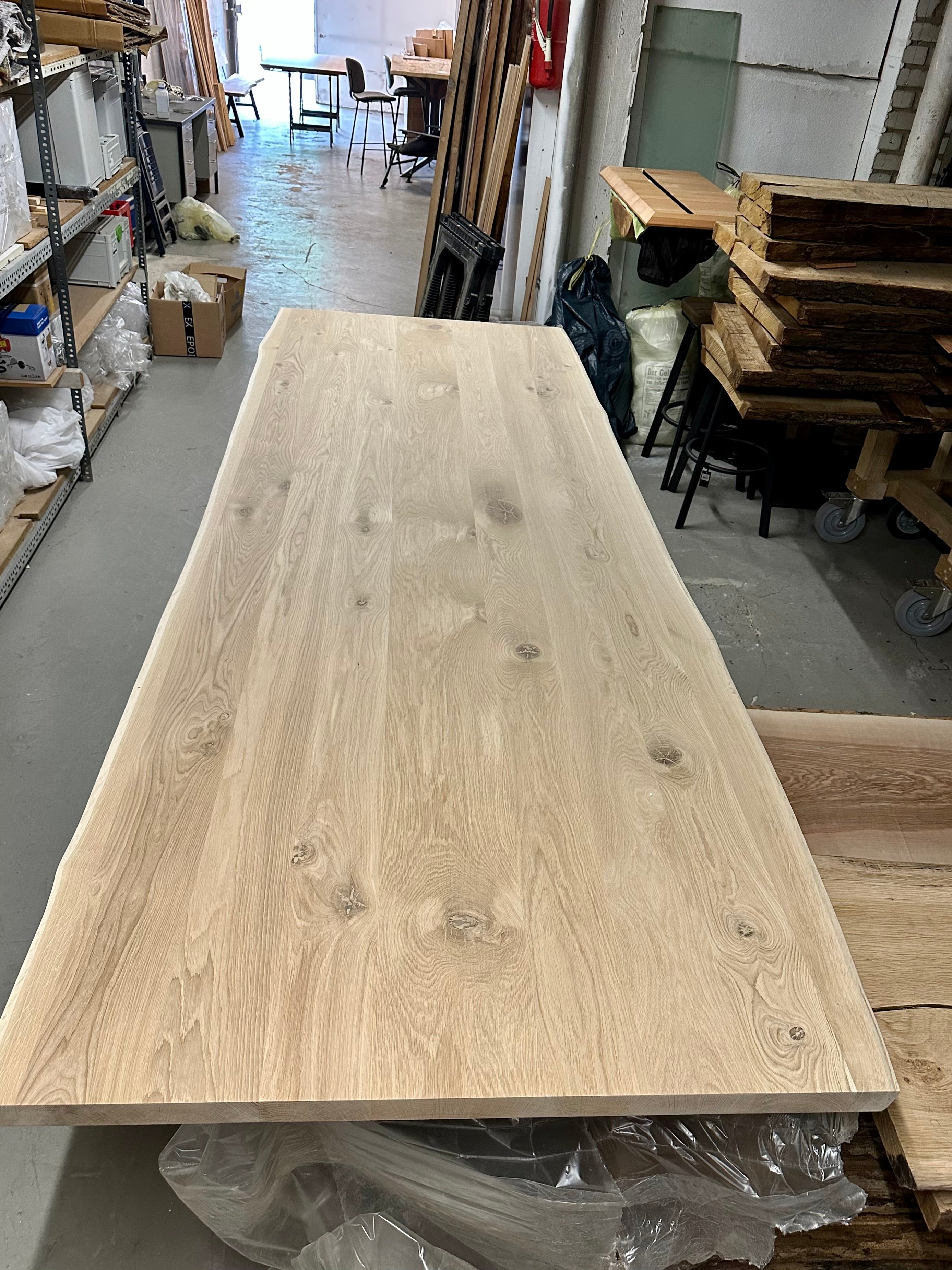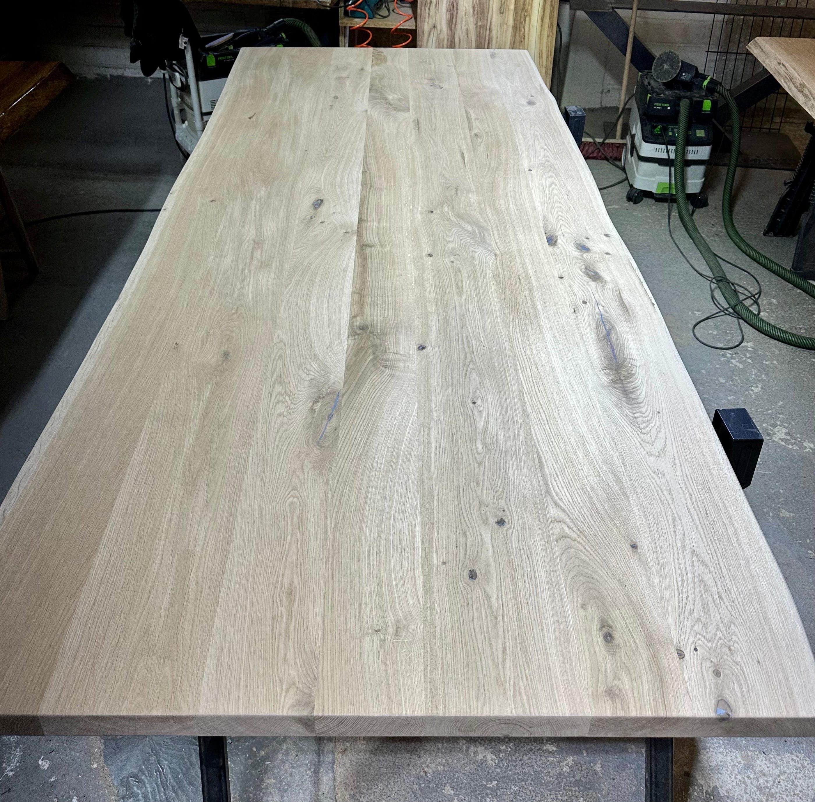Eine Eiche Massivholz Tischplatte in 4 cm Dicke mit einer schönen Baumkante versehen.