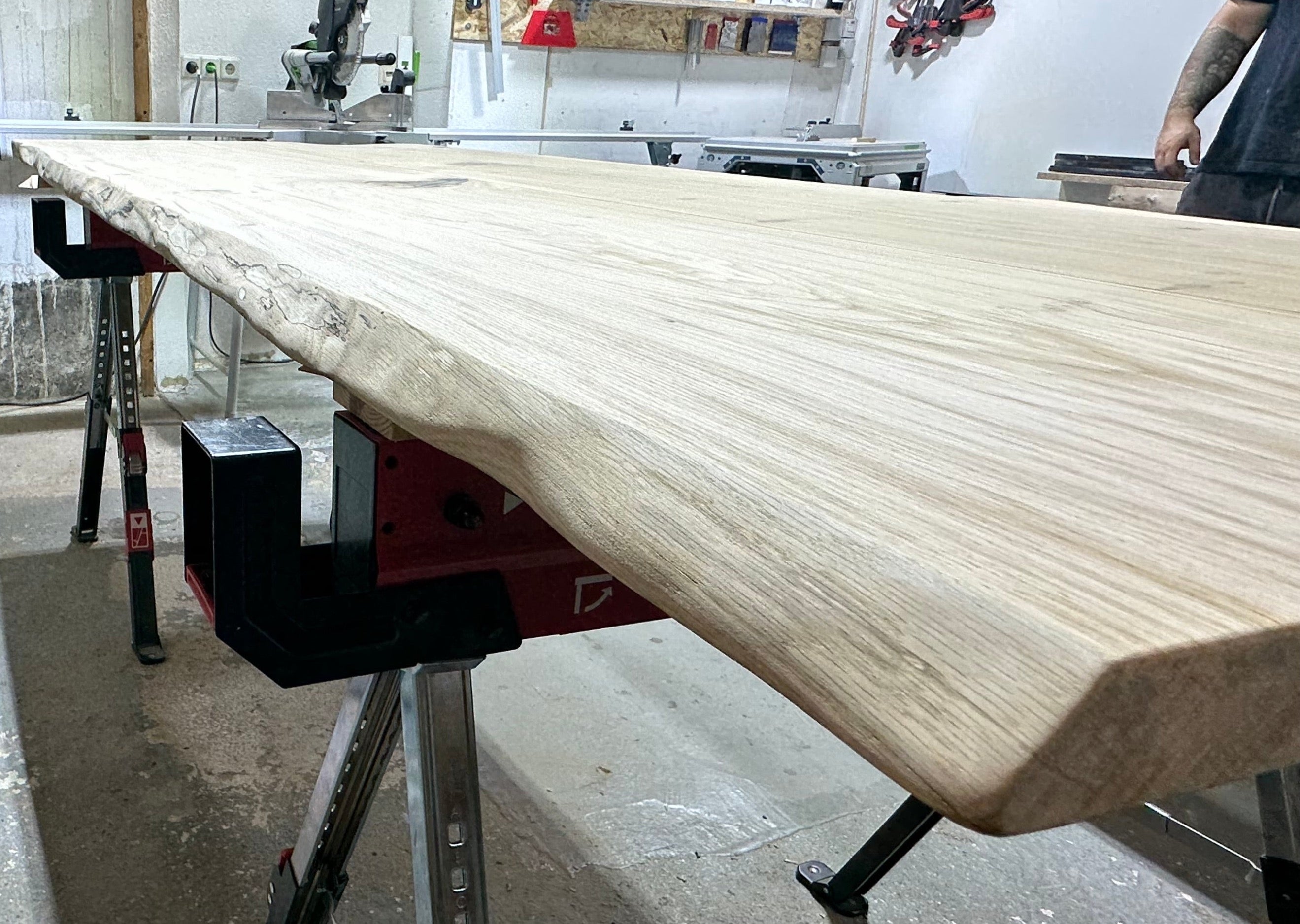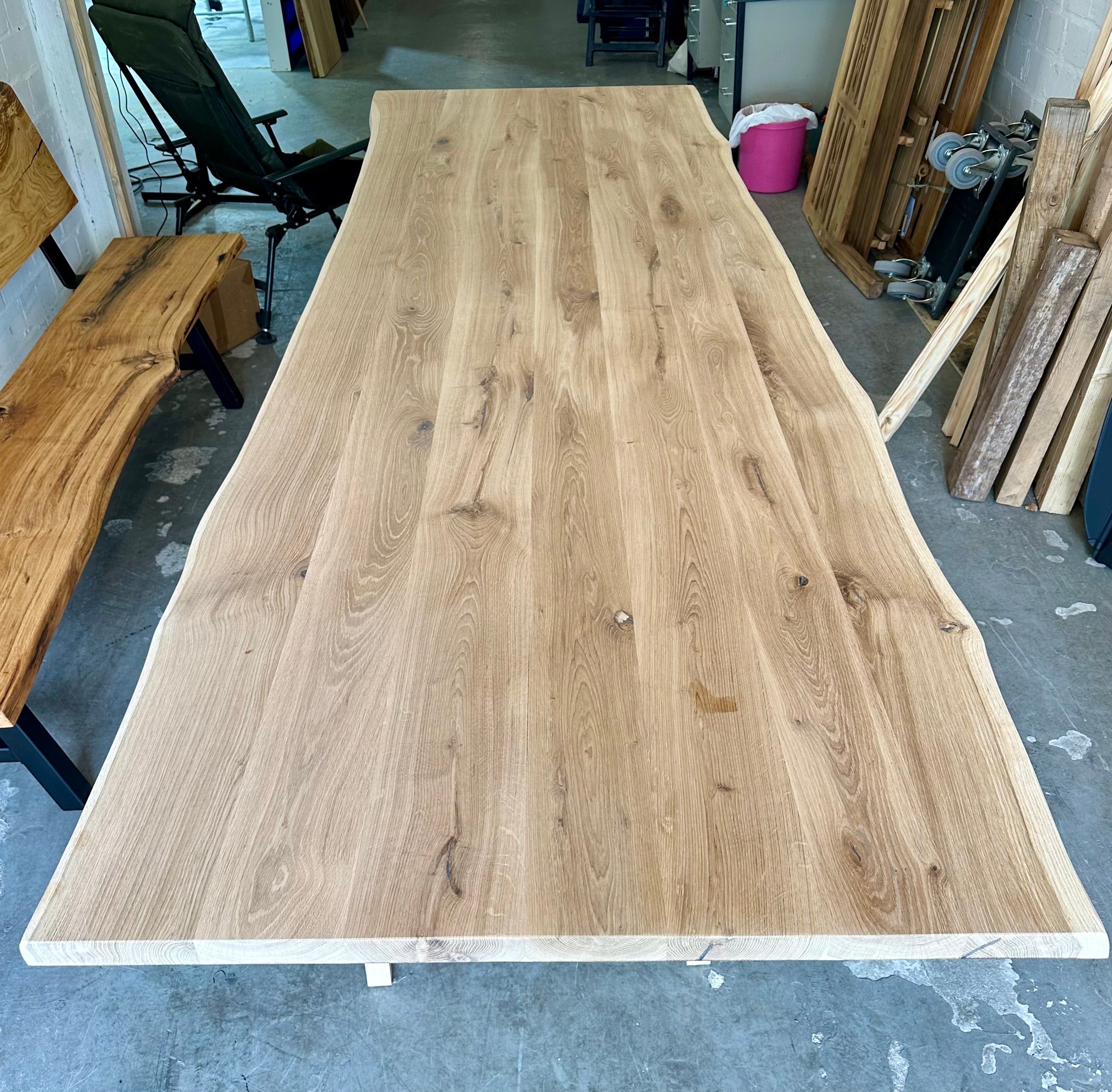 Die Massivholzplatte ist aus 4 cm Eiche Holz und mit einer natürlichen Baumkante versehen.