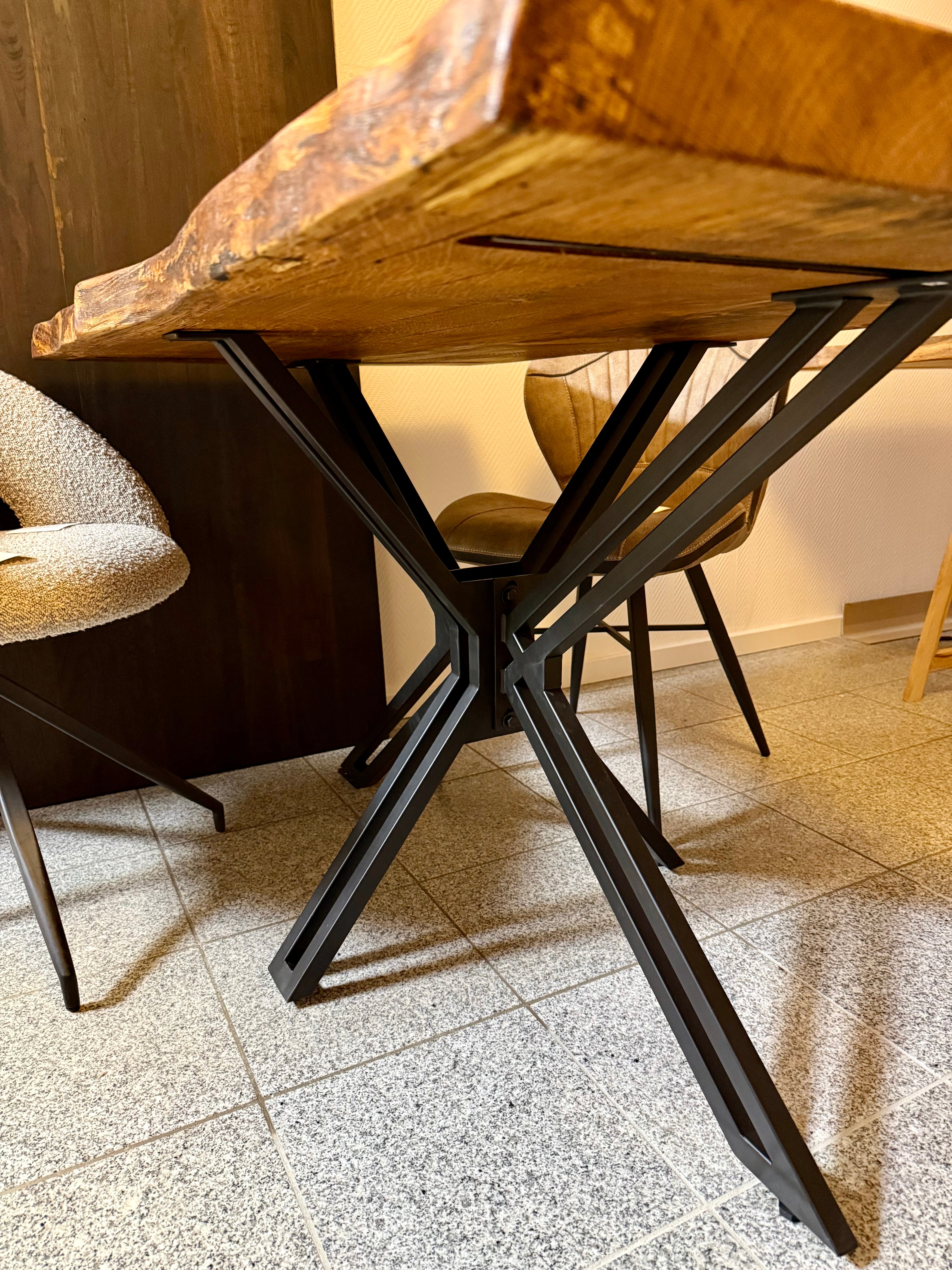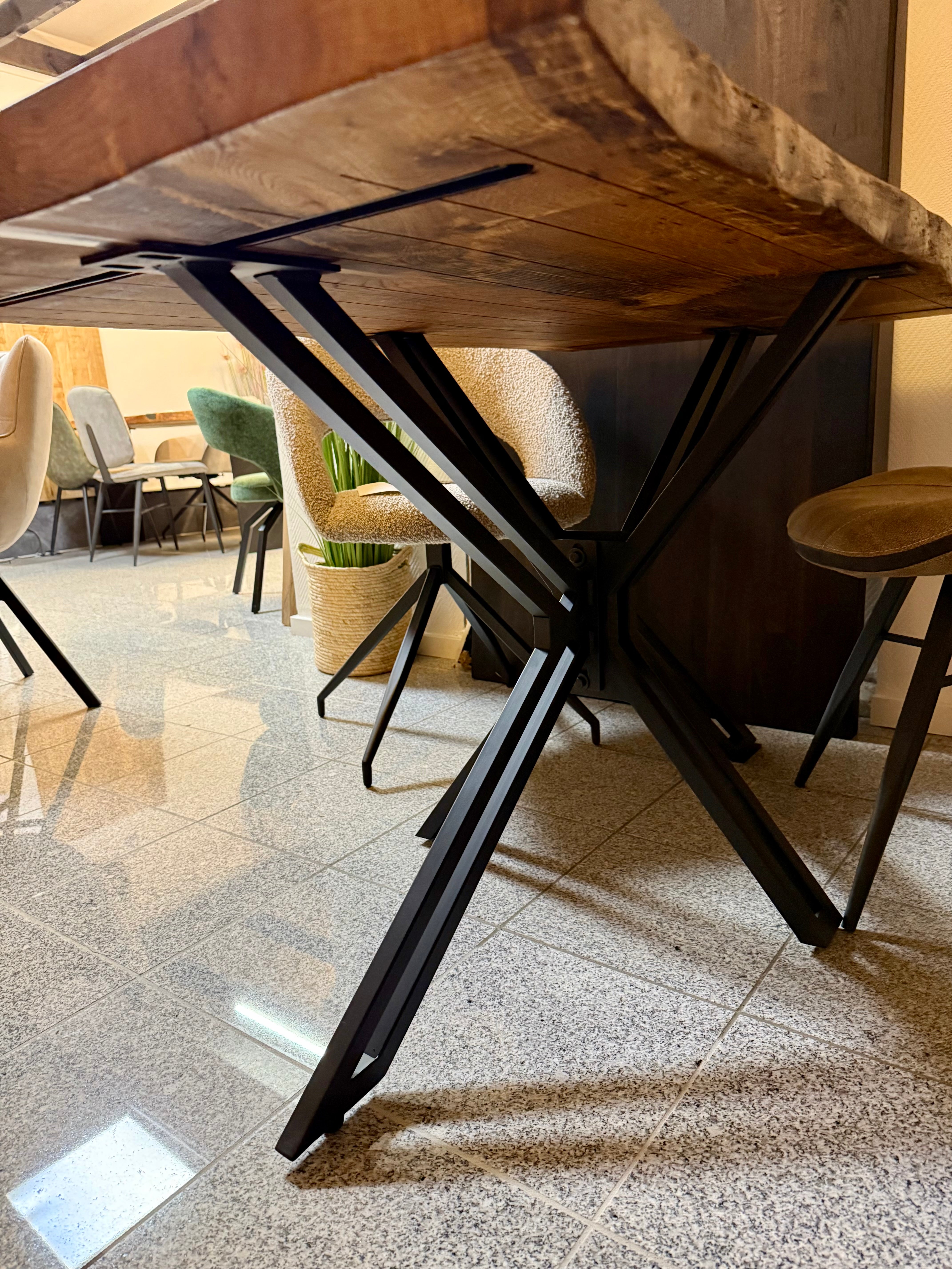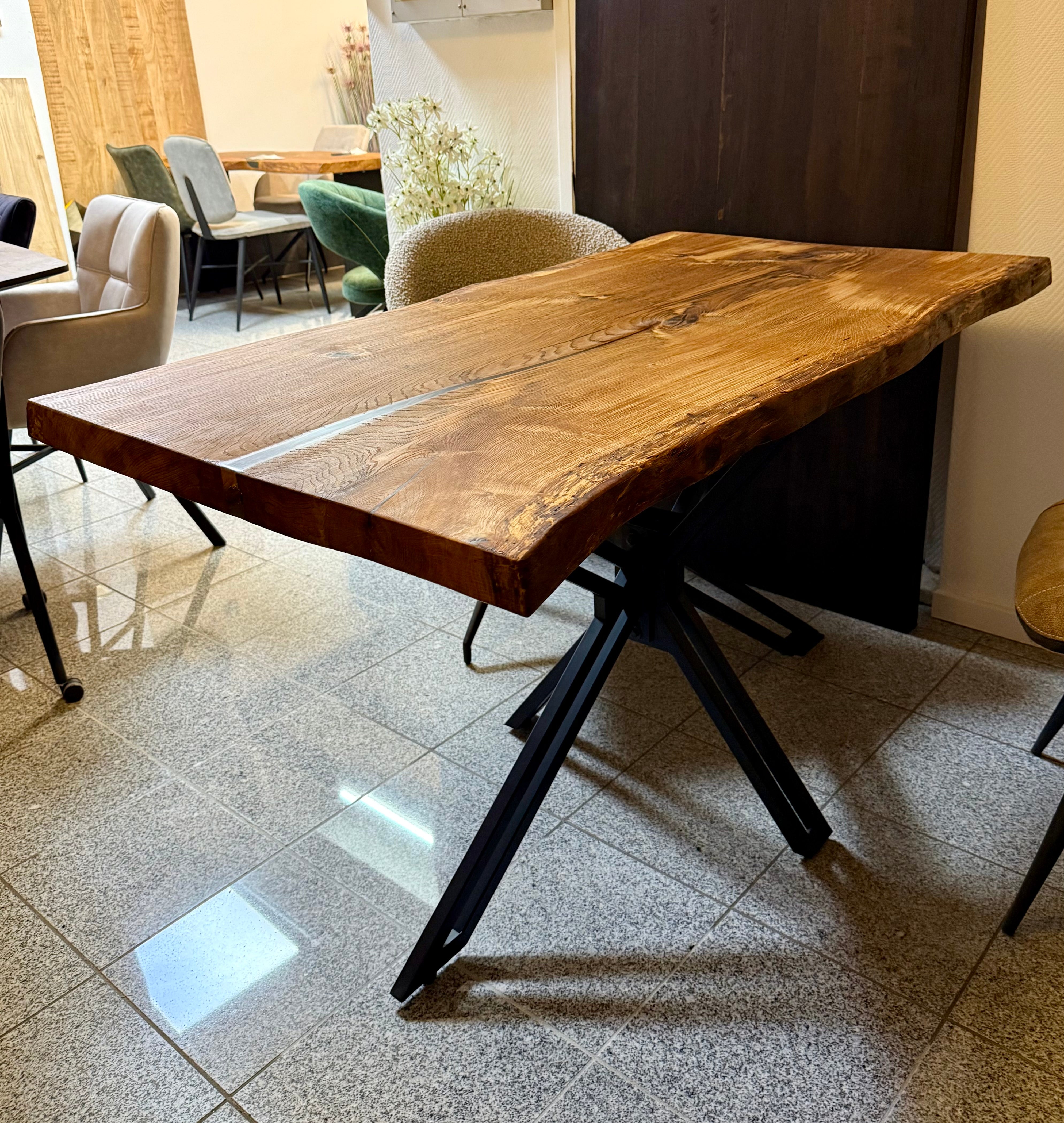 Epoxidharz Baumkante Esstisch Wildeiche 140 cm mit Spider Gestell