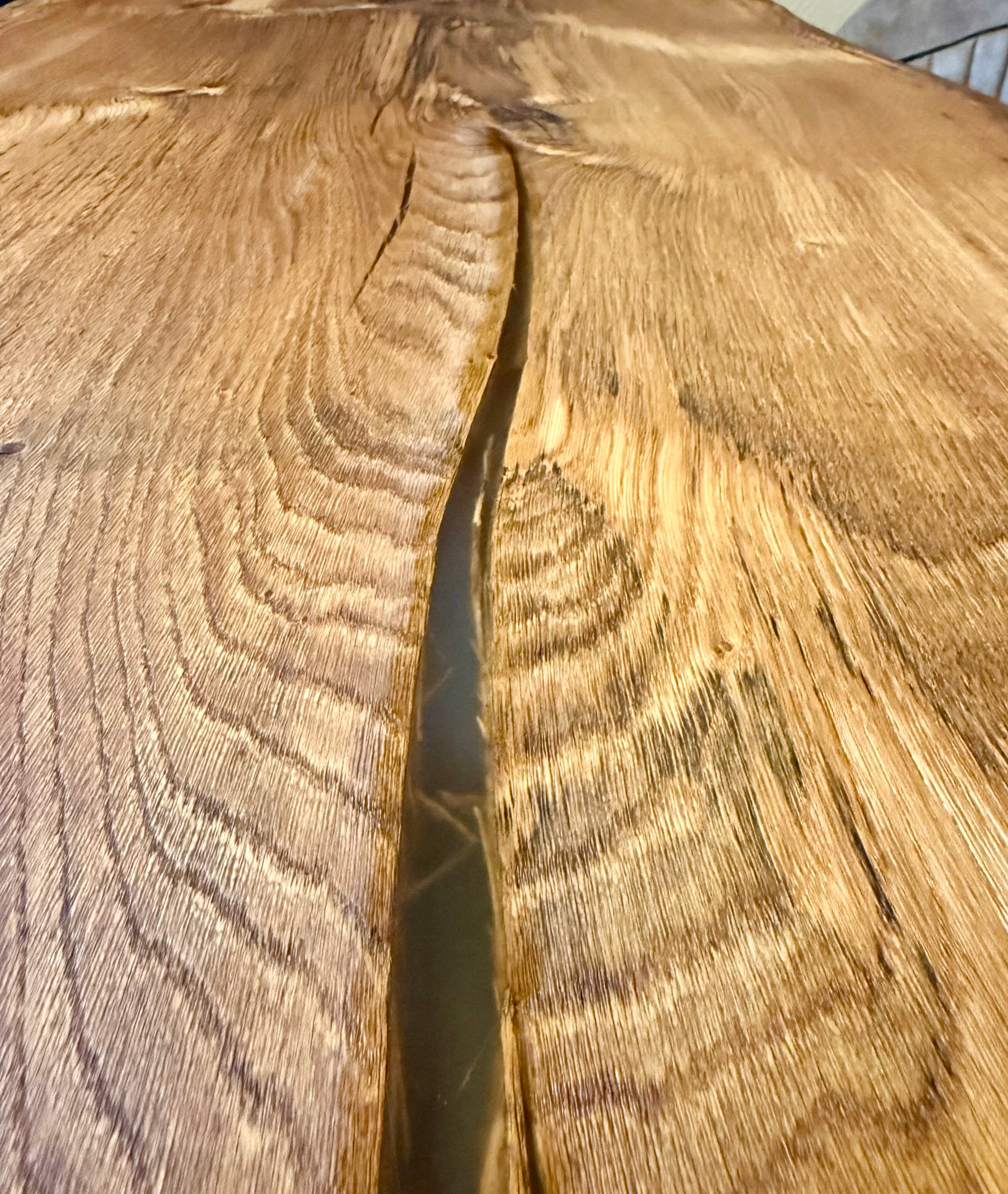 Die Holztischplatte ist 4 cm stark aus Vollholz und hat eine natürlich-wilde Baumkante. Die Risse und Löcher wurden sehr aufwendig mit Epoxidharz (transparent) gefüllt.