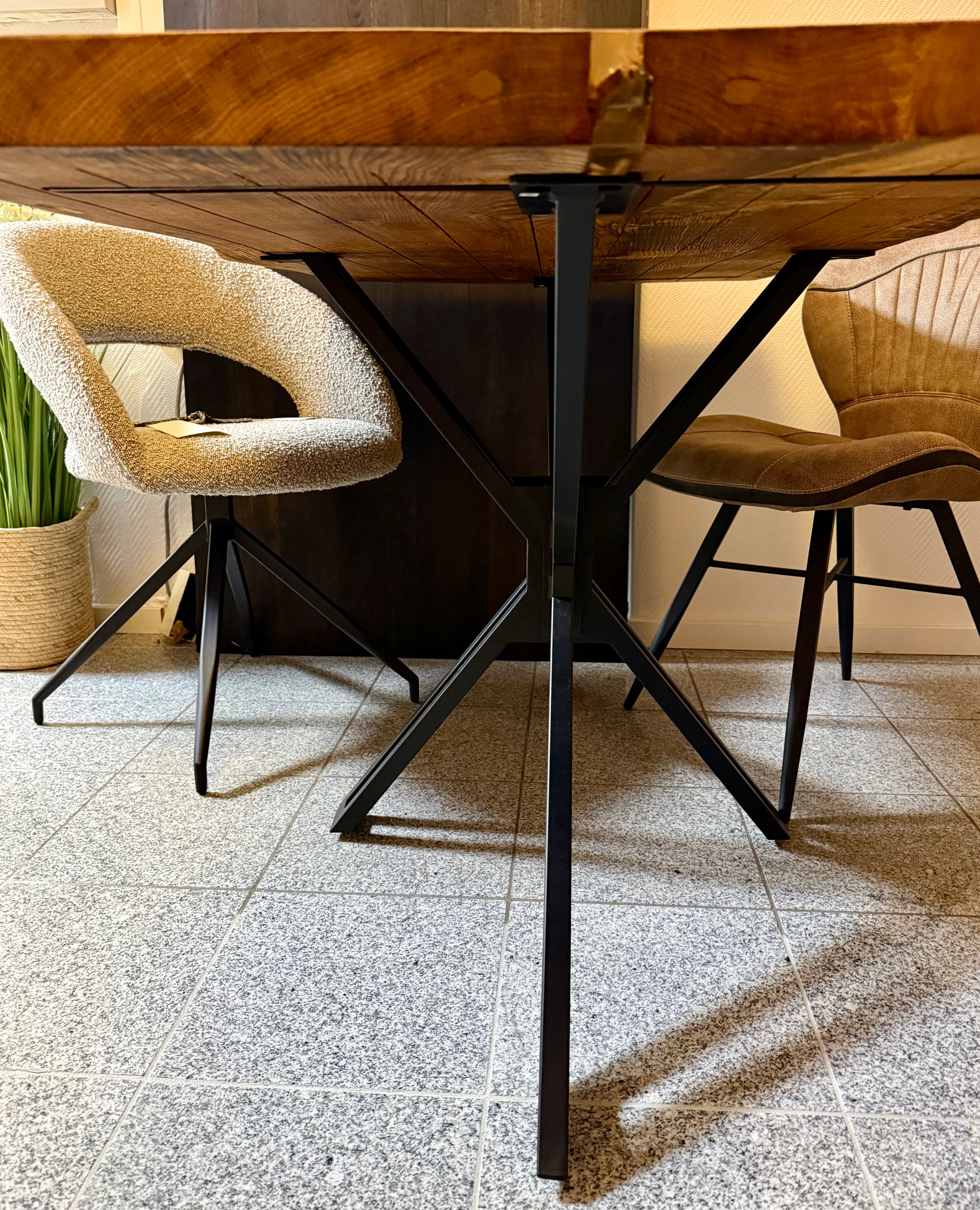 Der Holztisch ist inklusive einem Spider Metall Gestell in schwarz lackiert.