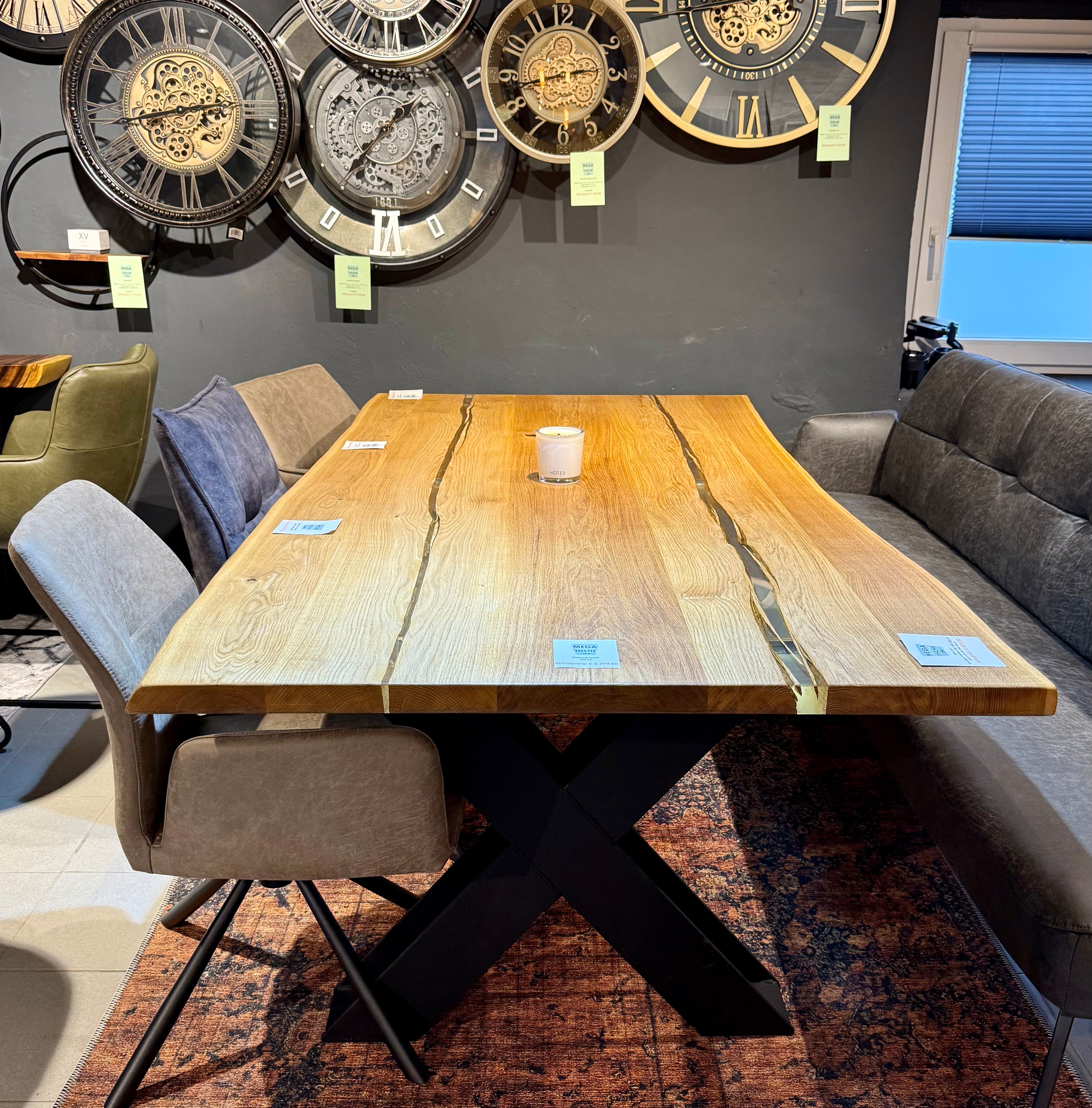 Epoxidharz Esstisch Bergneustadt Eiche massiv 200 cm Massivholz geölt mit X Stahl Gestell Set schwarz