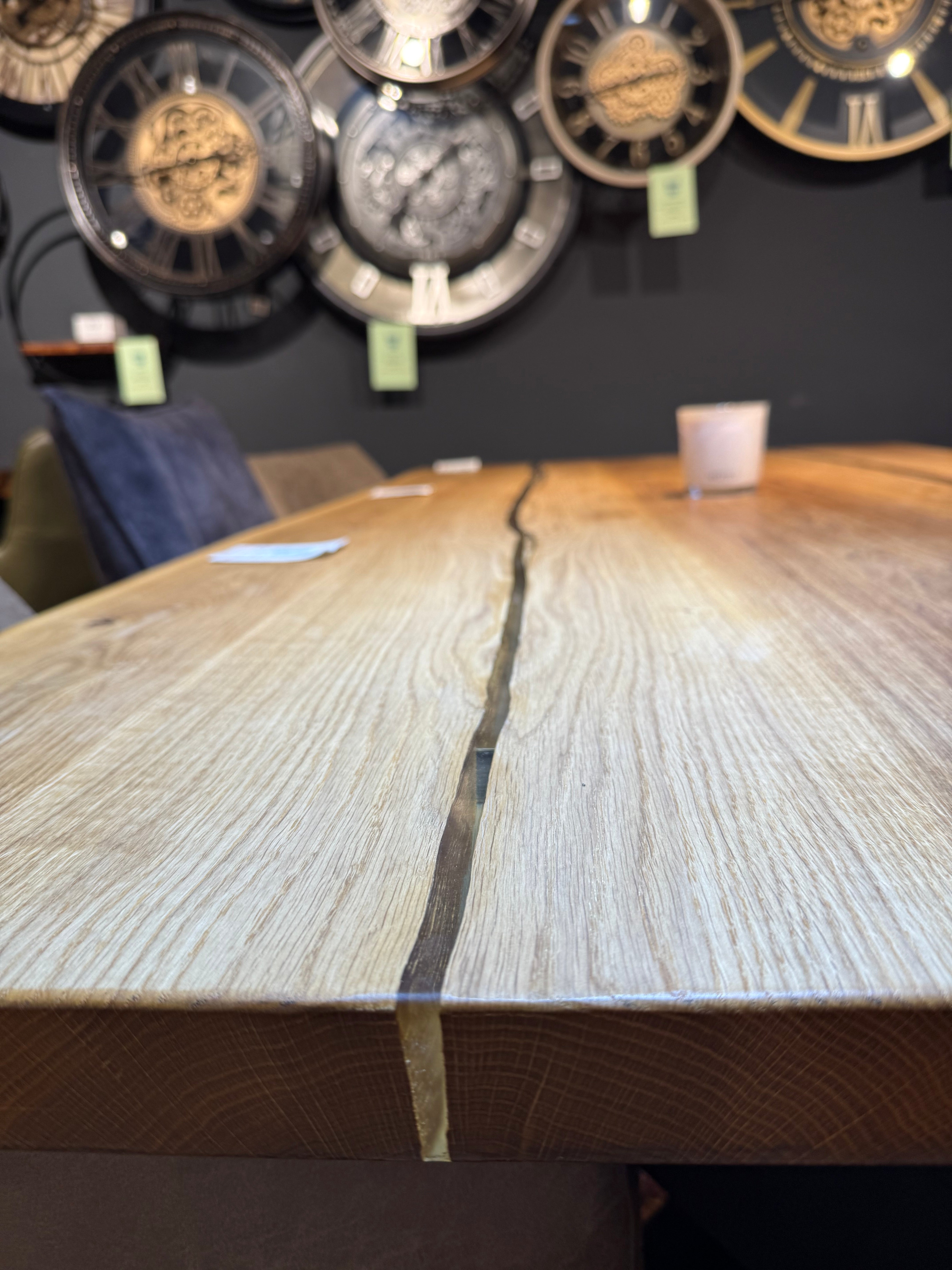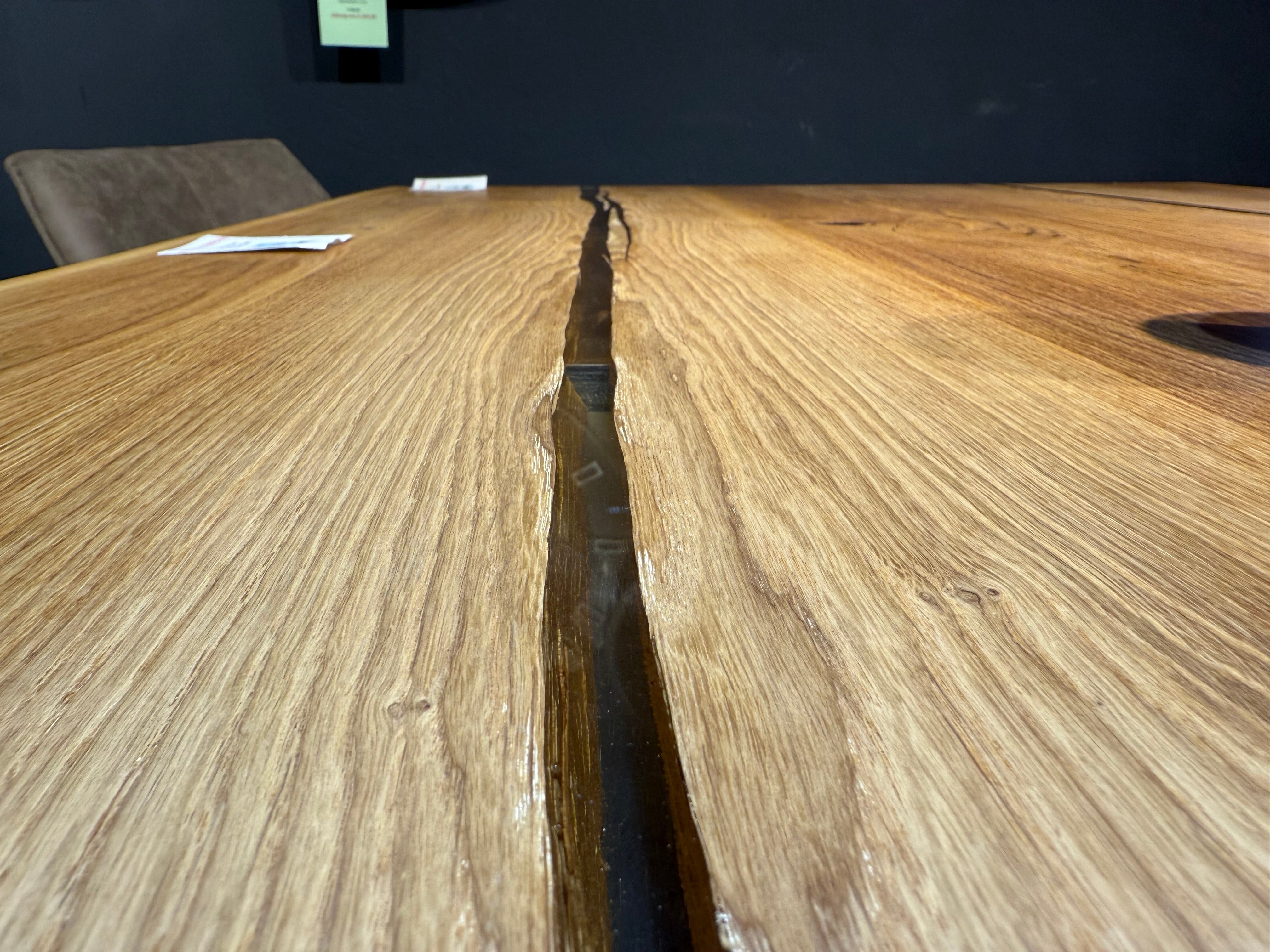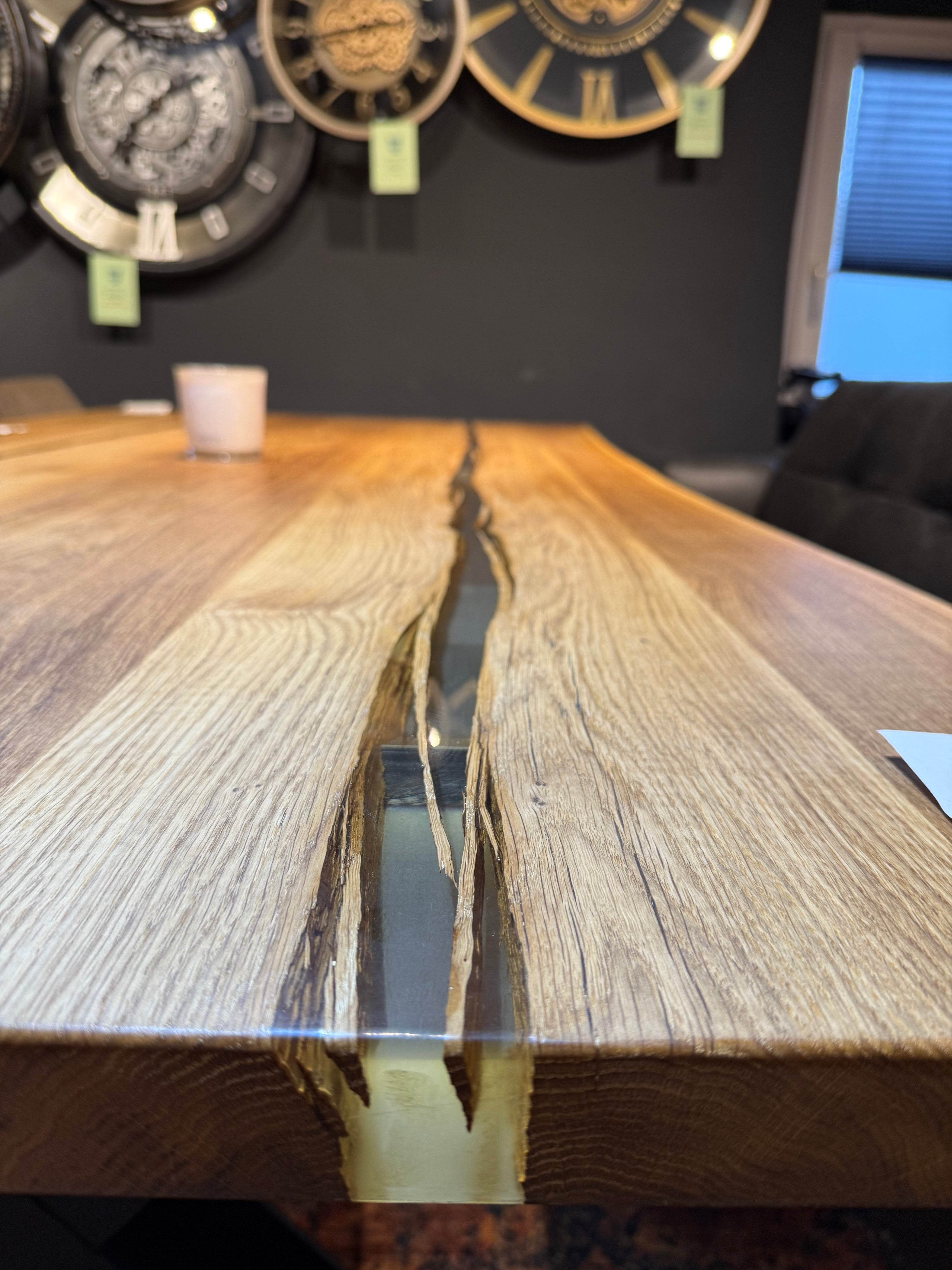 Dieser Esstisch aus geöltem Eichenholz - ist aus fünf massiven Eichebohlen handgefertigt und mit transparenten Epoxidharz gefüllt. Der Rivertable hat natürliche Baumkanten.