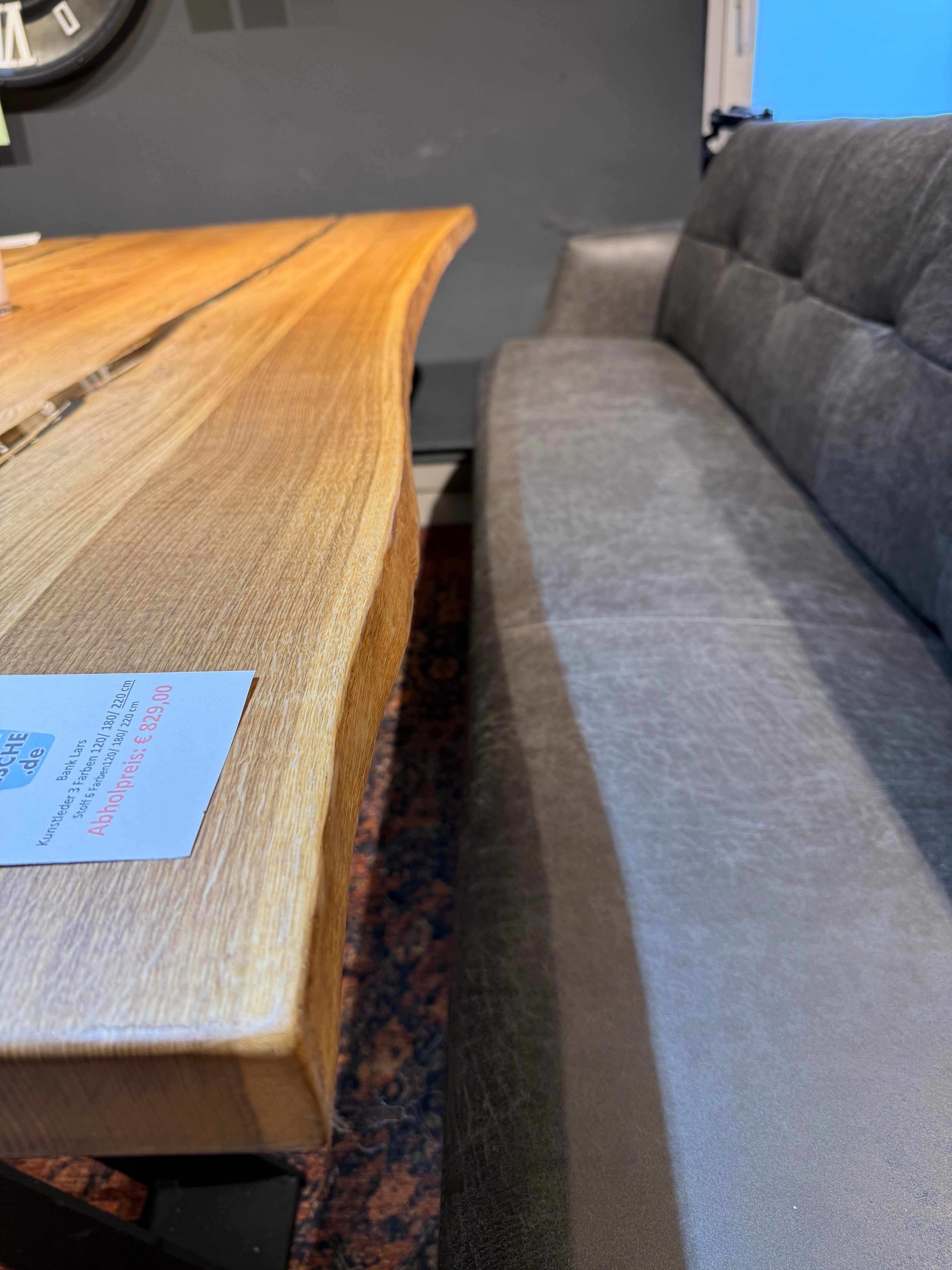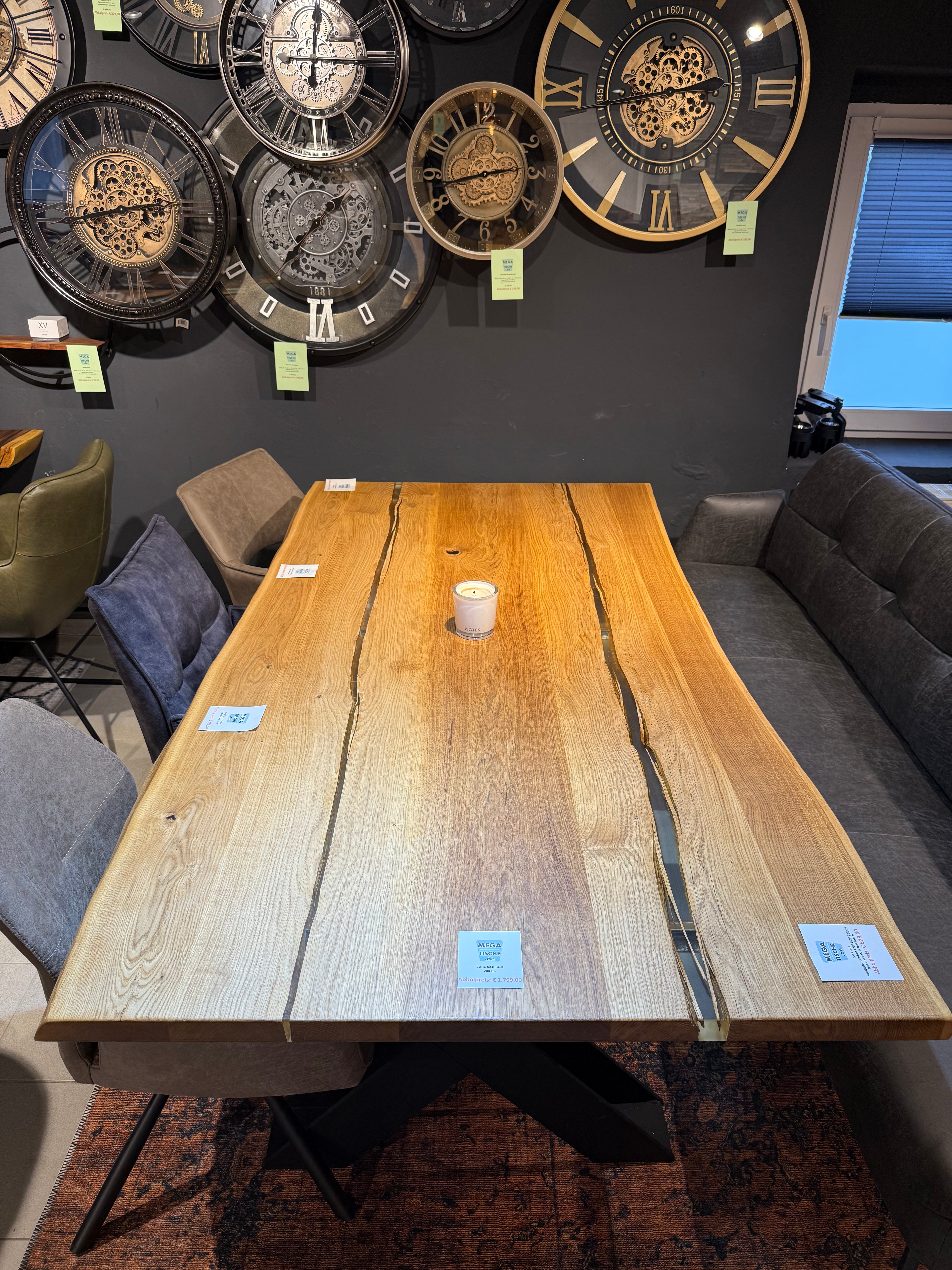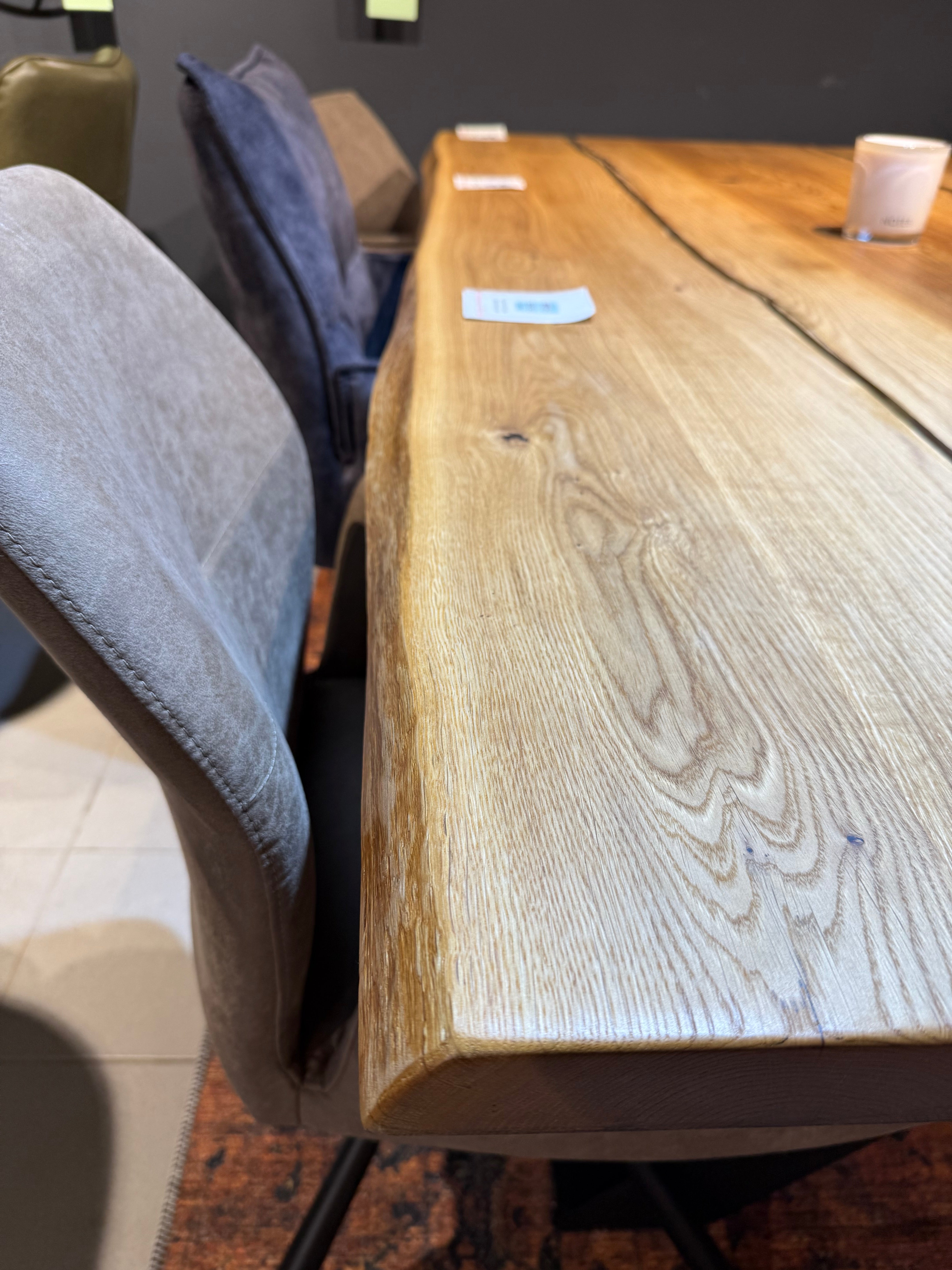 Dieser Esstisch aus geöltem Eichenholz - ist aus fünf massiven Eichebohlen handgefertigt und mit transparenten Epoxidharz gefüllt. Der Rivertable hat natürliche Baumkanten.
