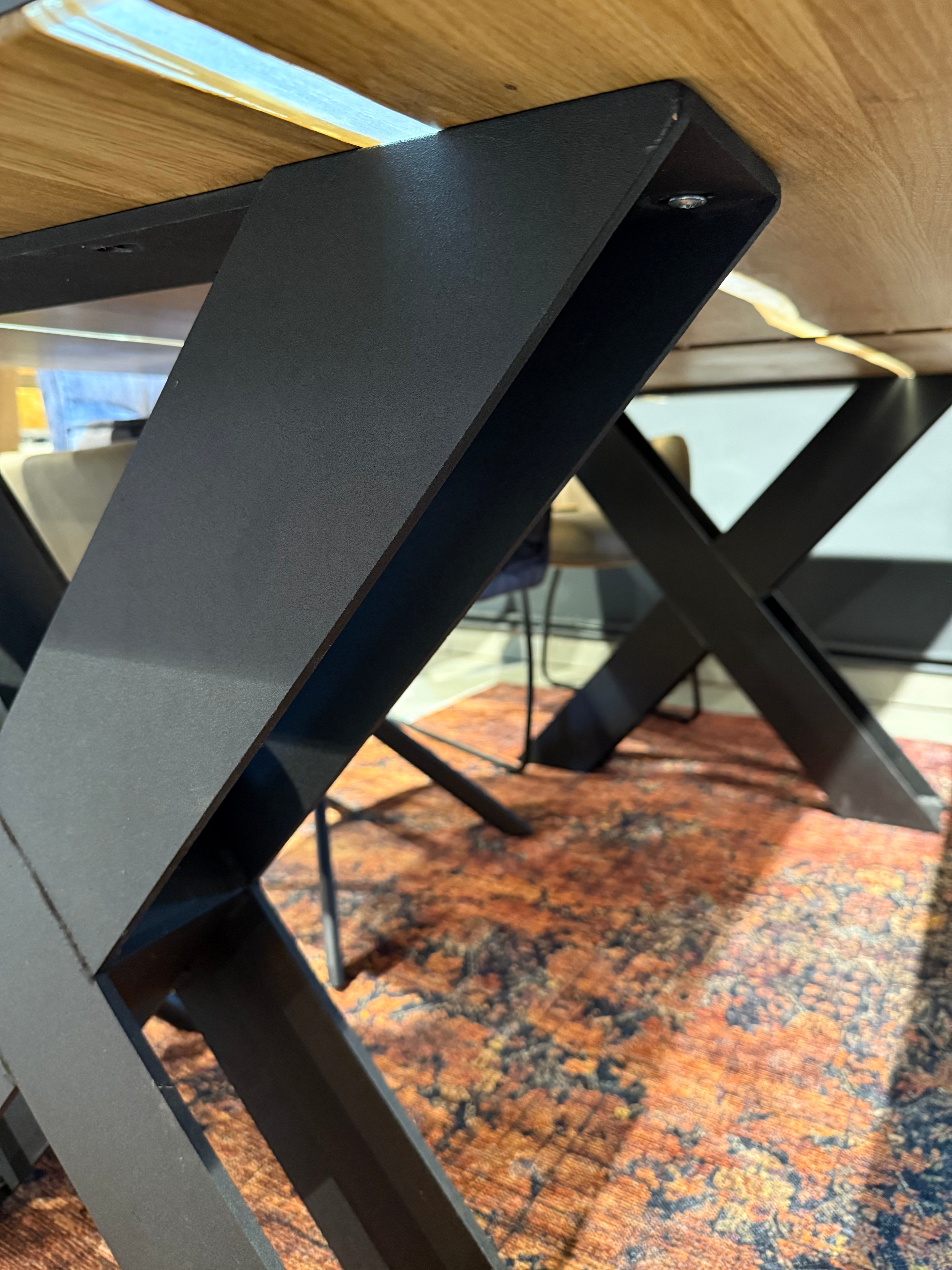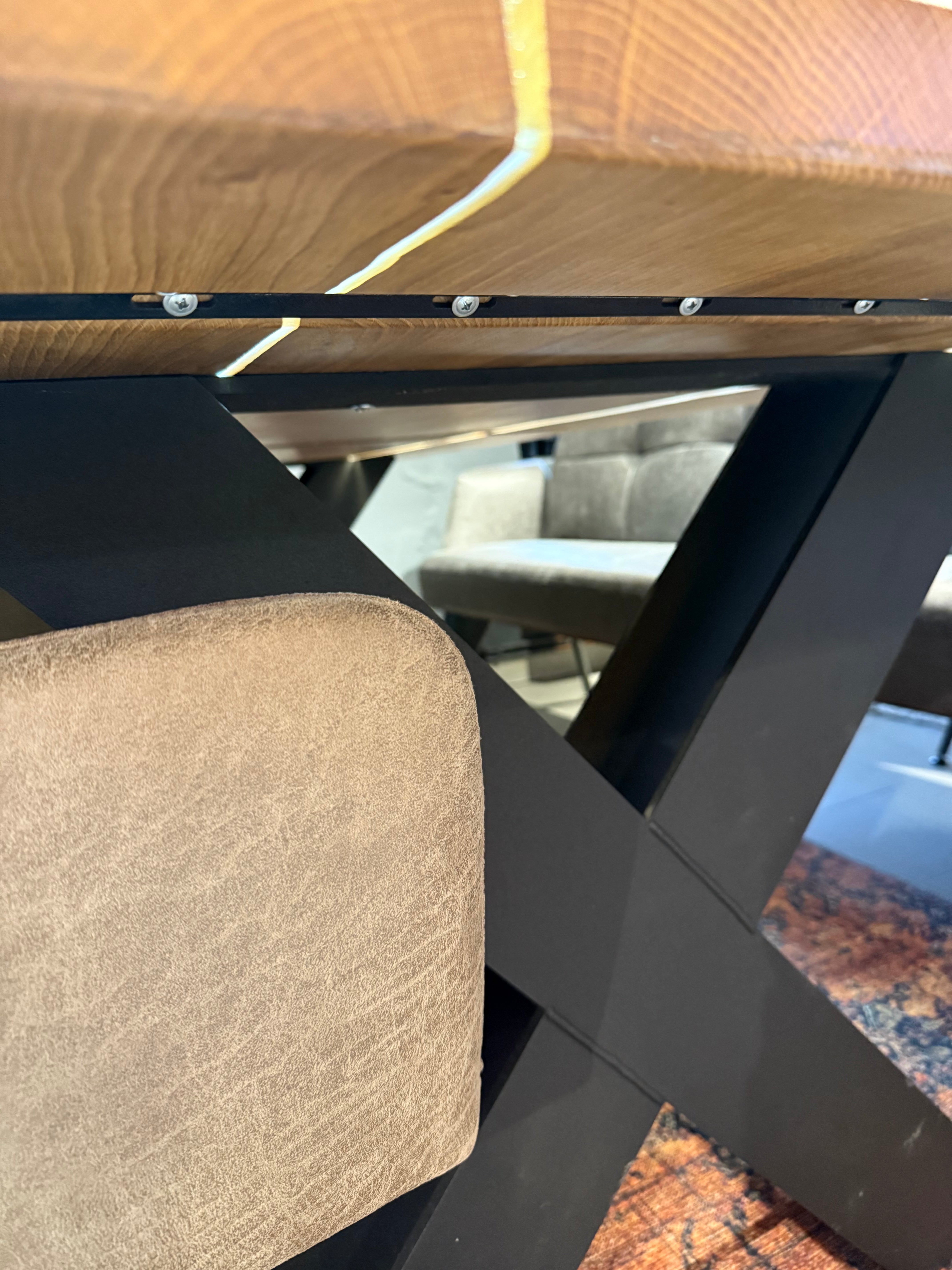 Der massive Holztisch hat ein schwarzes Vollstahl X Gestell Set (schwarz pulverbeschichtet). Der Rivertisch ist ein Einzelstück. Es kann auch ein anderes Gestell angebracht werden oder getauscht werden (gegen Mehr- oder Minderkosten)
