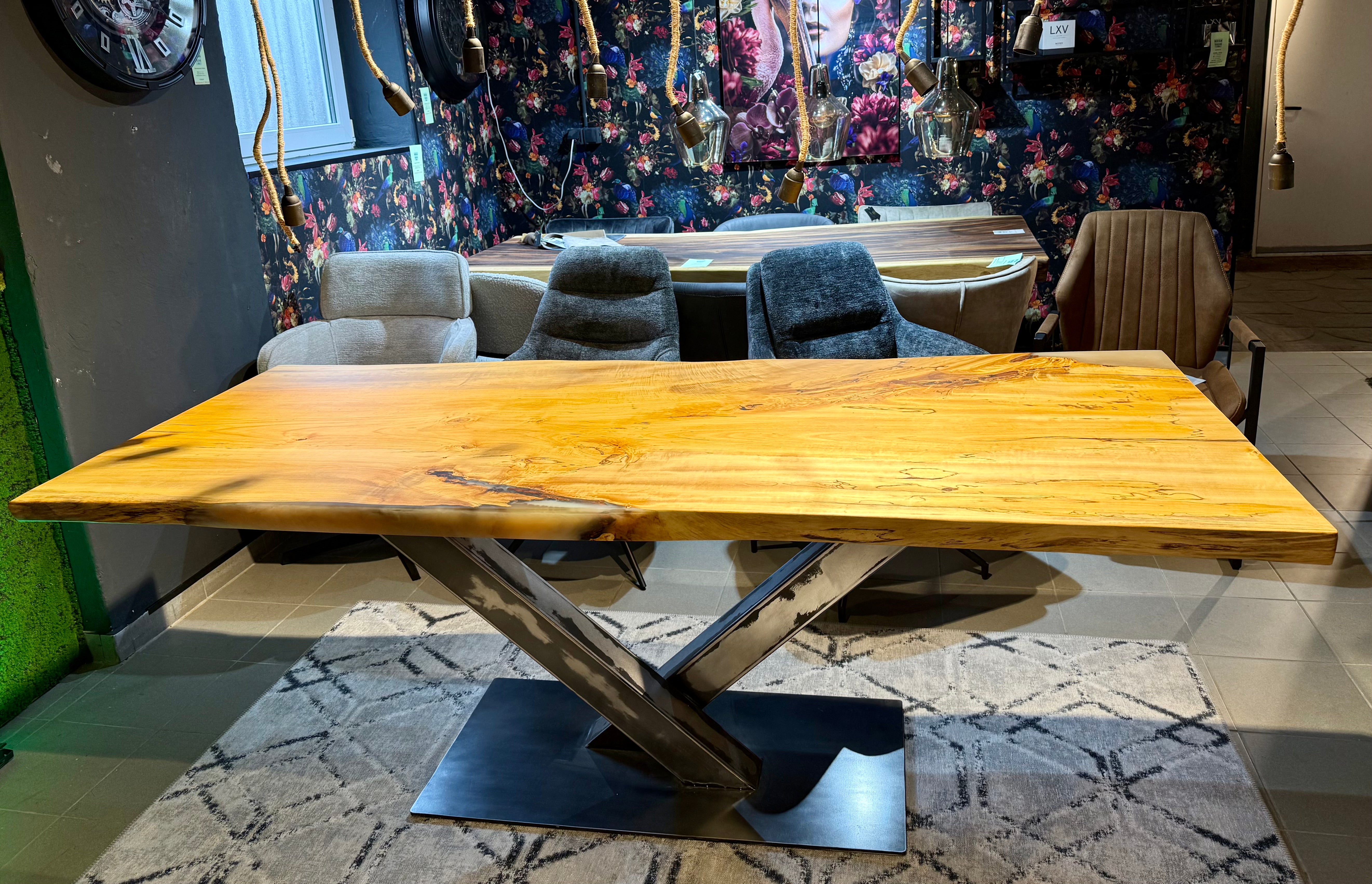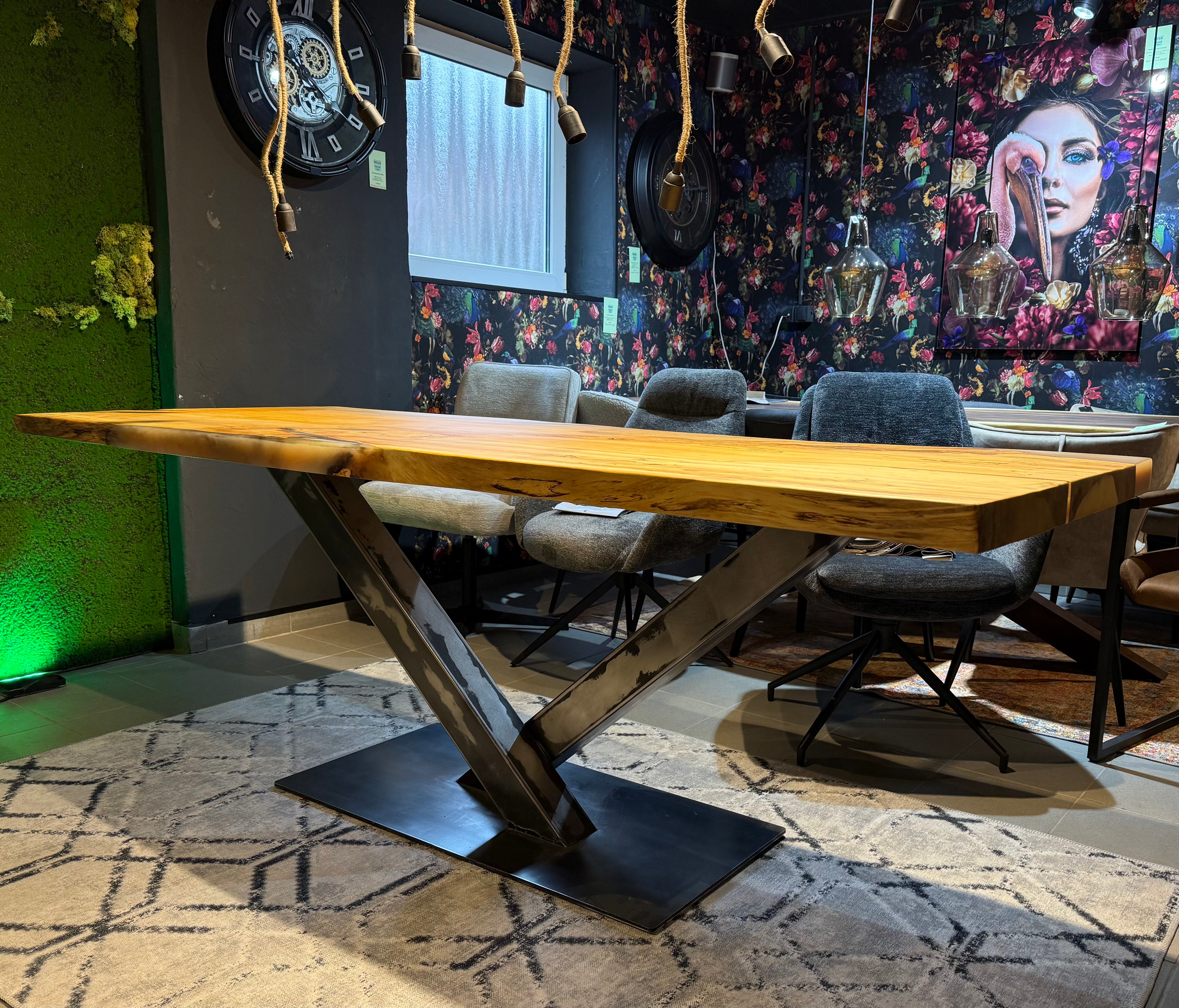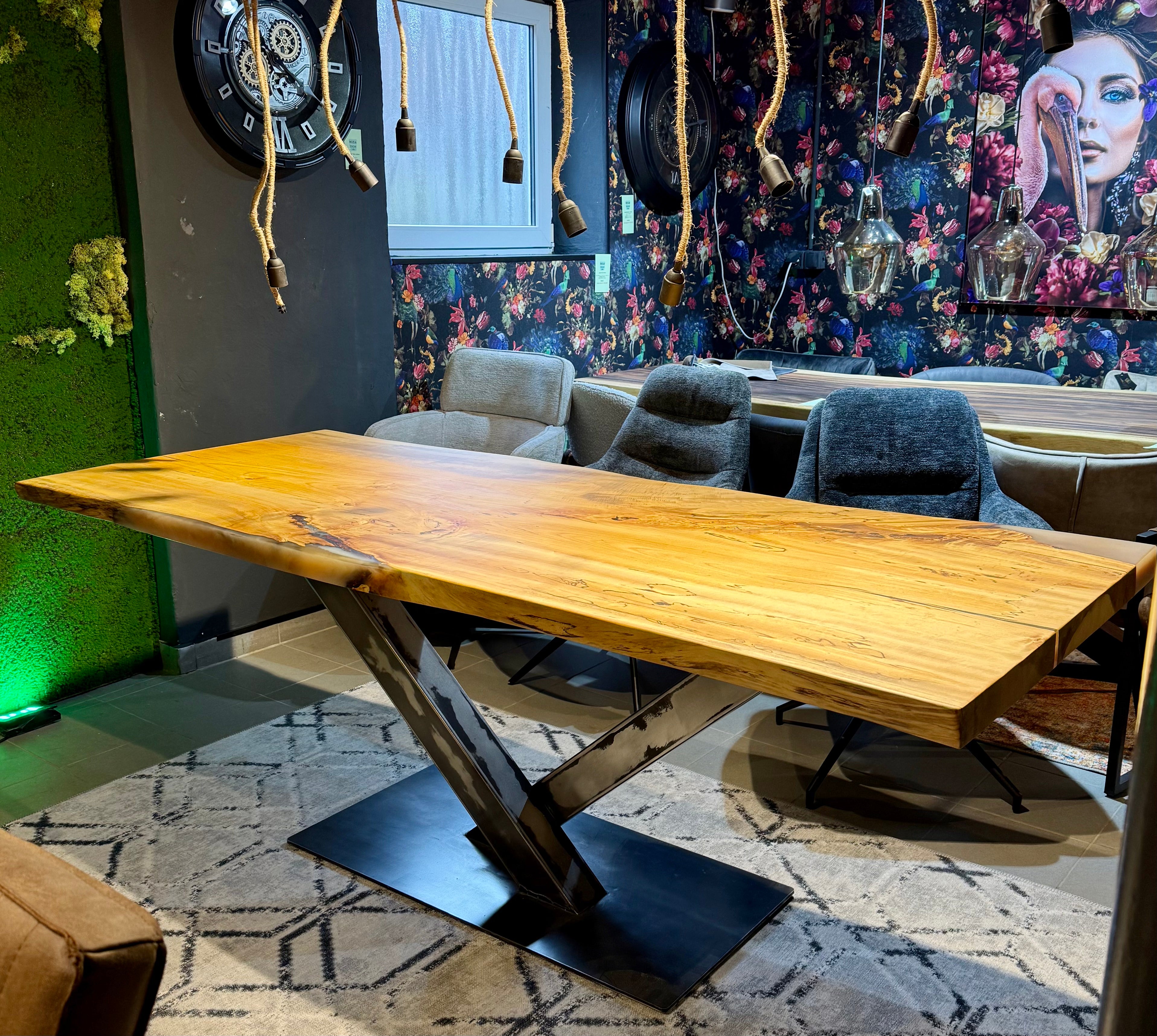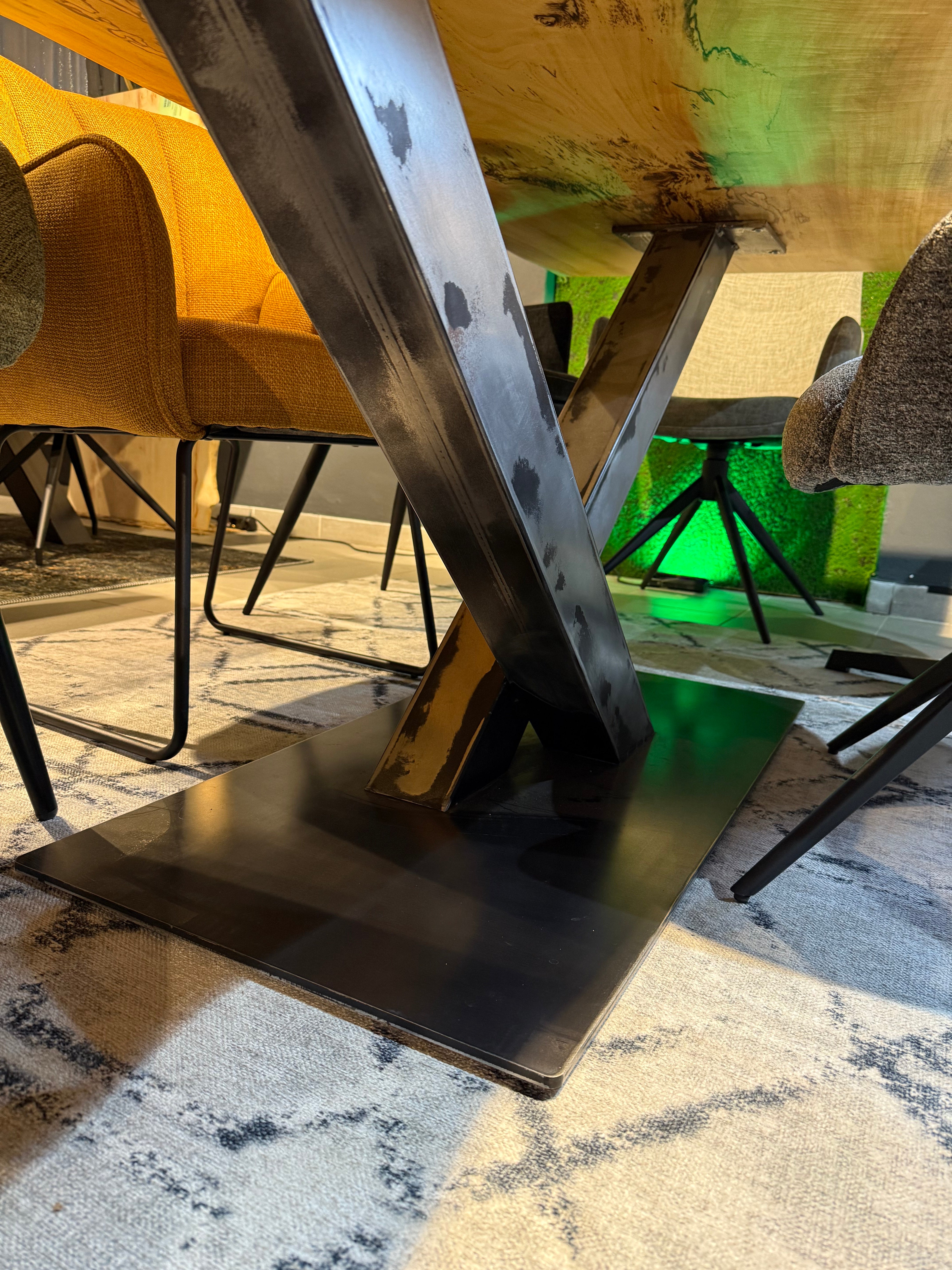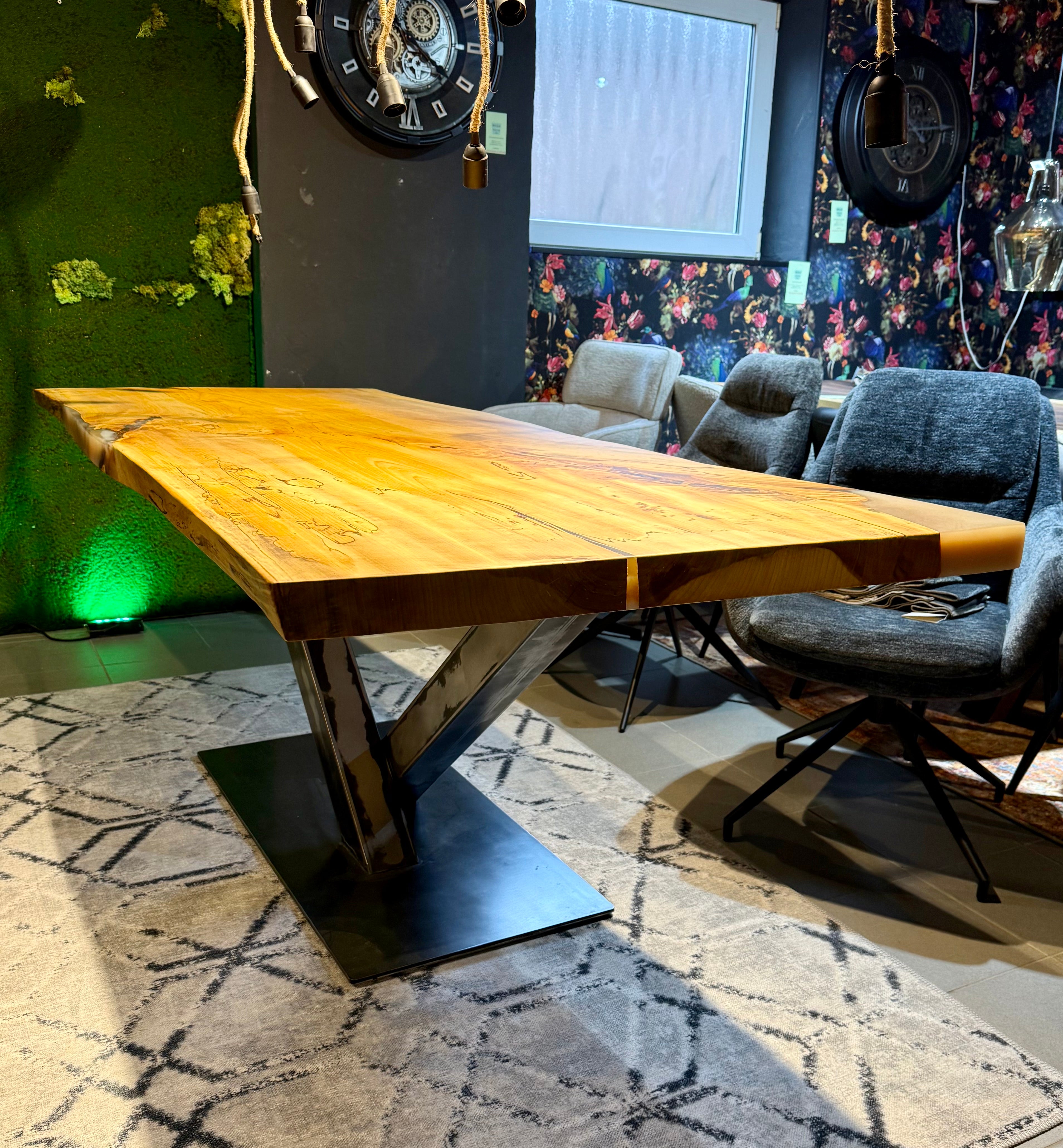 Epoxidharz Baumstamm Esstisch Pappel 200 cm natürliche Baumkante massiv mit Blankstahl V Gestell