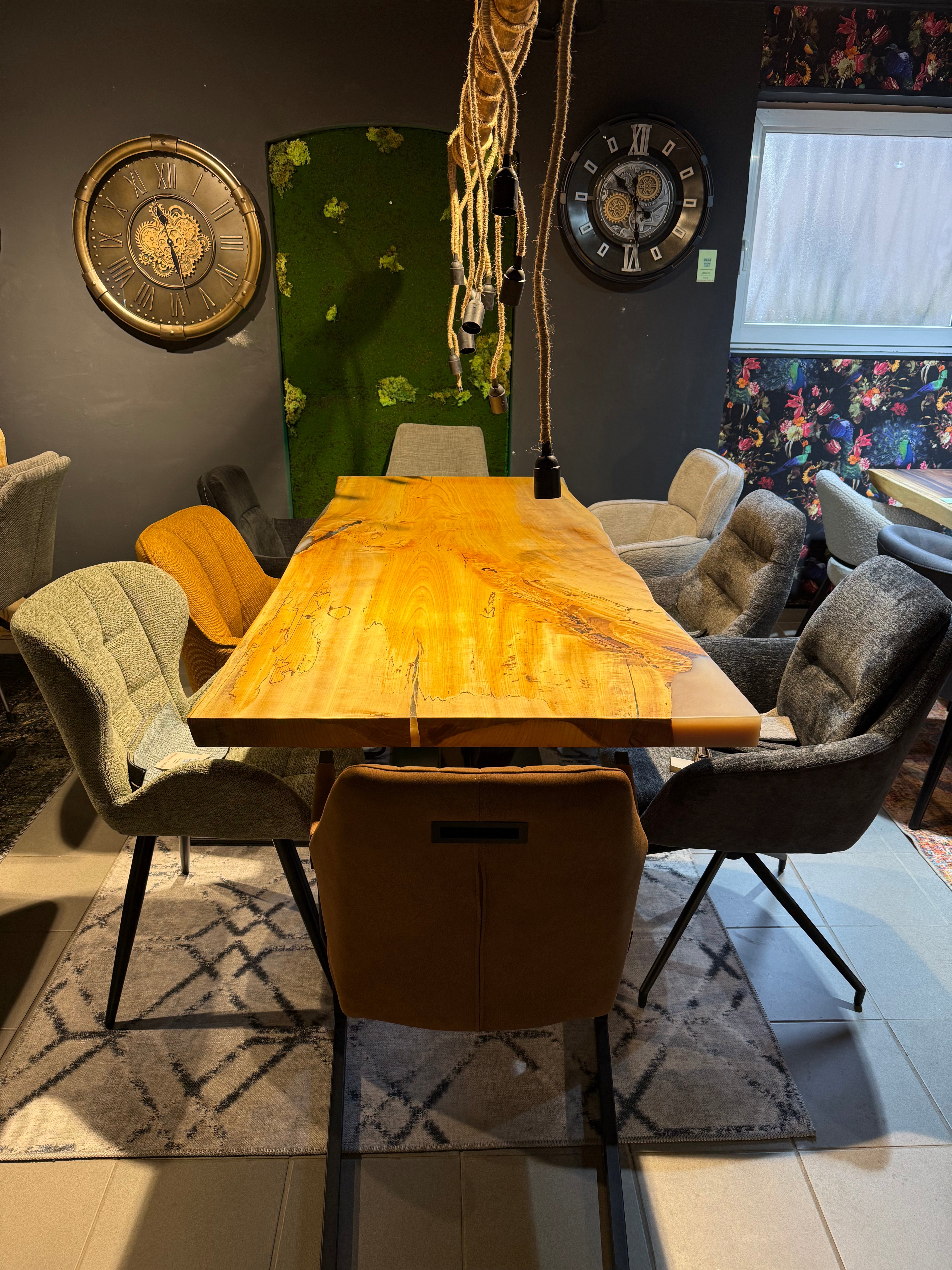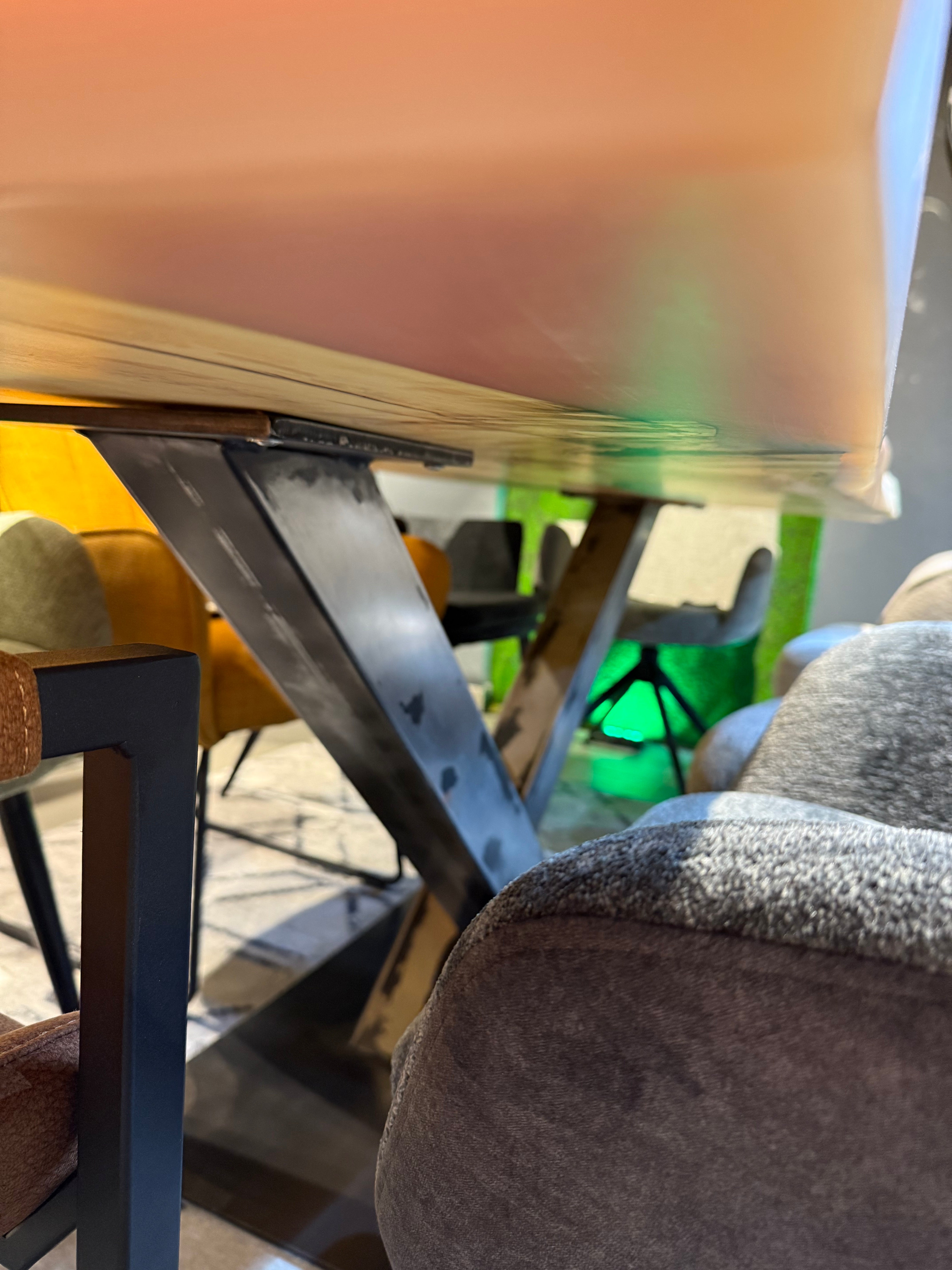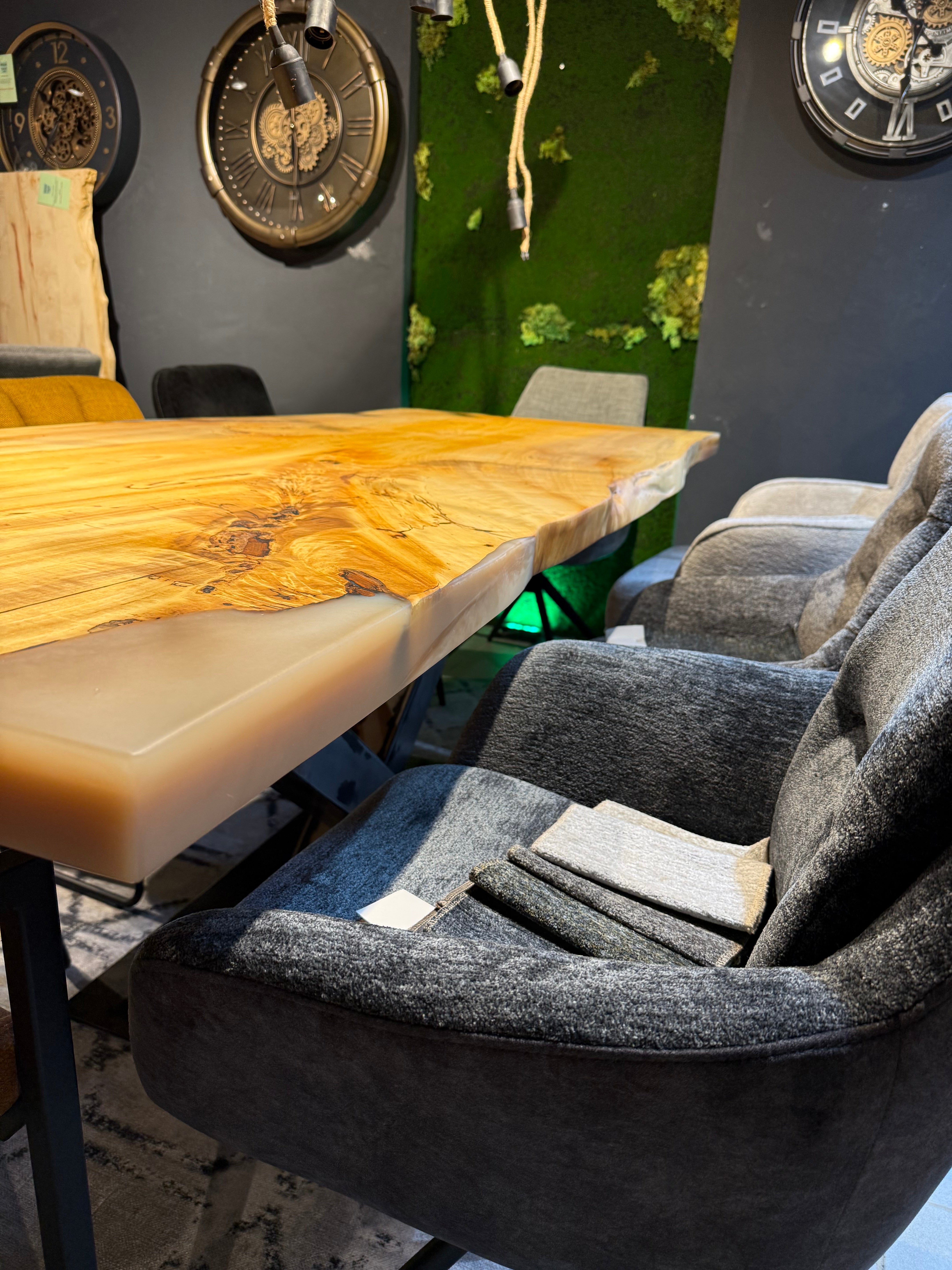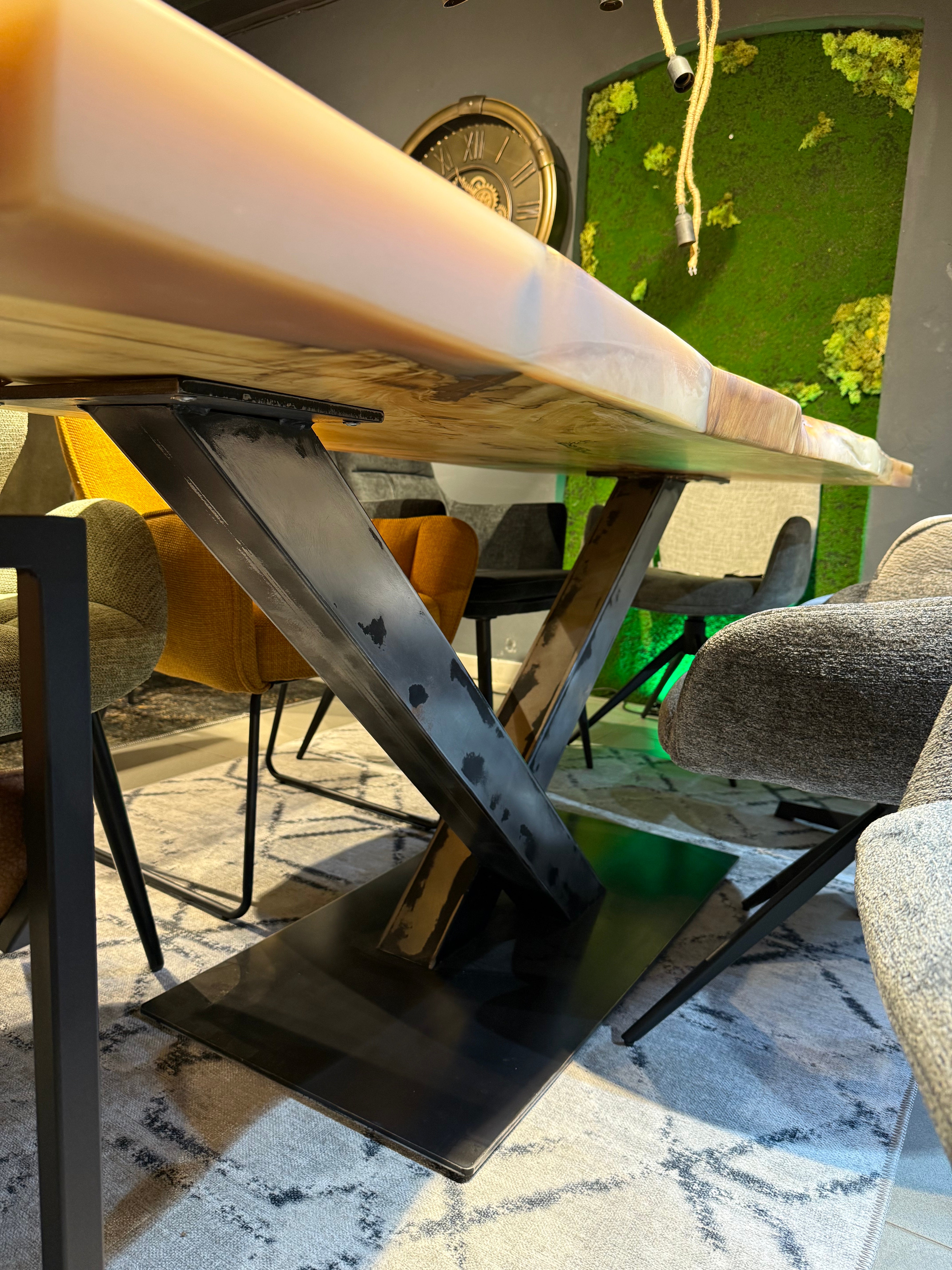 Das Epoxidharz des Esszimmer Tisches ist in der Farbe Milch-Karamell gehalten und macht diesen Tisch zu einem Einzelstück.