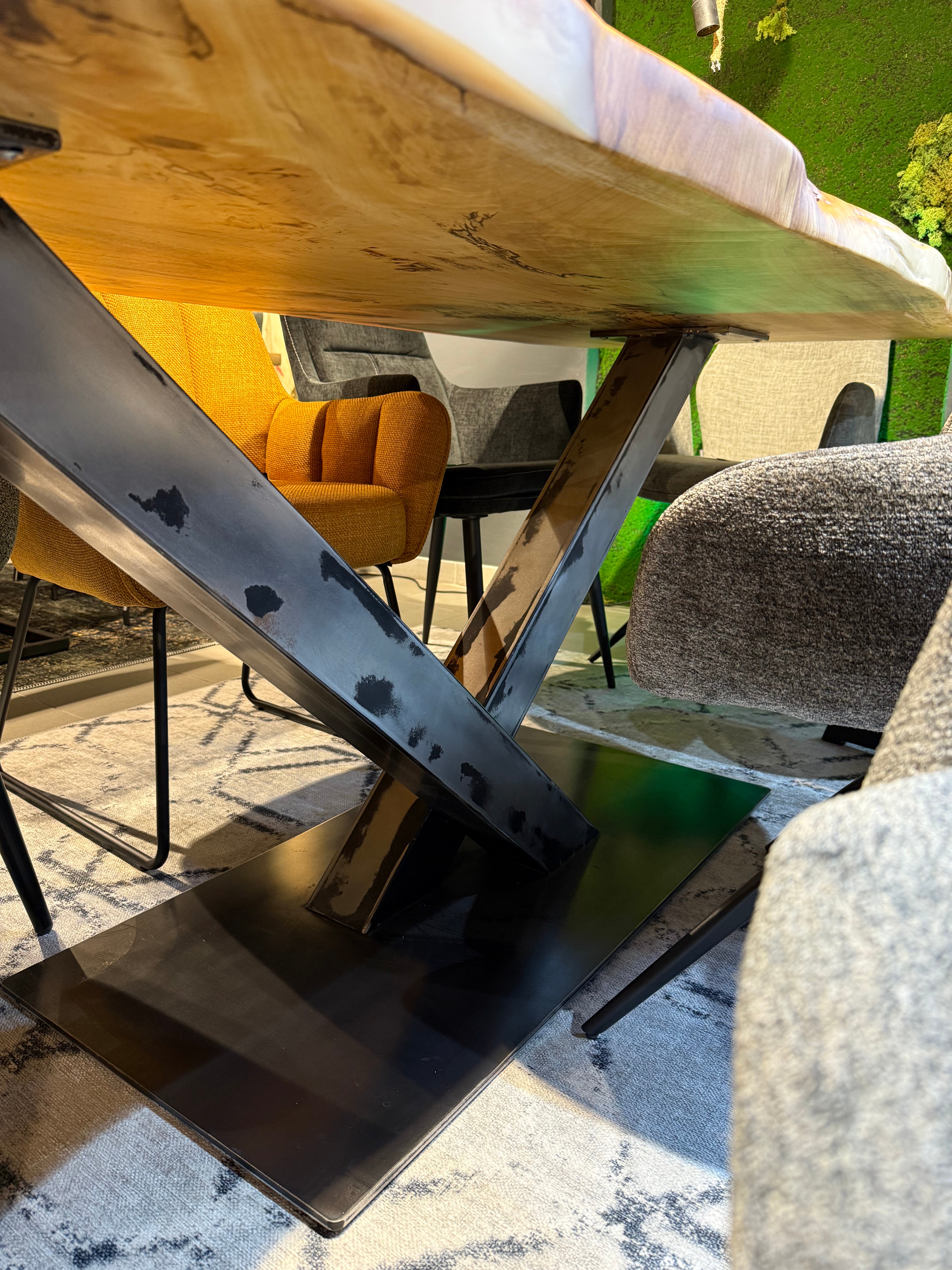 Der Baumstammtisch hat ein mittiges Blankstahl Metall V-Gestell.