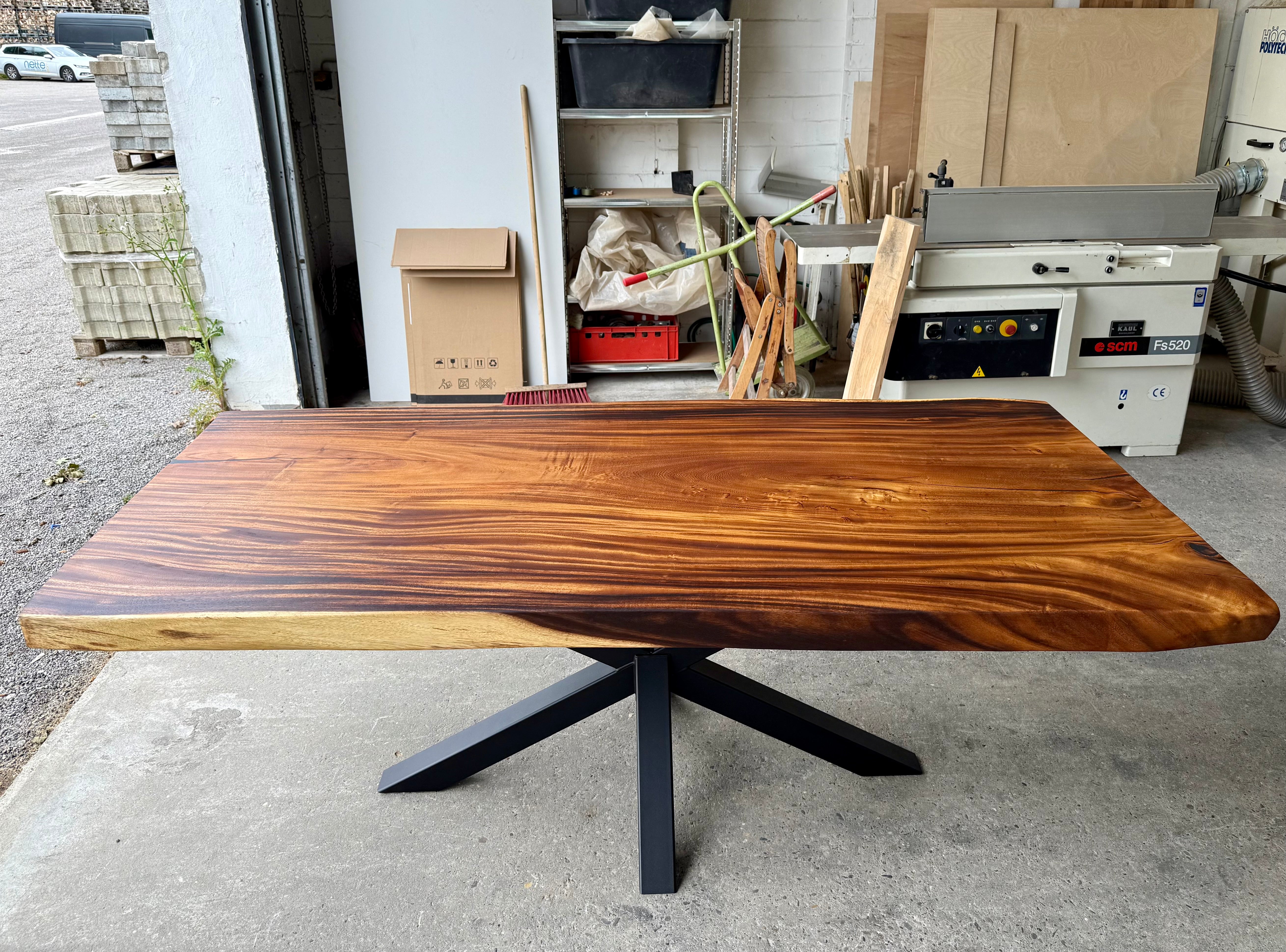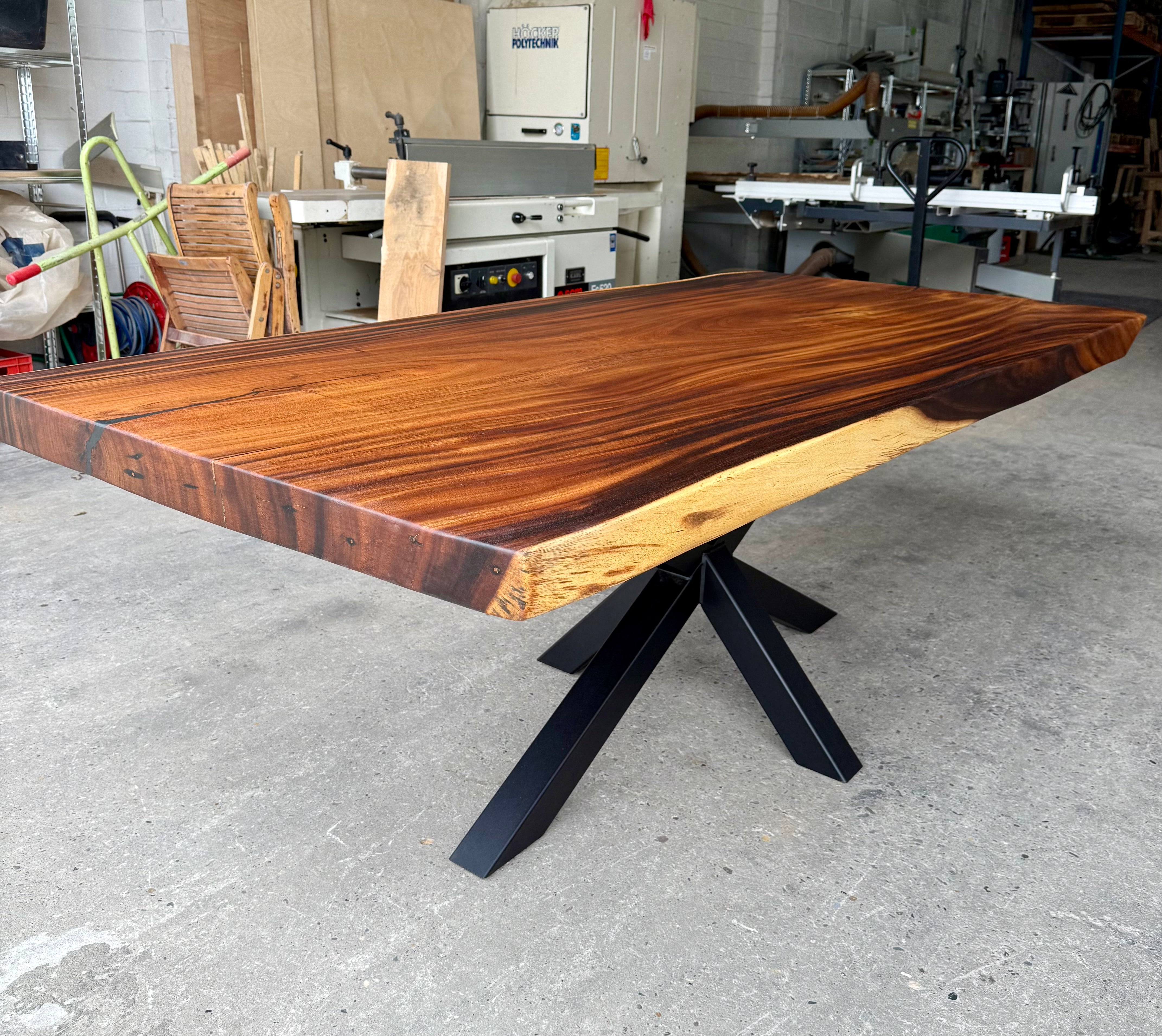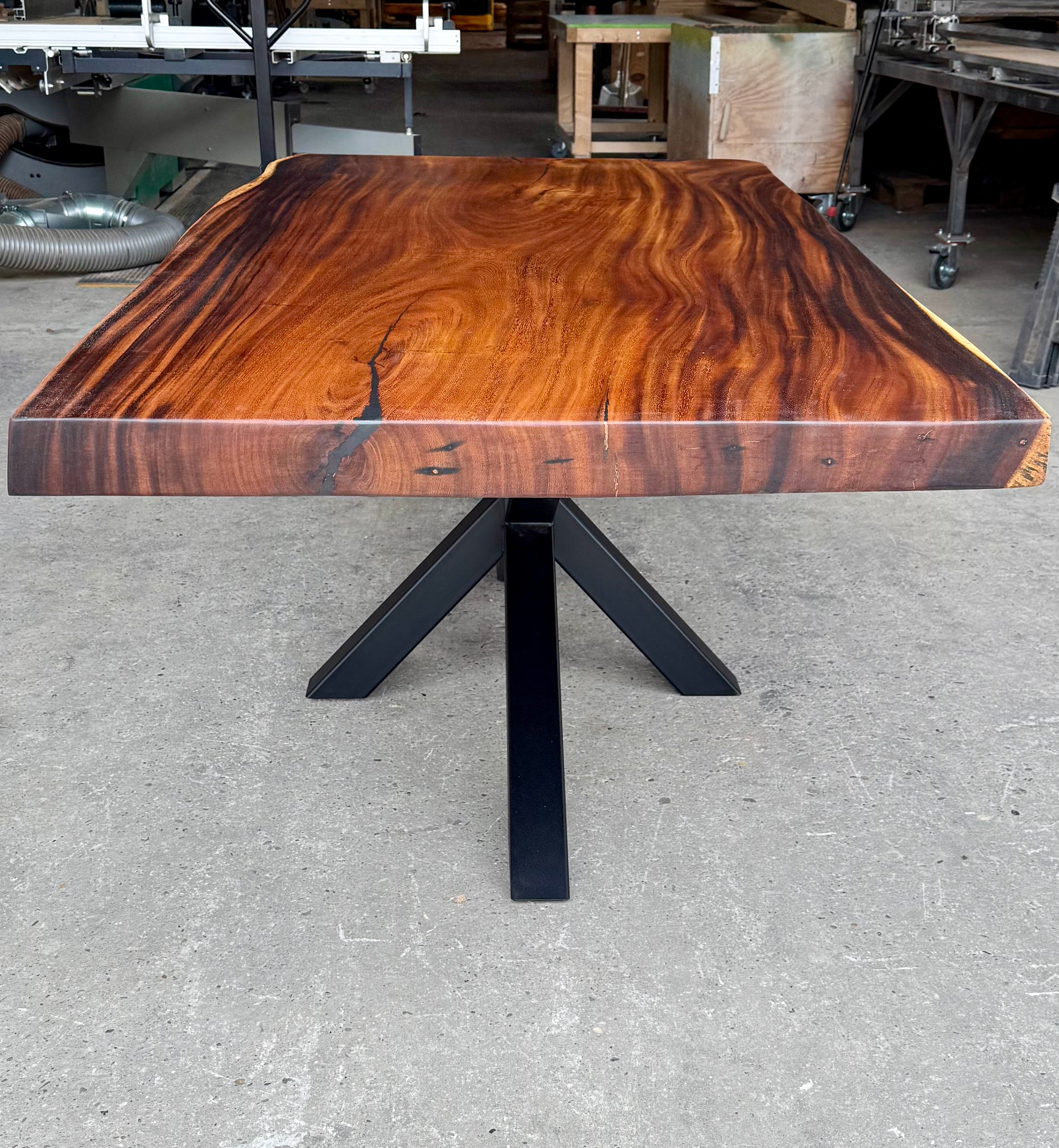 Dieser Mammuttisch aus Suarholz - ist aus massiven Echtholz gefertigt. Der Holztisch hat ein schwarzes mittiges und pulverbeschichtetes Spider-Gestell.