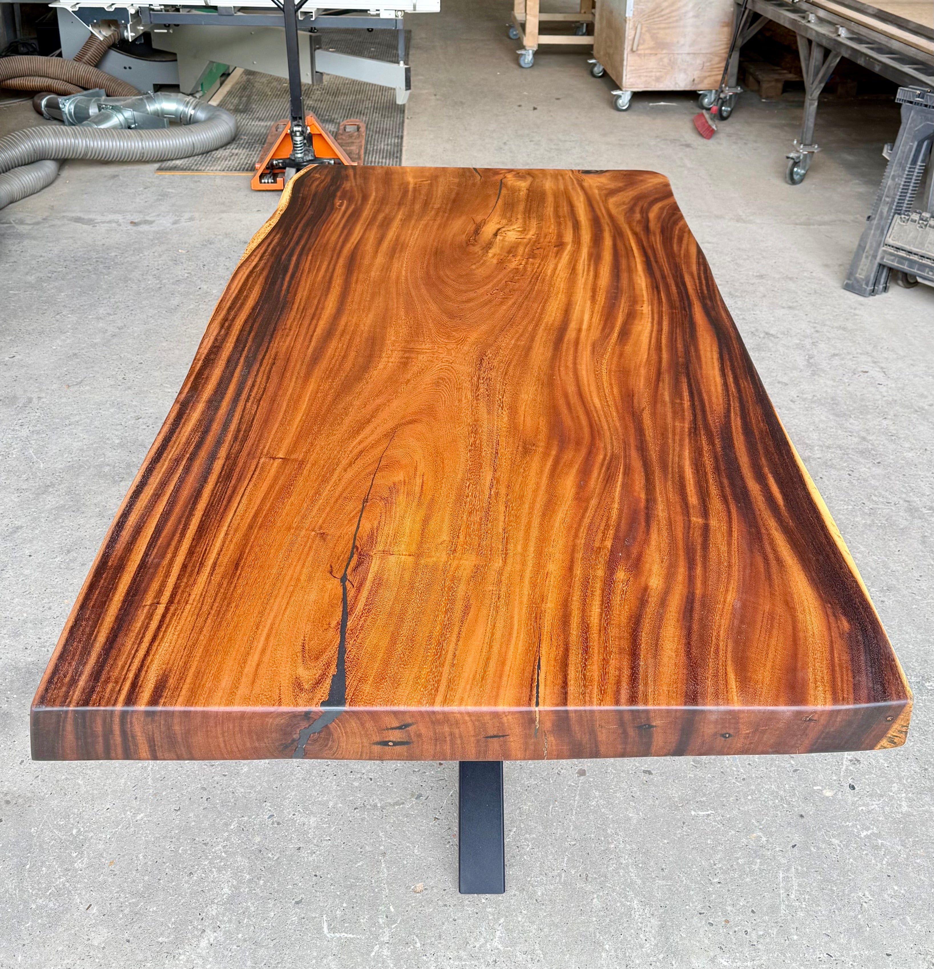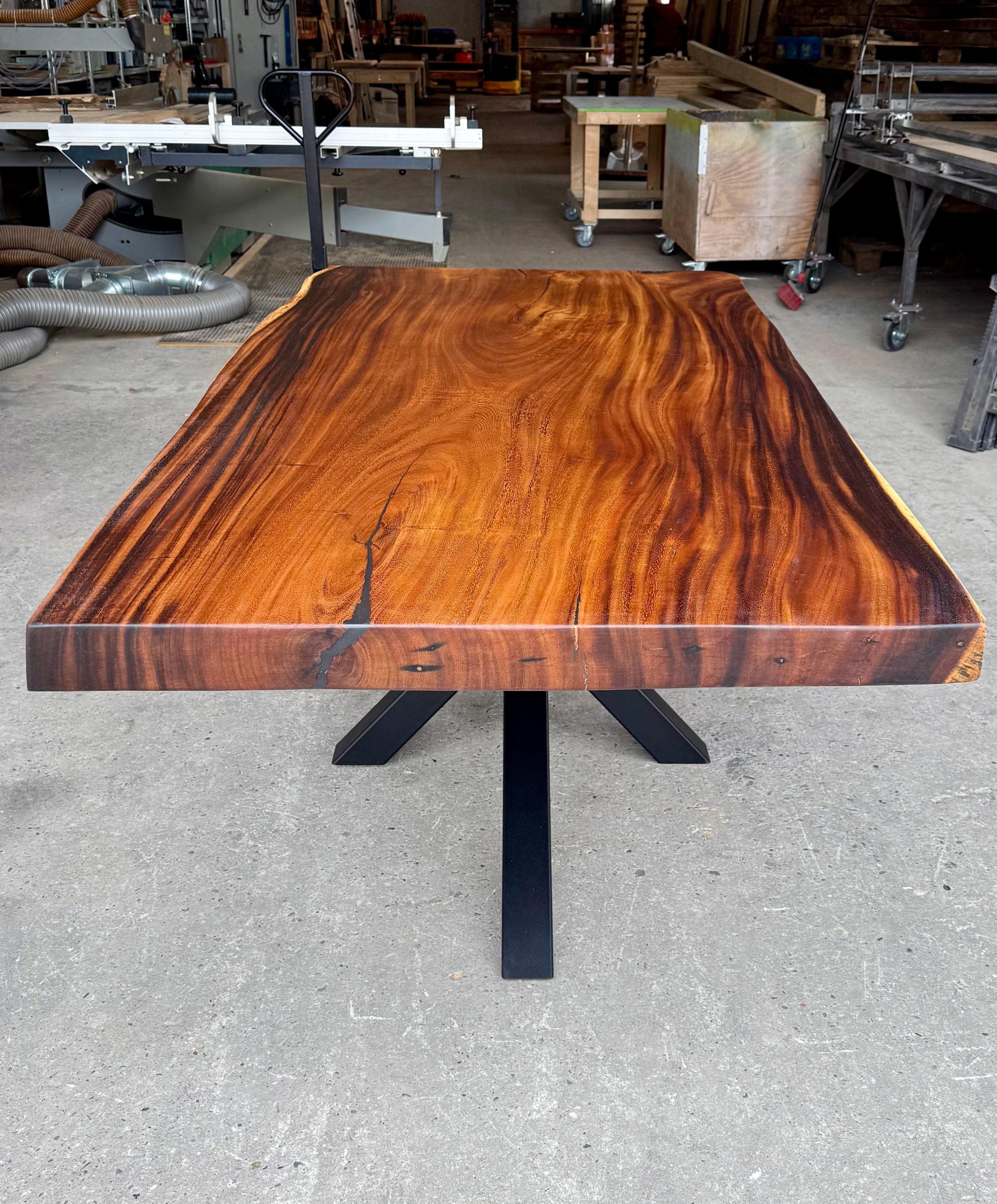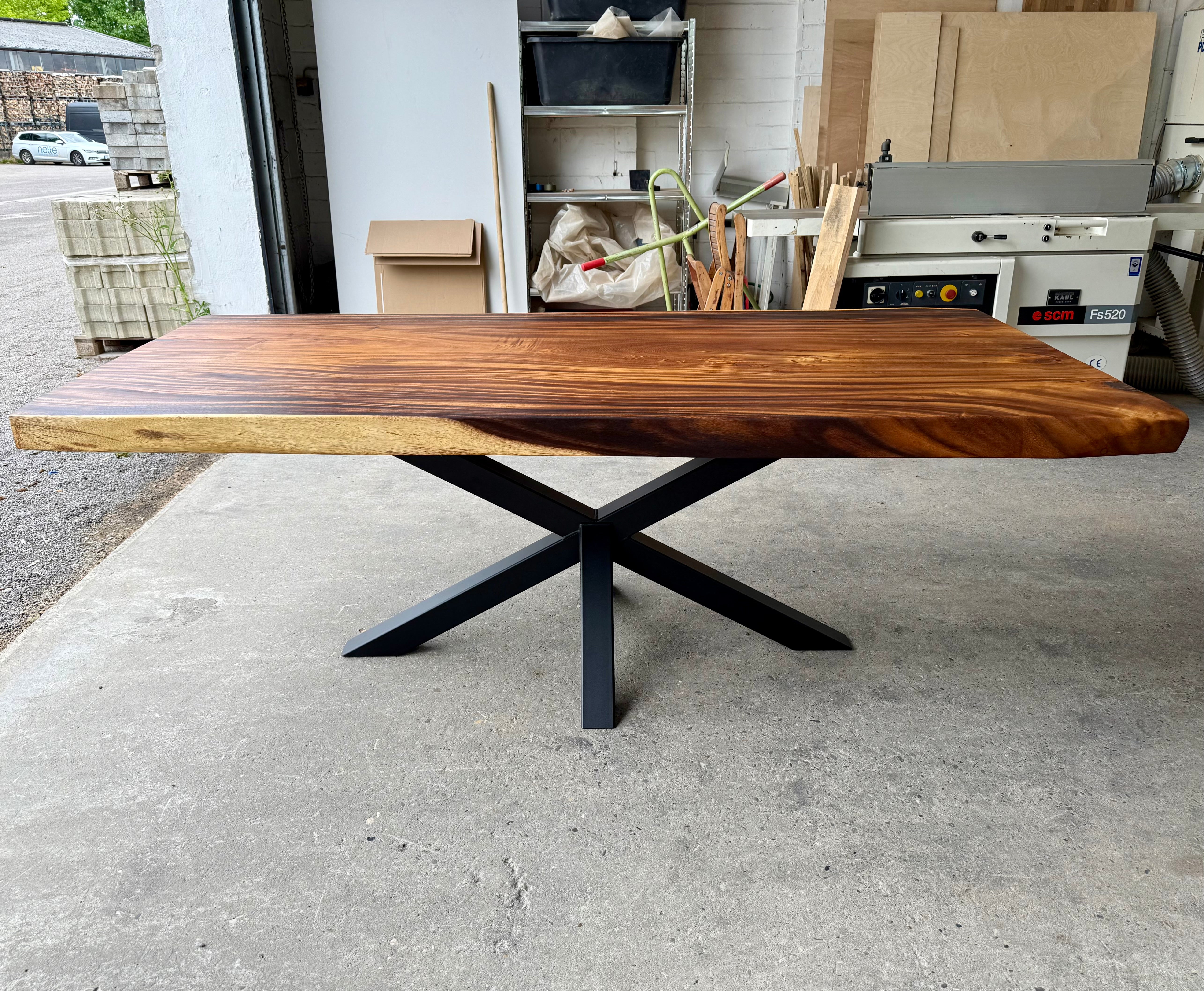 Dieser Mammuttisch aus Suarholz - ist aus massiven Echtholz gefertigt. Der Holztisch hat ein schwarzes mittiges und pulverbeschichtetes Spider-Gestell.