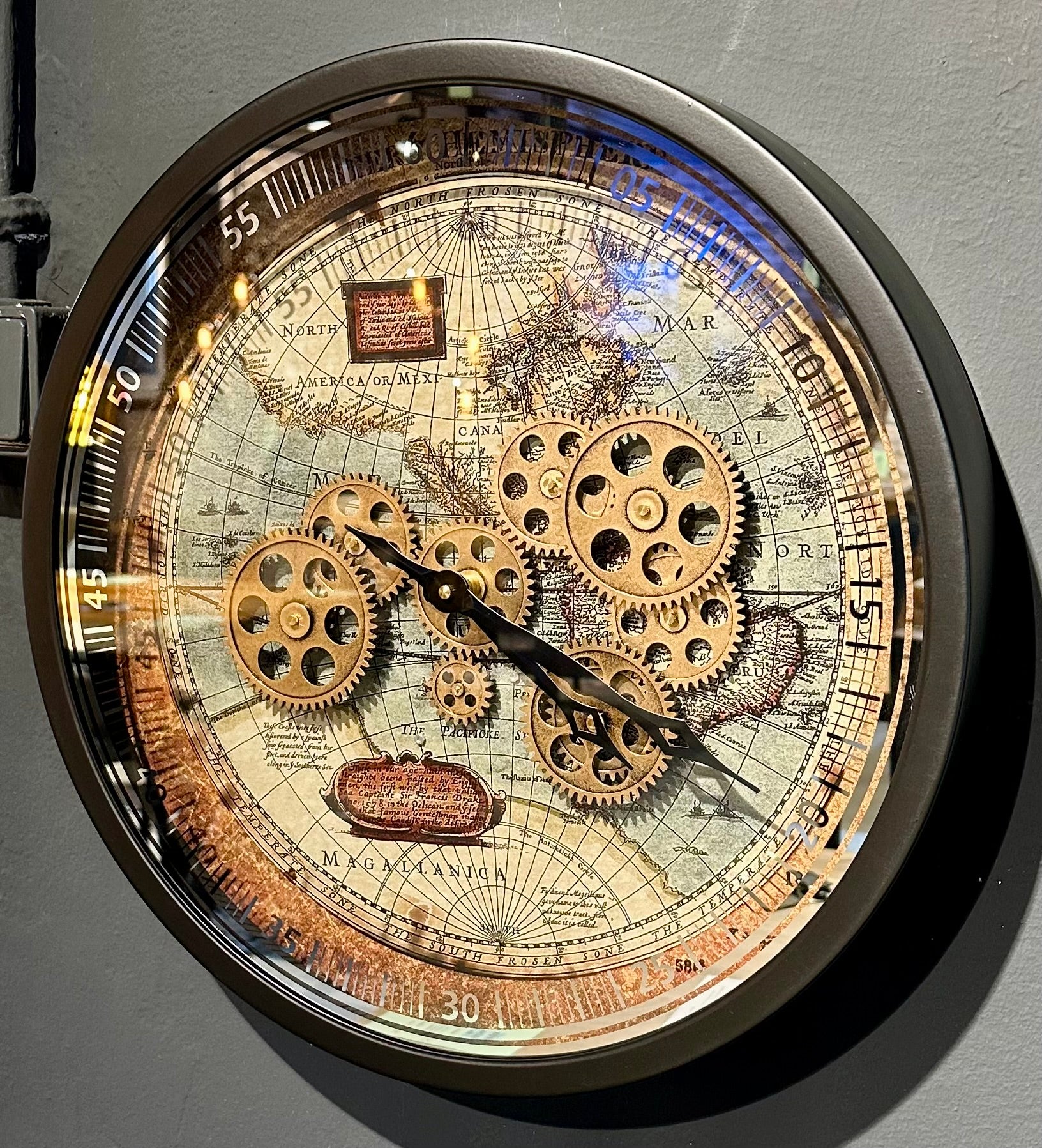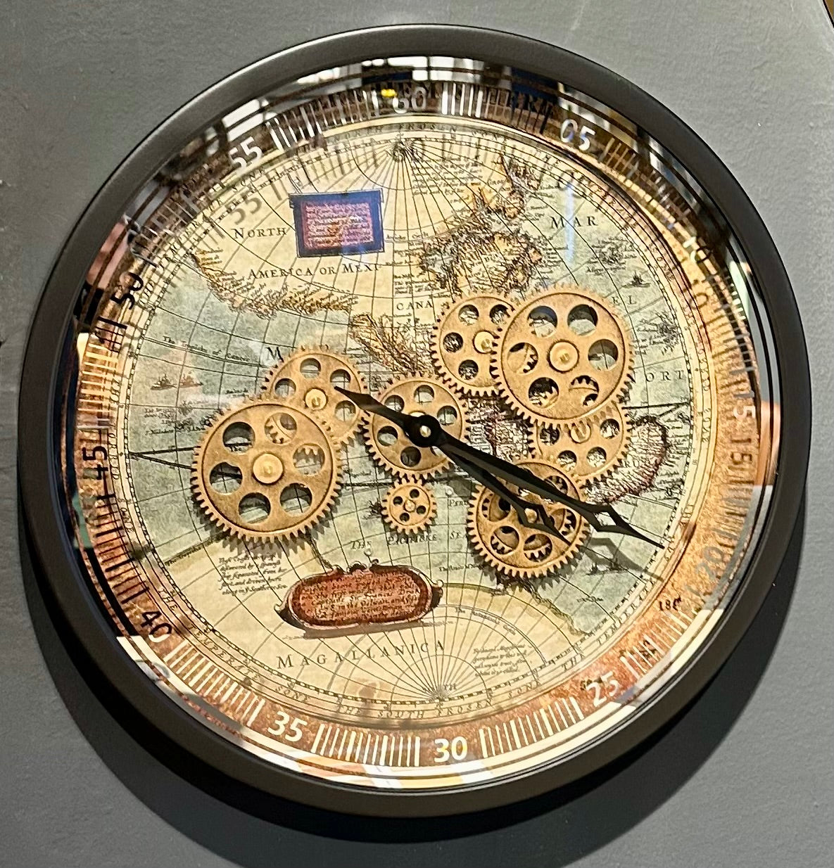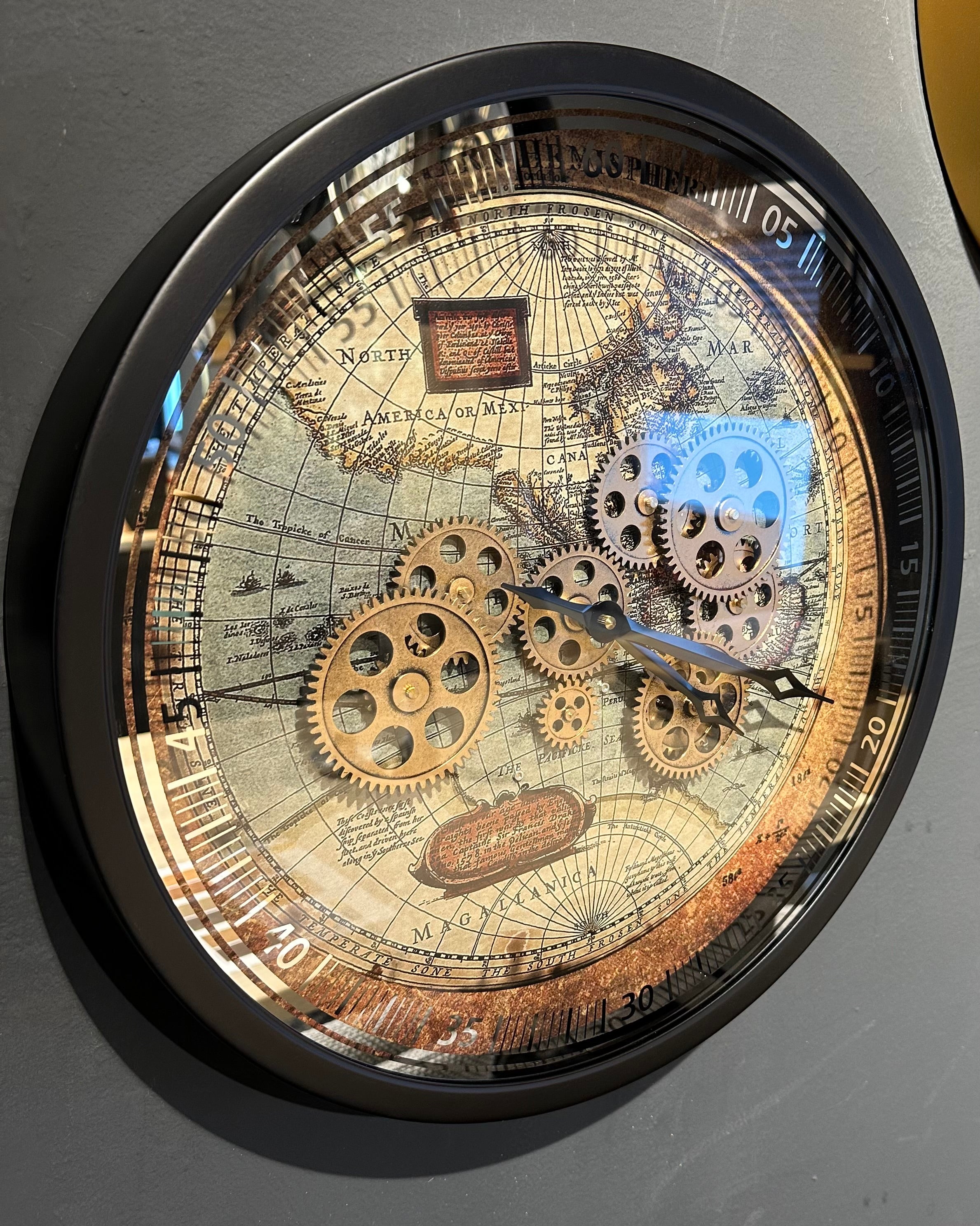 Landkarte Vintage Wanduhr 46 cm rund schwarz Chrom Zahnrad animiert