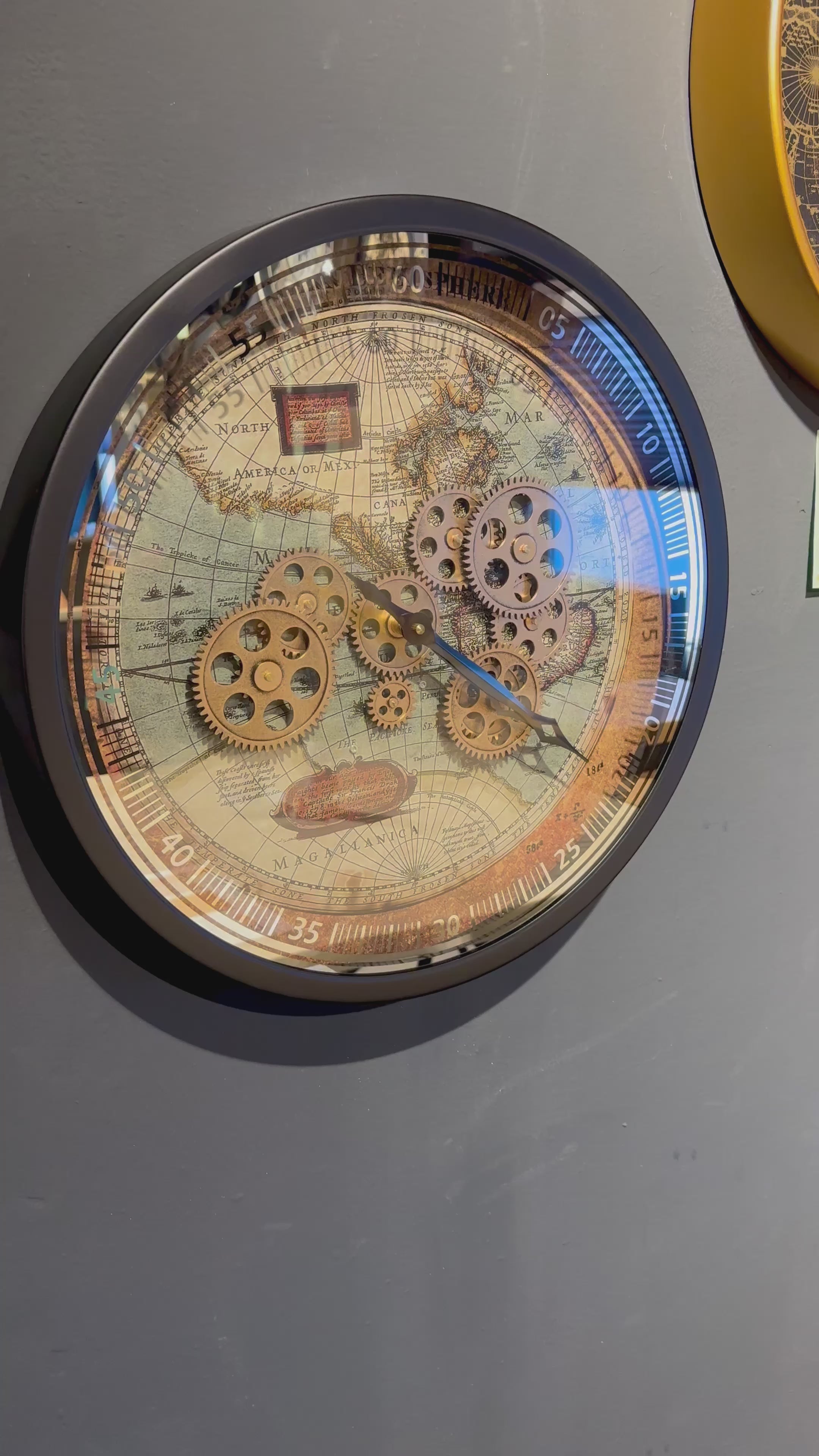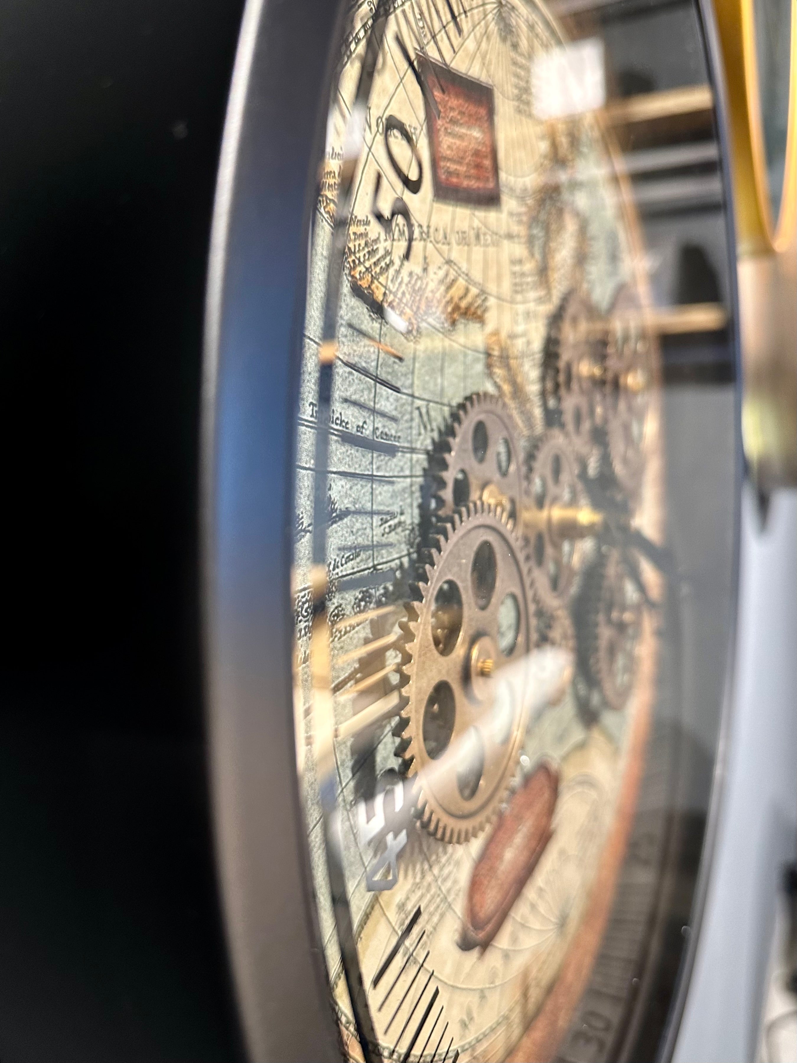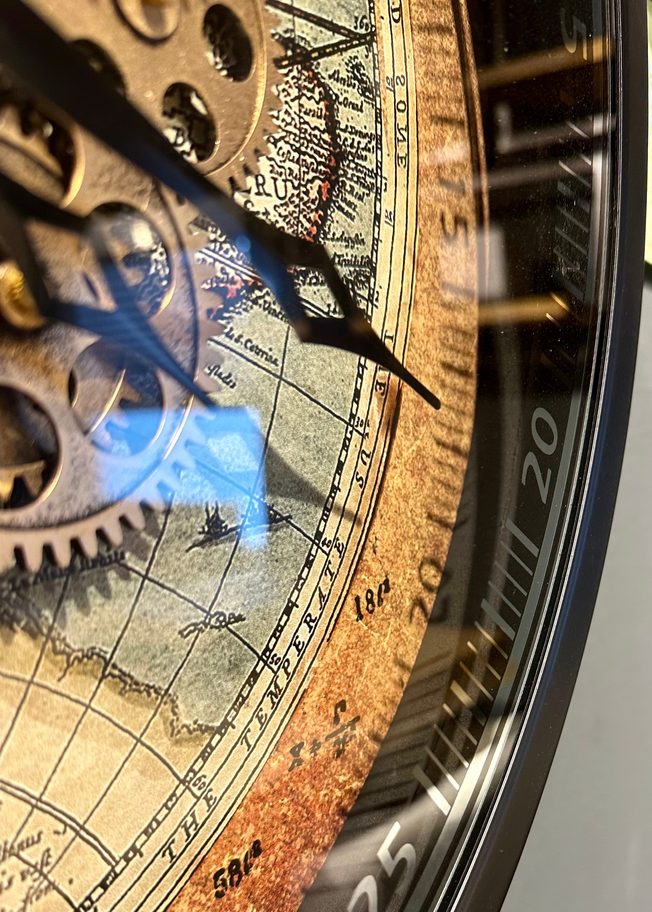 Landkarte Vintage Wanduhr 46 cm rund schwarz Chrom Zahnrad animiert