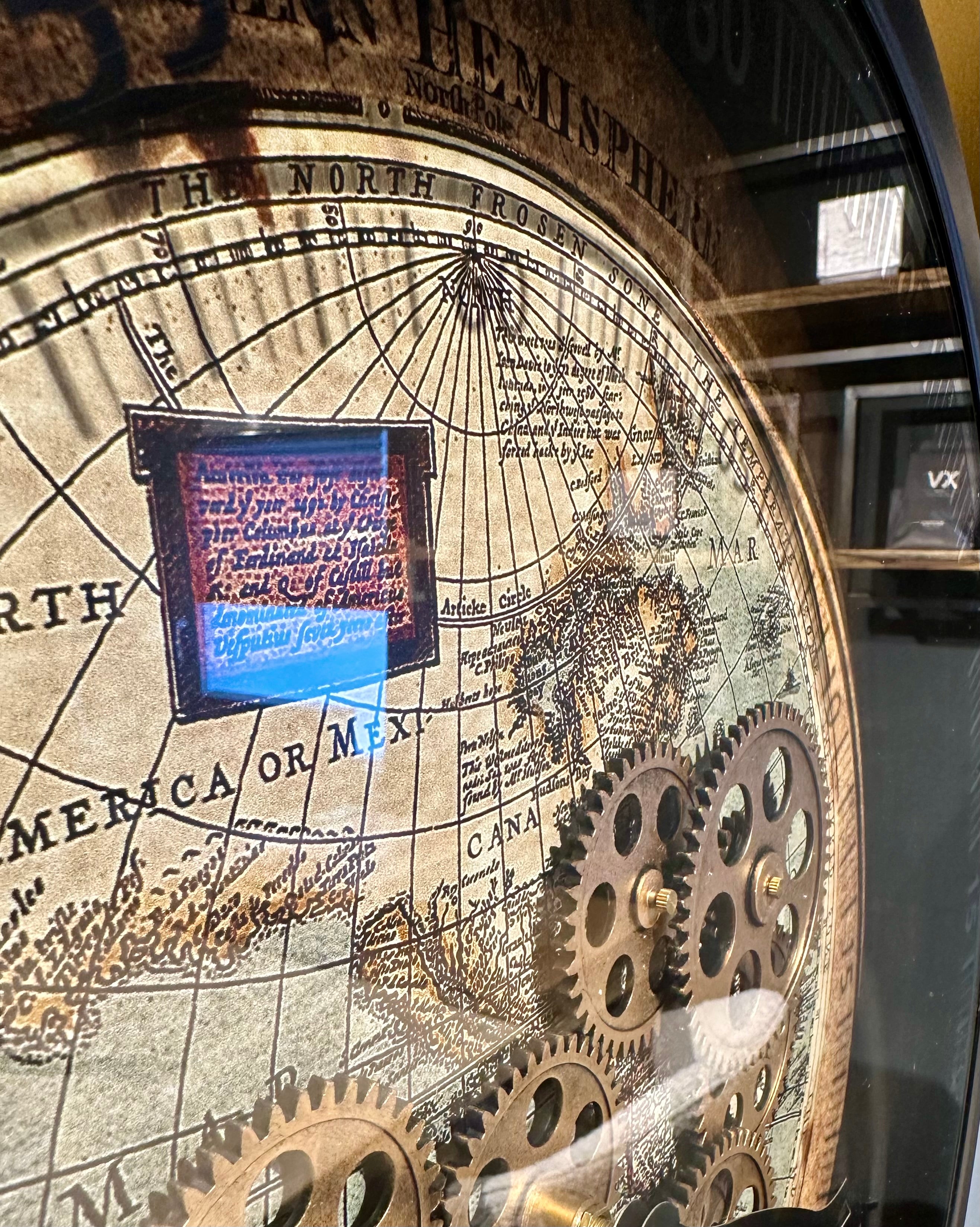 Die Uhr zeigt einen Globus und wirkt dadurch sehr interessant. Das Zifferblatt zeigt eine alte Landkarte vom Amerika im Zeitraum des Kontinent Entdeckers Magellan.