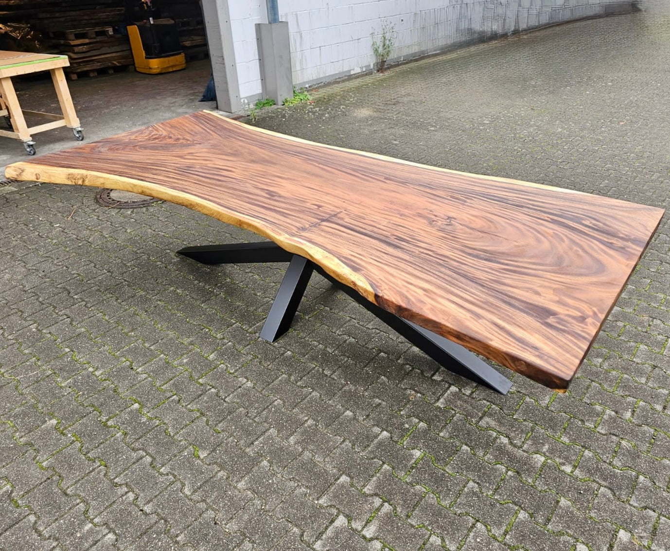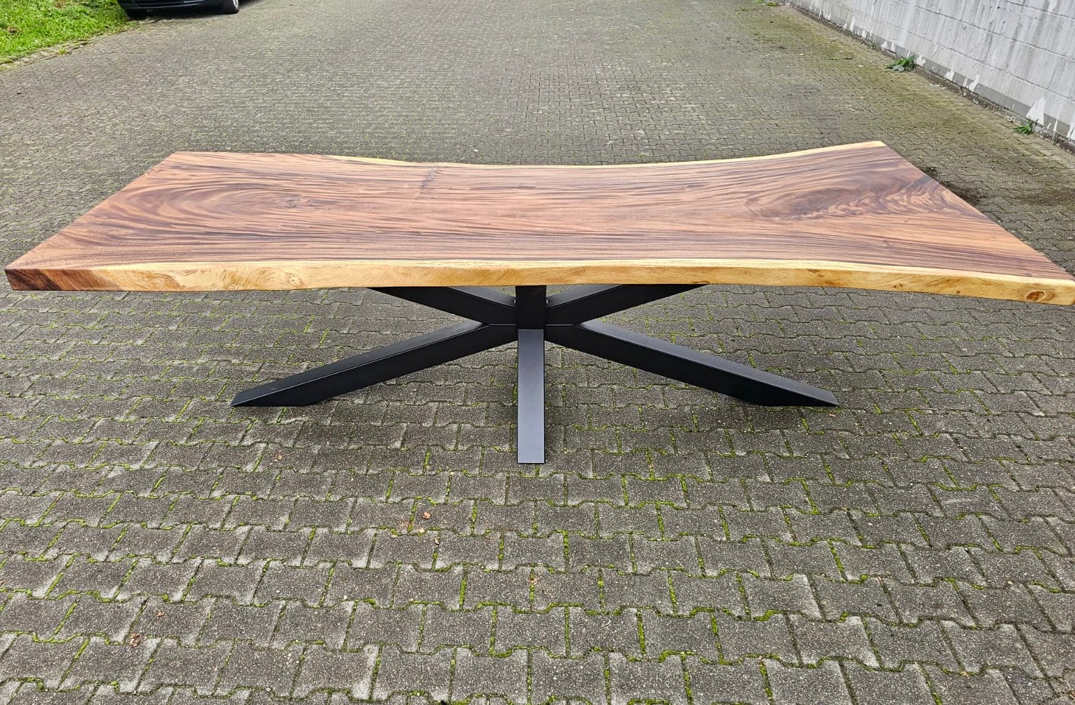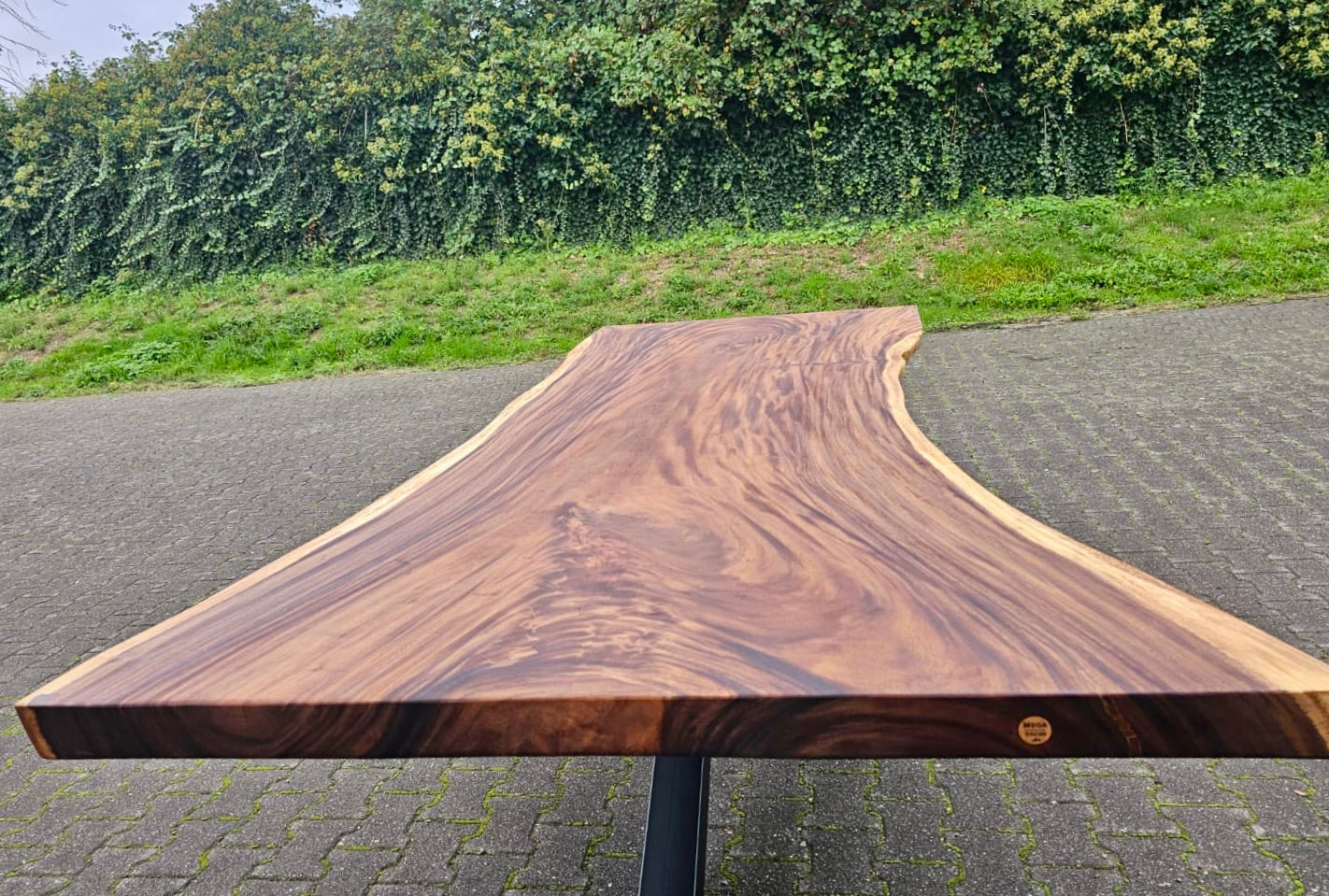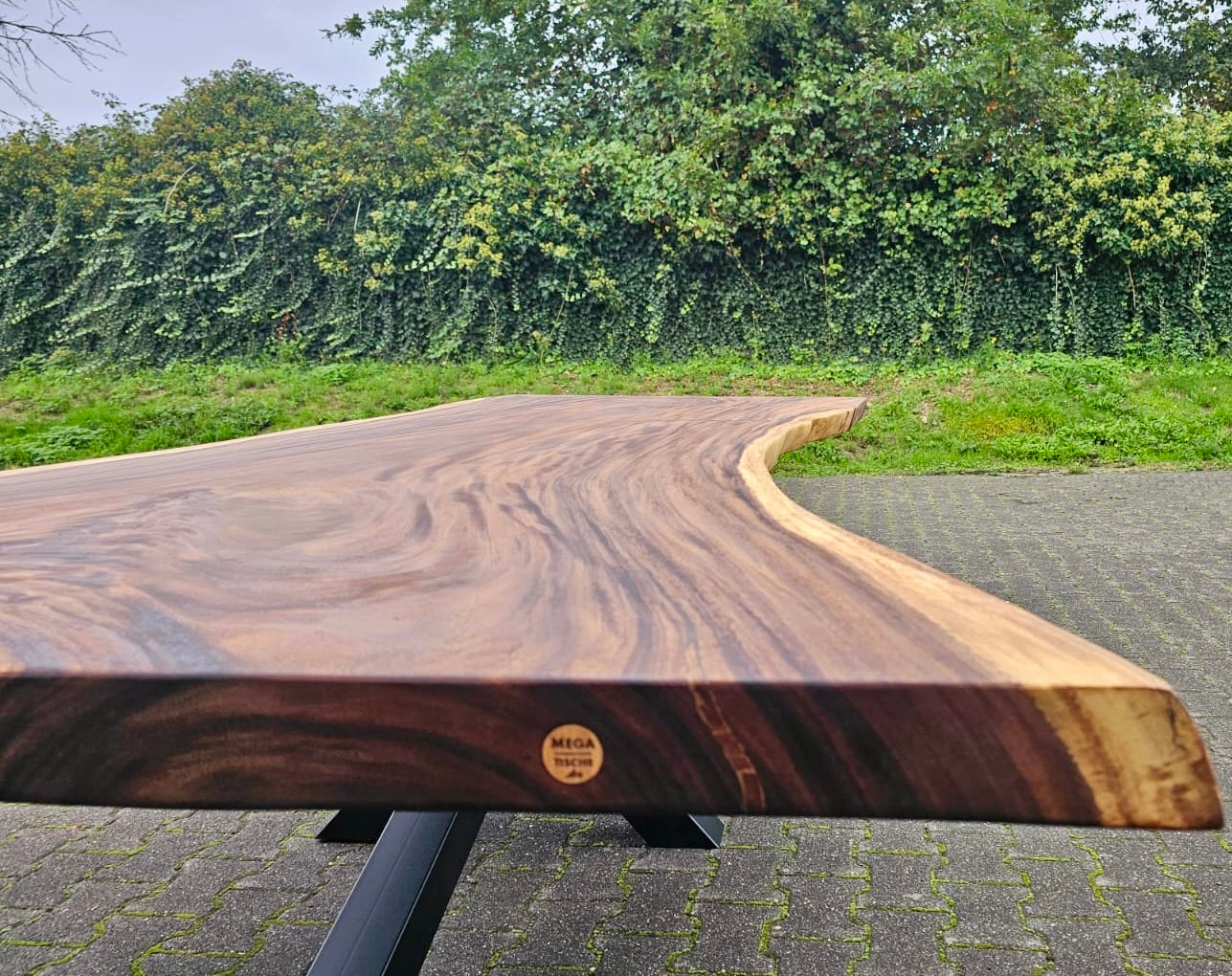 Dieser Mammuttisch aus Suarholz - ist aus massiven Echtholz gefertigt. Der Holztisch hat ein schwarzes und zentrales Spidergestell in 10x10cm Dicke. Die Tischoberfläche ist geölt und könnte gegen Mehrpreis noch zusätzlich lackiert werden. Die Baumstammplatte ist 7 cm stark und aus Vollholz.