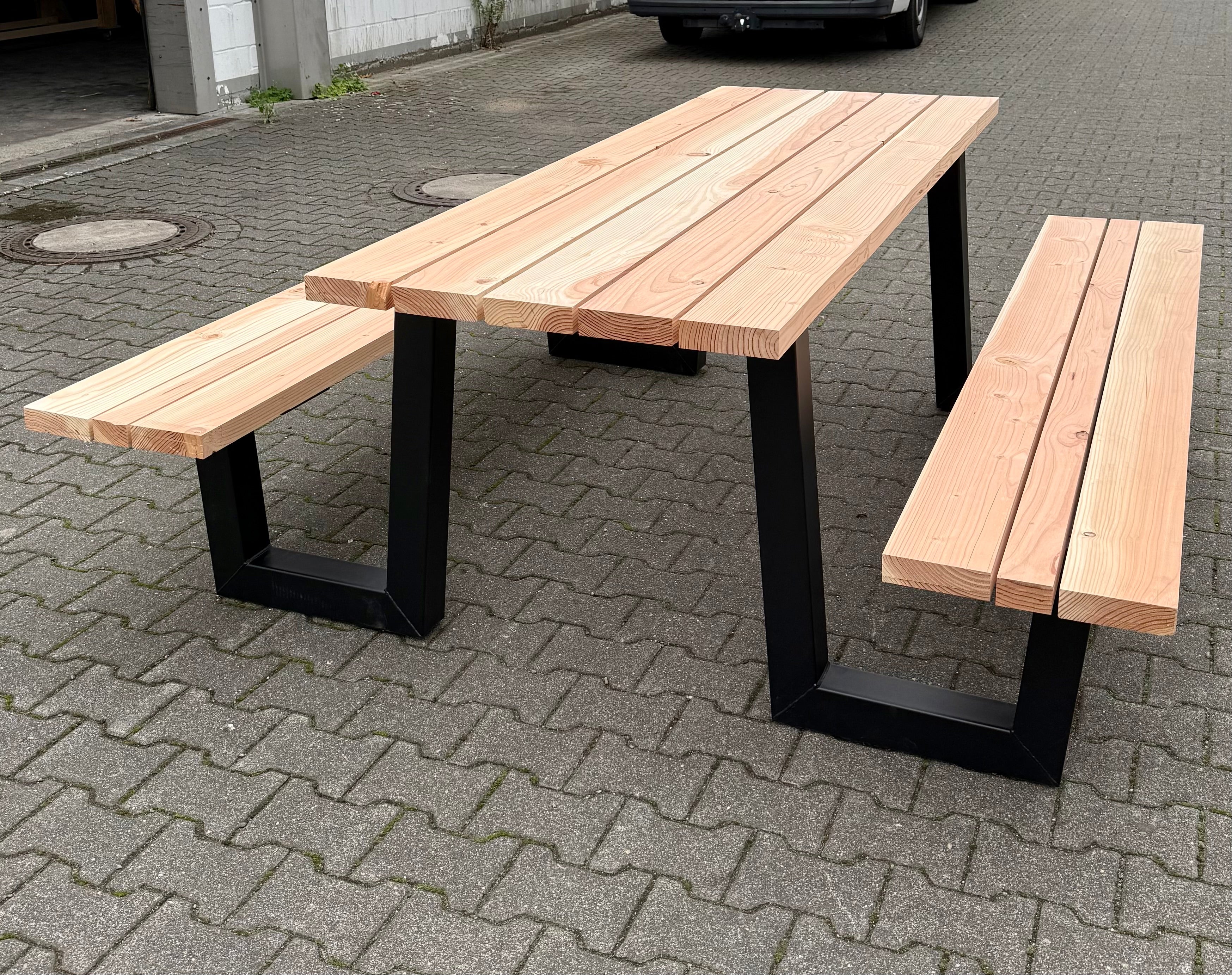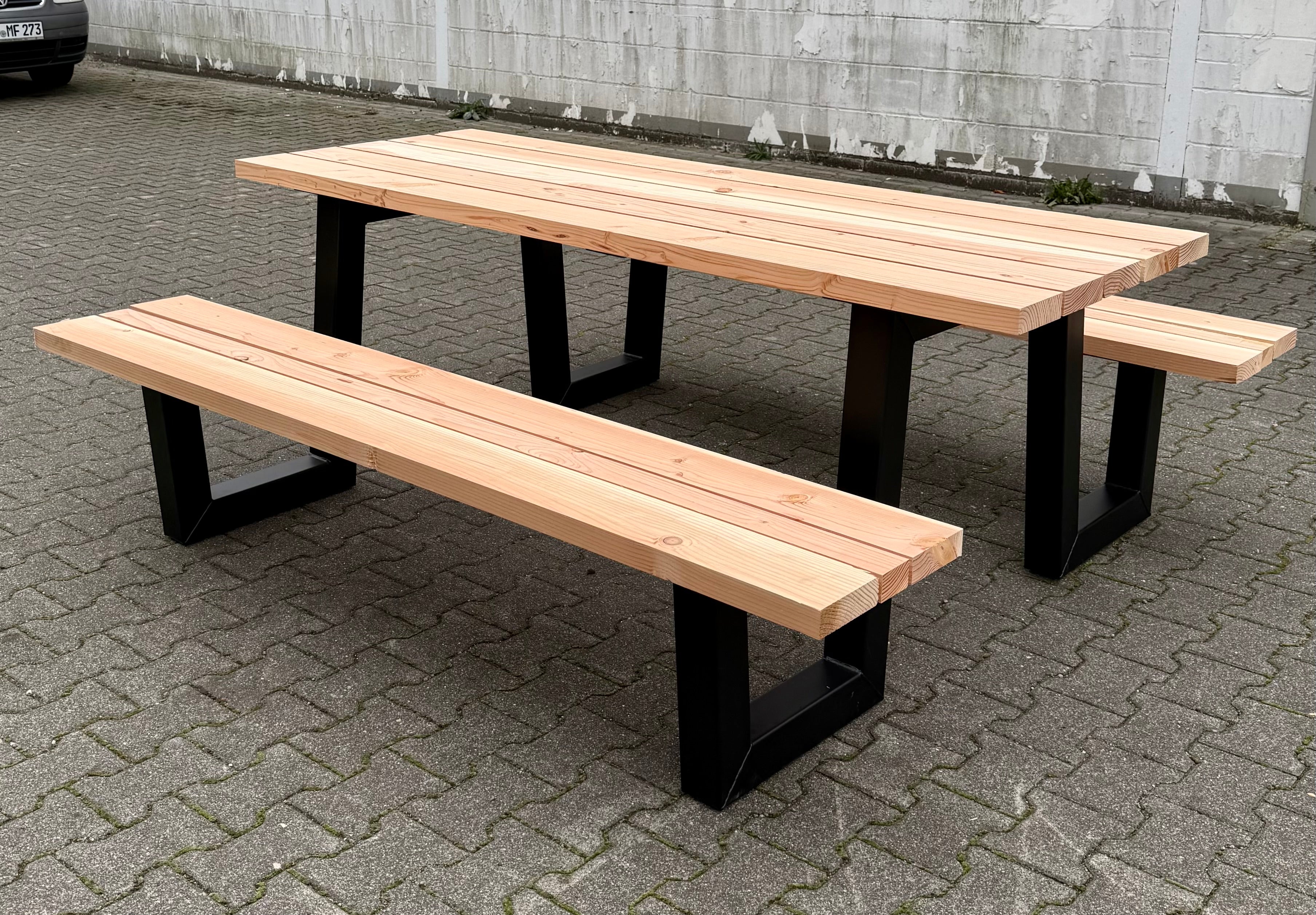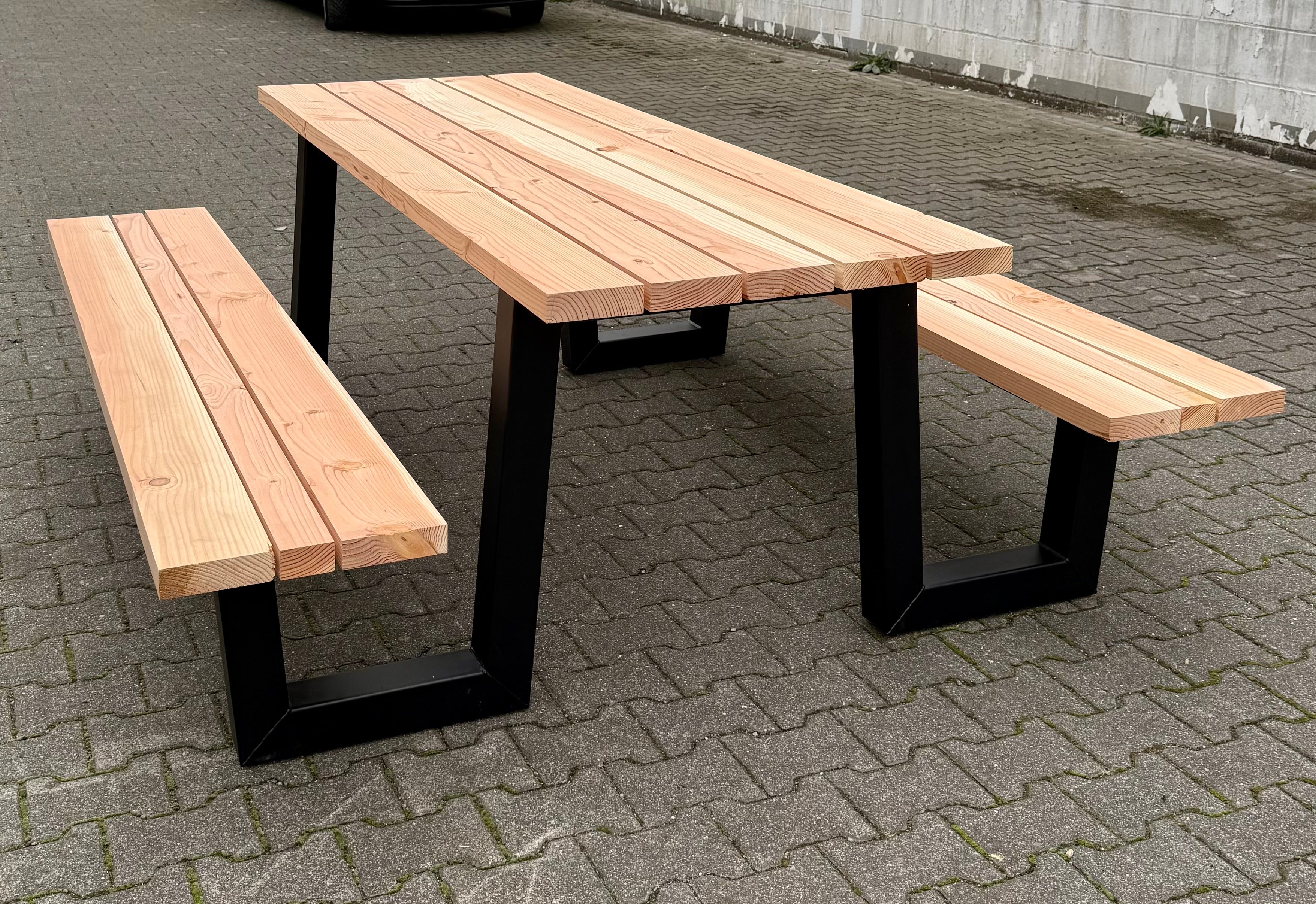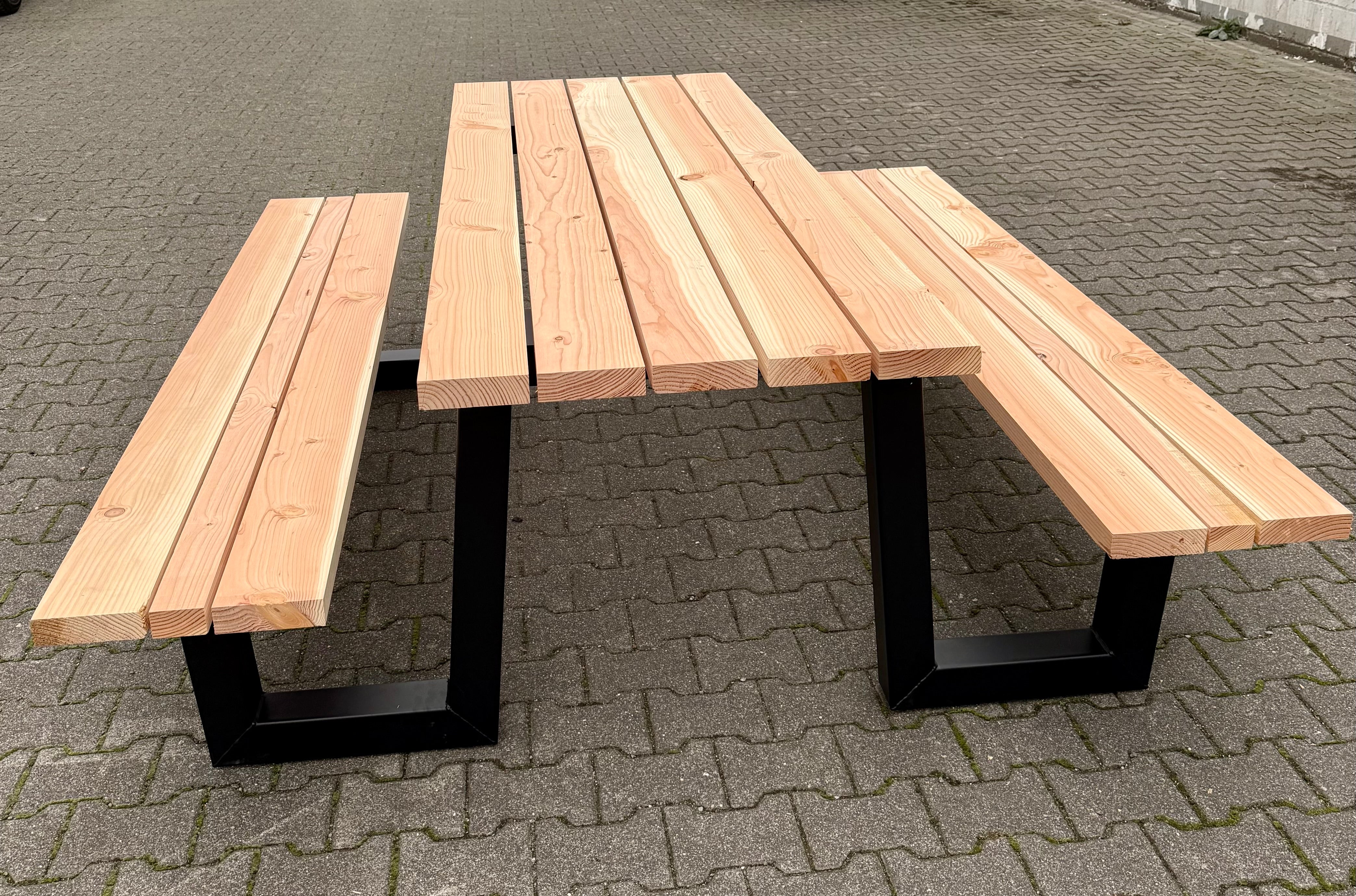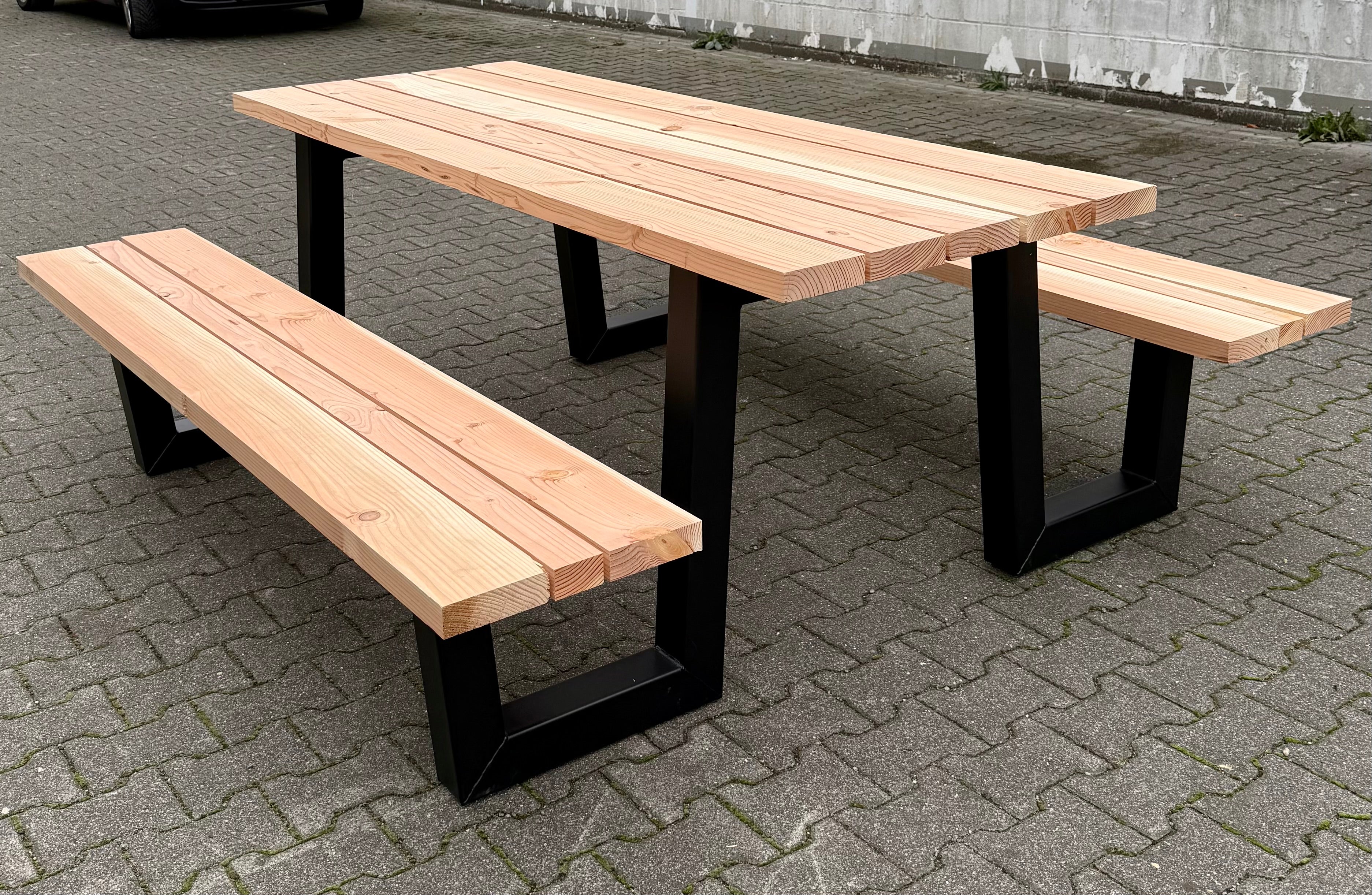 Dieser mega robuste und schöne W Gestell Set Picknick Gartentisch besteht aus 2 Metall Tischbeinen schwarz, pulverbeschichtet & verzinkt, einer Douglasie Holztischplatte und zwei Bankplatten.