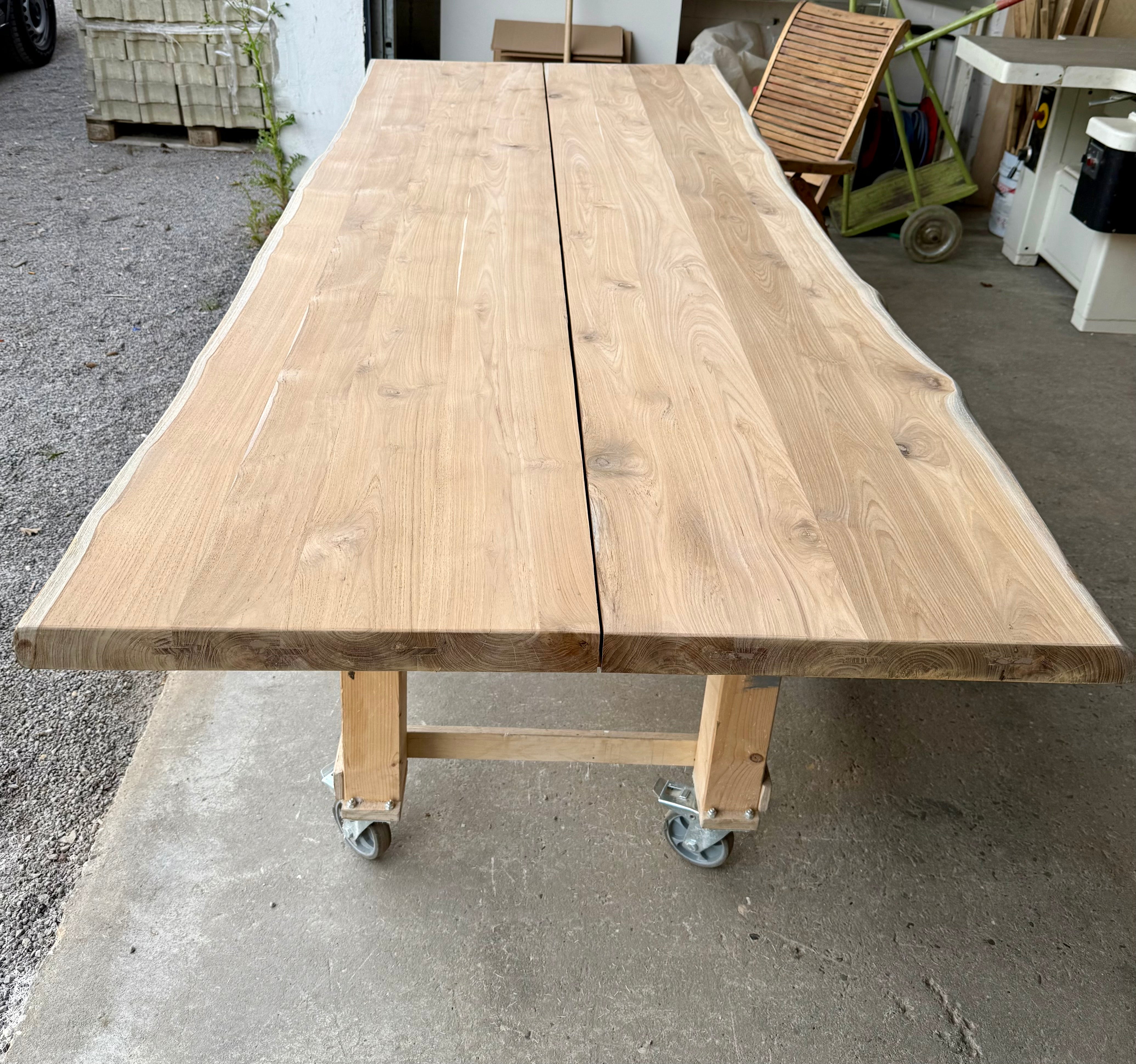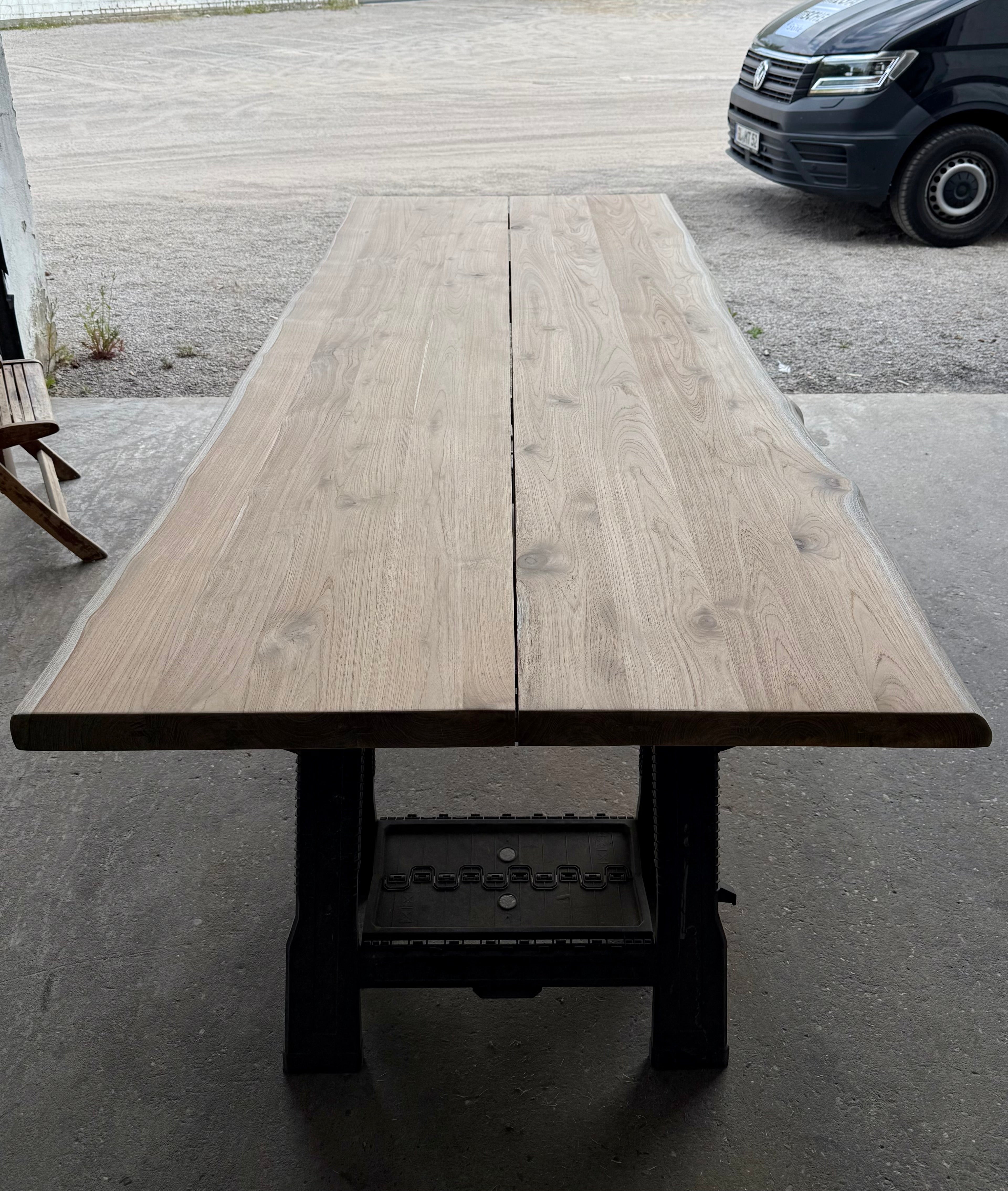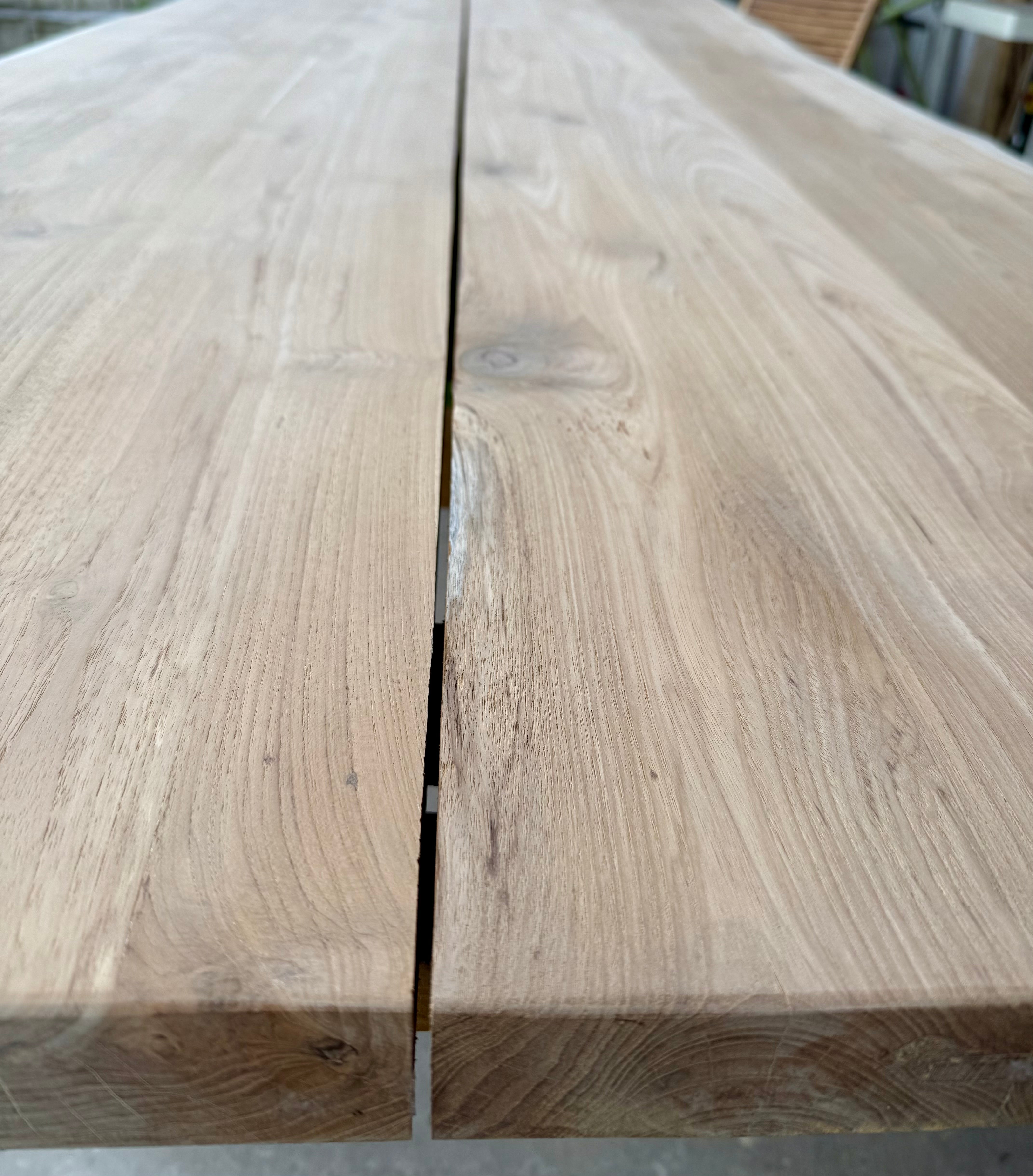 Jede dieser Holztischplatten ist ein Unikat und wird aus nur zwei verbundenen Bohlen zum Gartentisch verarbeitet!