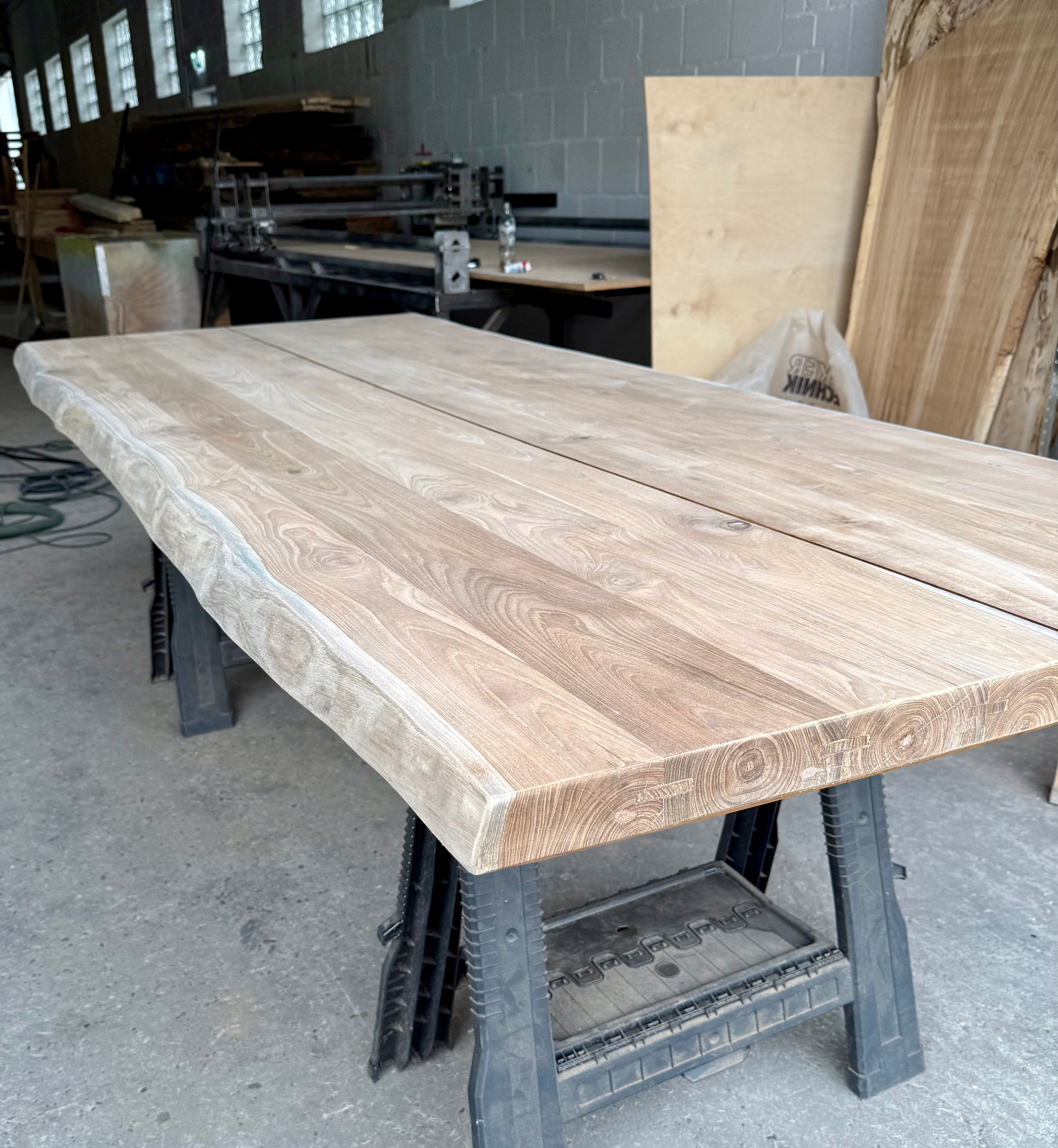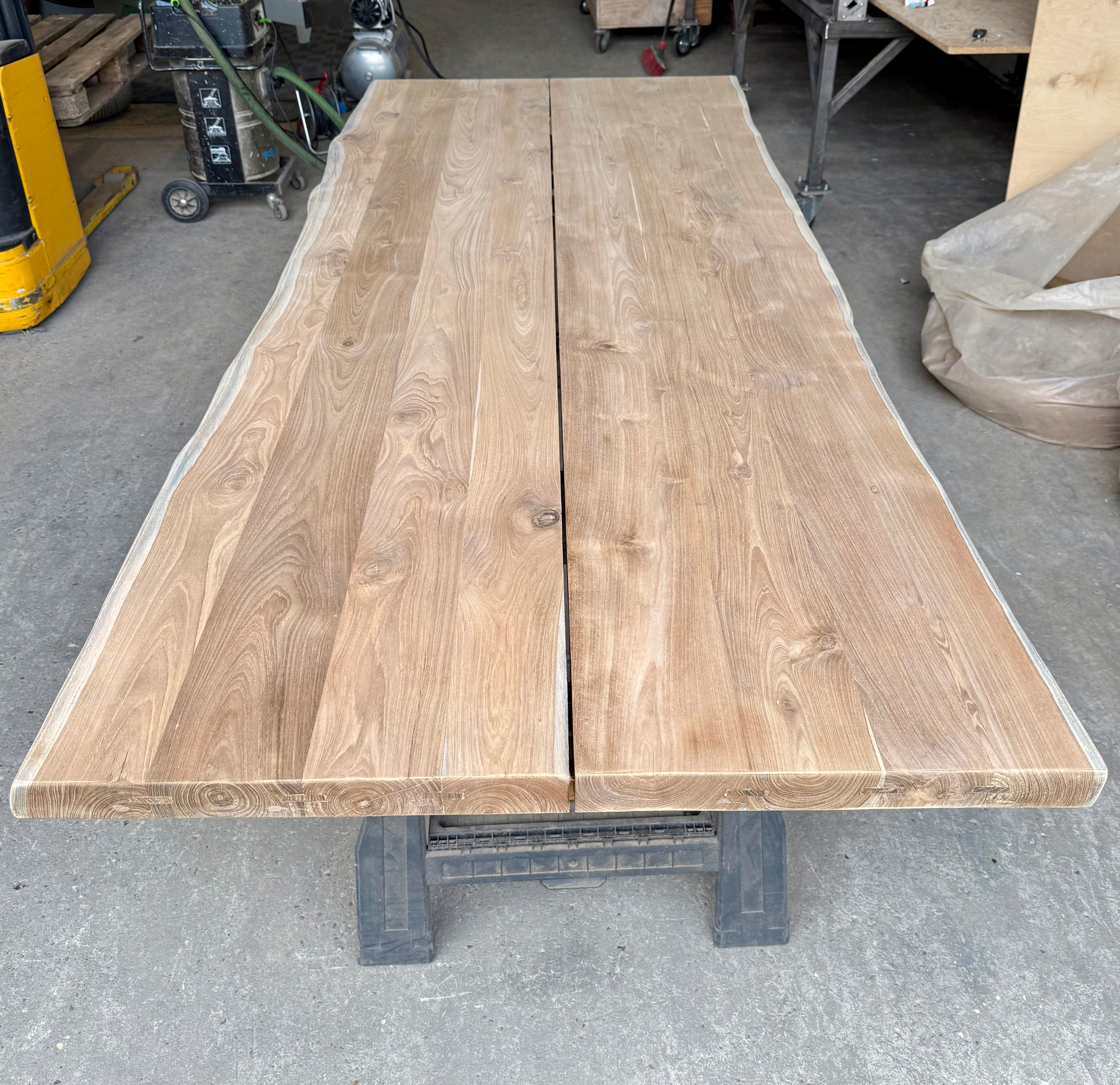Eine mega schöne Tischplatte aus recyceltem Teakholz ( Ursprung Indonesien) unbehandelt mit Baumkante 5 cm dick, vollmassiv und nur mit einer Entlastungsfuge (selten).