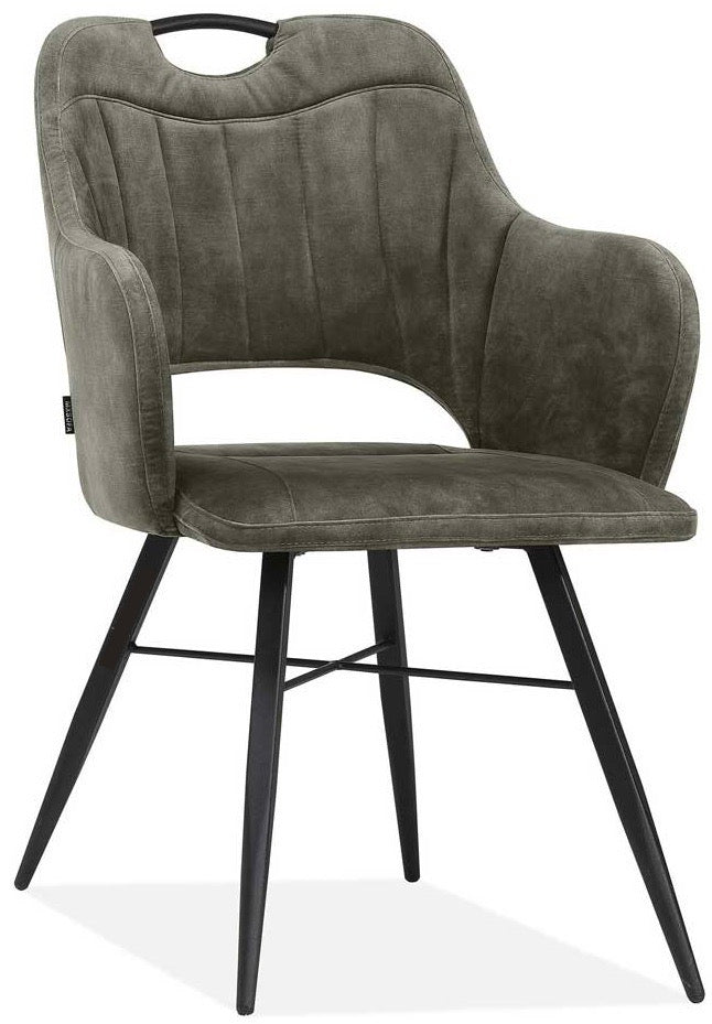 Er hat bezogene Armlehnen und einen Metallgriff an der Rückenlehne.