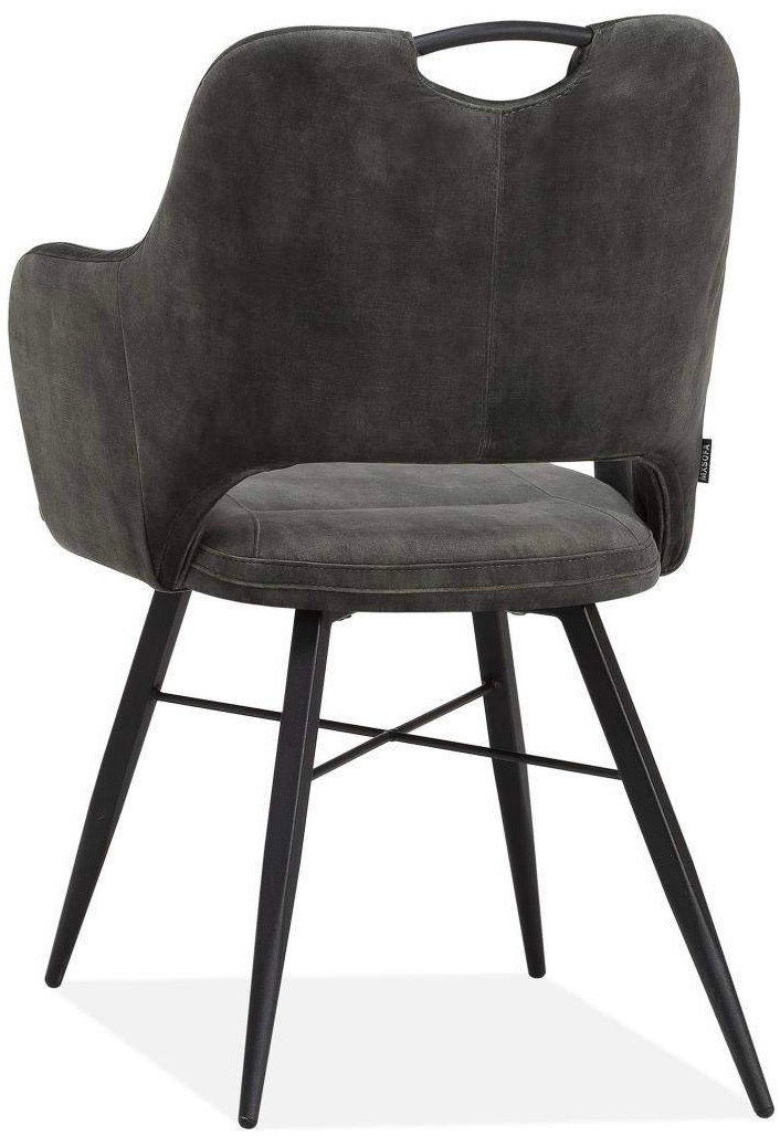 Am schwarz pulverbeschichteten Gestell hat der Esszimmerstuhl Verstrebungen. Längeres Sitzen gestaltet sich problemlos und auch der ausreichende Platz auf ihm unterstreicht den Sitzkmofort.