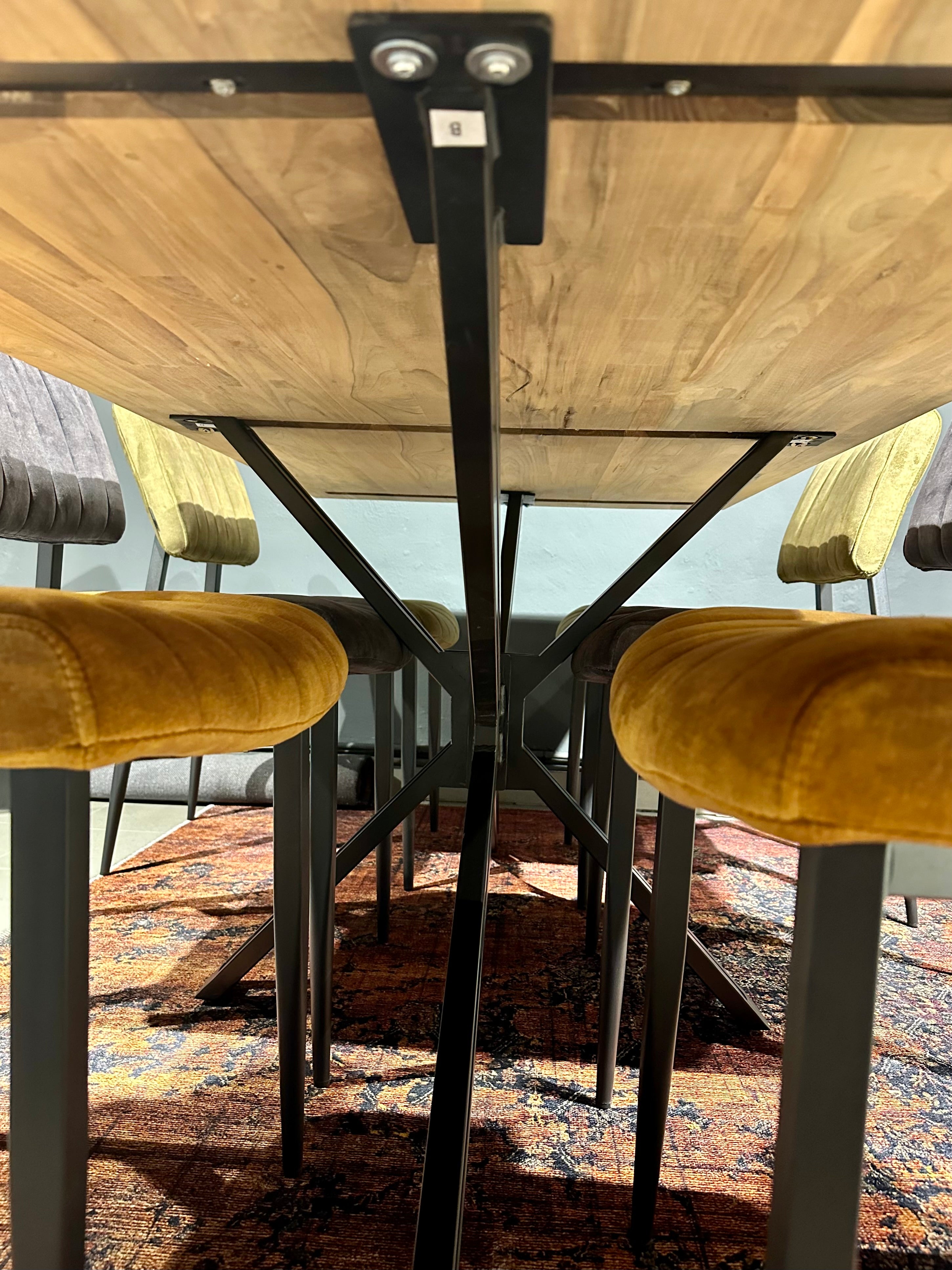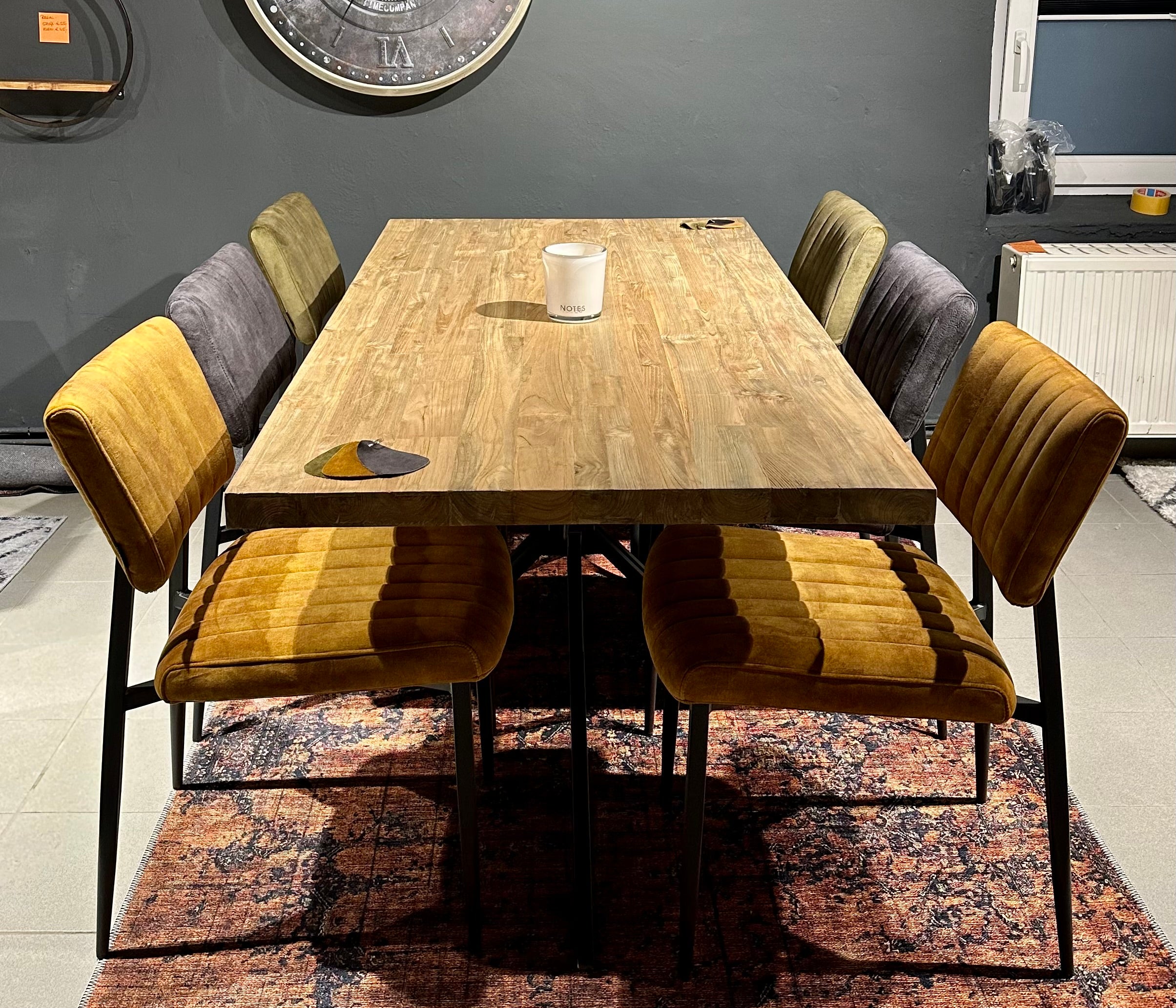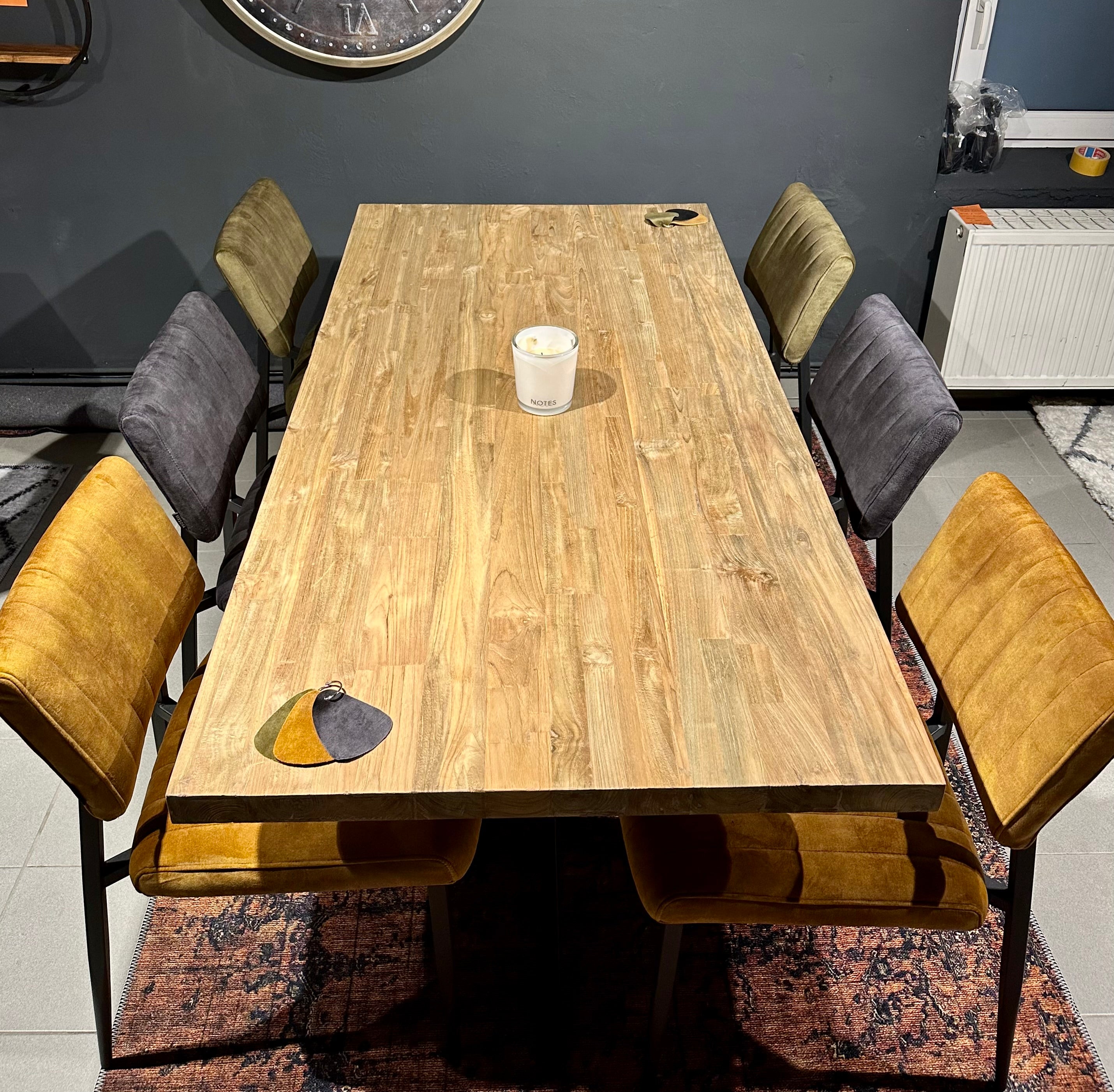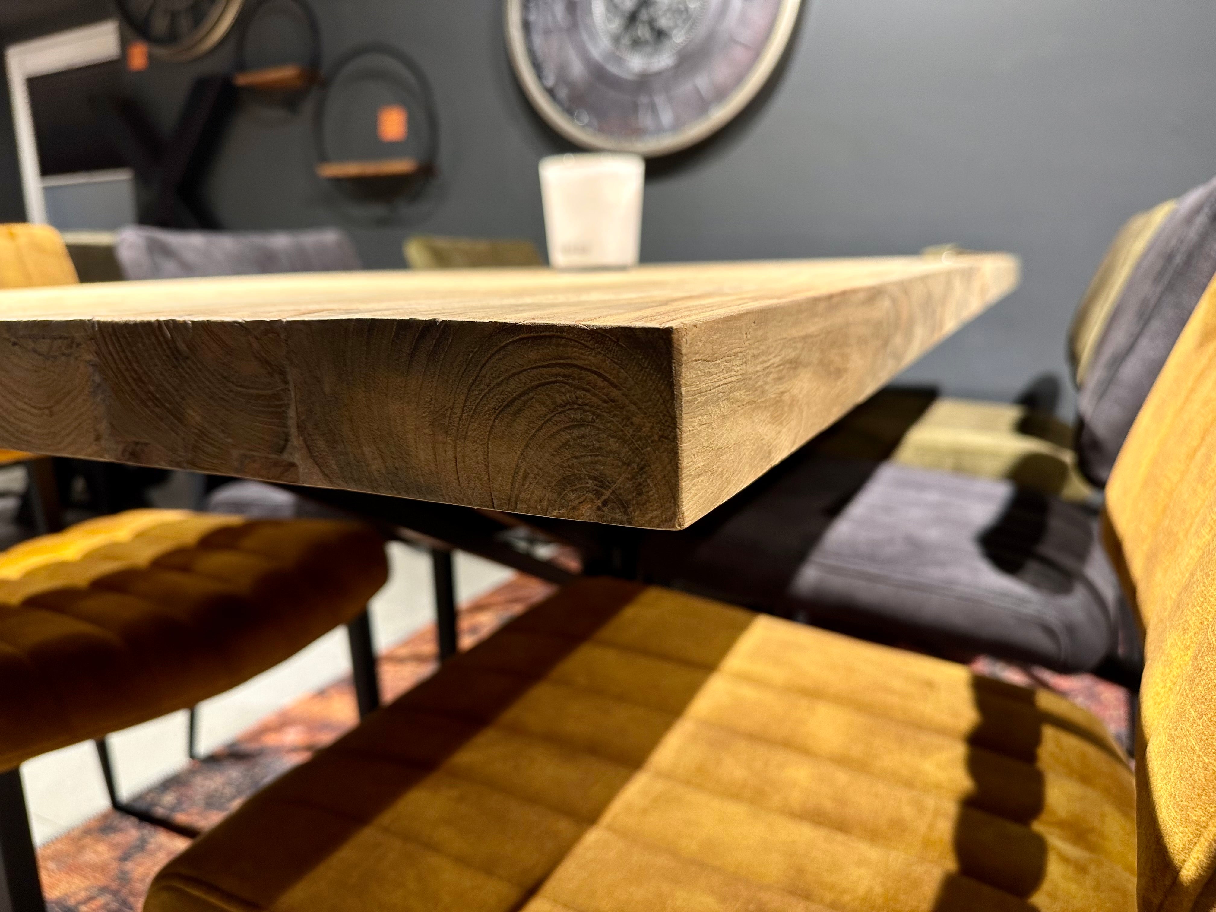 Die Massivholzplatte ist aus 5 cm Teak Holz und mit einer geradlinigen Kante versehen.