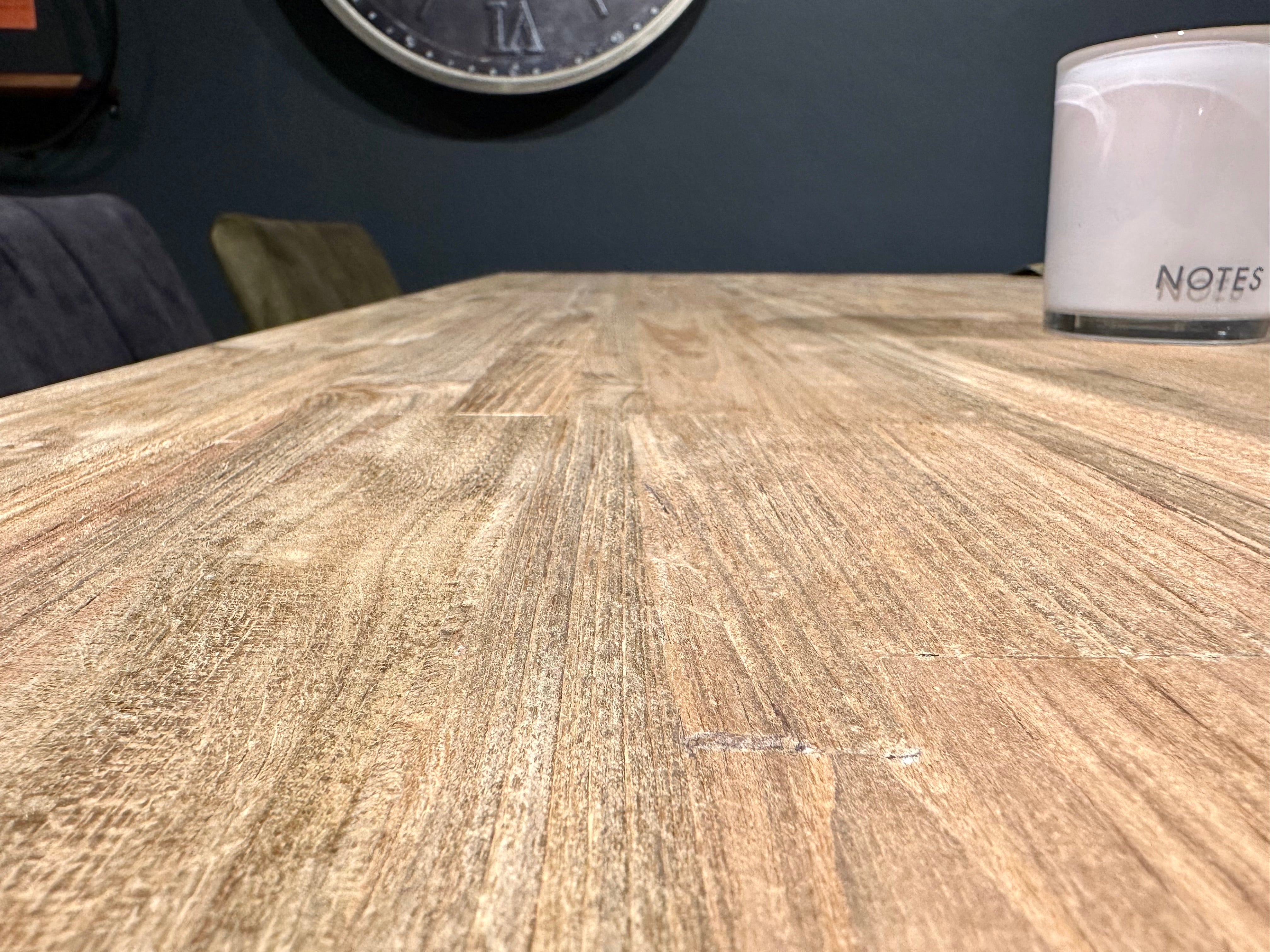 Die Tischplattenoberfläche ist glatt und leicht gebürstet. Die Tischplatte ist unbehandelt und kann mit Teakfix, Öl oder Wachs versiegelt werden.