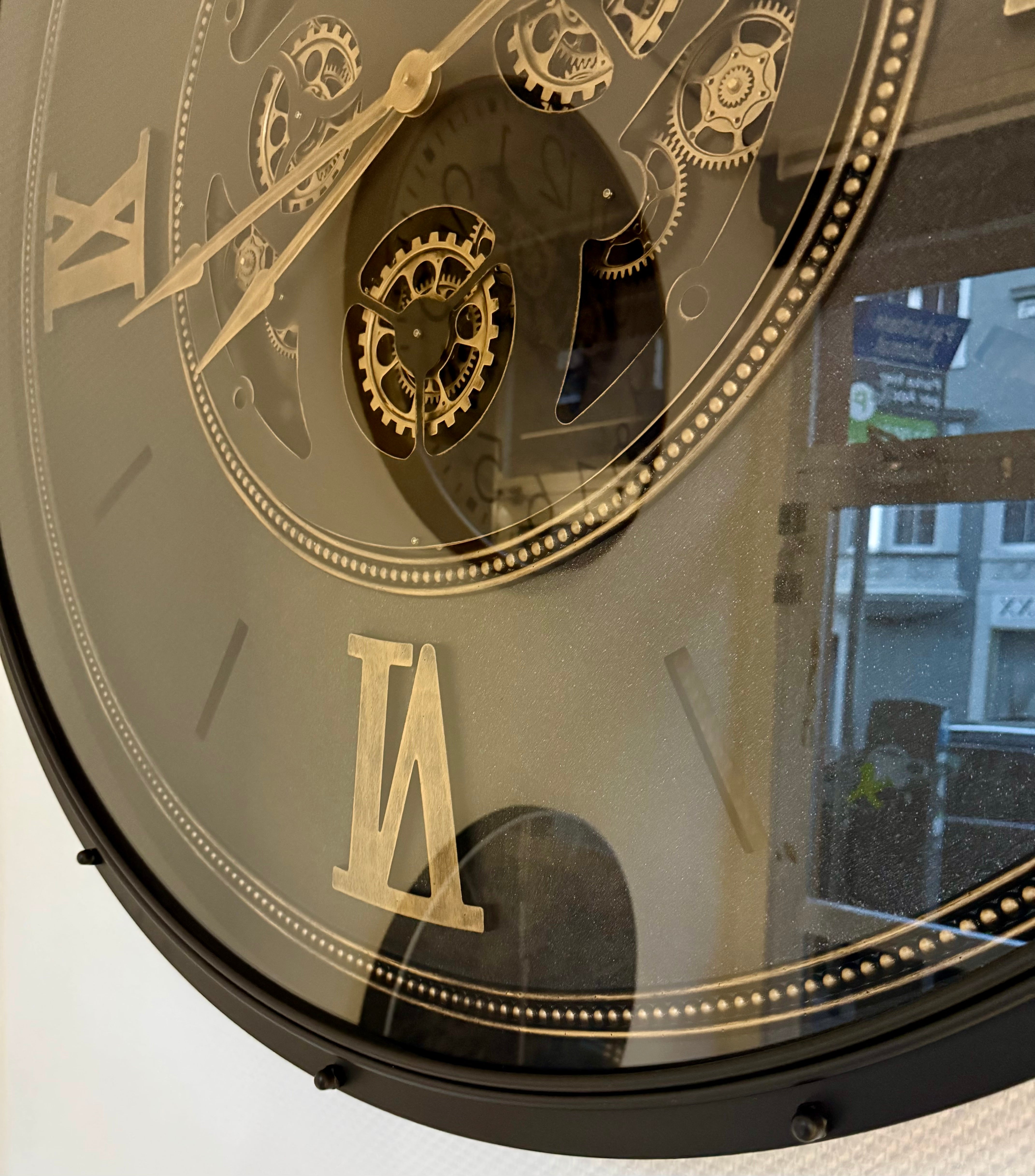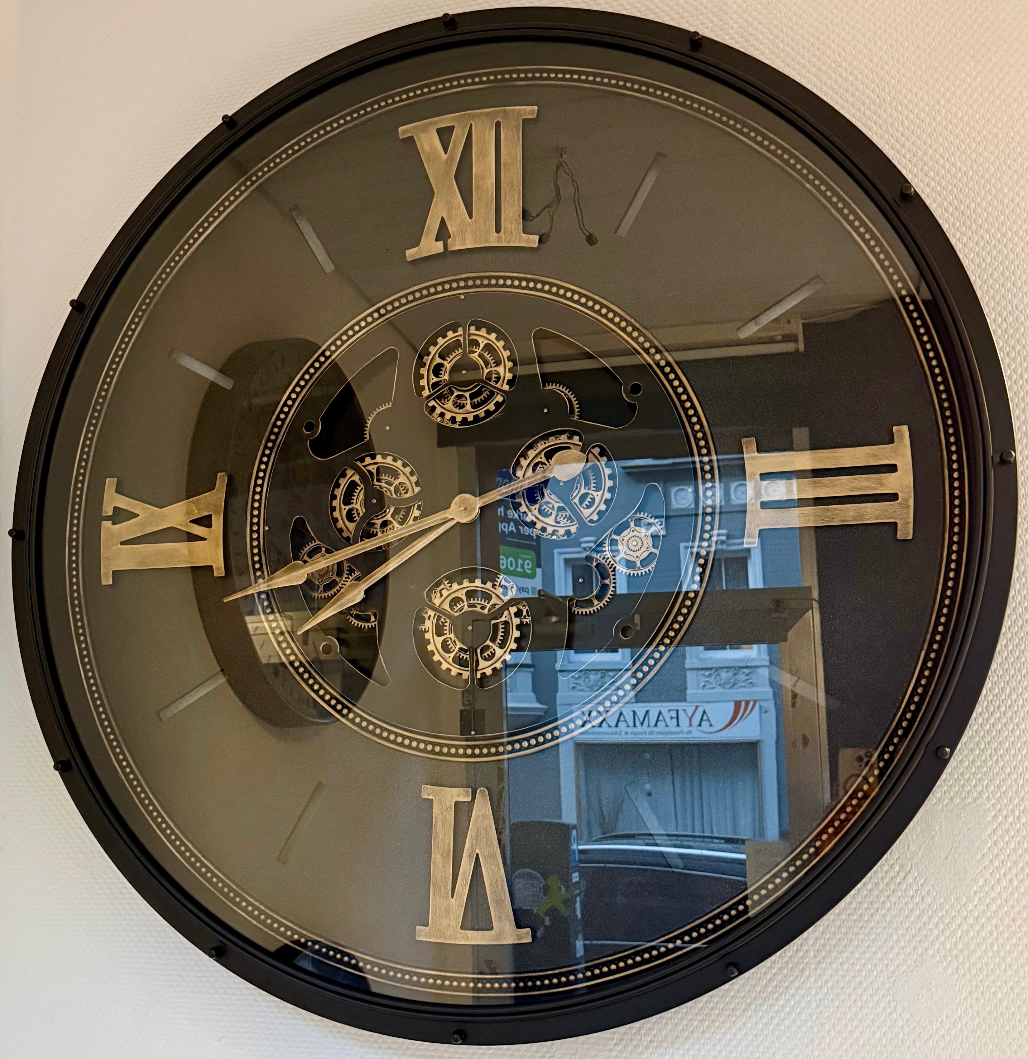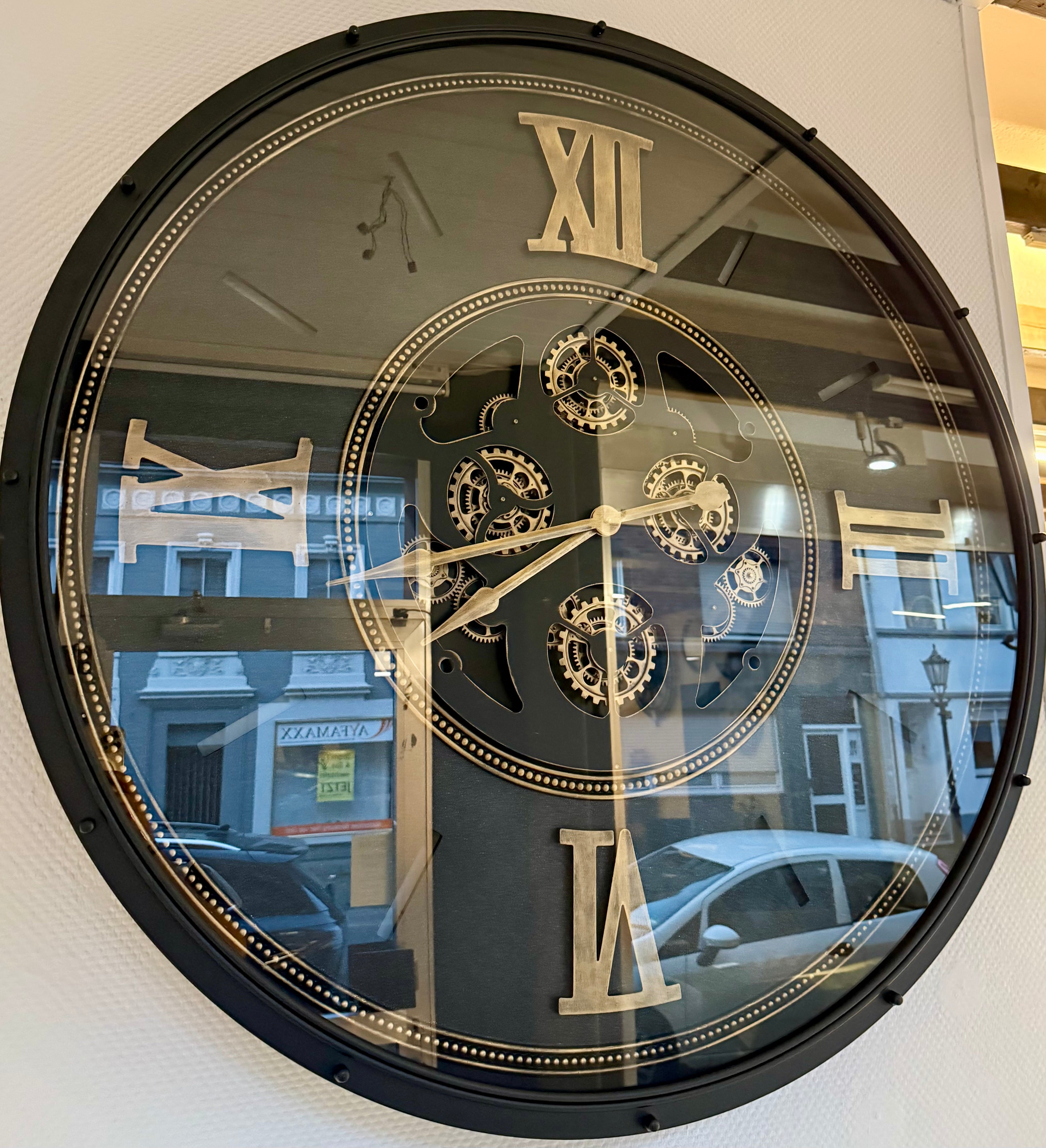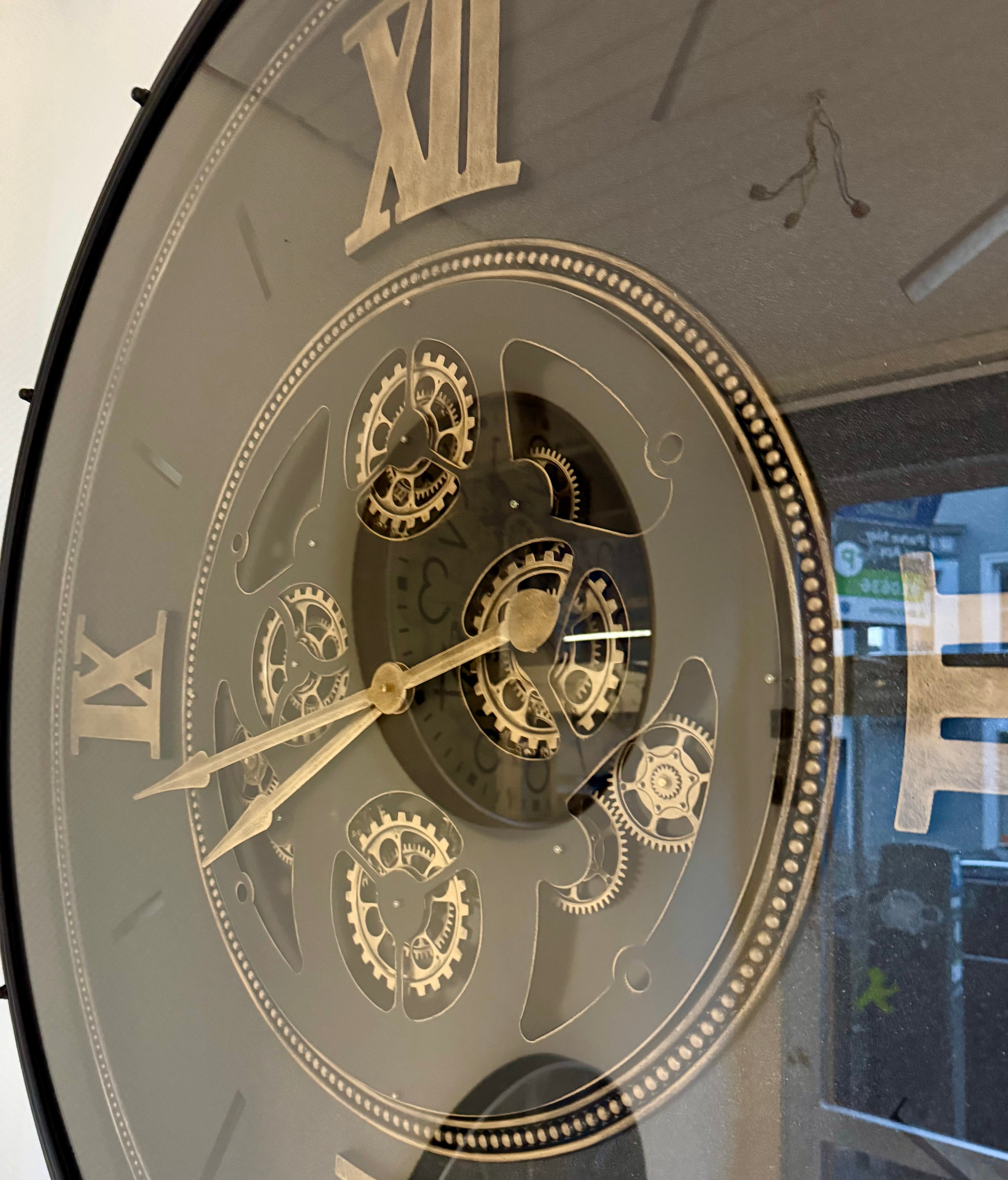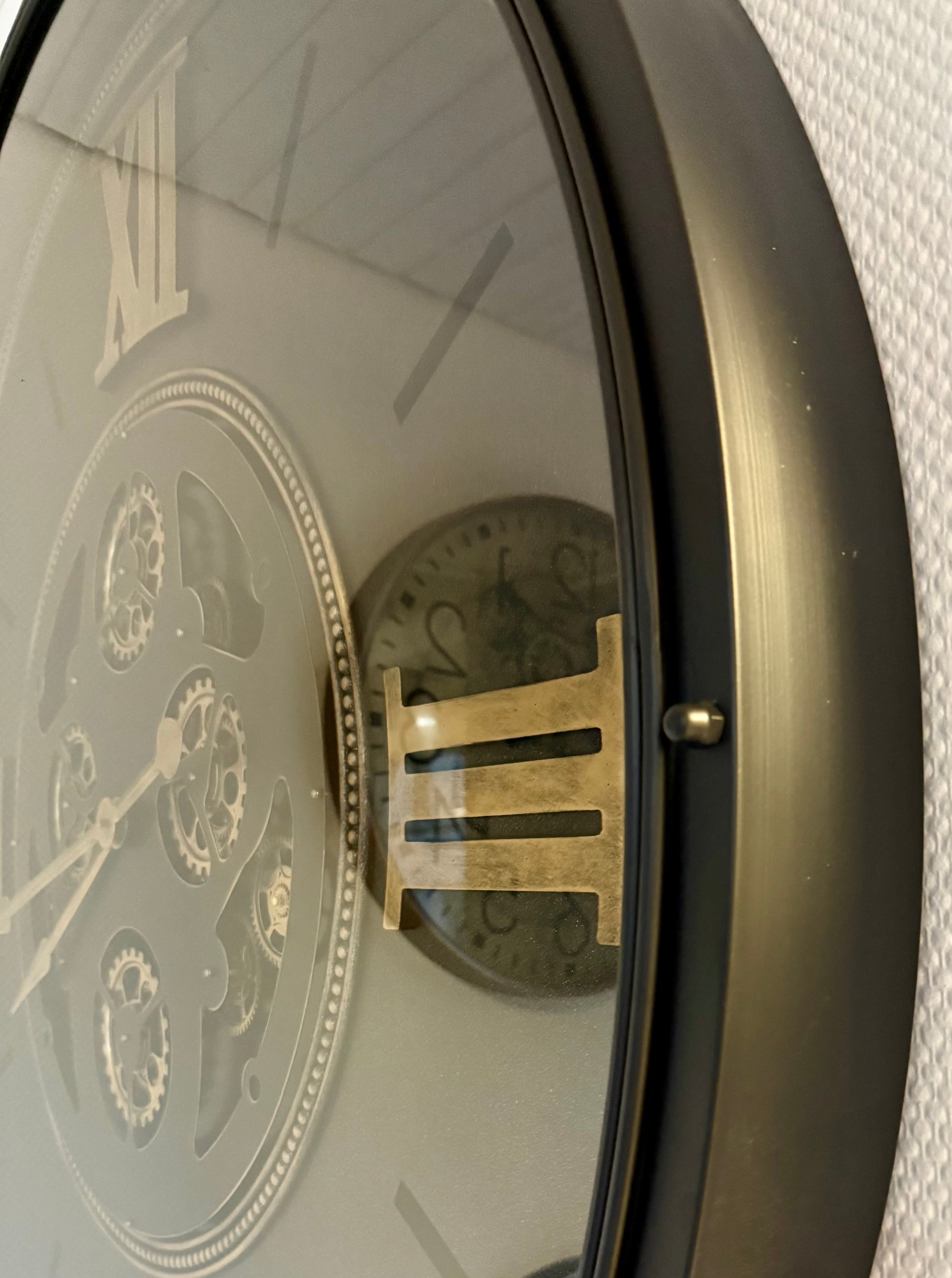 Das Zahradwerk, der sich bewegenden Wanduhr, ist schwarz und goldfarbig im Metallic Lack. Diese wunderschöne und industrielle Wanduhr ist eine der größten und wird per Spedition geliefert.