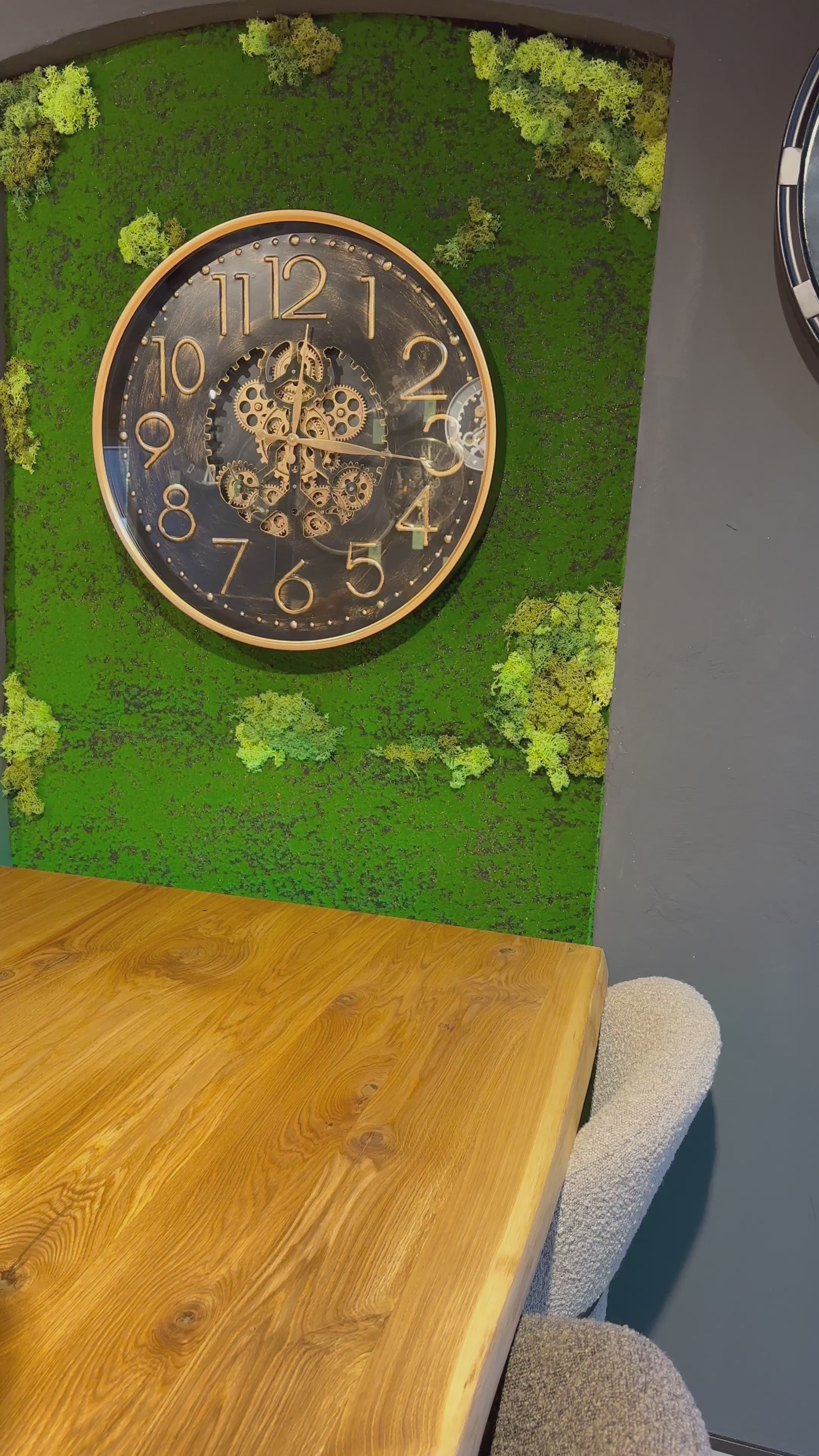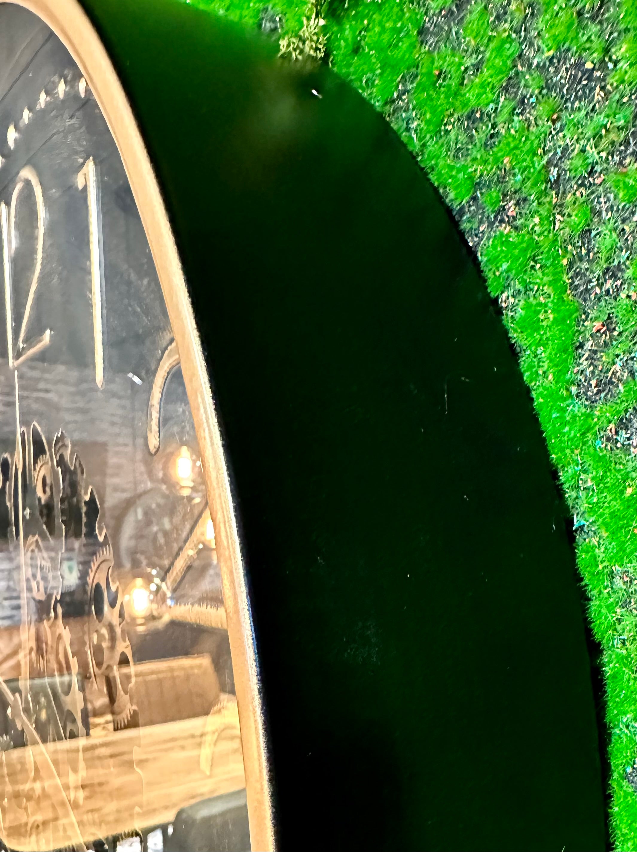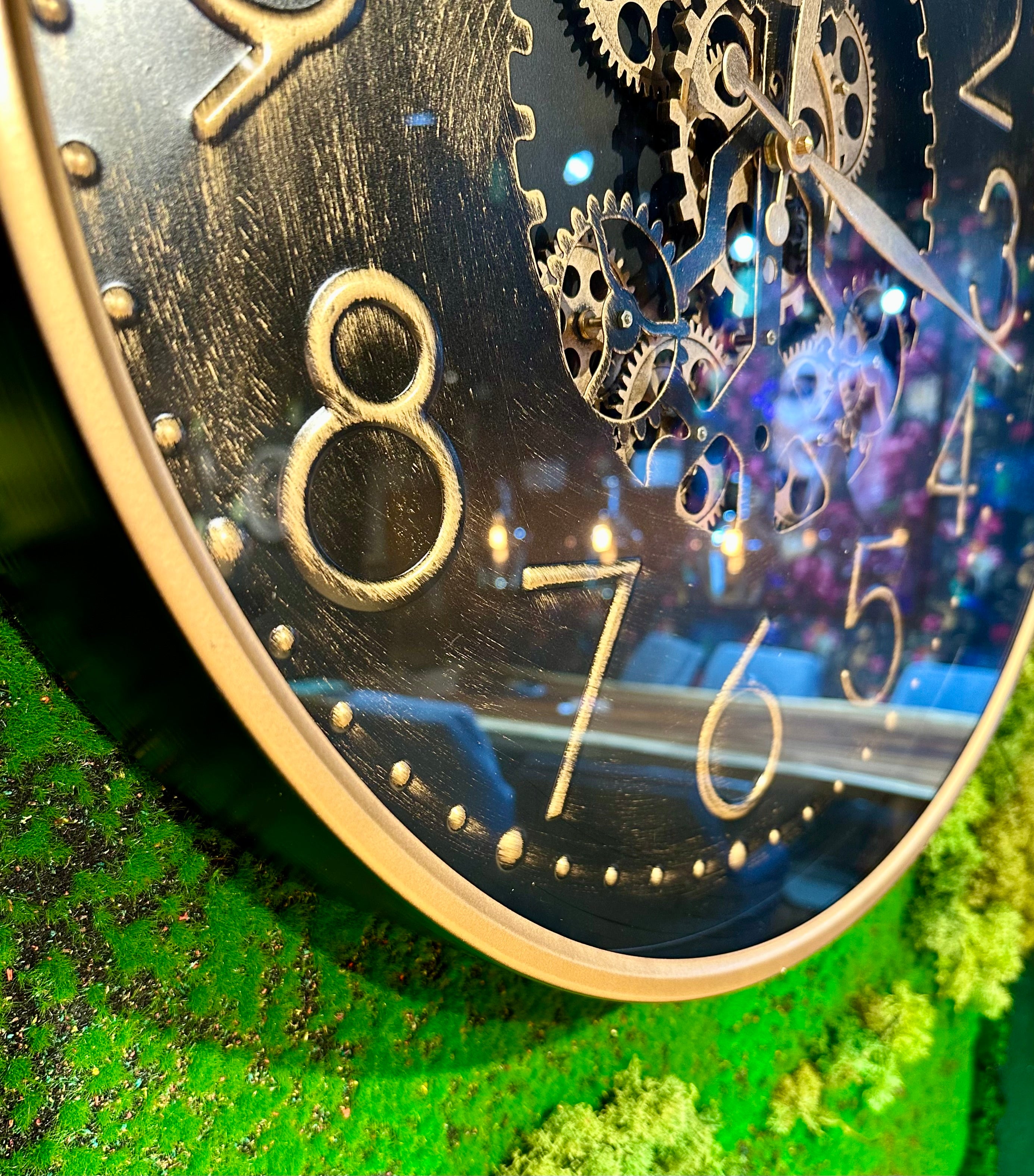 Die Annimationsuhr mit Zahnrädern hat eine Glasscheibe und ein Zifferblatt mit arabischen Zahlen in goldener Farbe Sie ist sehr schön und passt in Wohnräume, die entweder modernen oder mit naturfarbigen Holzmöbeln bestückt ist.