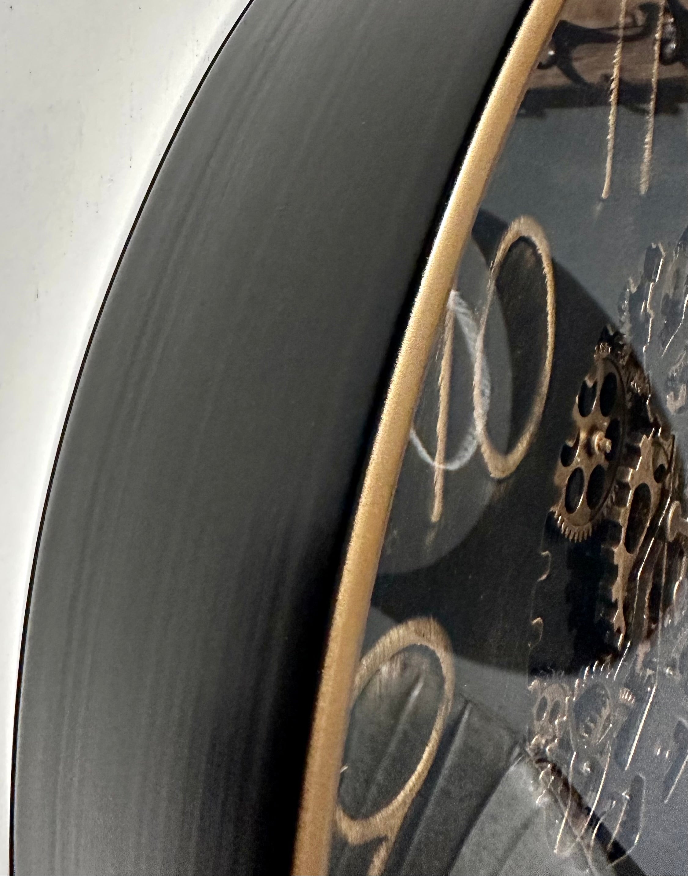 Das Zahradwerk, der sich bewegenden Wanduhr, ist altgold-braunfarbig im metallic Lack.