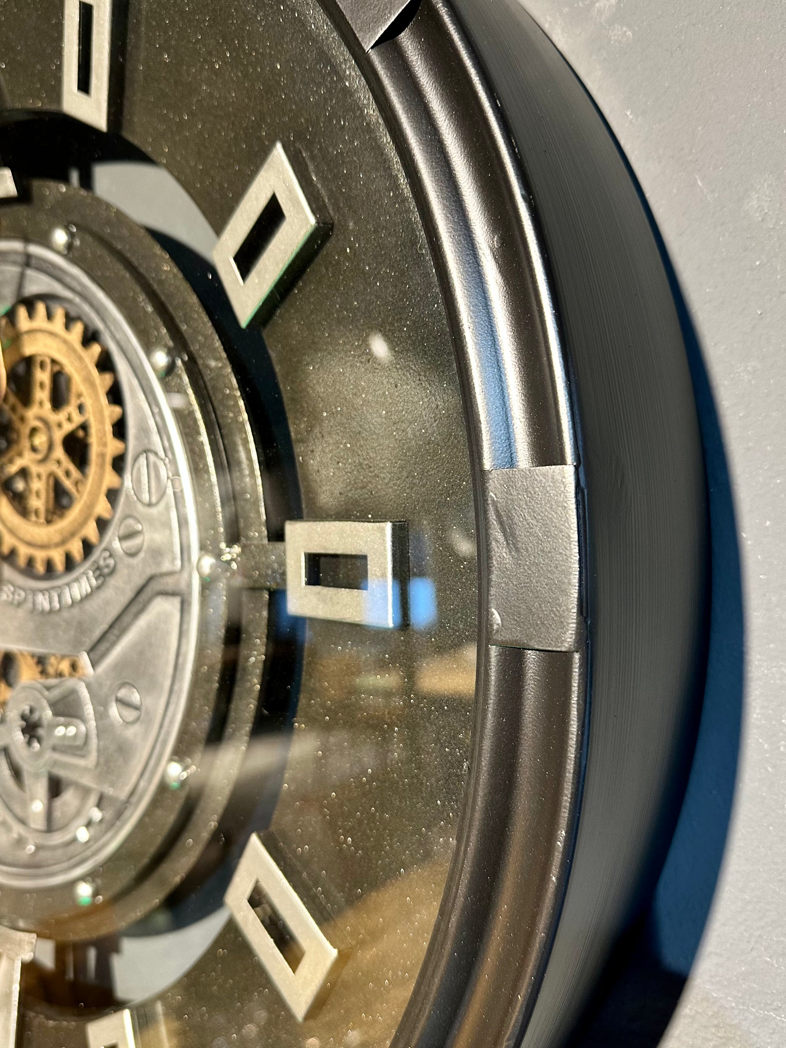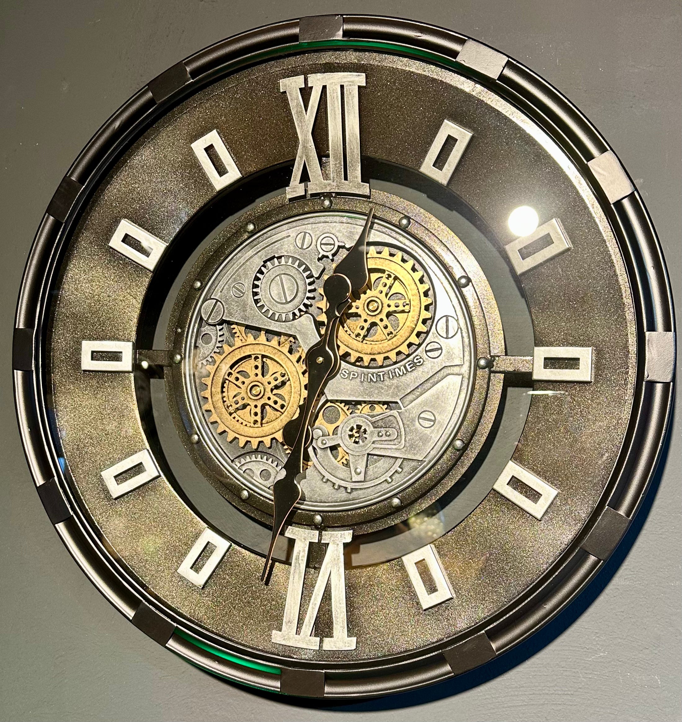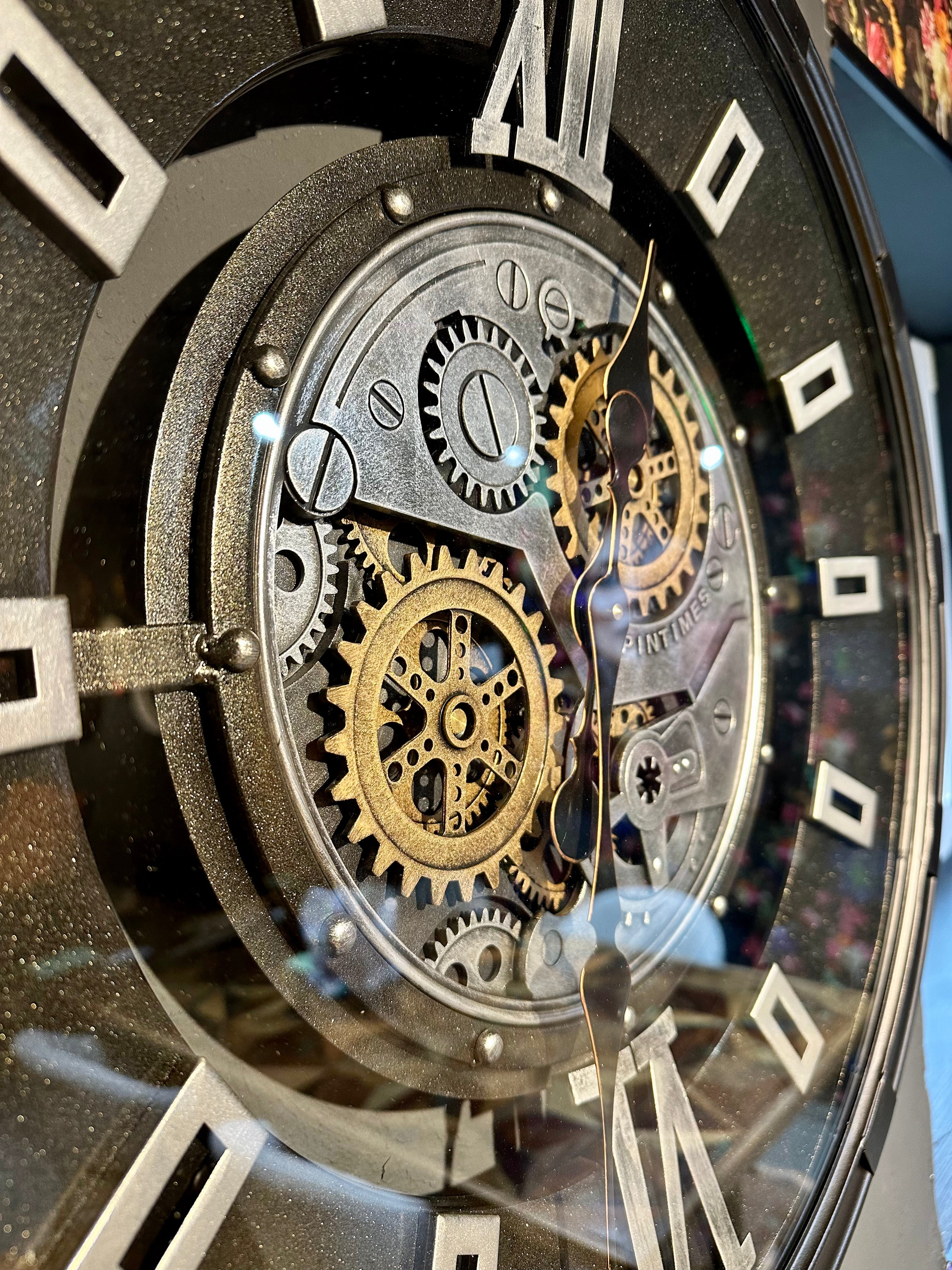 Die Annimationsuhr mit Zahnrädern hat eine Glasscheibe und ein Zifferblatt mit zwei römischen Zahlen - ansonsten sind Rechtecke angebracht. Sie ist sehr schön und passt in eine Umgebung, die im Industrielook gestaltet ist, jedoch passt Sie bedingt auch in ein modernes Zimmer/ Wohnung oder Haus.