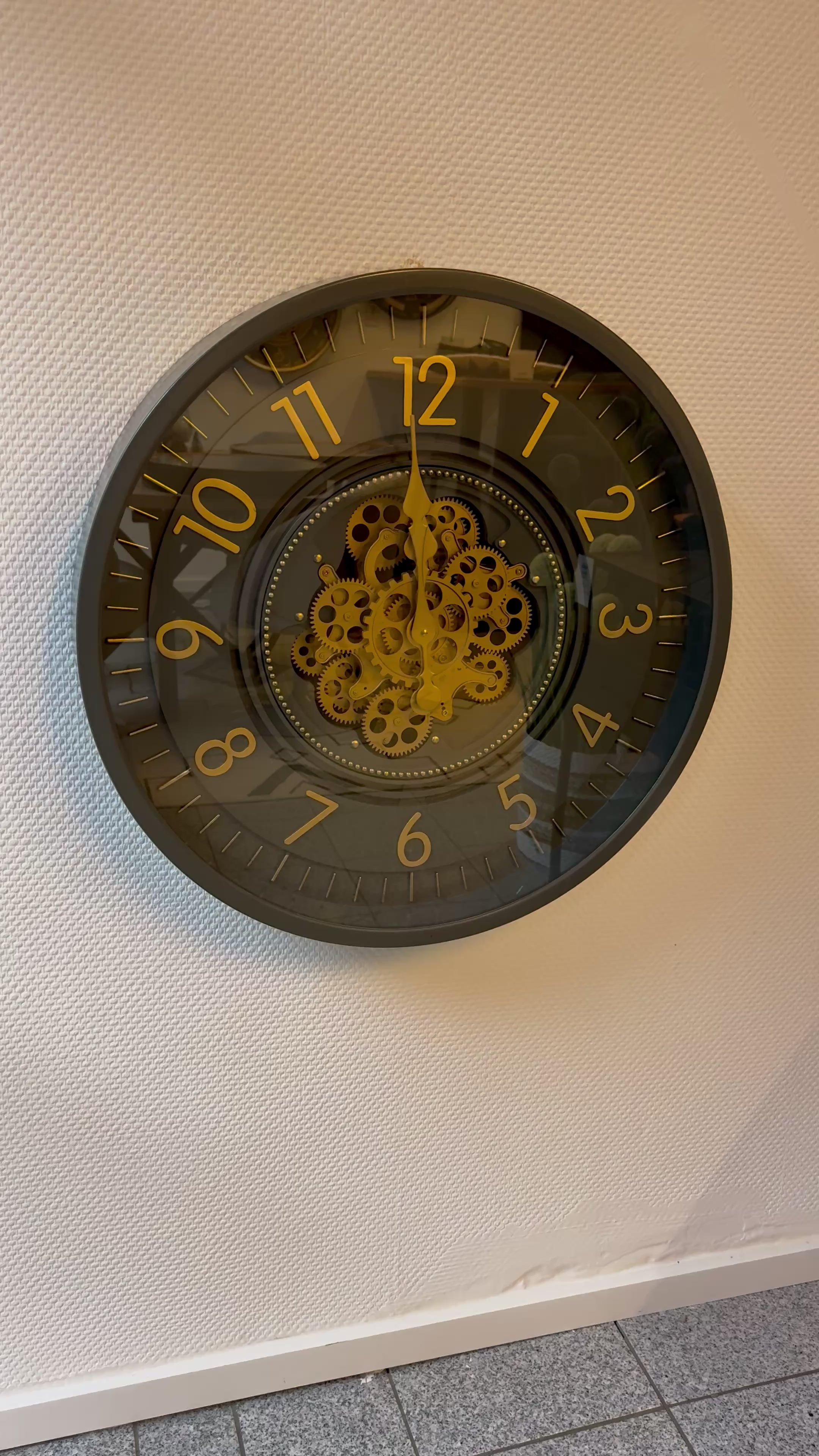 Die Wand-Uhr ist in der Farbe anthrazit-grau und antikgold gehalten und aus Metall.