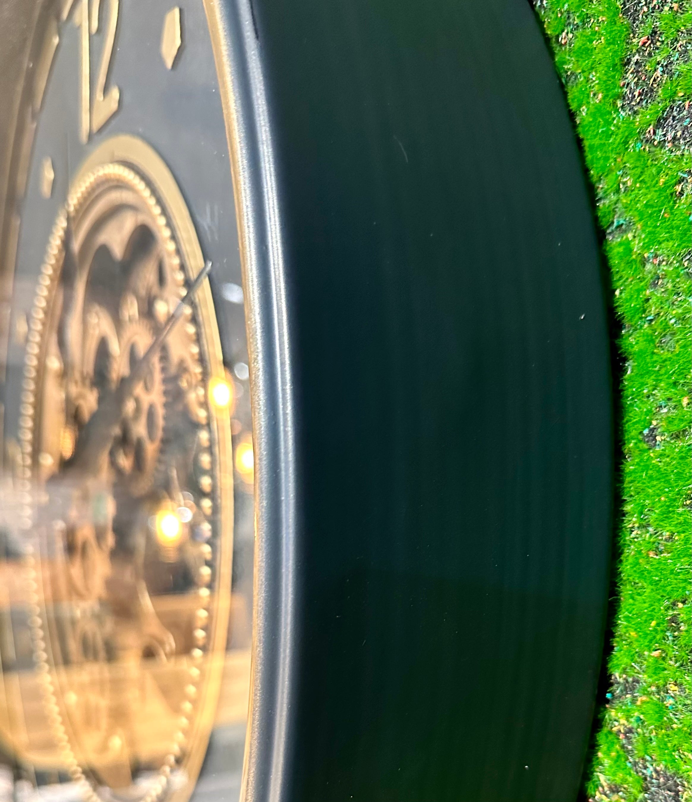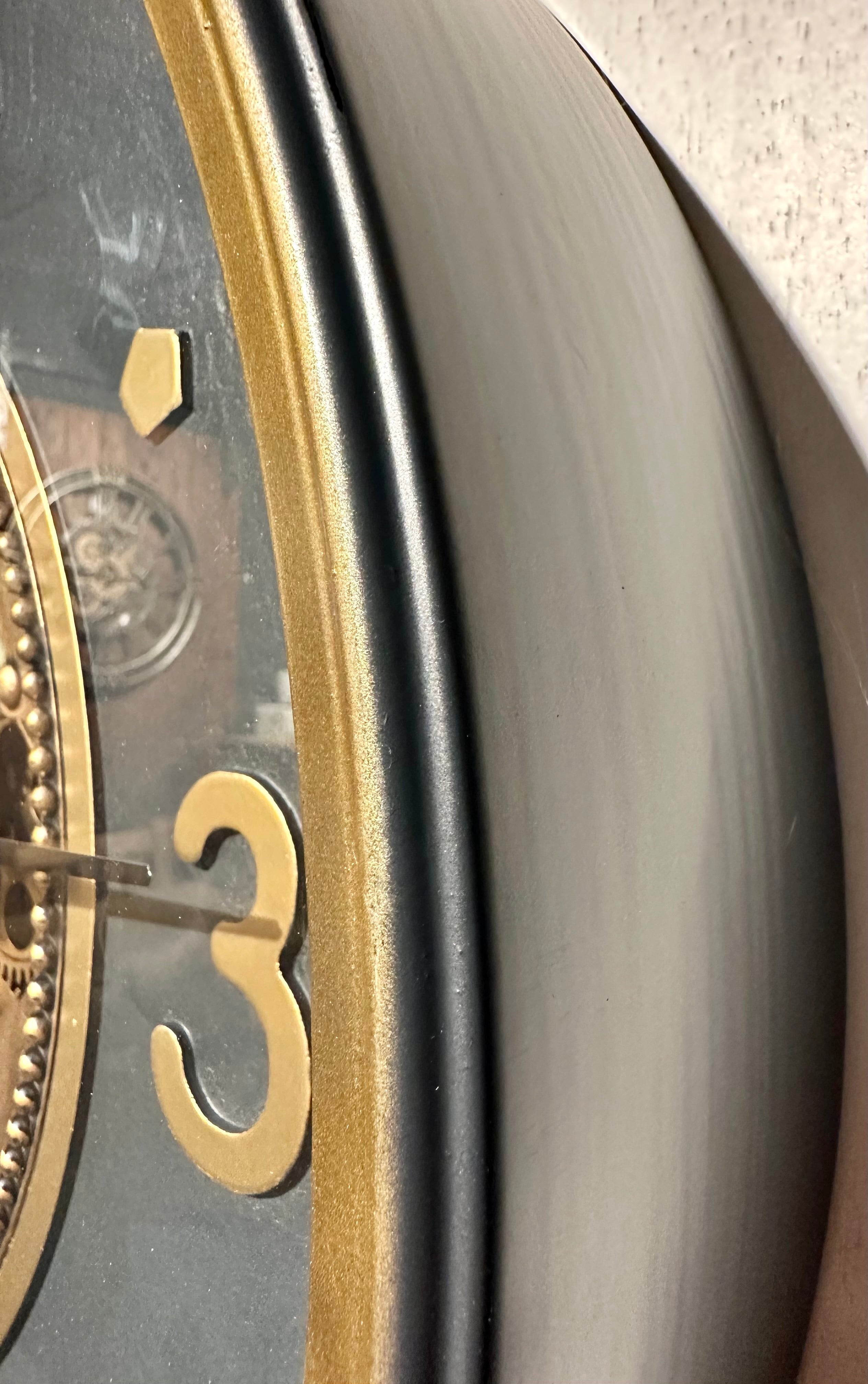 Das Zahradwerk, der sich bewegenden Wanduhr, ist altgold-braunfarbig im metallic Lack.